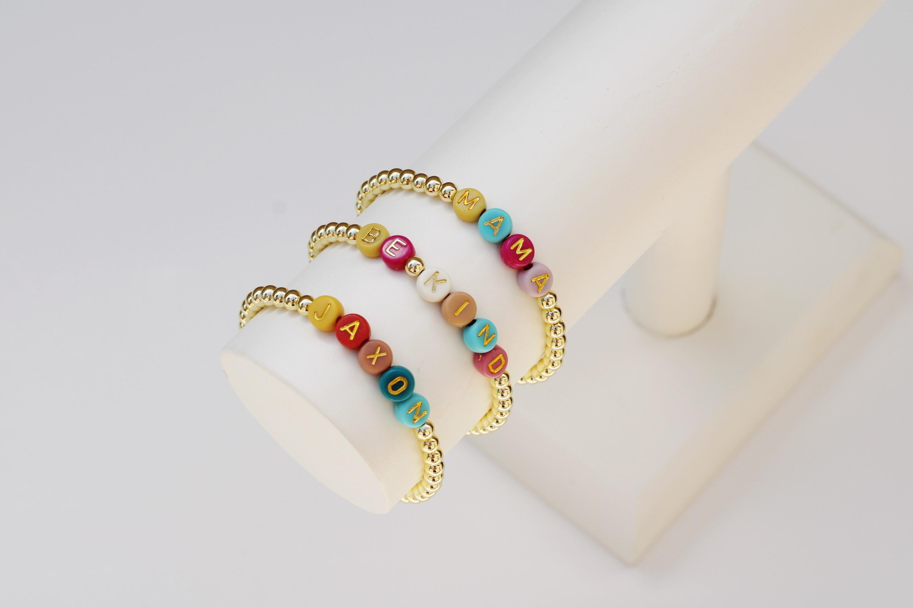 A cool, lightweight stretch bracelet. Uniquely crafted with 4mm gold beads and accented with colorful letter beads. Colors will be chosen at random based on availability but will be handpicked with attention to what color combo looks best together.