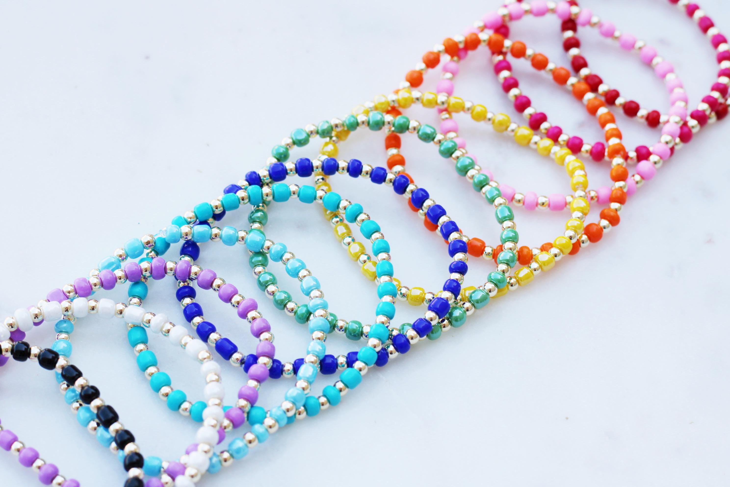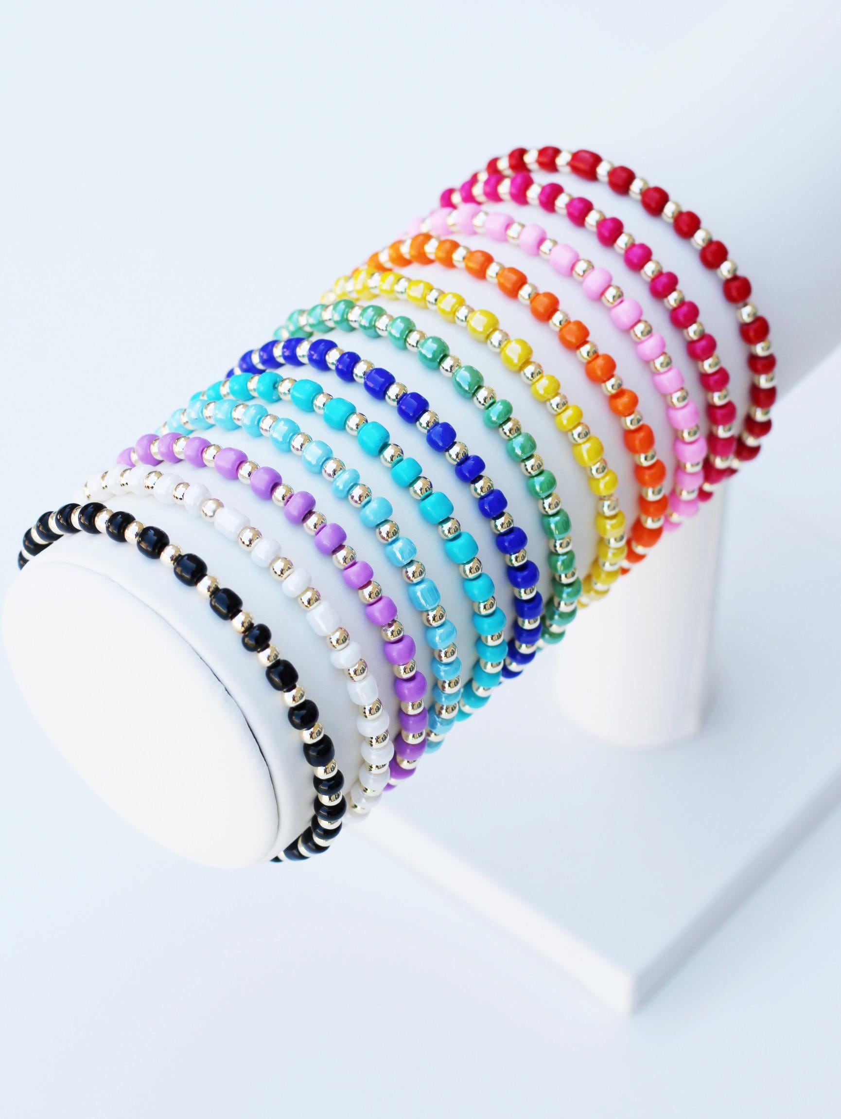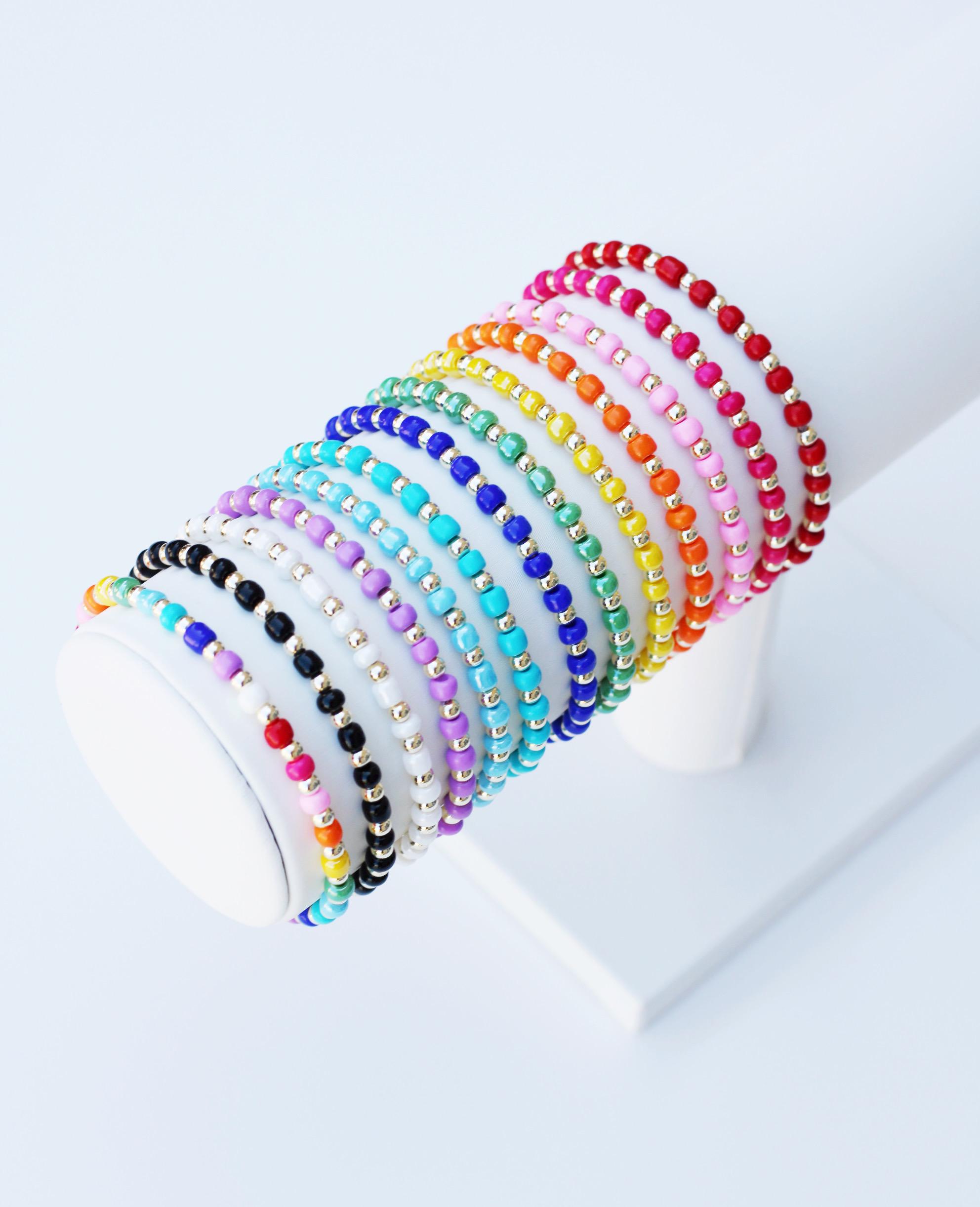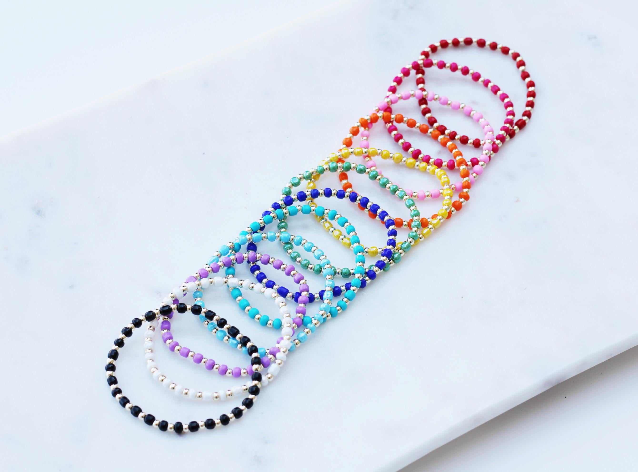 A pretty, lightweight stretch bracelet. Uniquely crafted with 3mm gold, silver or rose gold metal beads and accented with various colored seed beads.