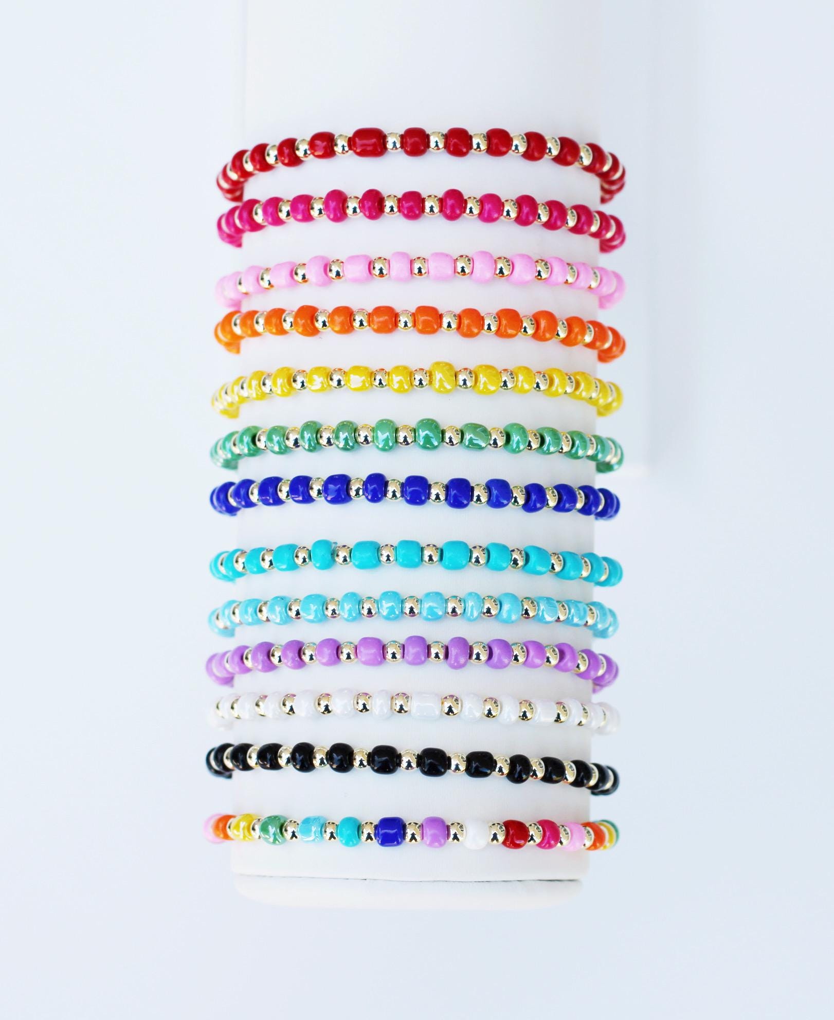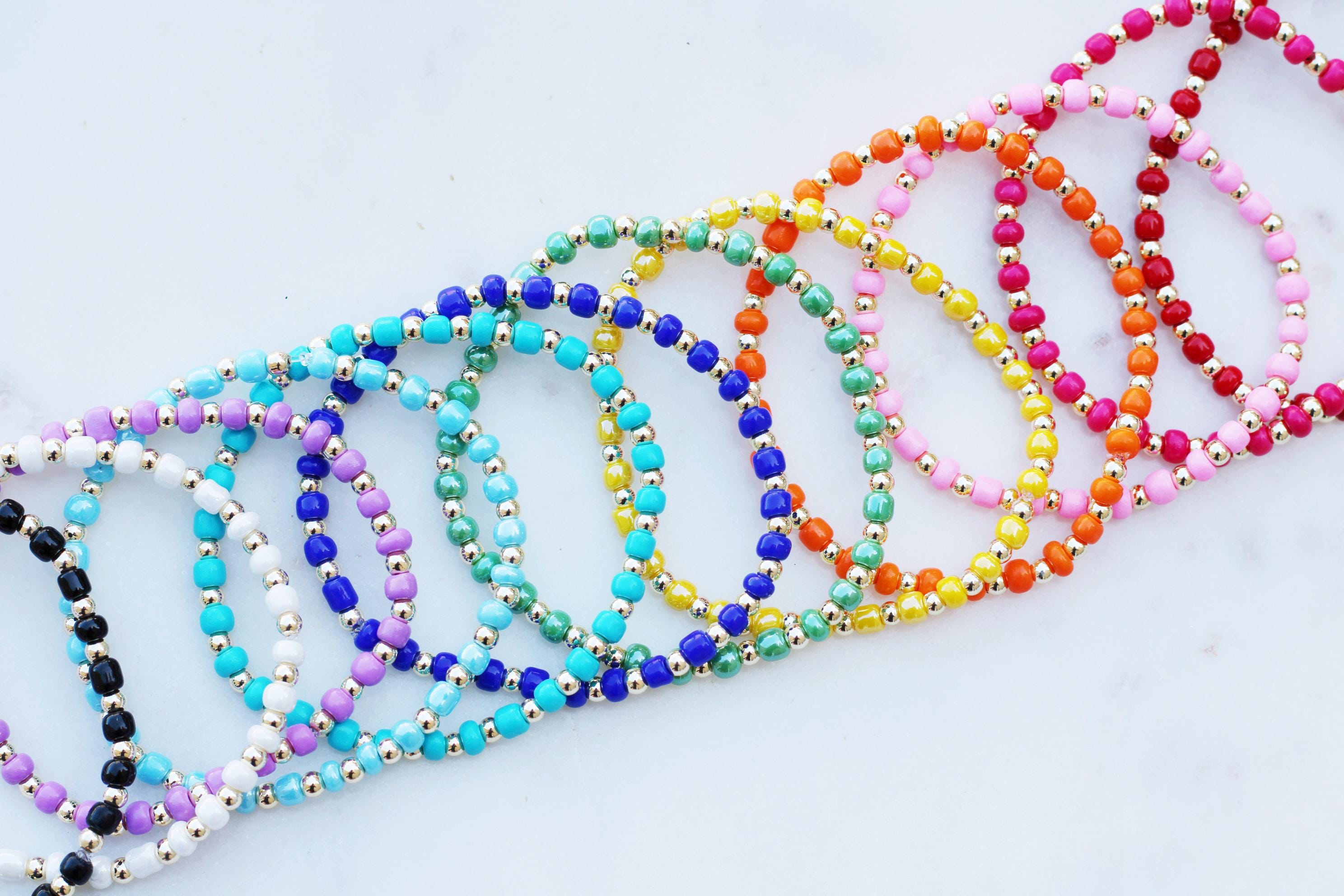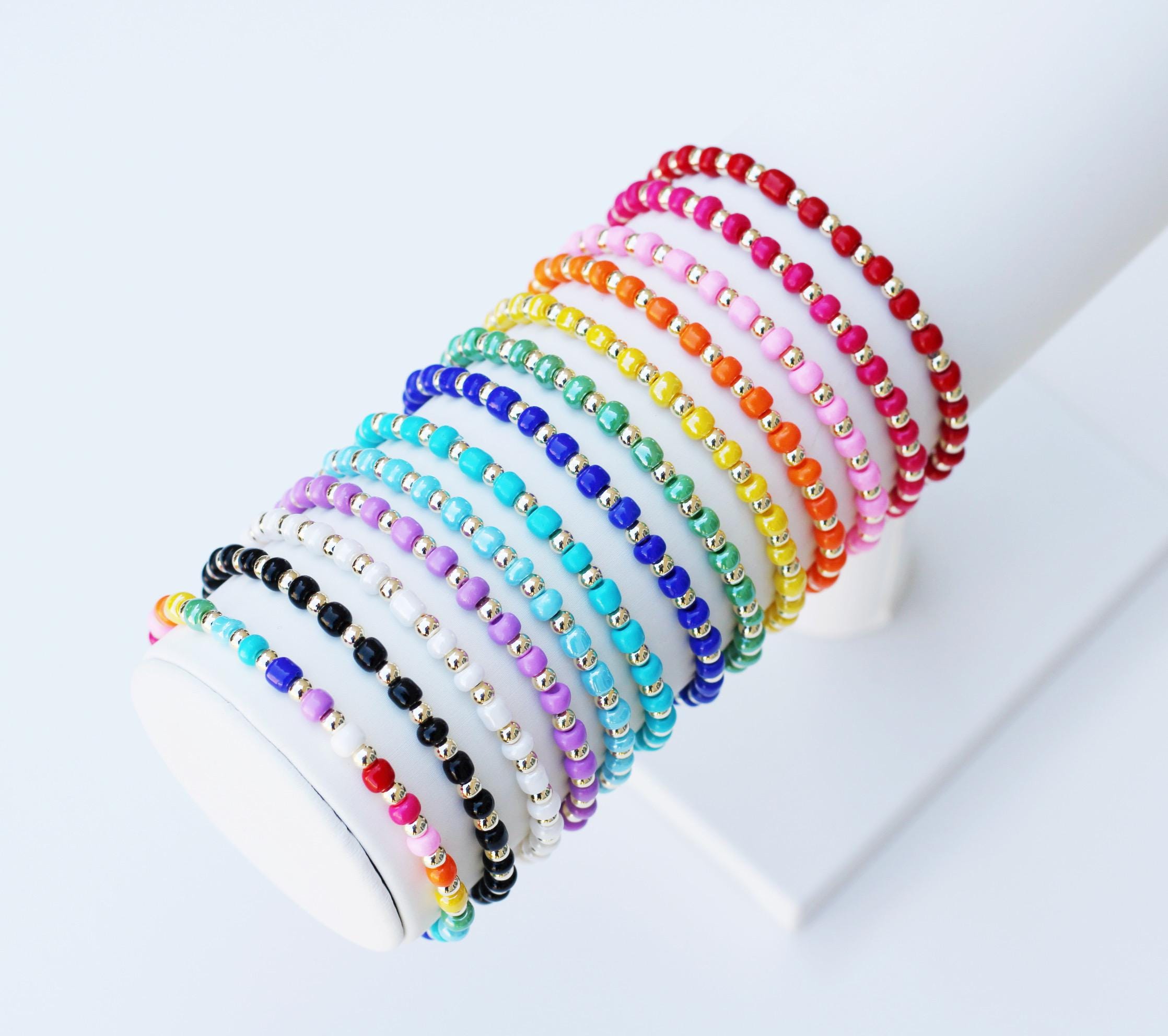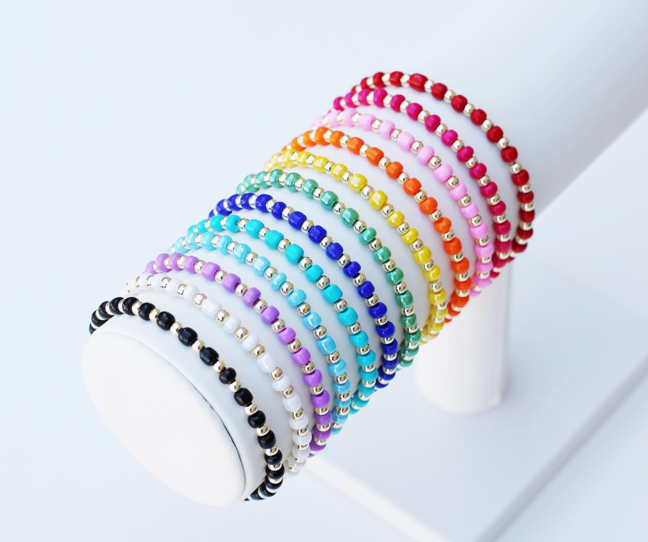 A pretty, lightweight stretch bracelet. Uniquely crafted with 3mm gold, silver or rose gold metal beads and accented with various colored seed beads.