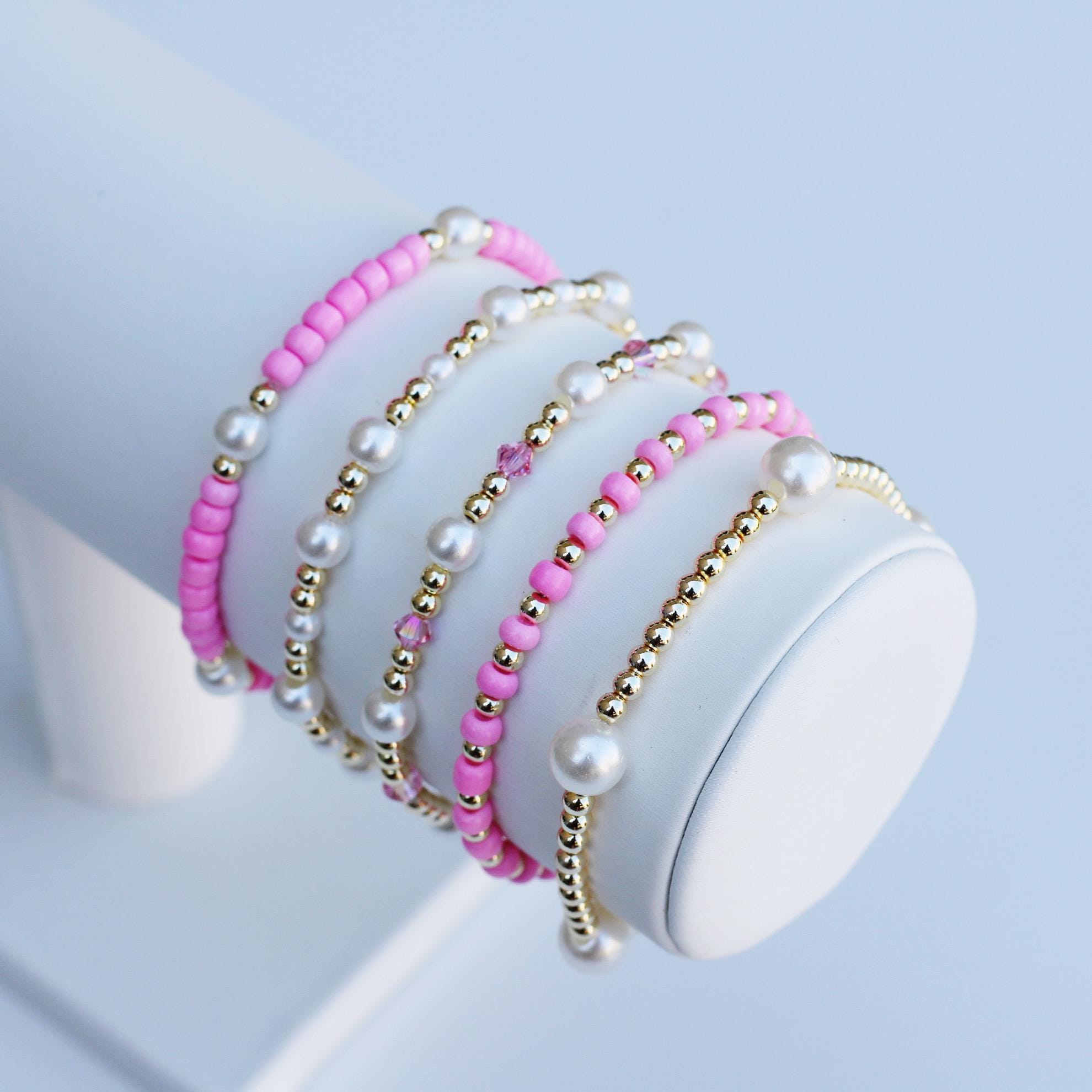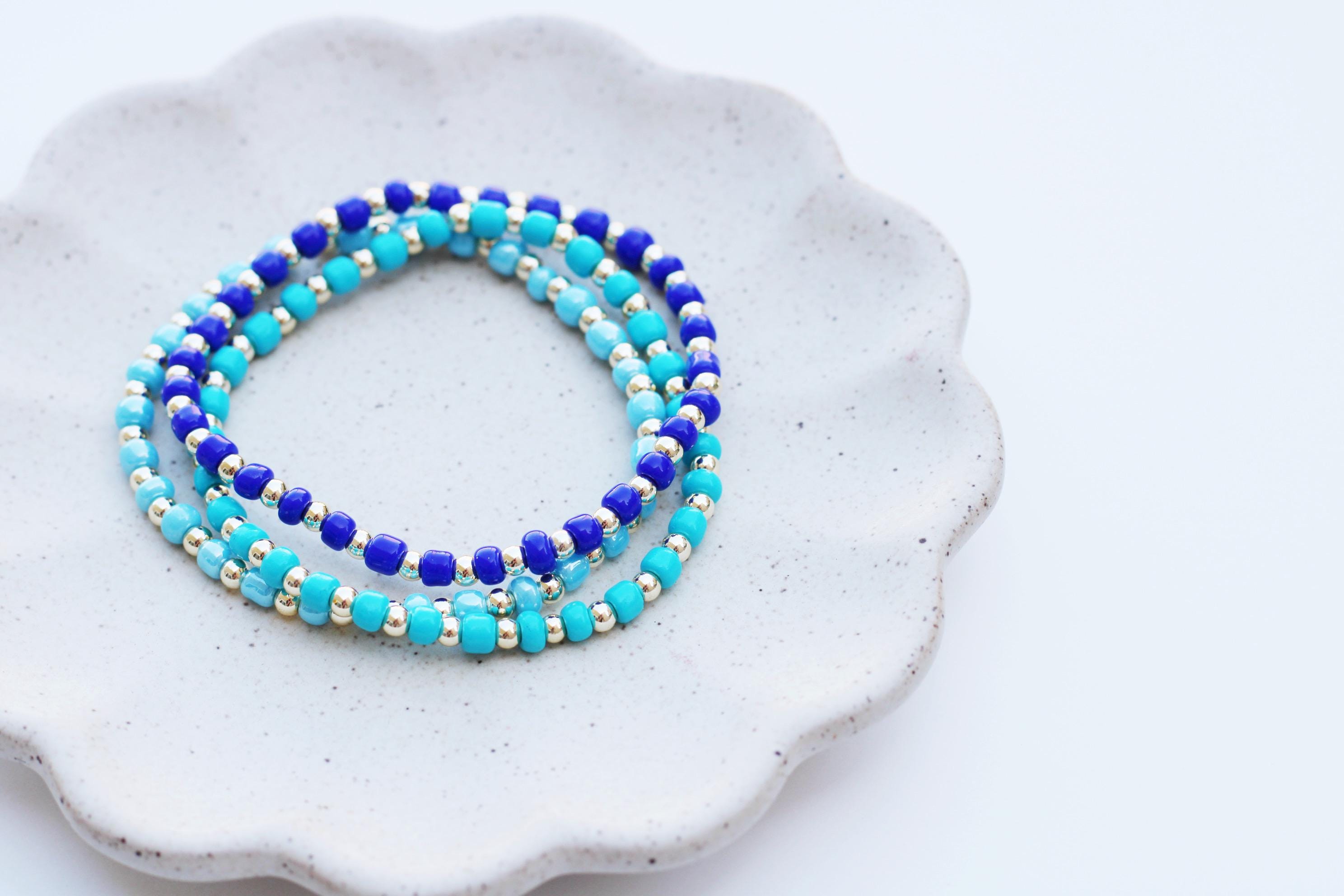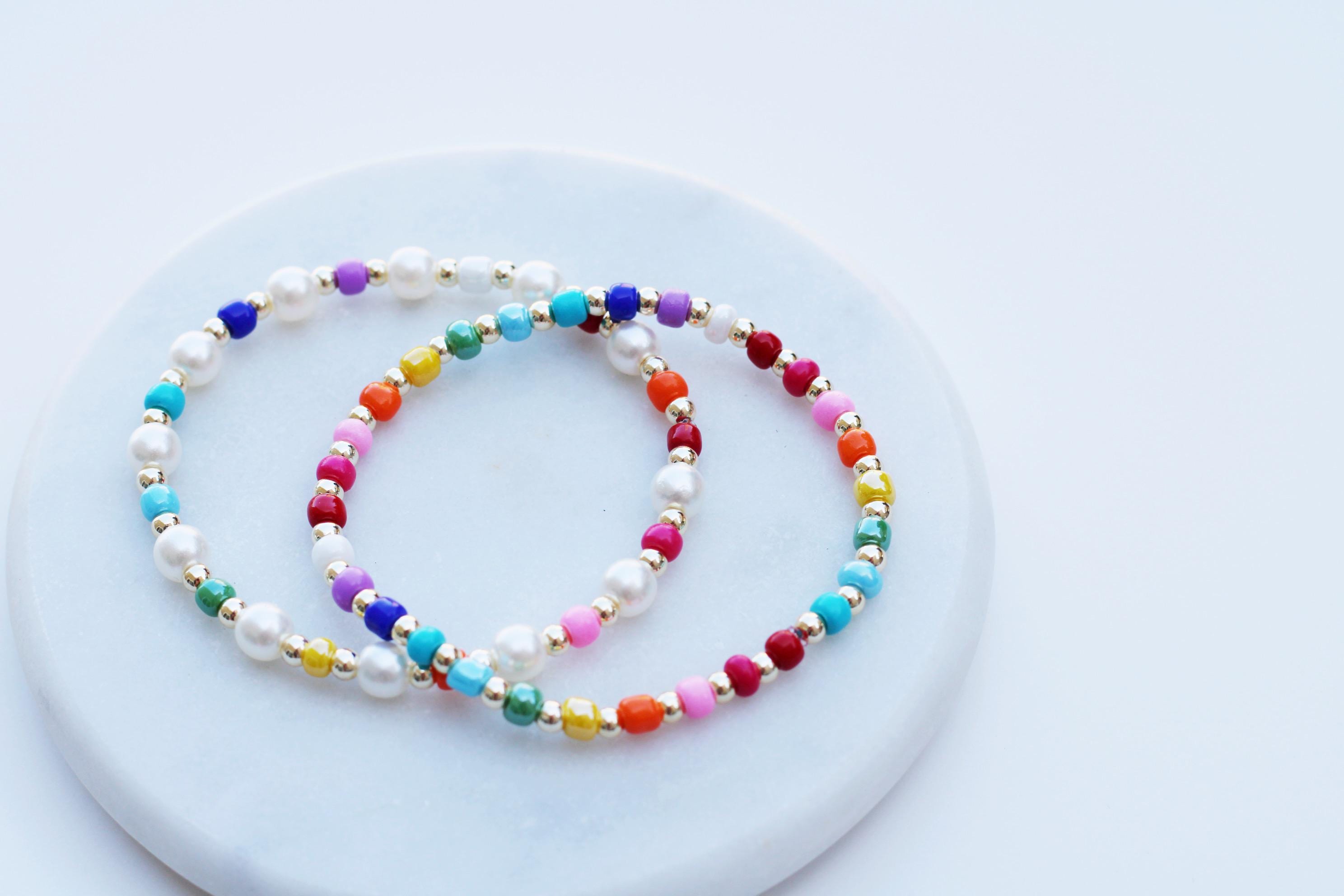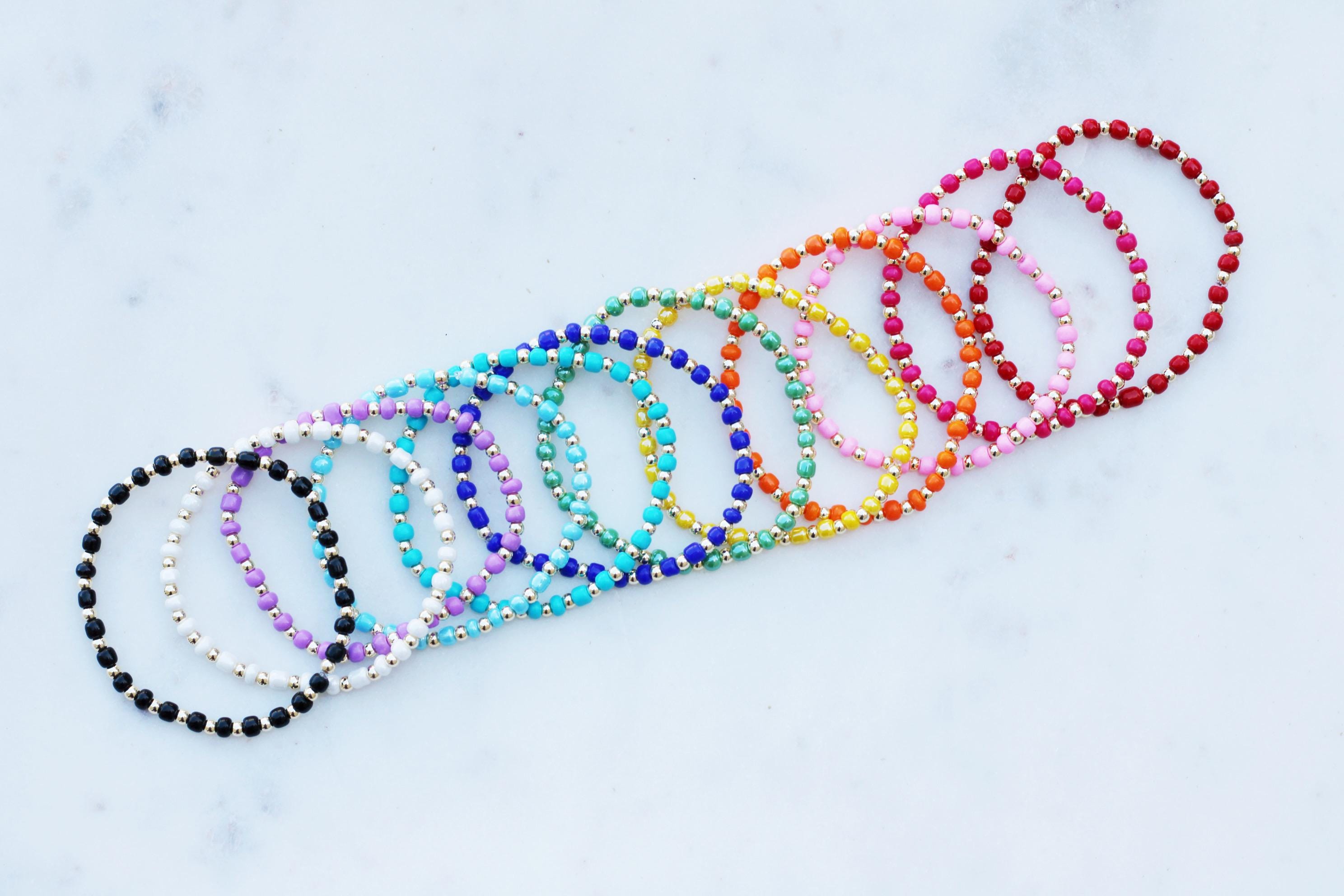 A pretty, lightweight stretch bracelet. Uniquely crafted with 3mm gold, silver or rose gold metal beads and accented with various colored seed beads.