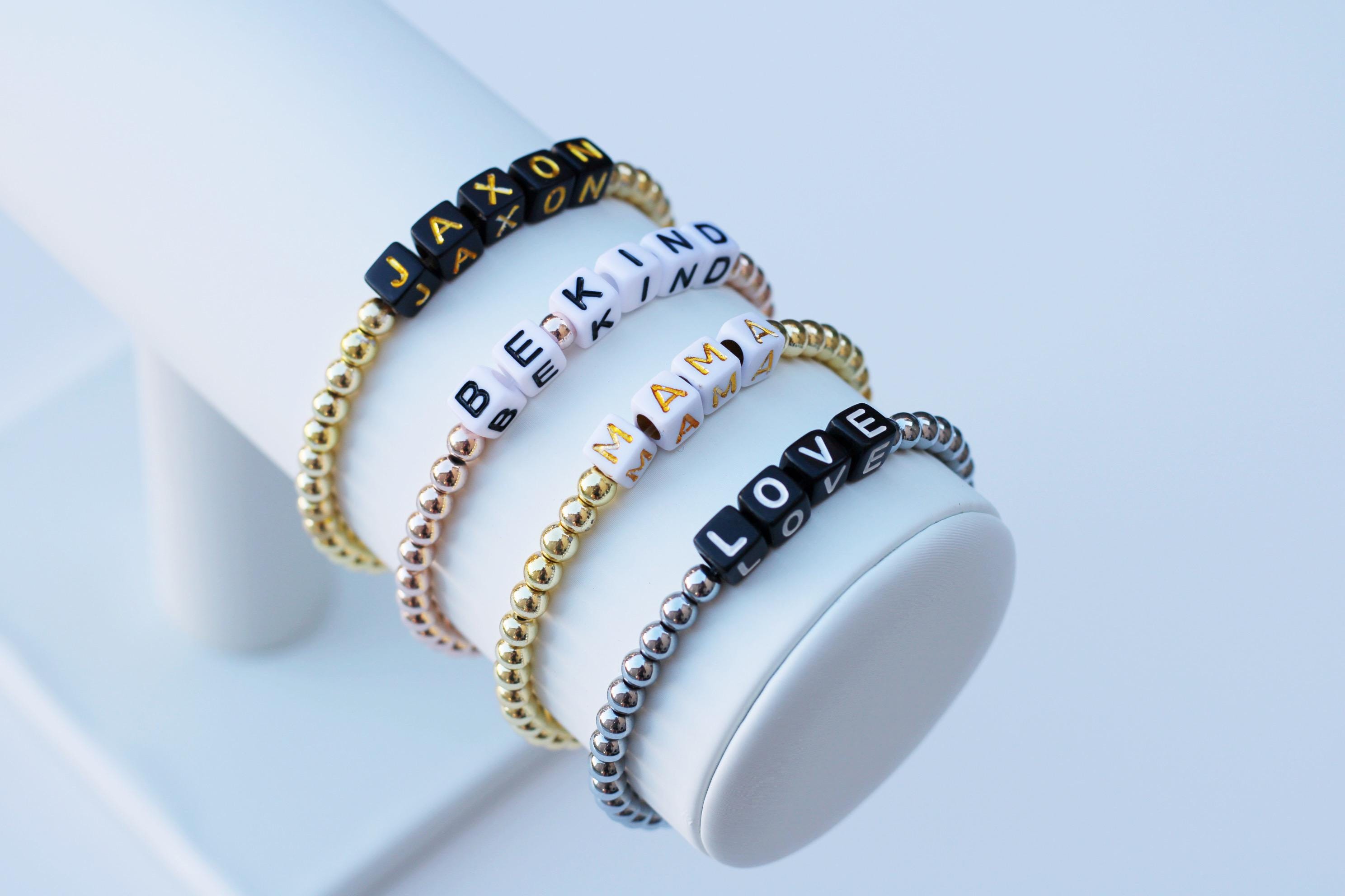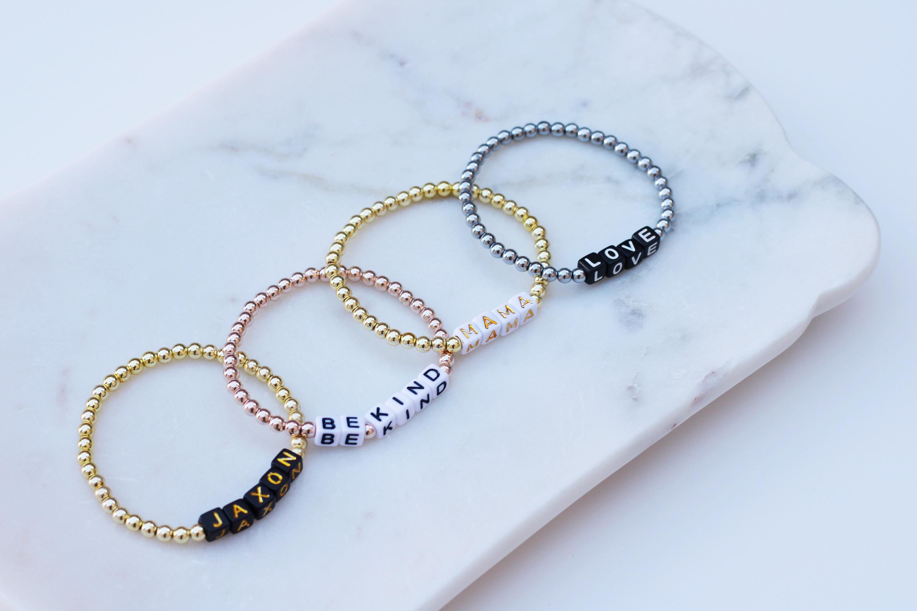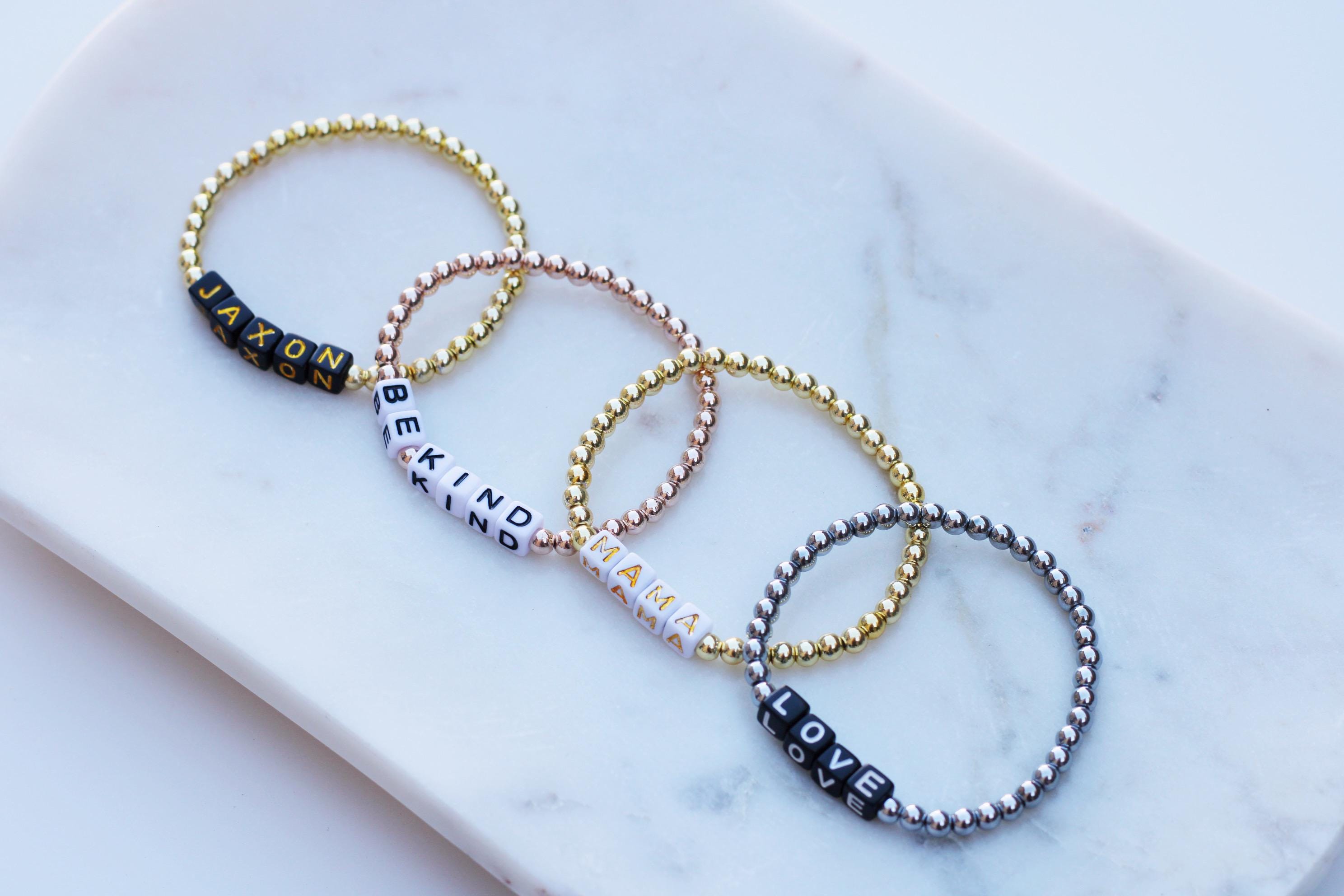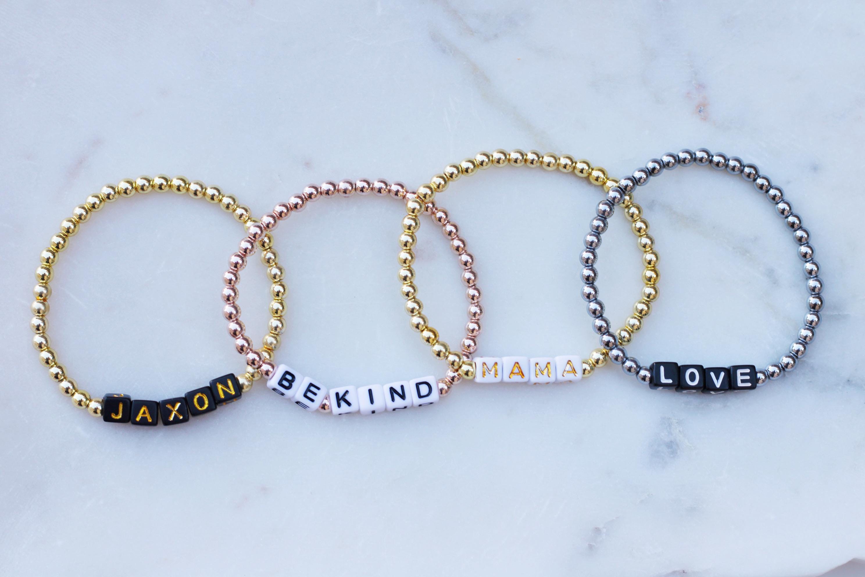 Listing is for one (1) bracelet containing 4mm gold silver or rose gold beads and block letter beads. No numbers available!
