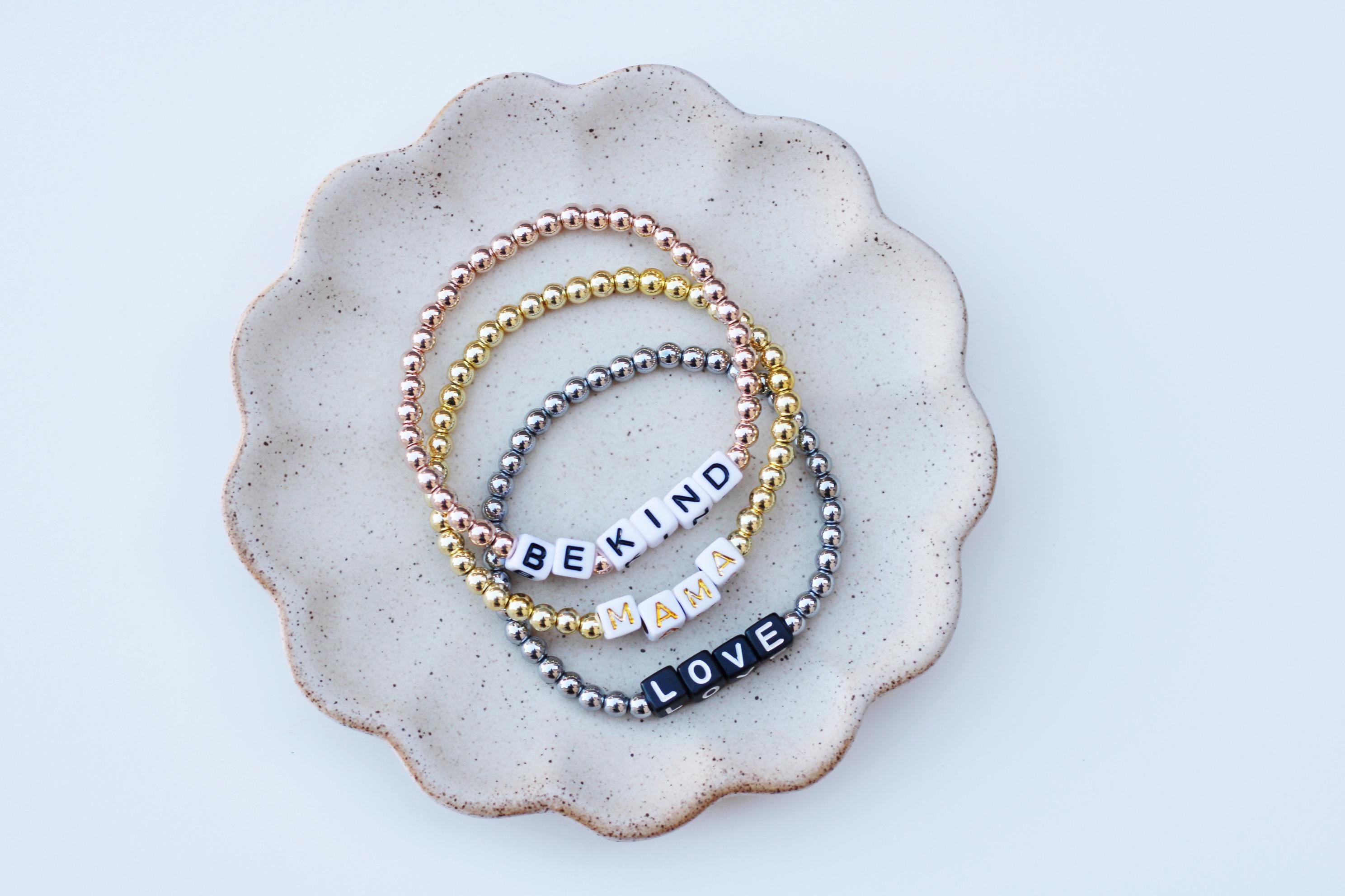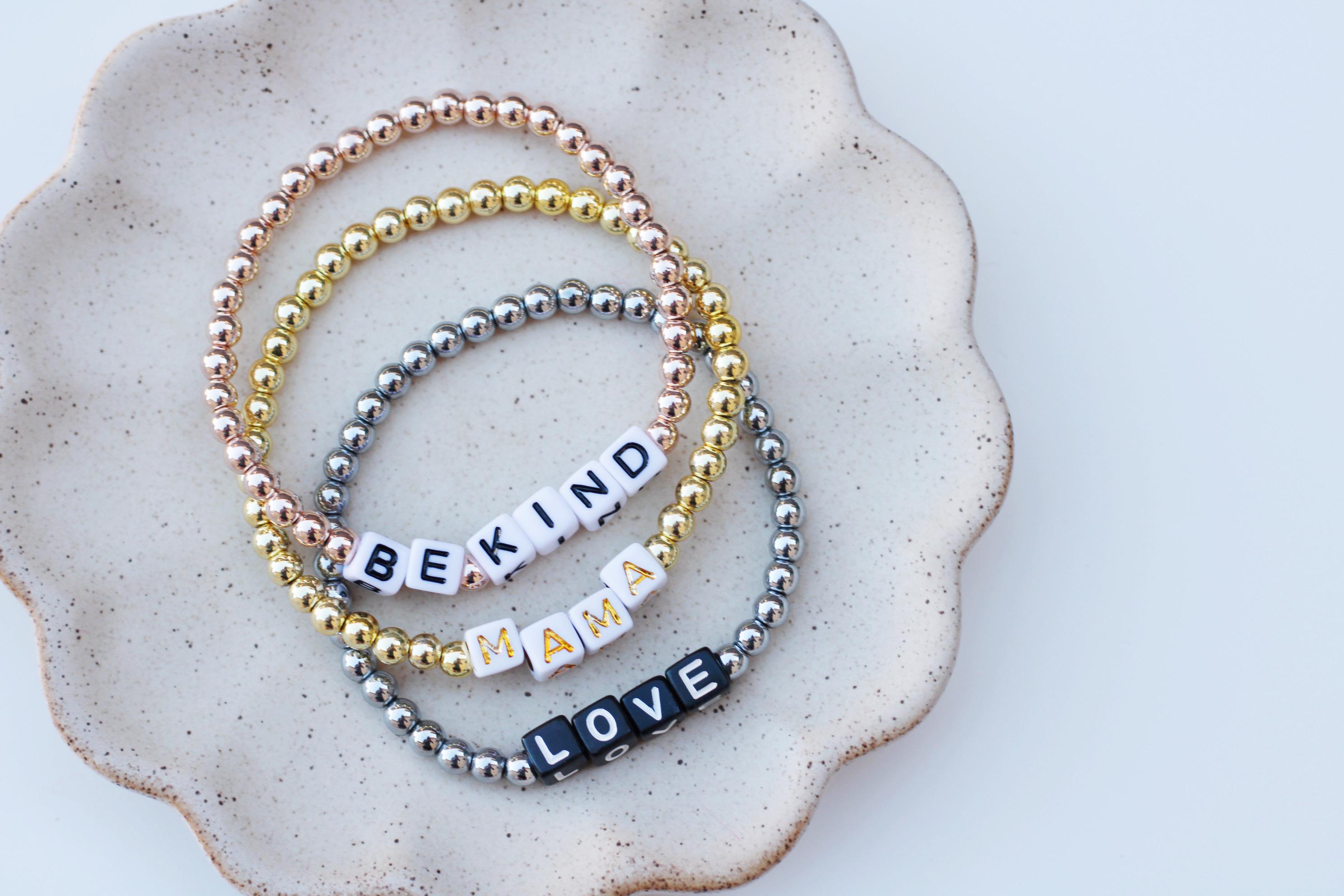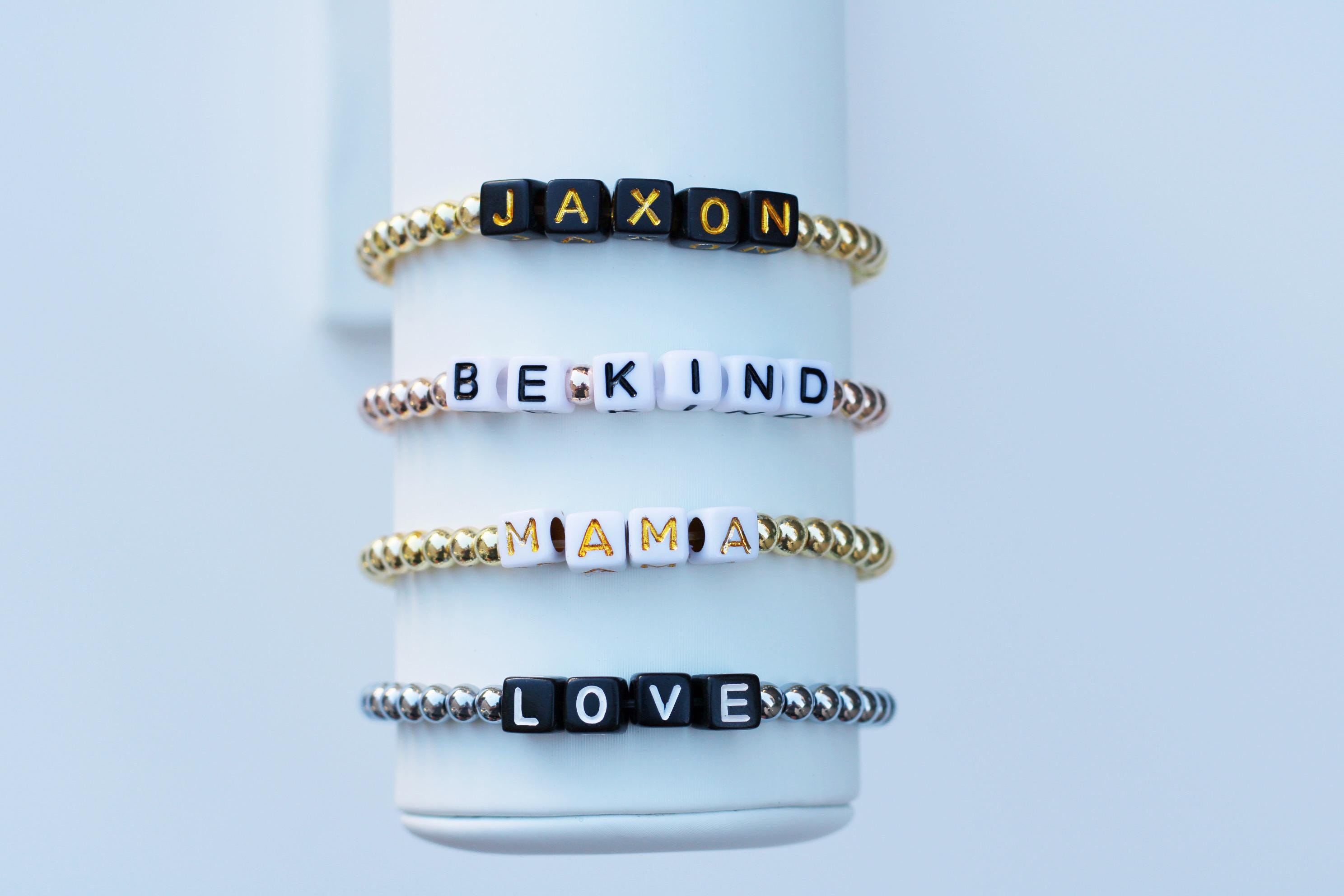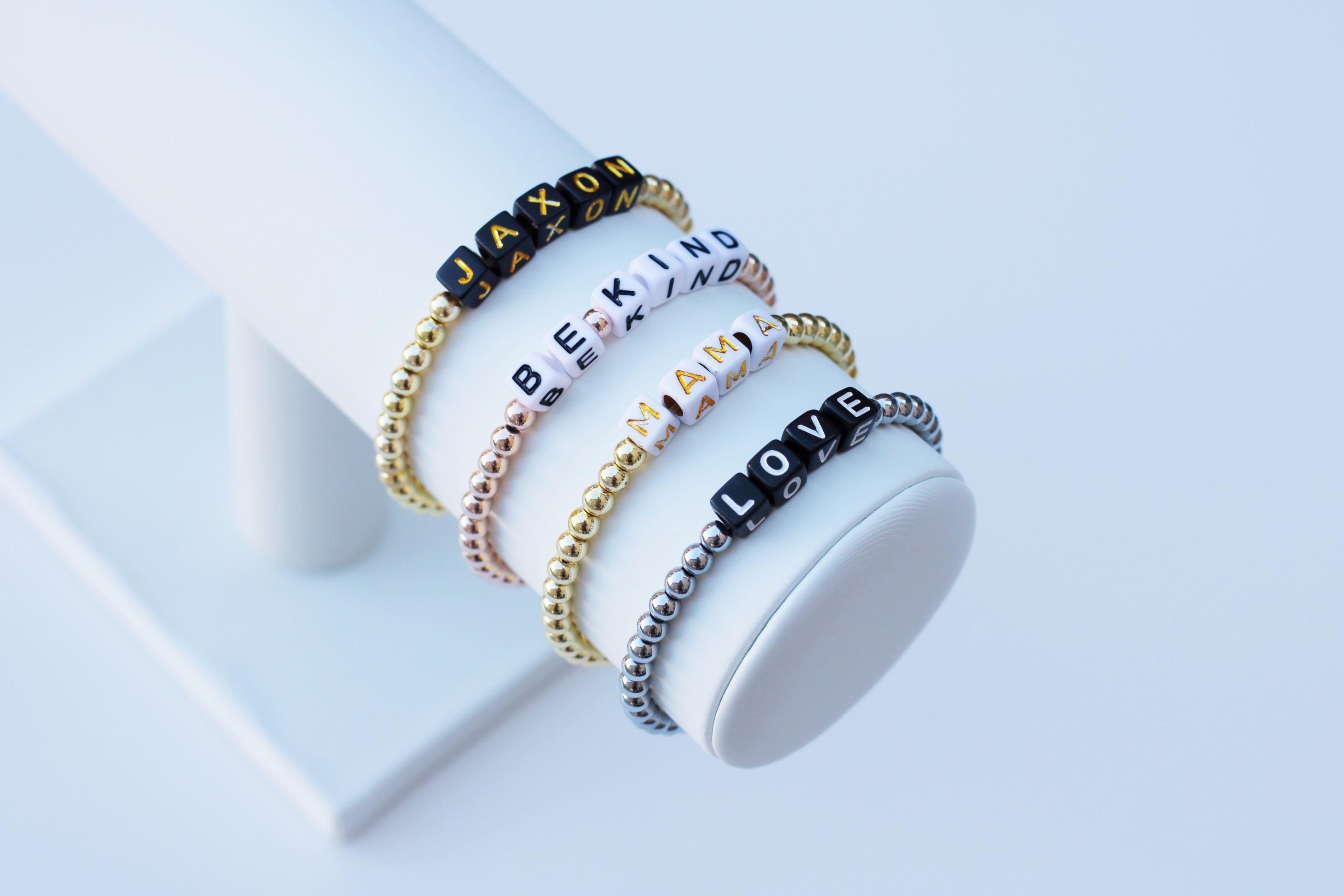 Listing is for one (1) bracelet containing 4mm gold silver or rose gold beads and block letter beads. No numbers available!