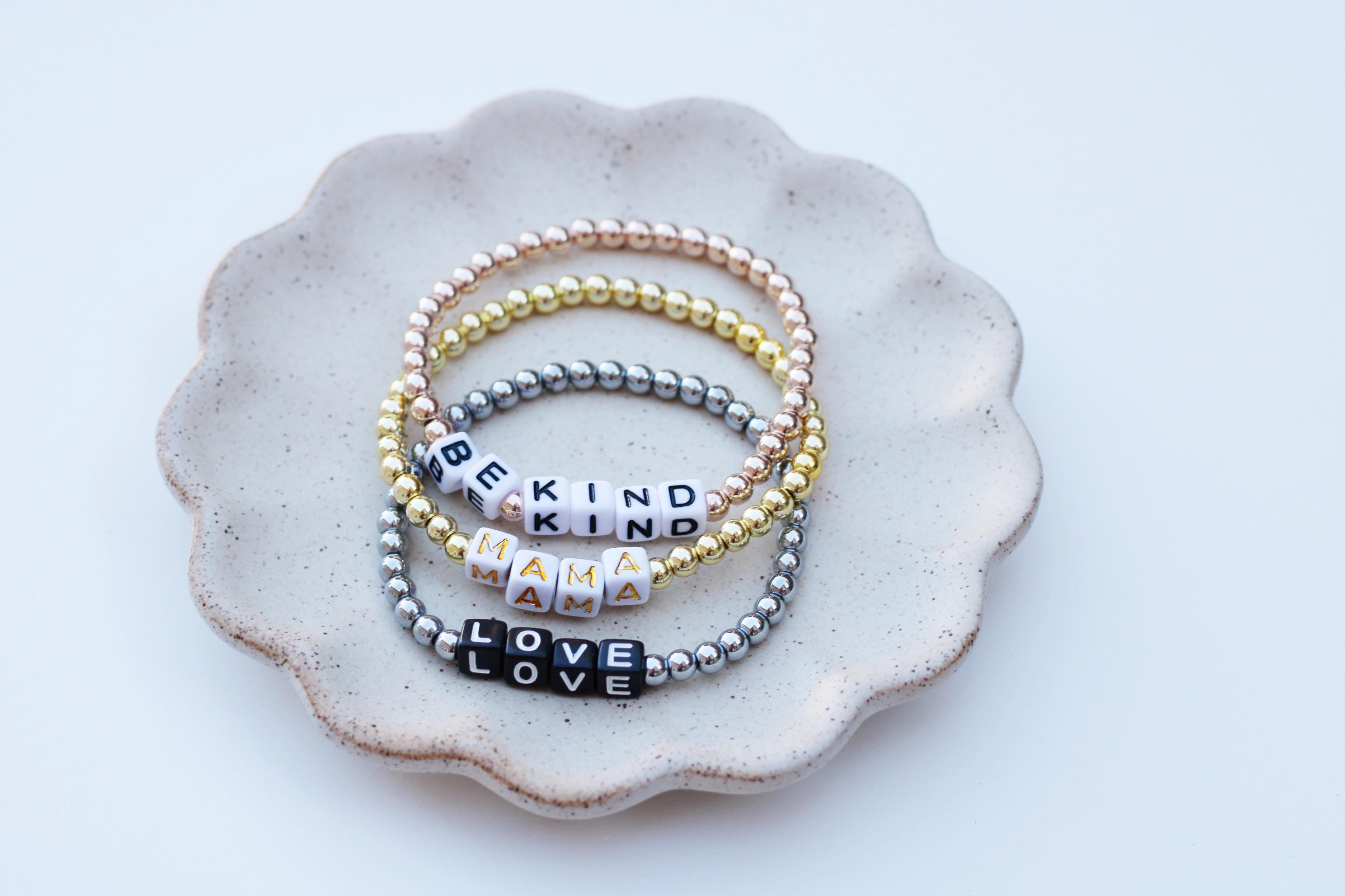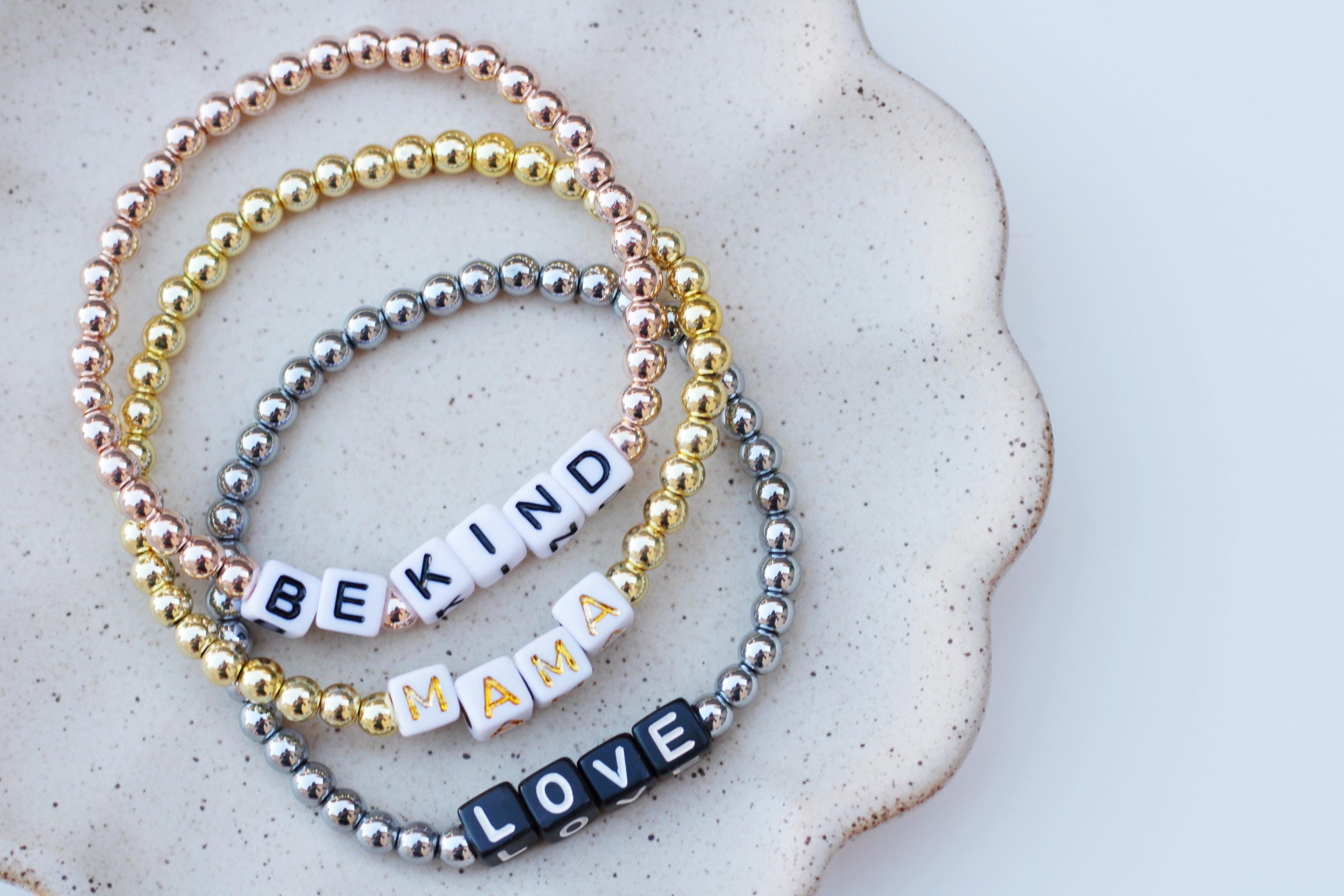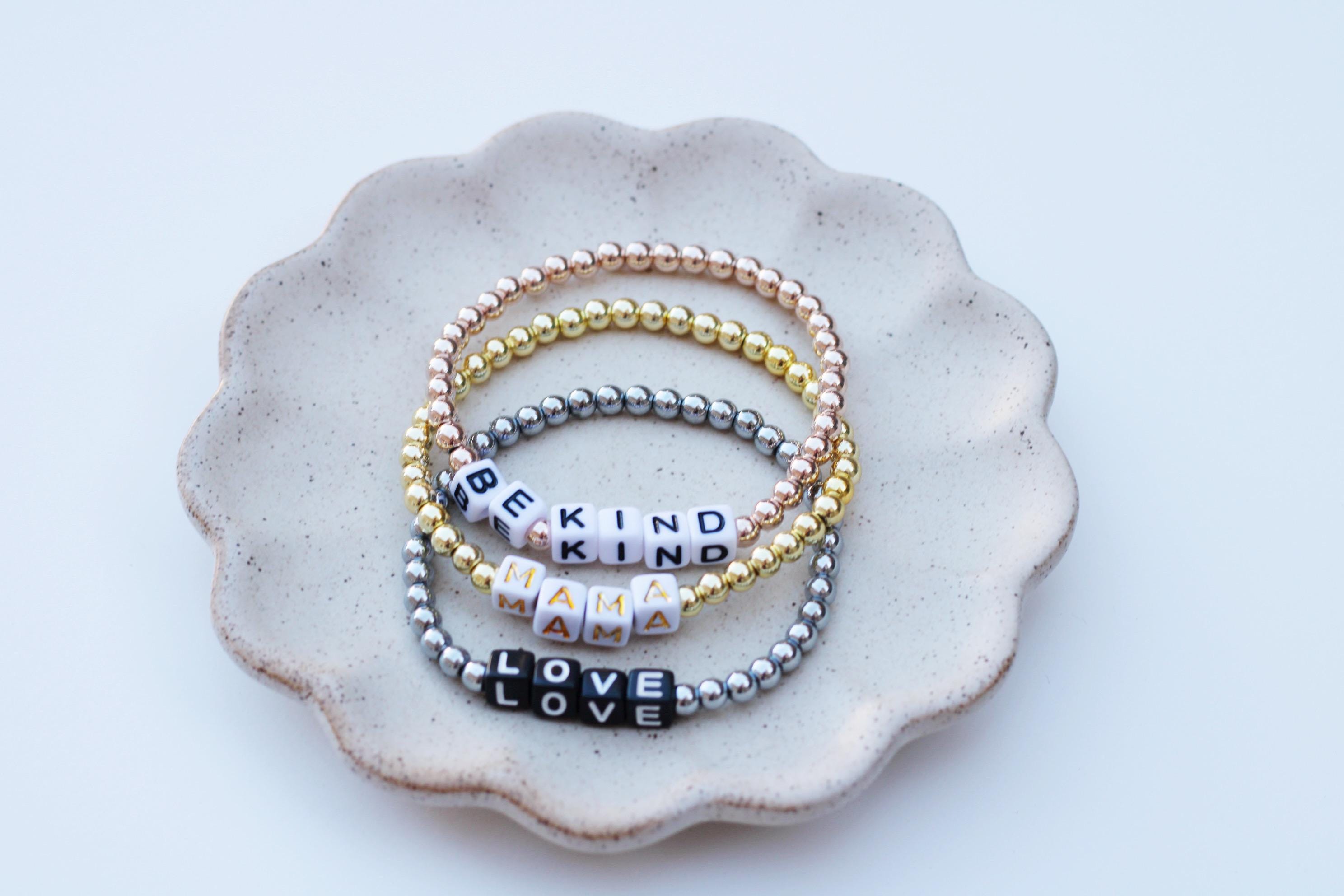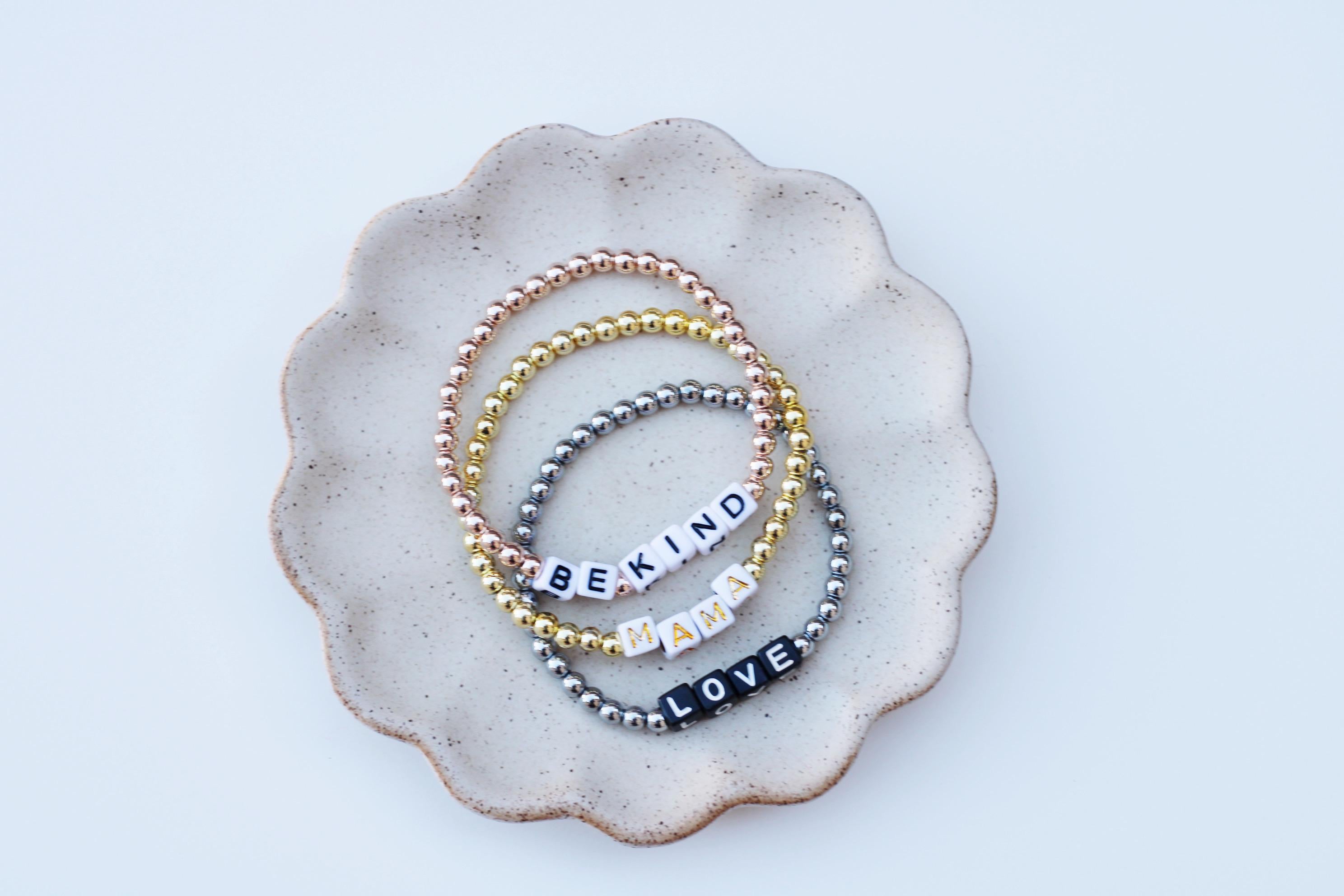 Listing is for one (1) bracelet containing 4mm gold silver or rose gold beads and block letter beads. No numbers available!