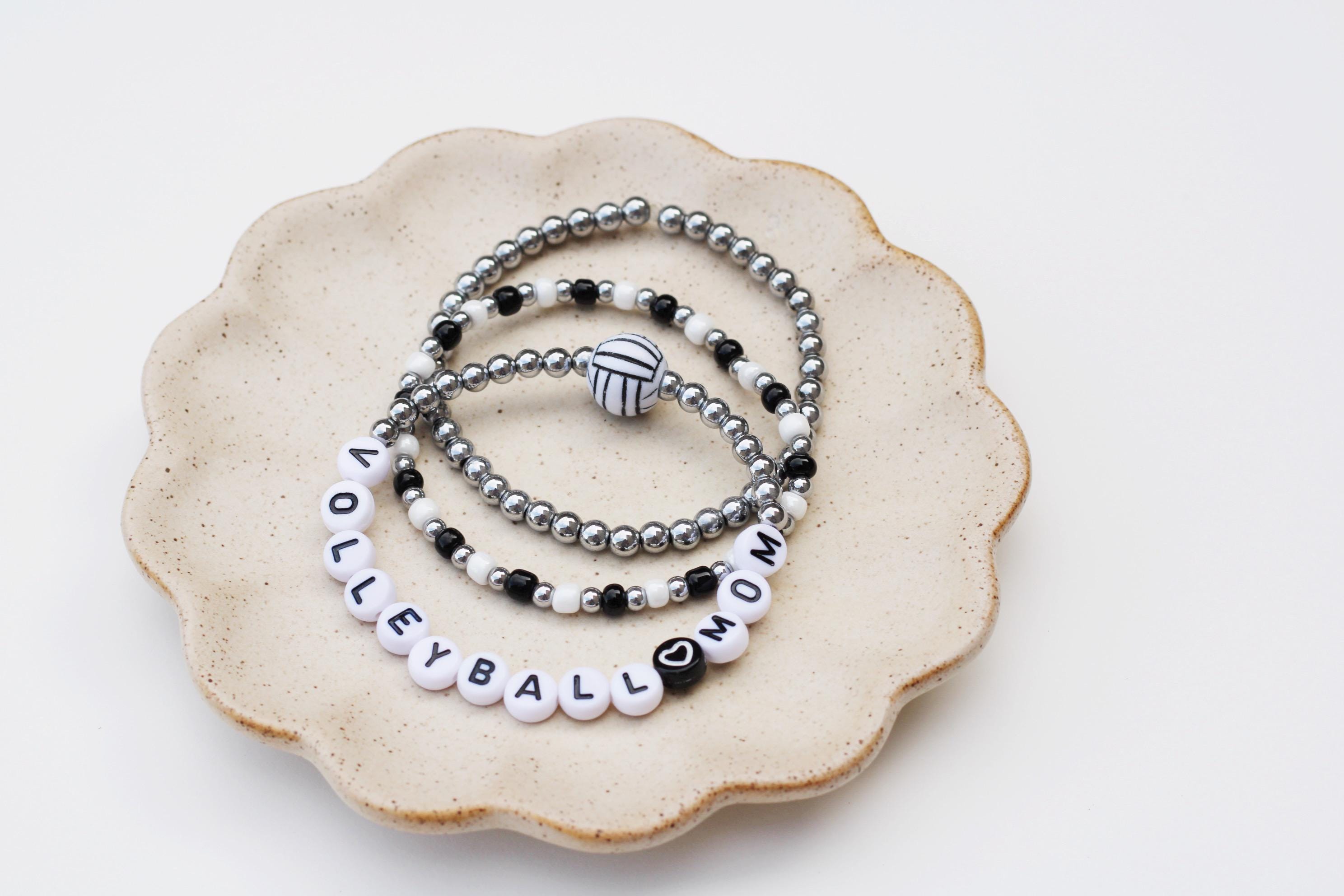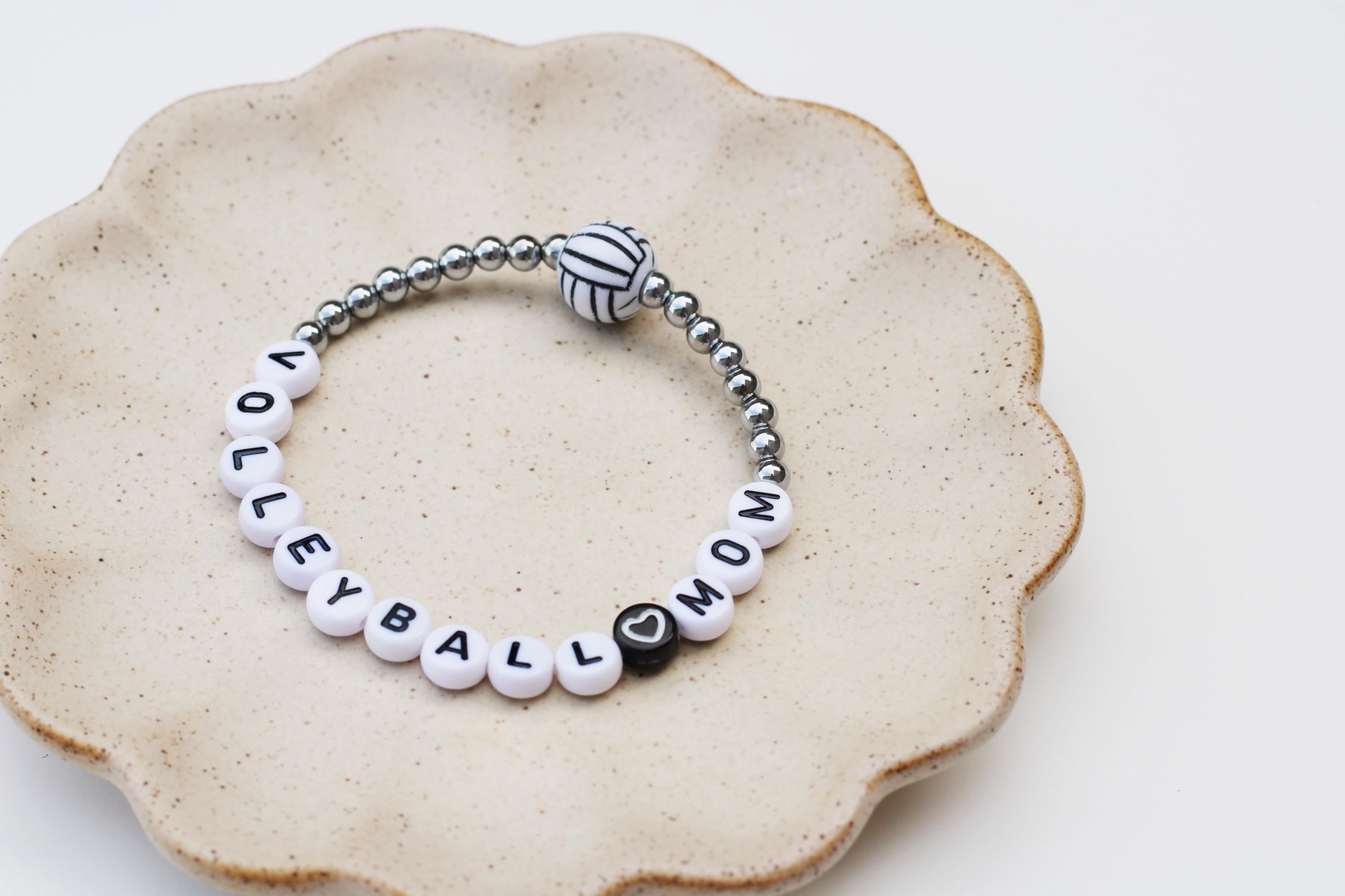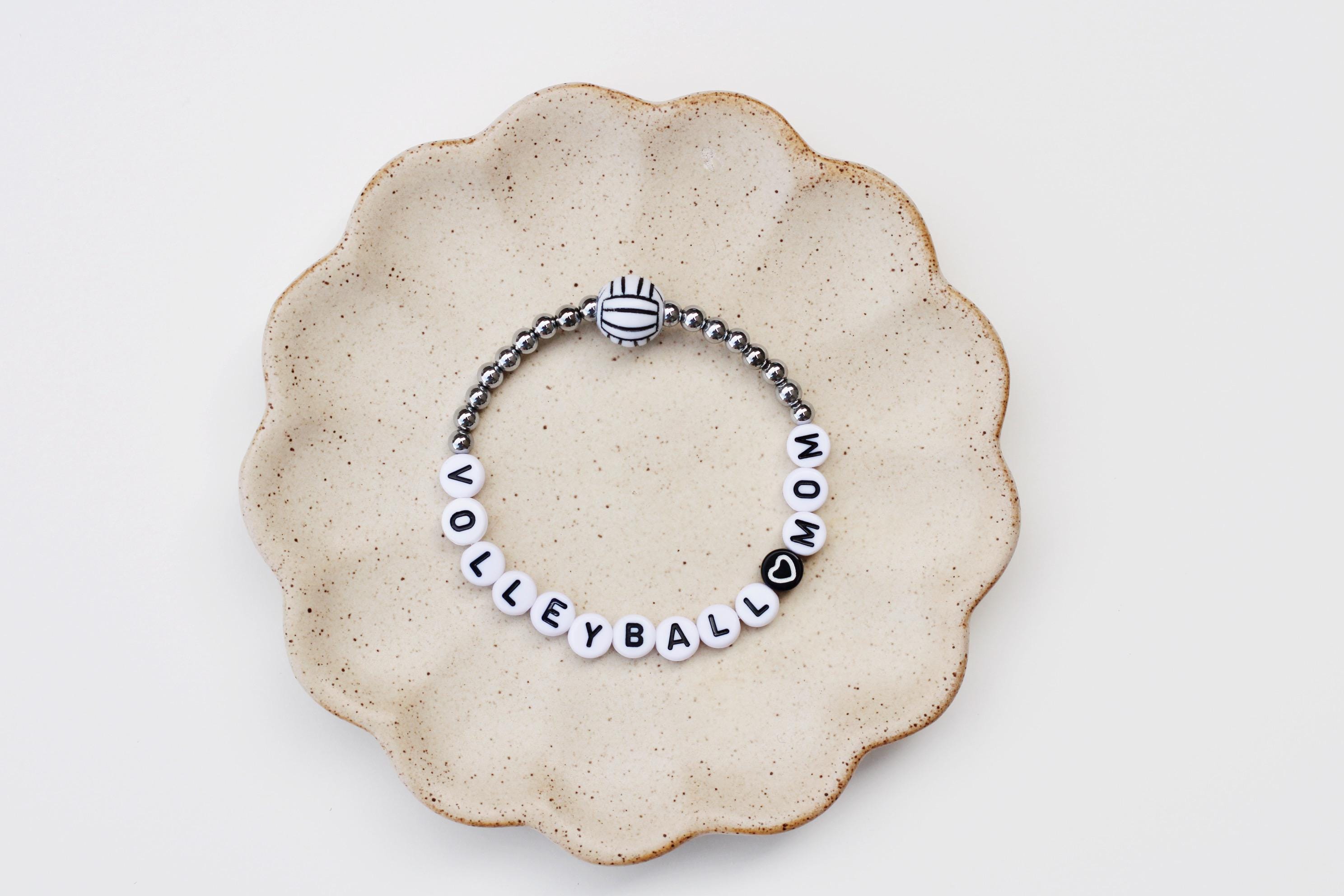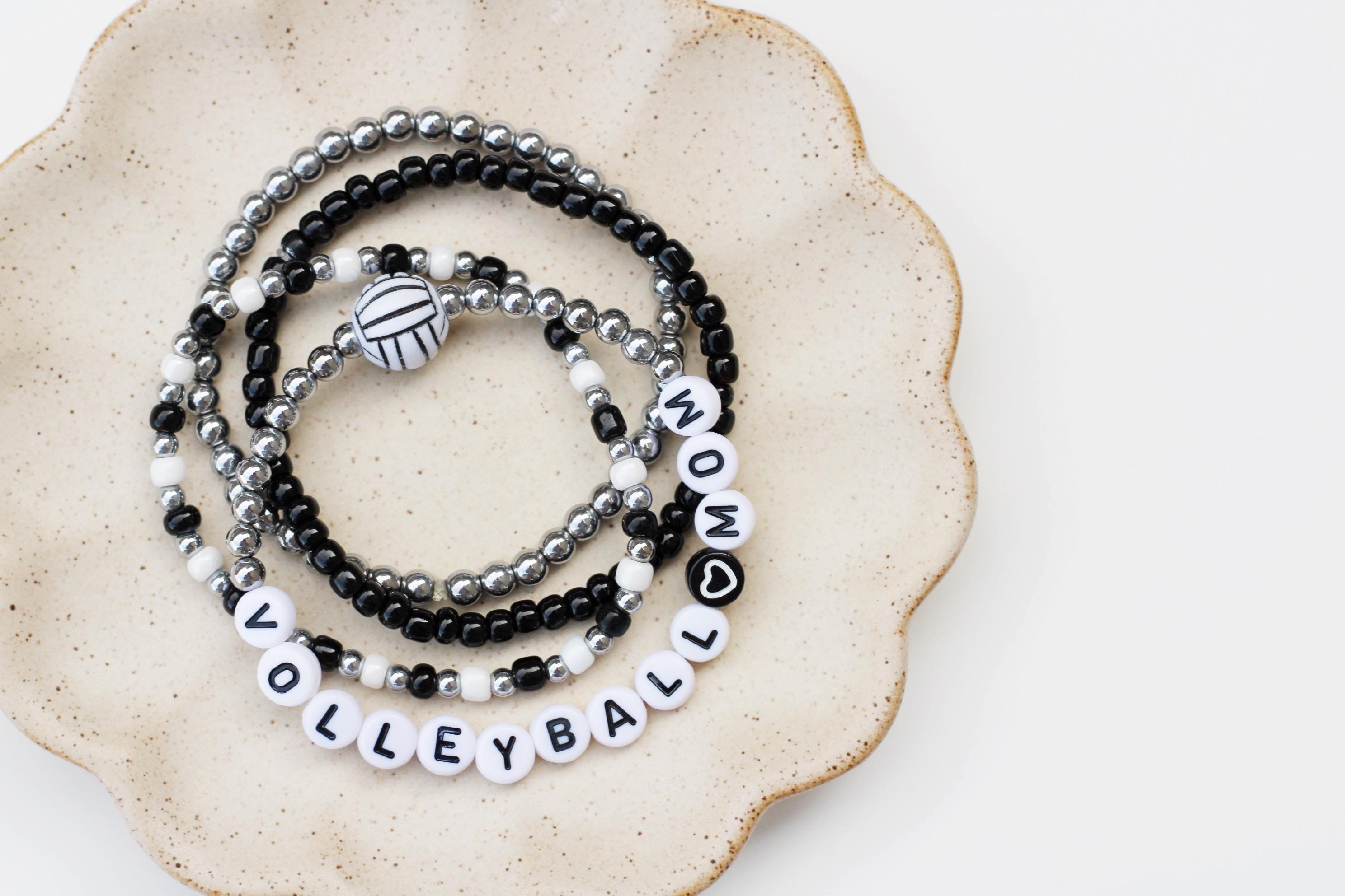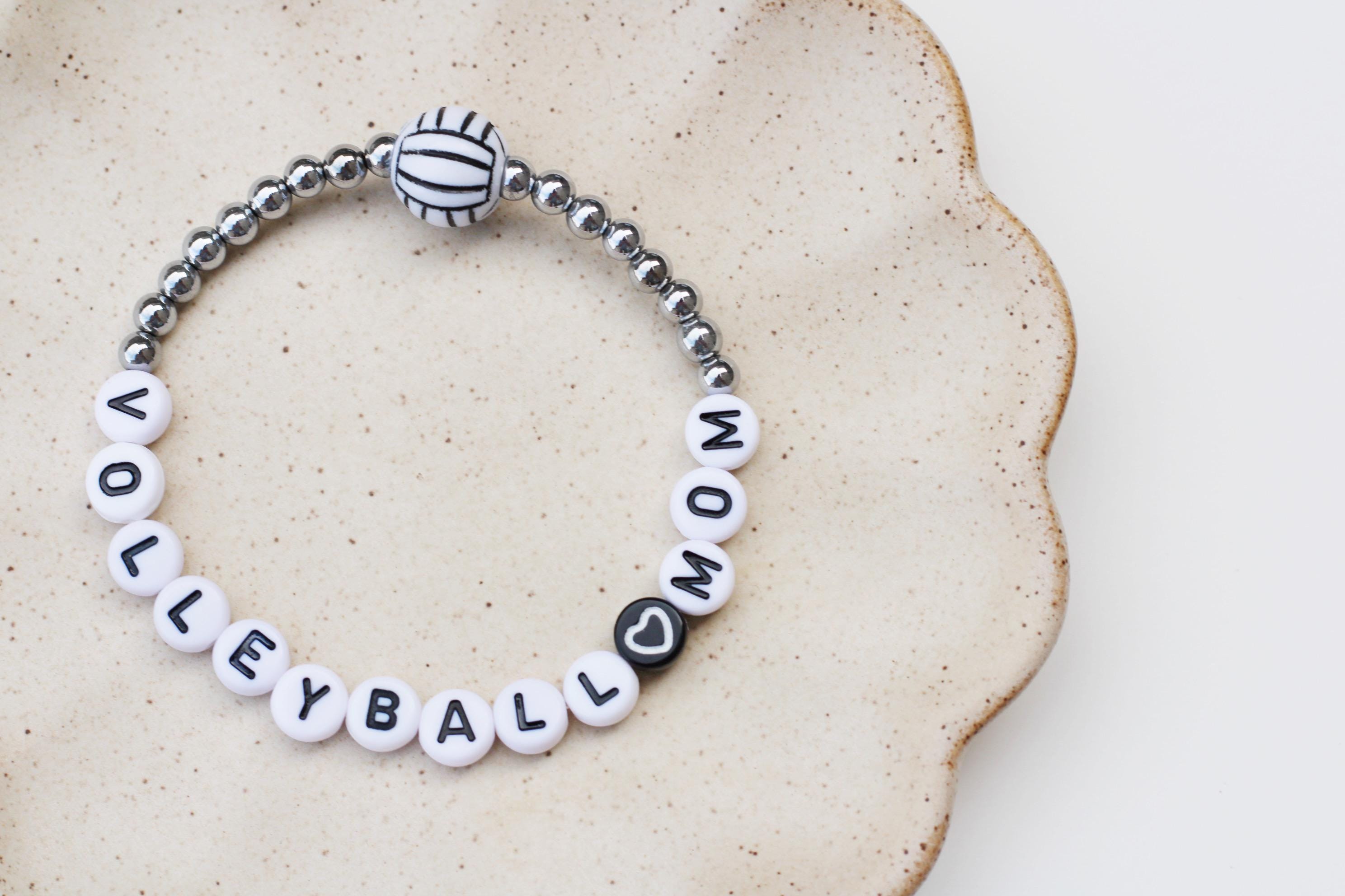 Listing is for one (1) bracelet containing 4mm 18k gold, silver or rose gold plated hematite beads, white/black letter beads and accented with a Volleyball bead.