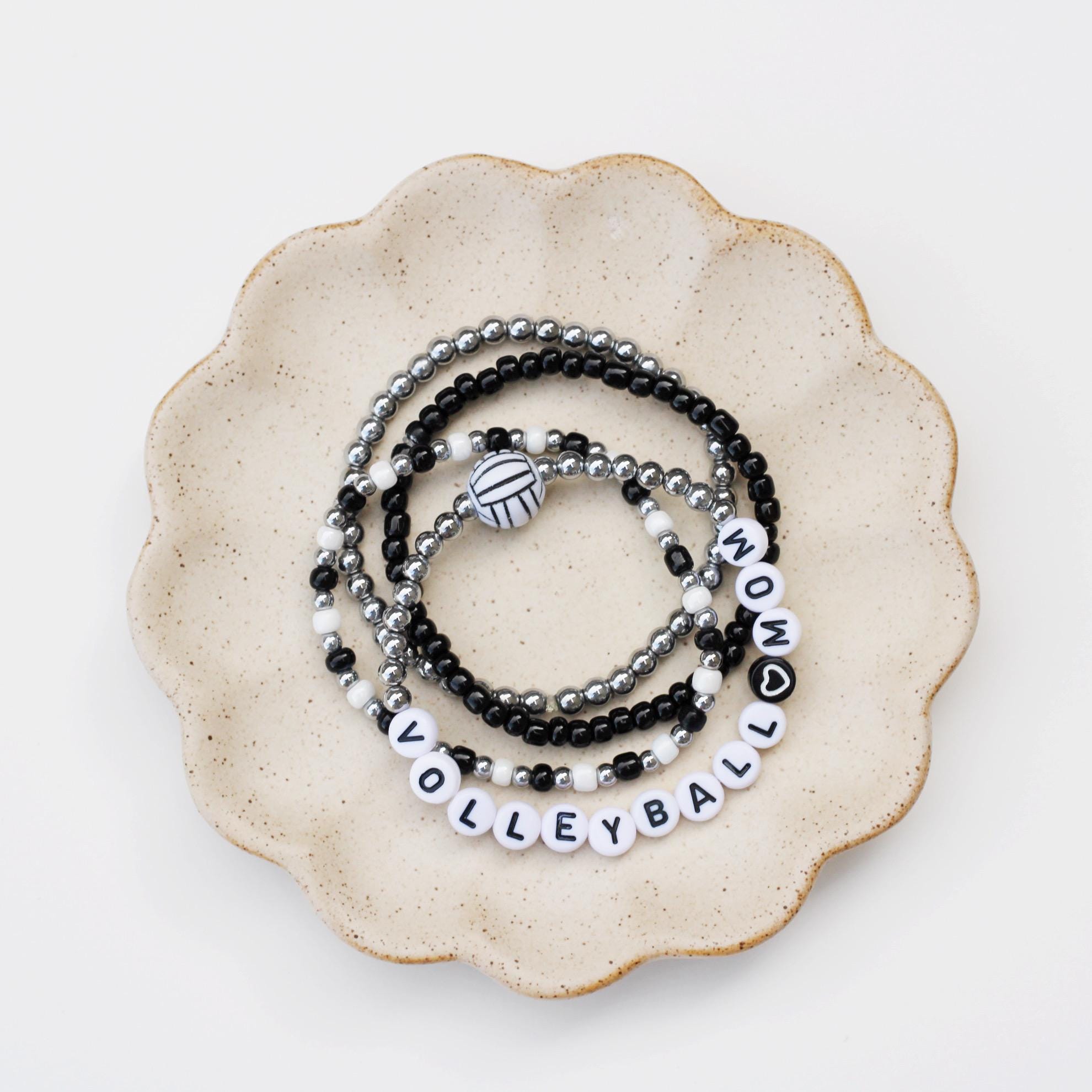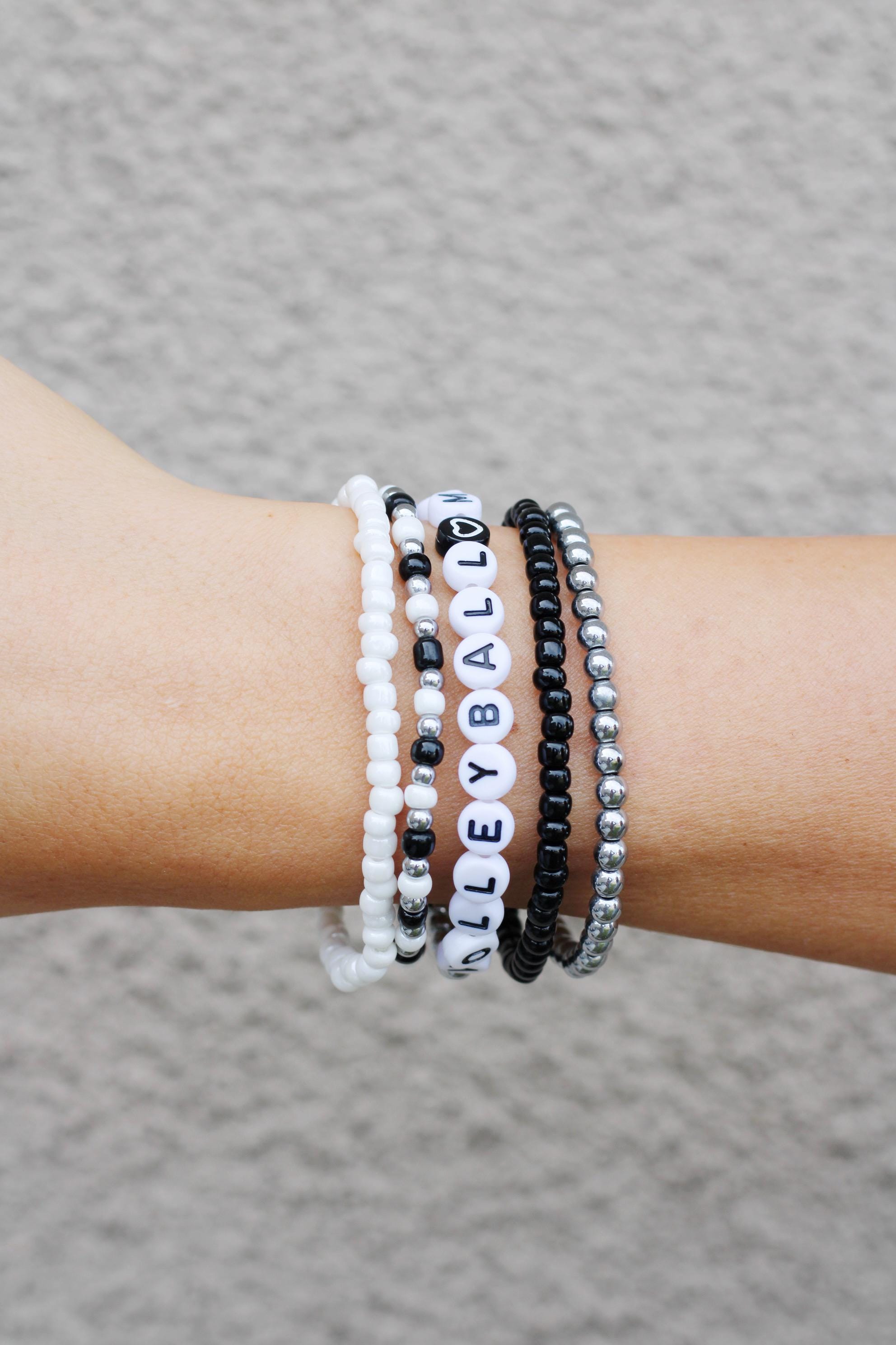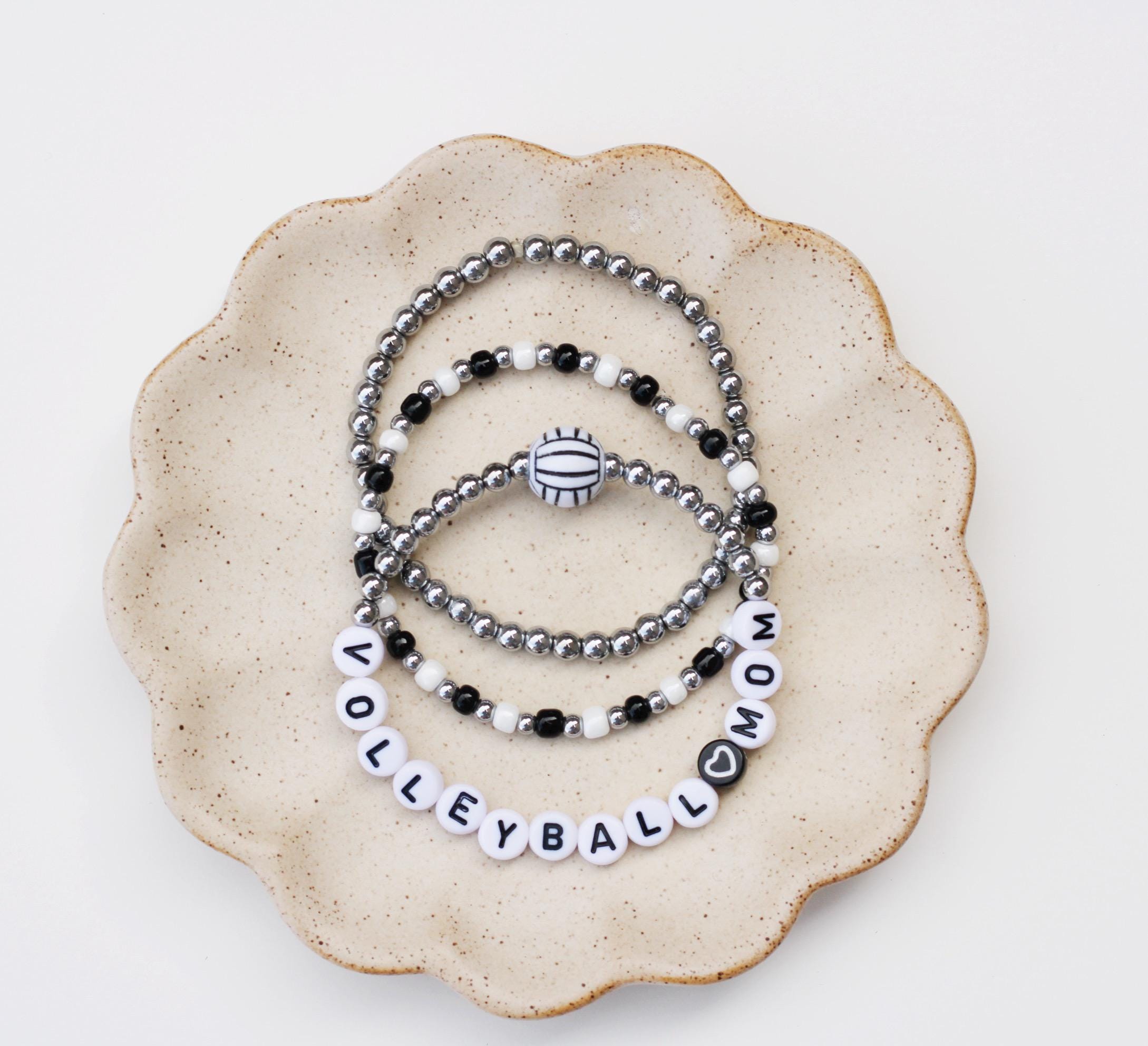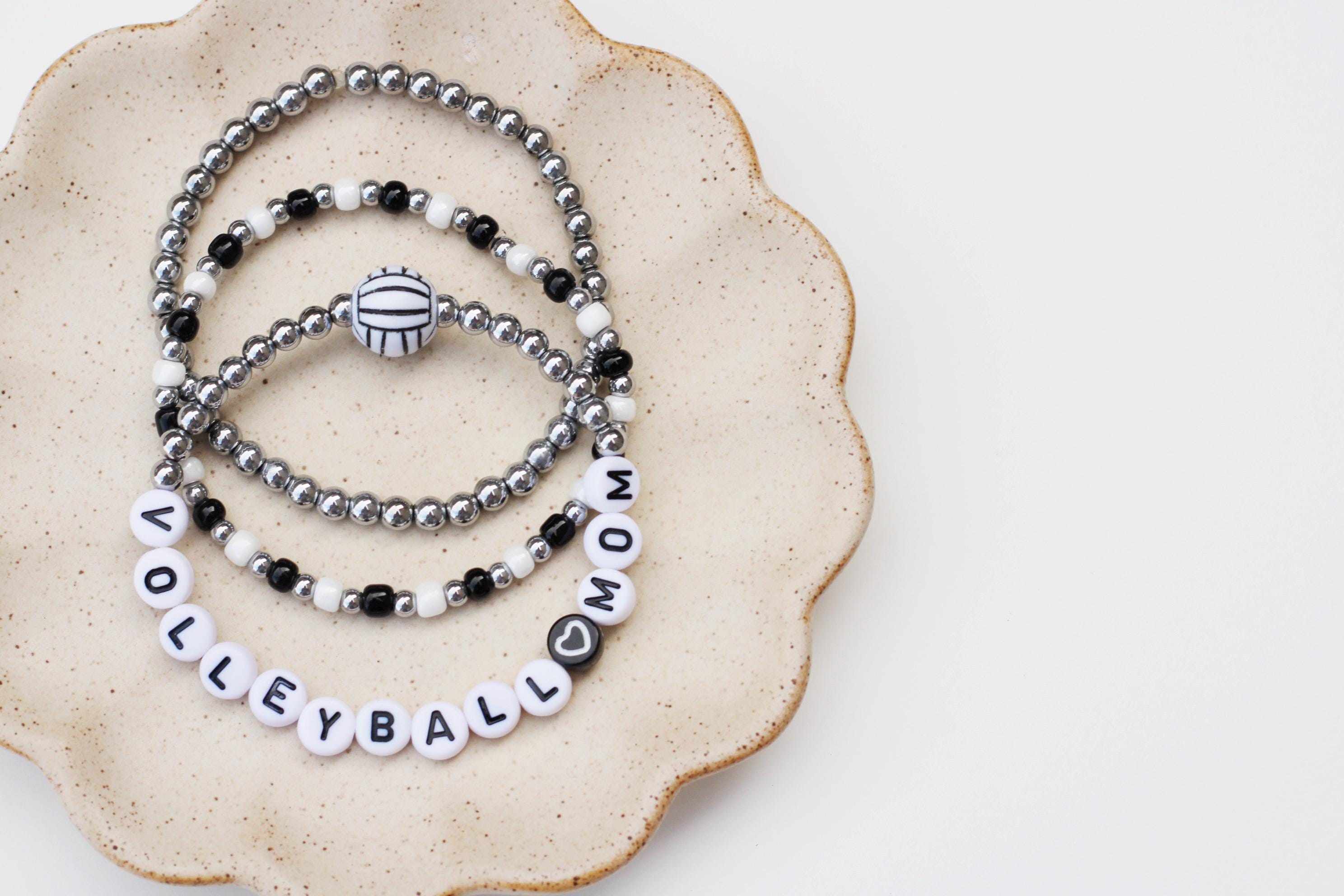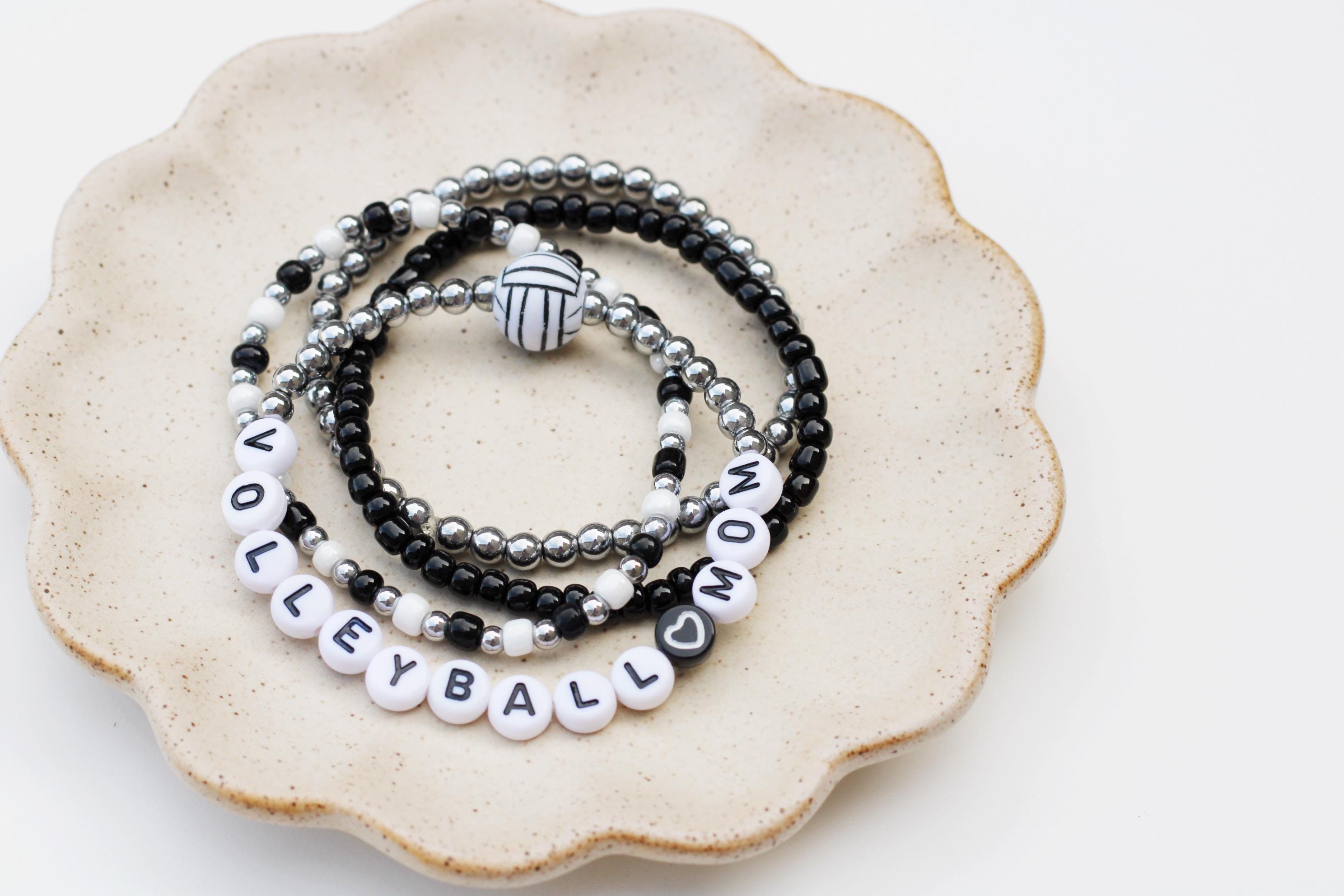 Listing is for one (1) bracelet containing 4mm 18k gold, silver or rose gold plated hematite beads, white/black letter beads and accented with a Volleyball bead.