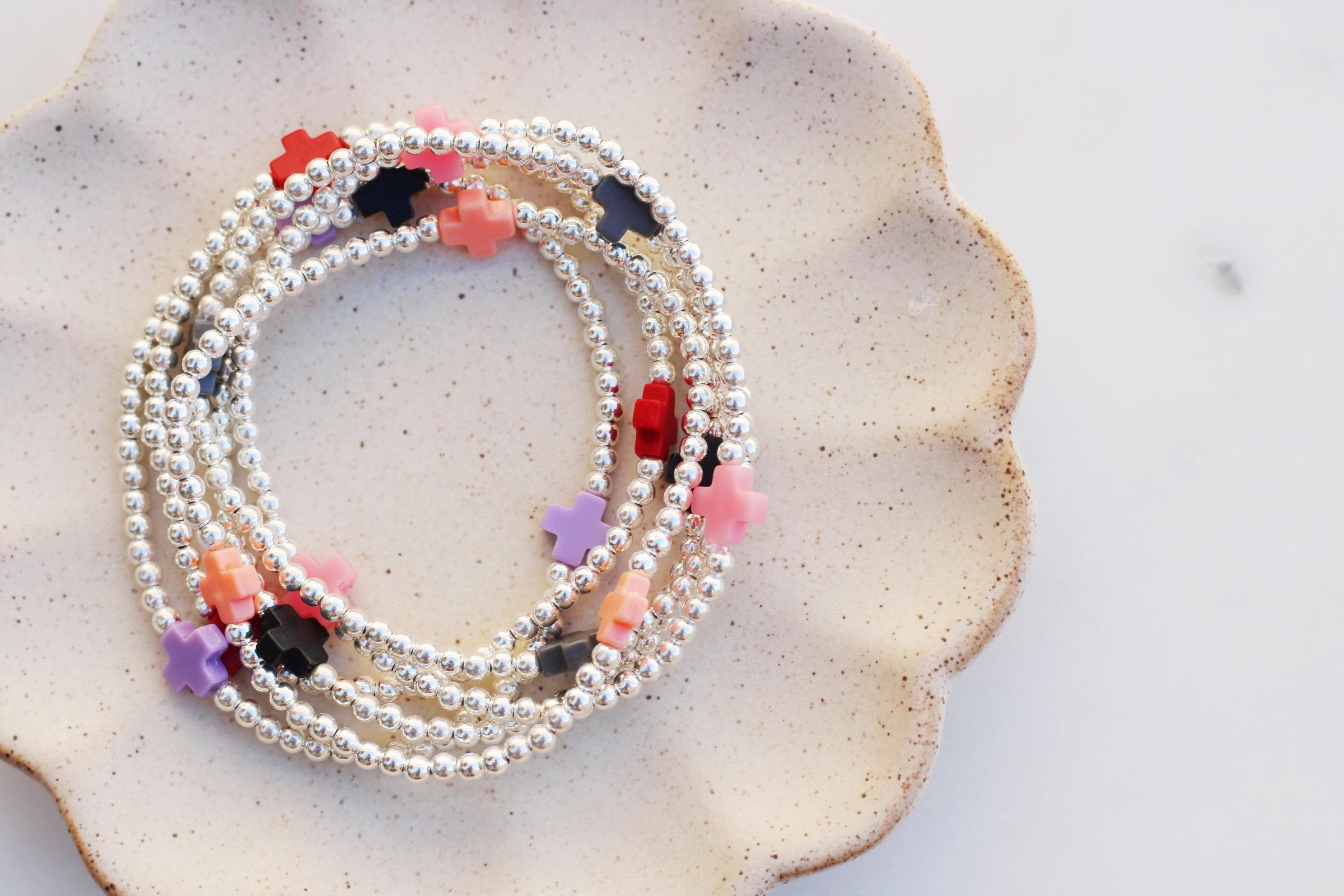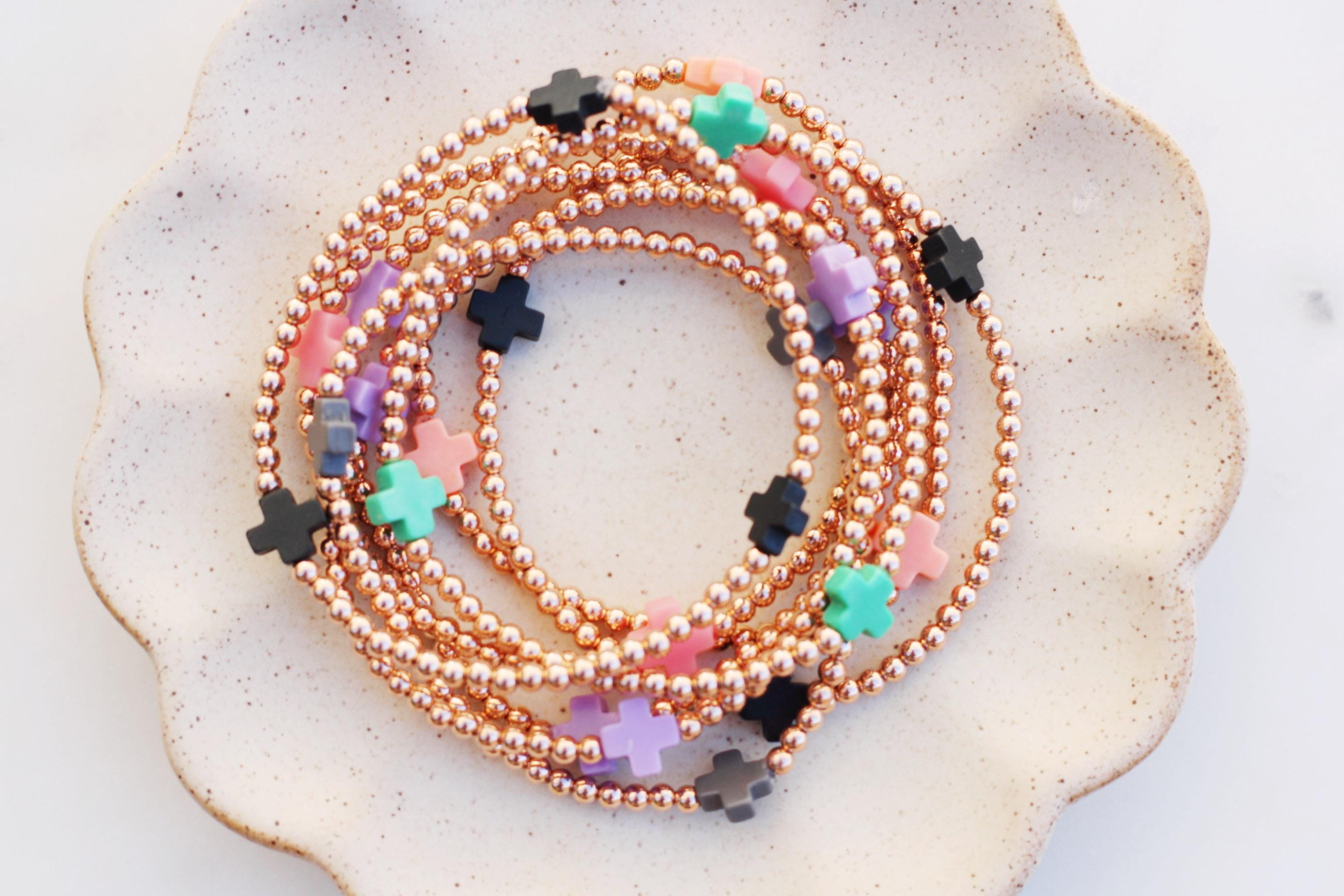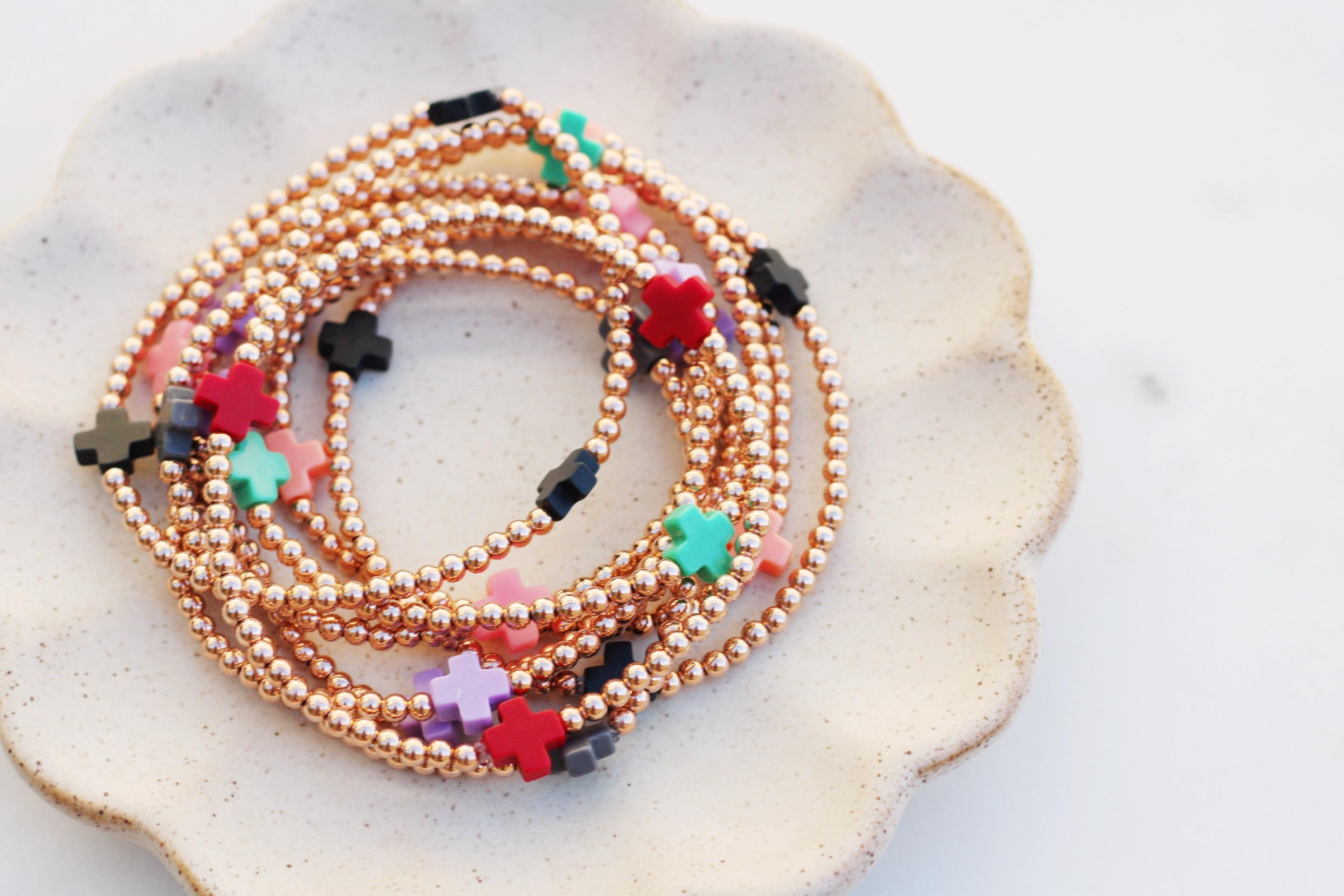 A cool, lightweight stretch bracelet. Uniquely crafted with 3mm 18k gold/rose gold/silver plated hematite beads or gold/rose gold filled/sterling silver beads and accented with 3 colored cross beads.
