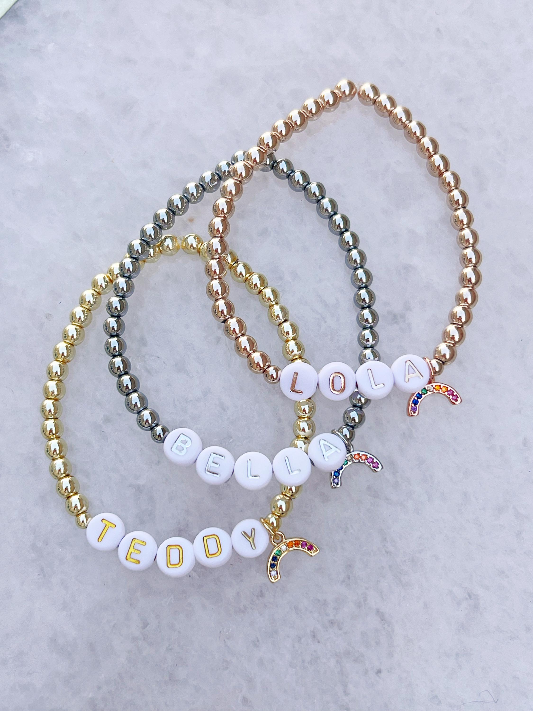 A cool, lightweight stretch bracelet. Uniquely crafted with 4mm gold, rose gold or silver beads and matching letters and accented with a gold/rose gold/silver plated rainbow charm.