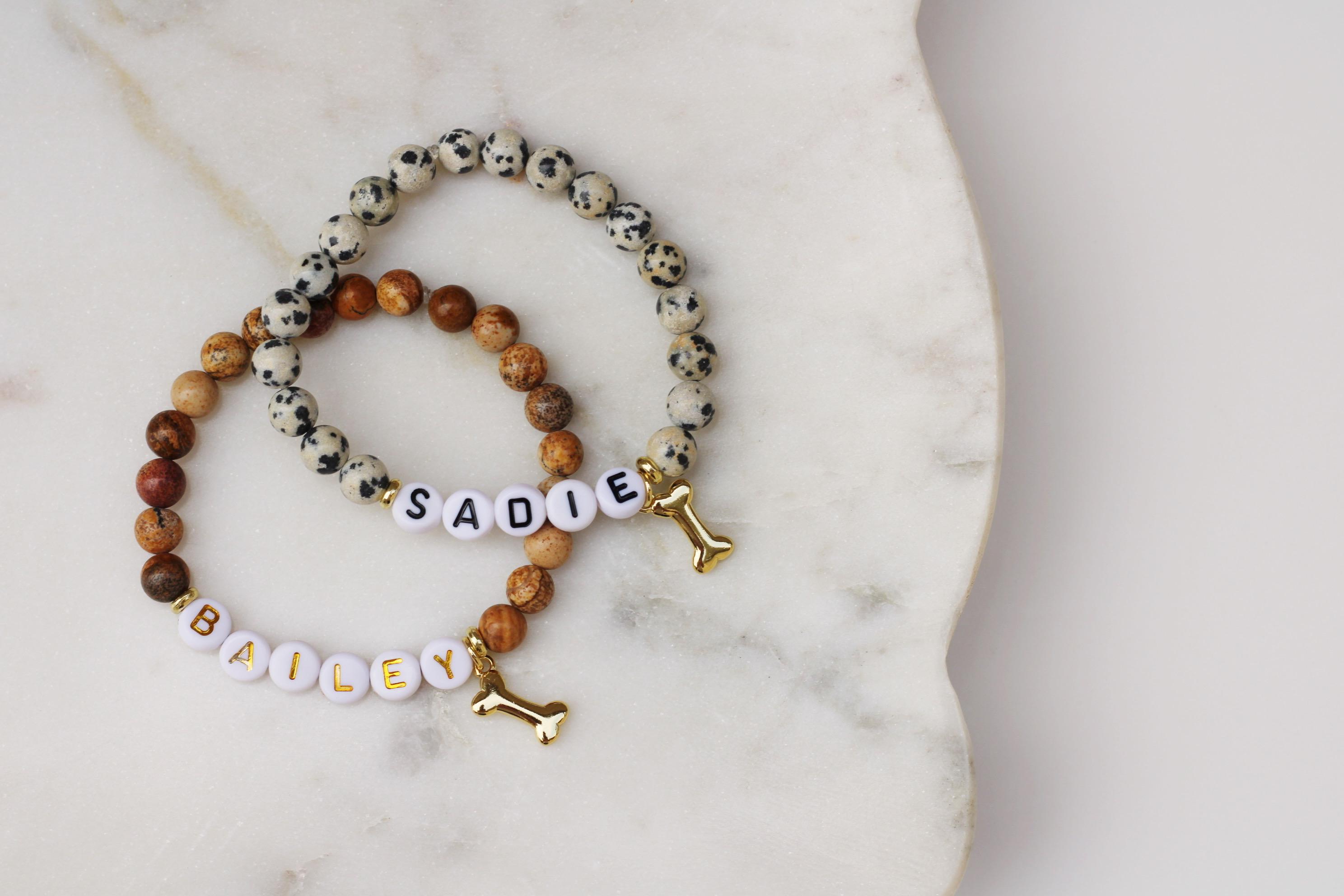 dog lover, pet jewelry, dog mom, pet memorial, bone bead, pet memorial name bracelet, dog name stone bracelet, custom beaded dog name bracelet