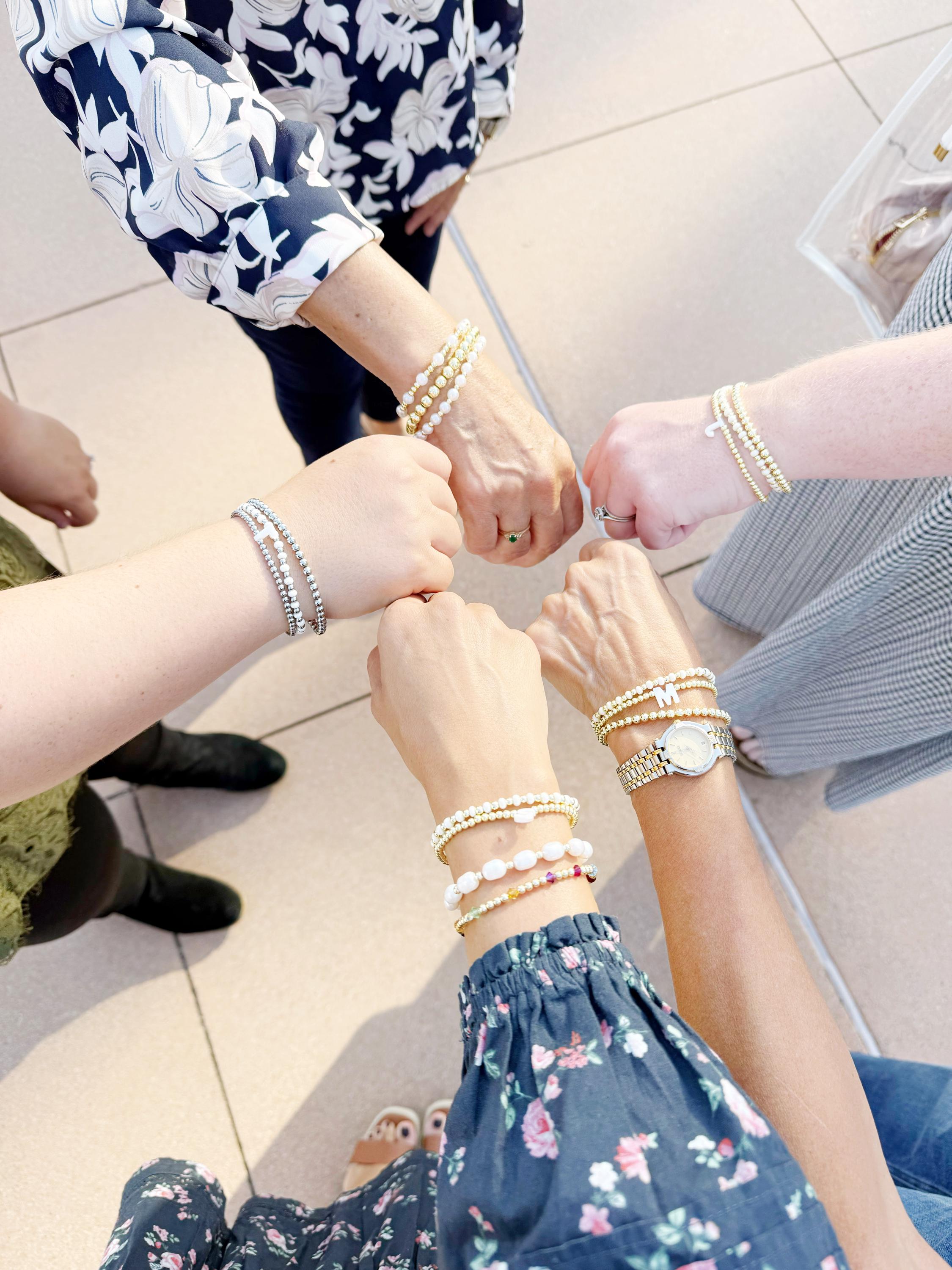 A pretty, lightweight stretch bracelet. Uniquely crafted with 18k 3mm gold, silver or rose gold plated hematite beads and accented with a natural freshwater pearl shell initial bead.