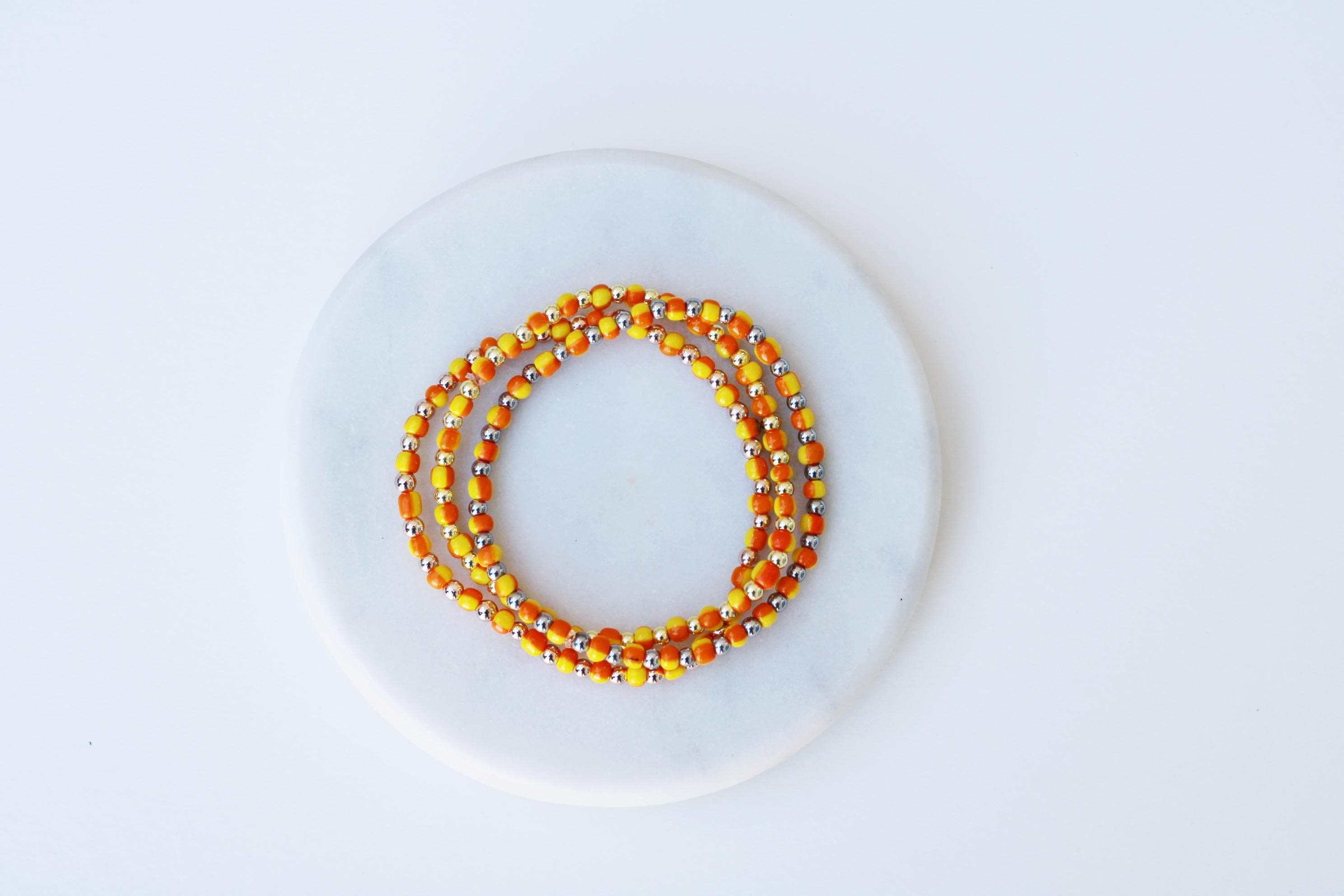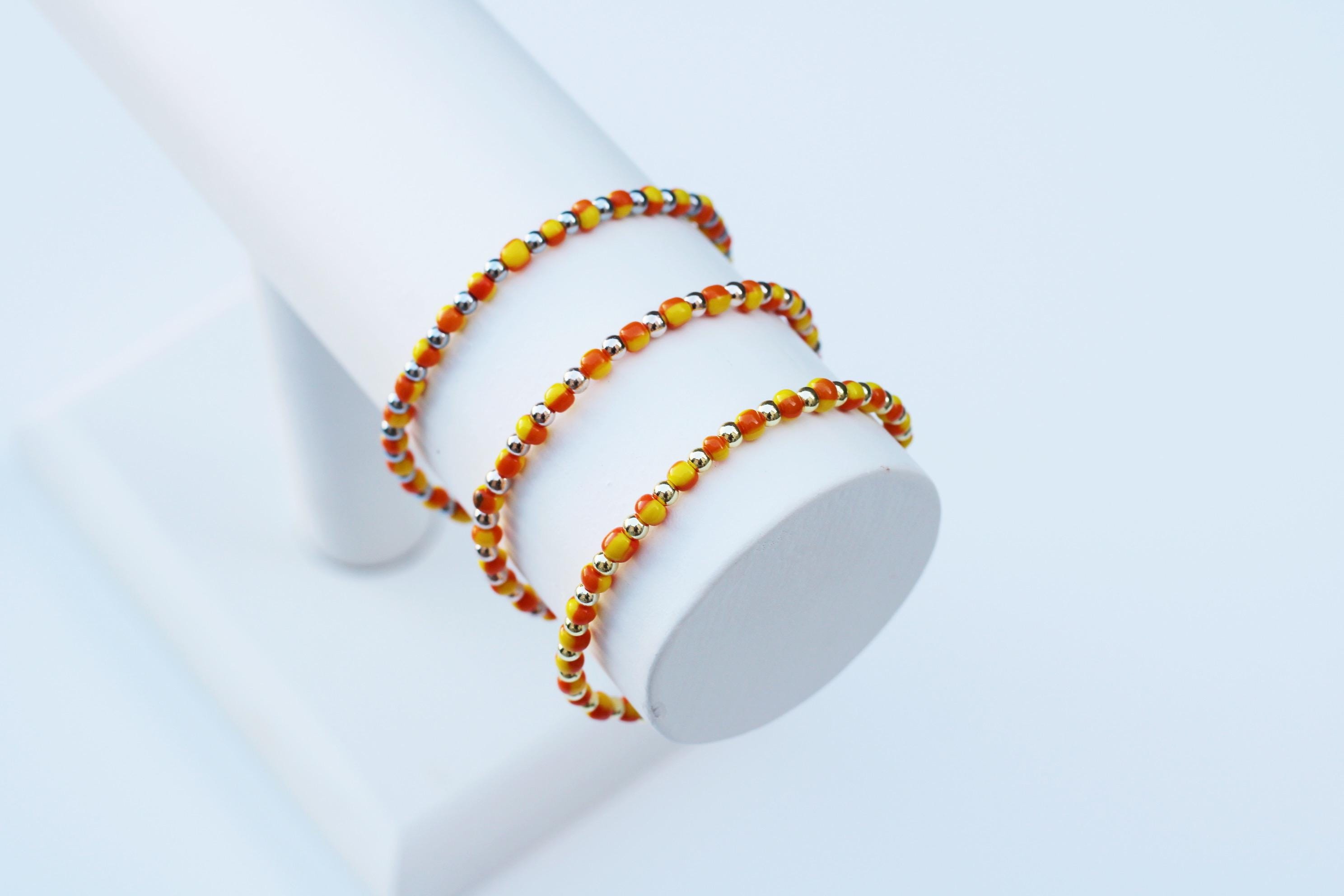 A sparkly, lightweight stretch bracelet. Uniquely crafted with 4mm striped glass seed beads and accented with 18k 3mm gold/rose gold/silver plated hematite beads.