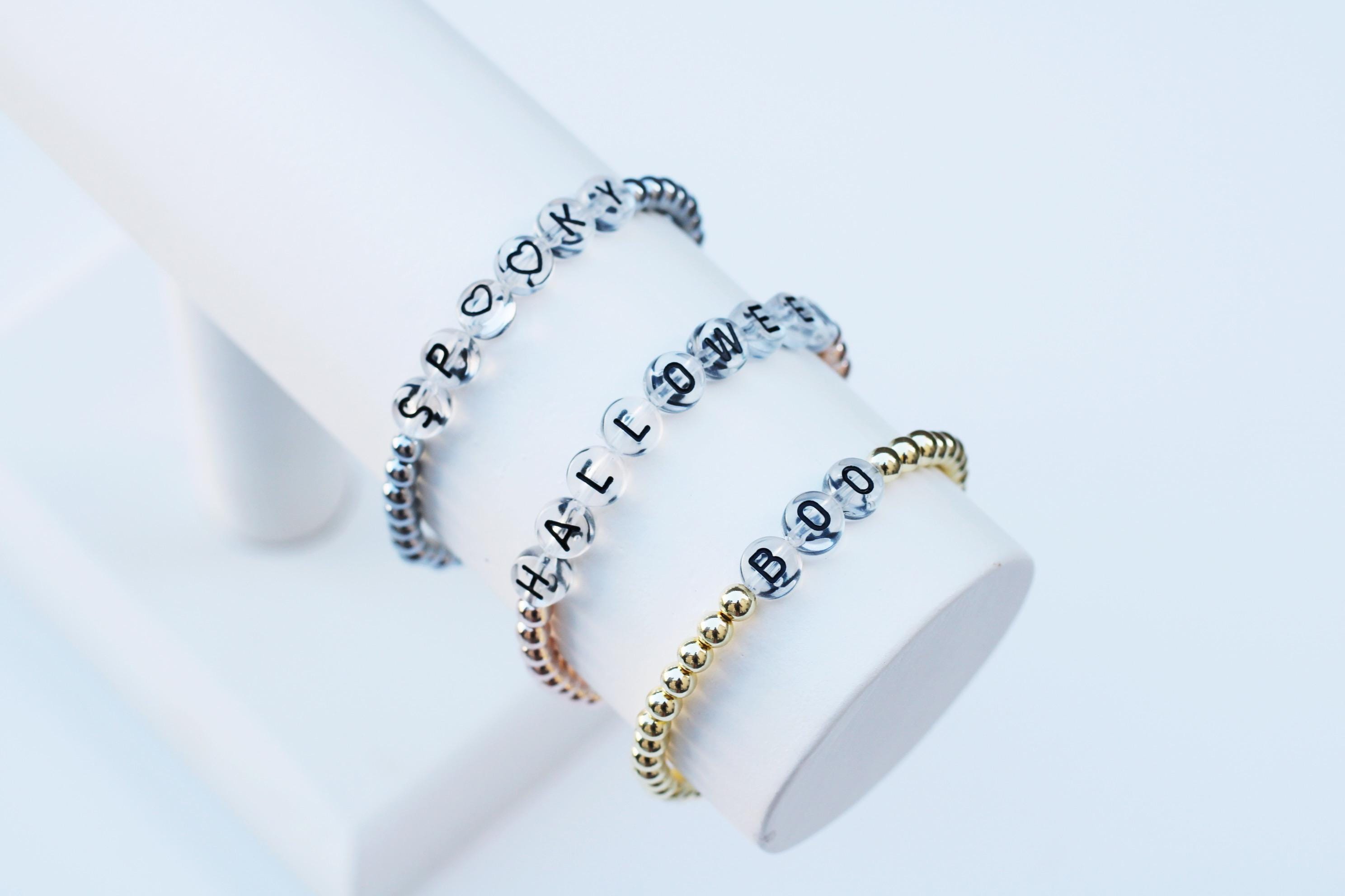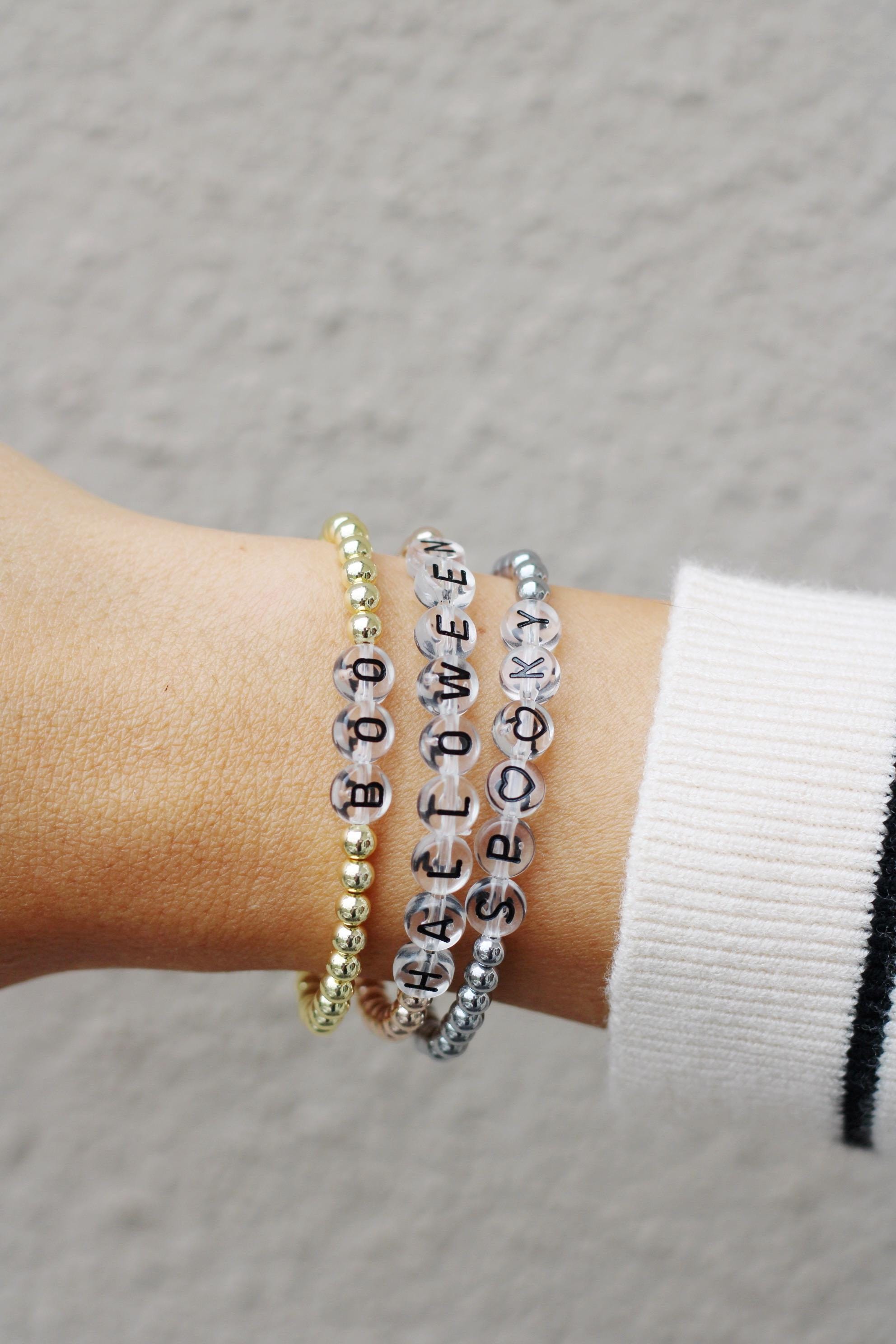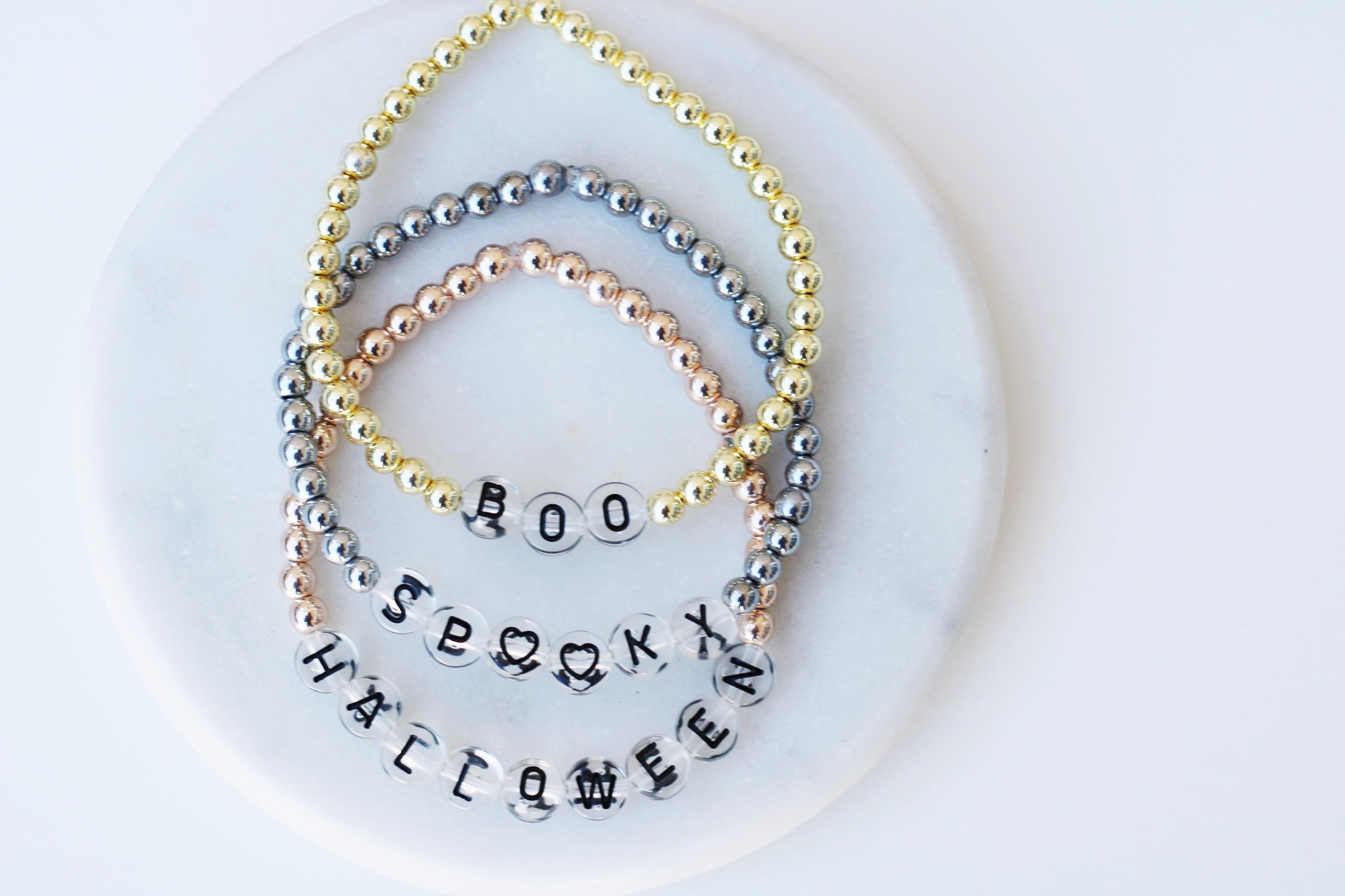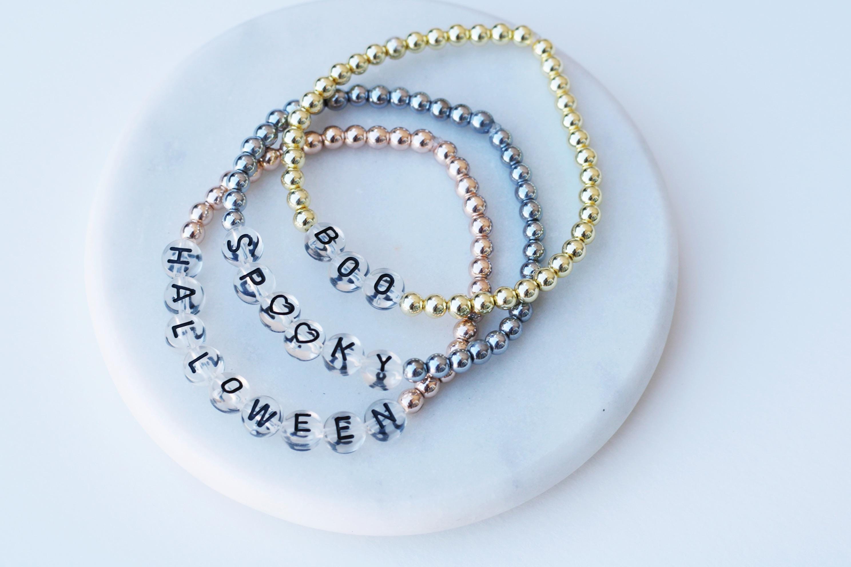 This listing is for one bracelet with 4mm 18k gold, silver or rose gold plated hematite beads and clear/black letters. No matching numbers - only flower, stars, hearts and moon symbols available.
