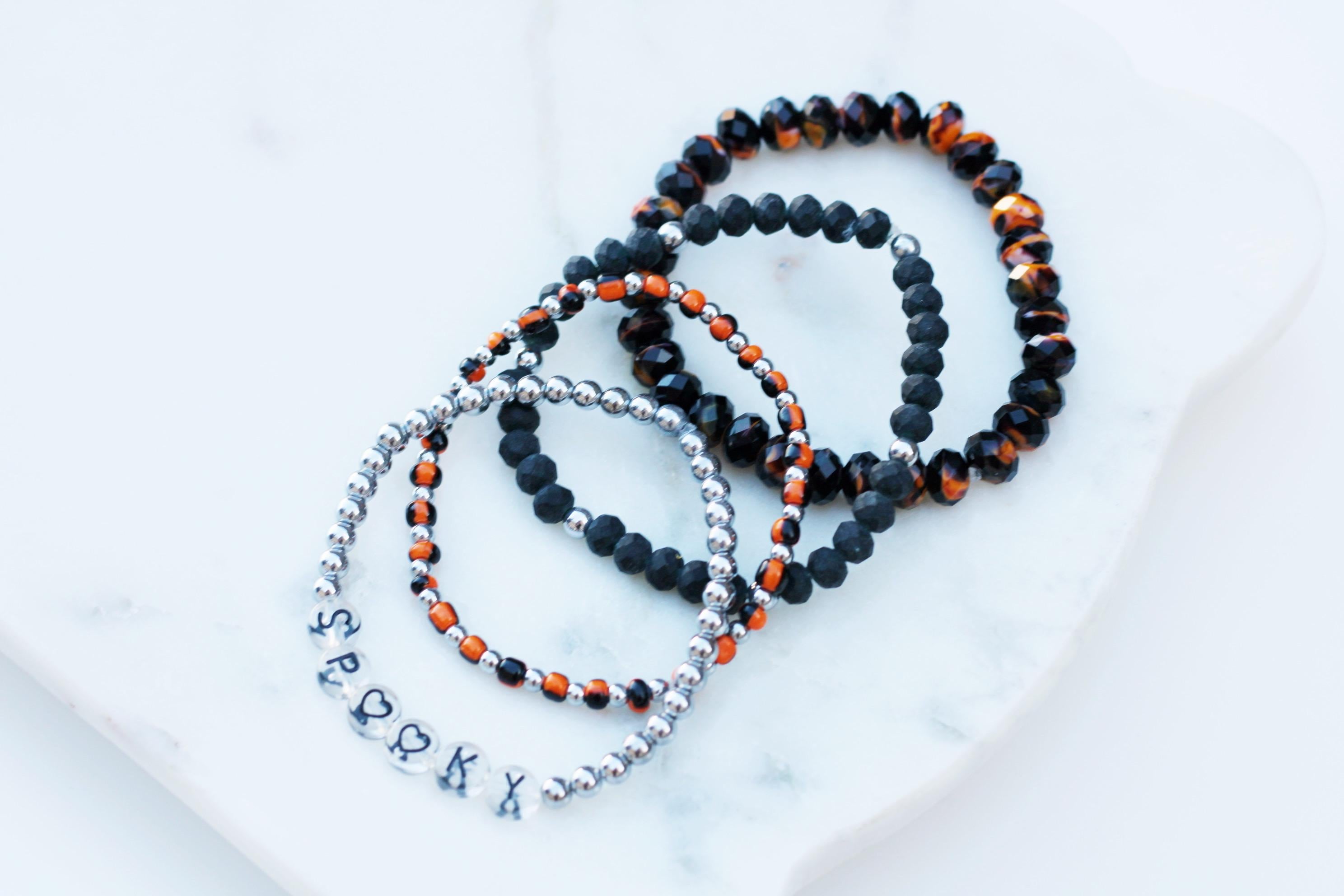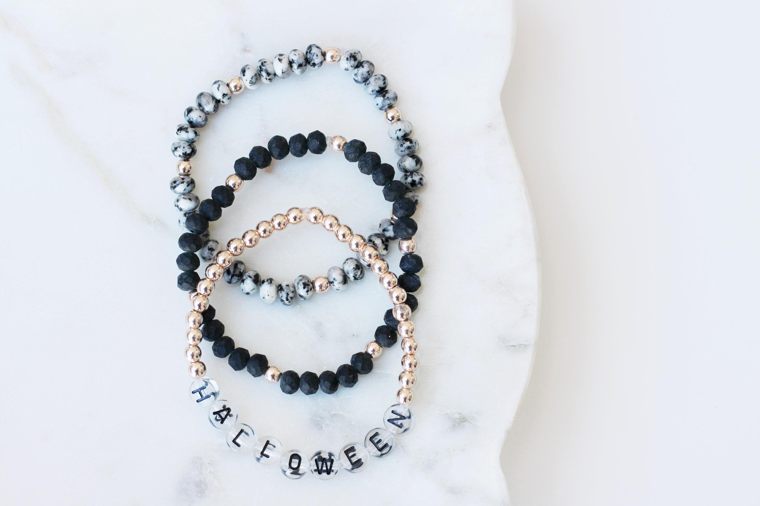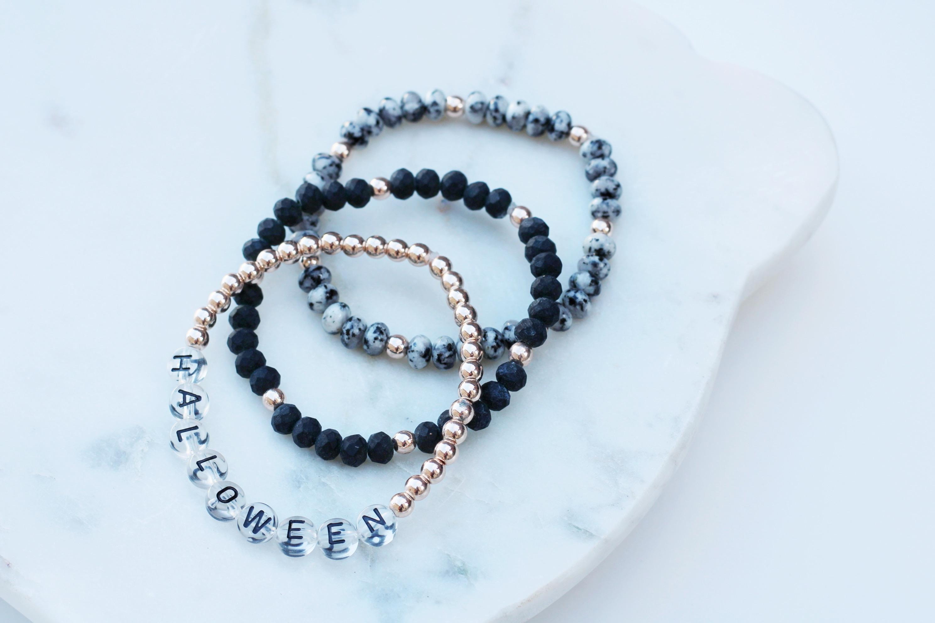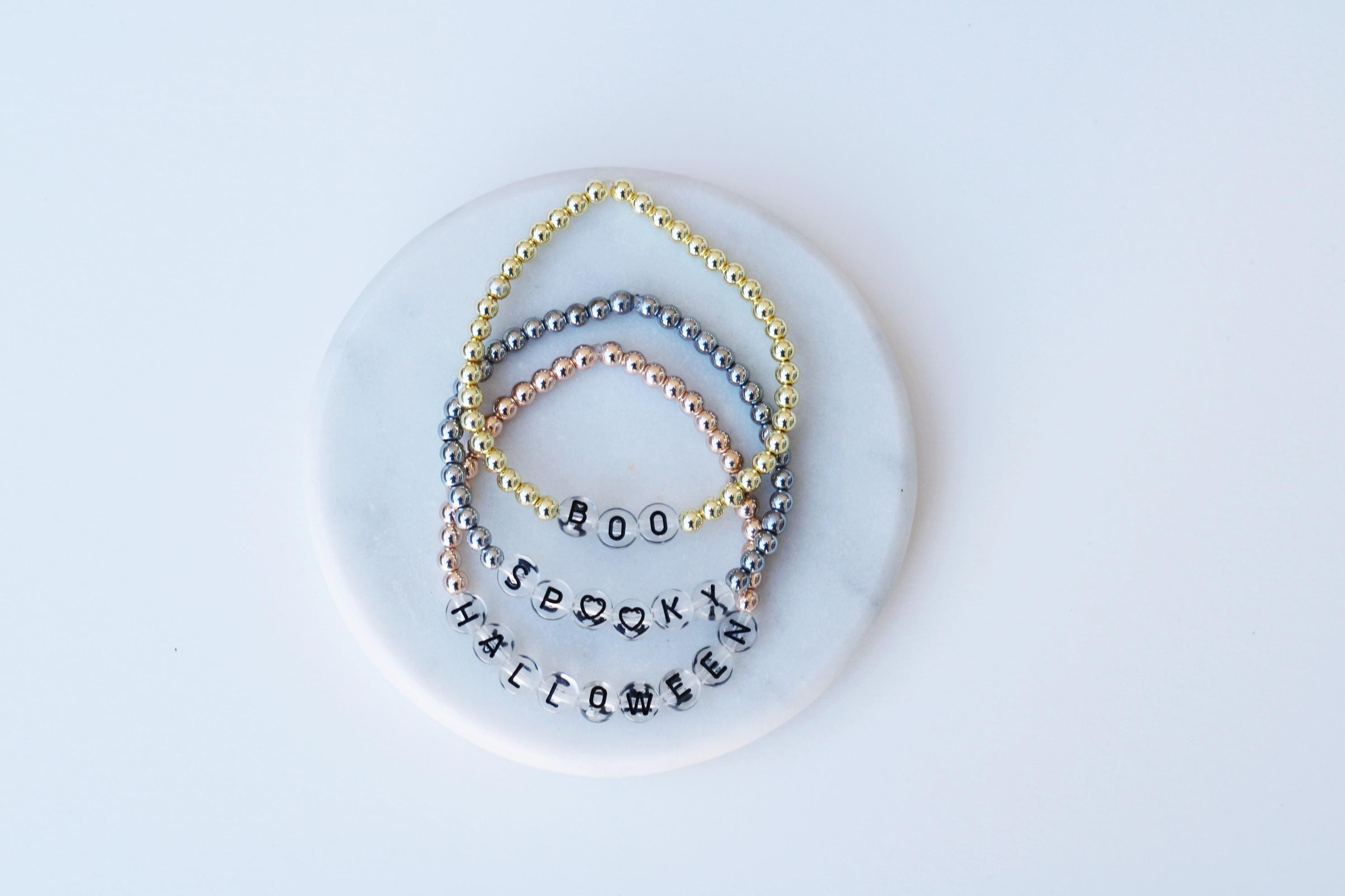 This listing is for one bracelet with 4mm 18k gold, silver or rose gold plated hematite beads and clear/black letters. No matching numbers - only flower, stars, hearts and moon symbols available.