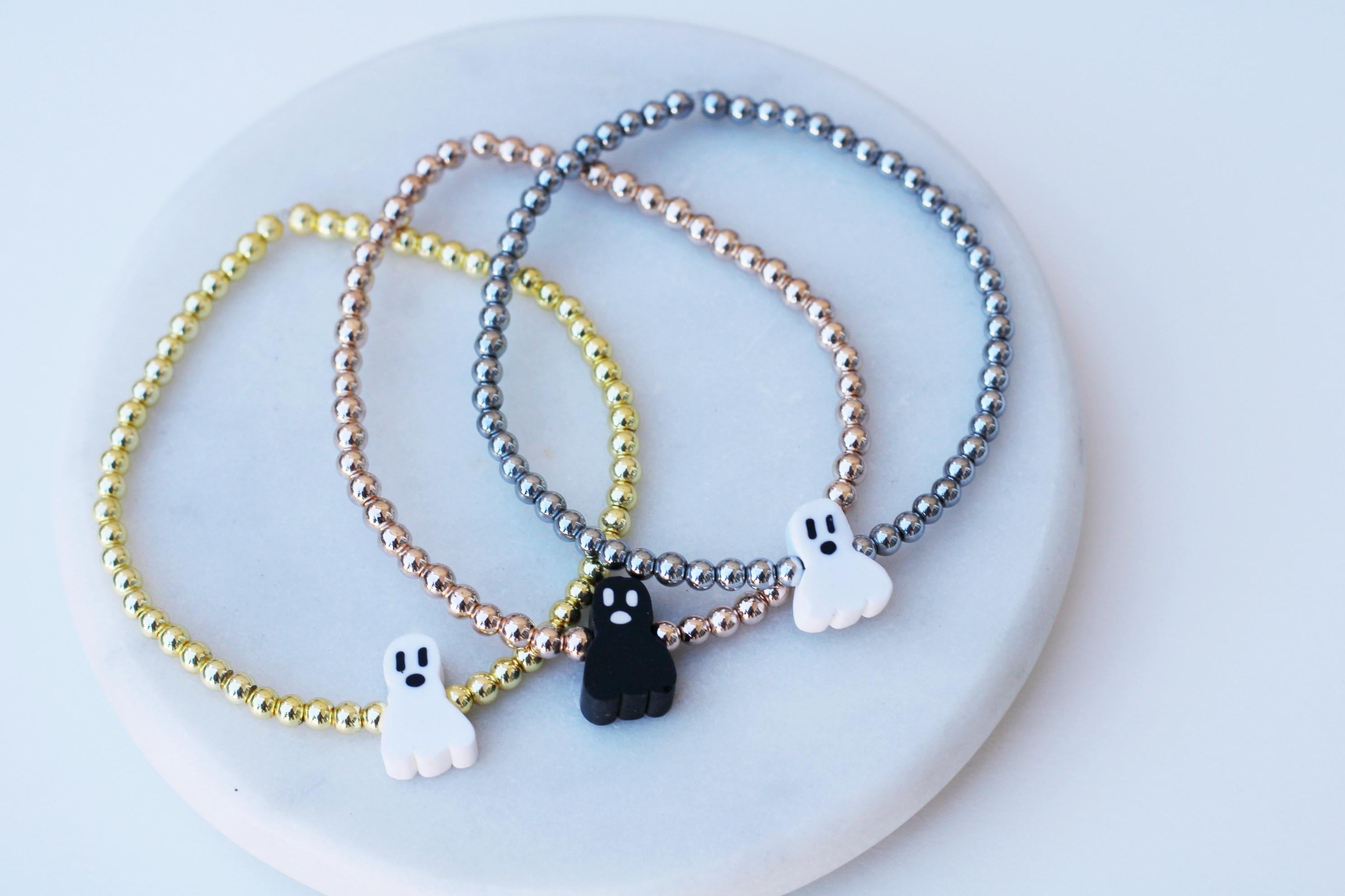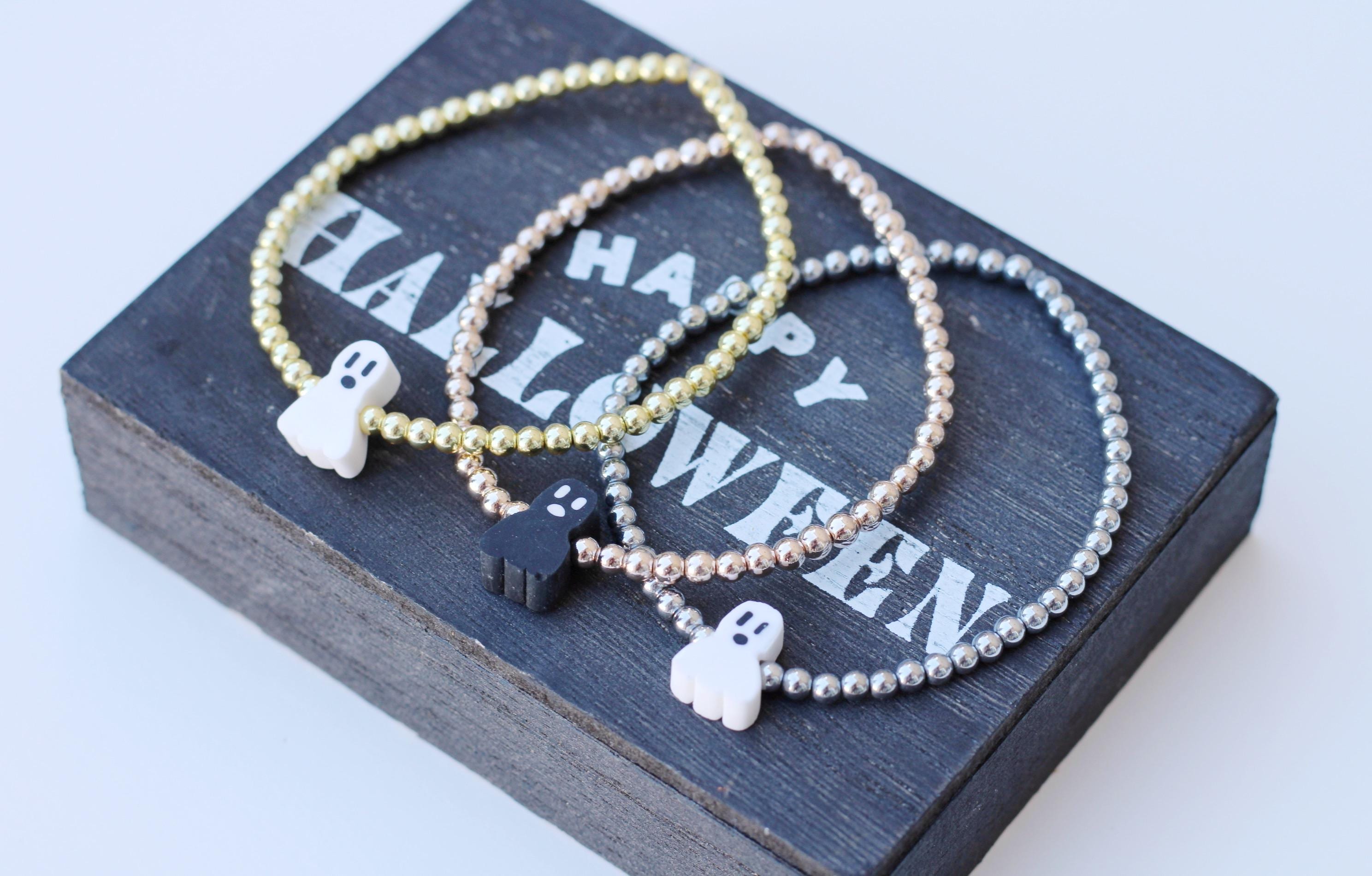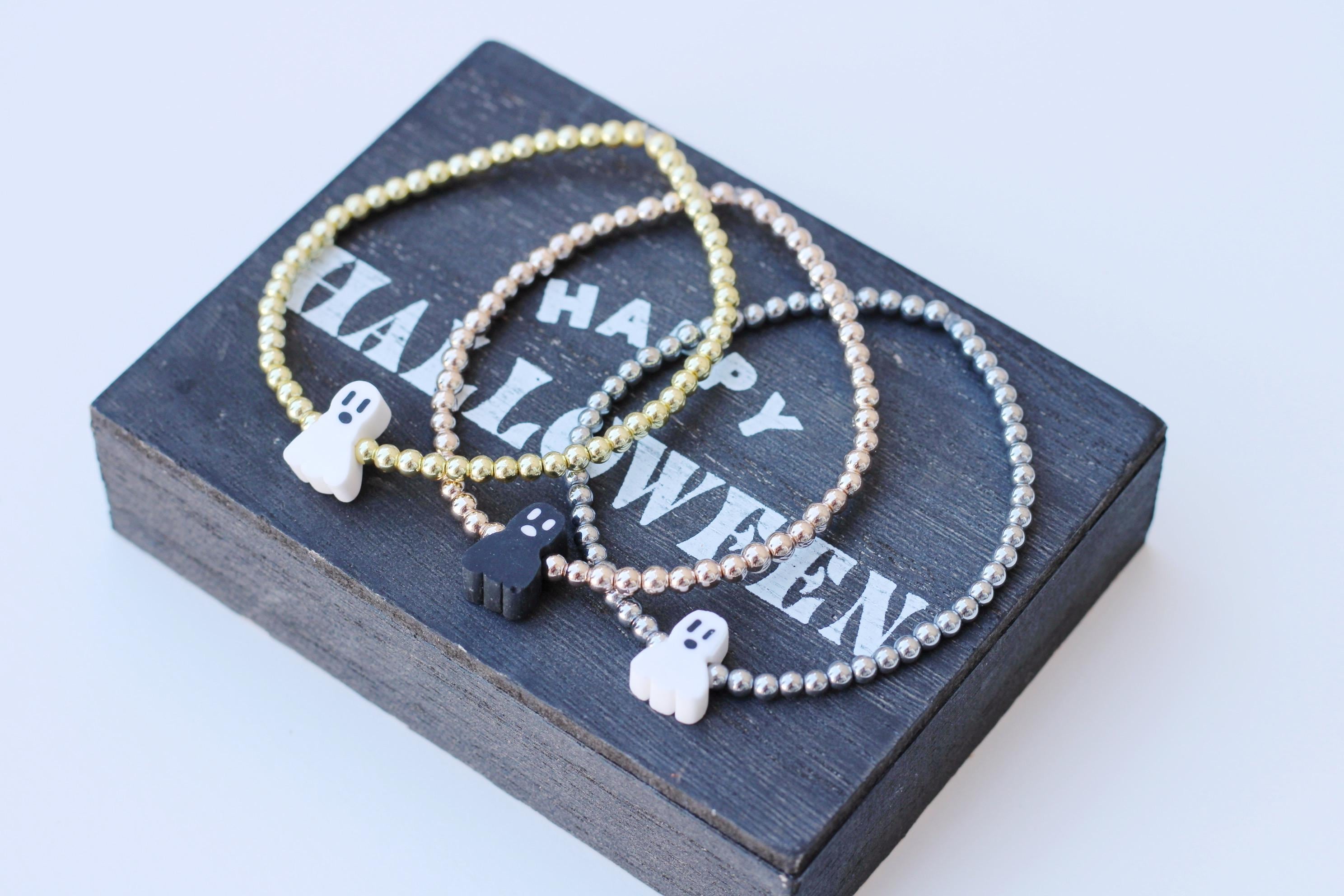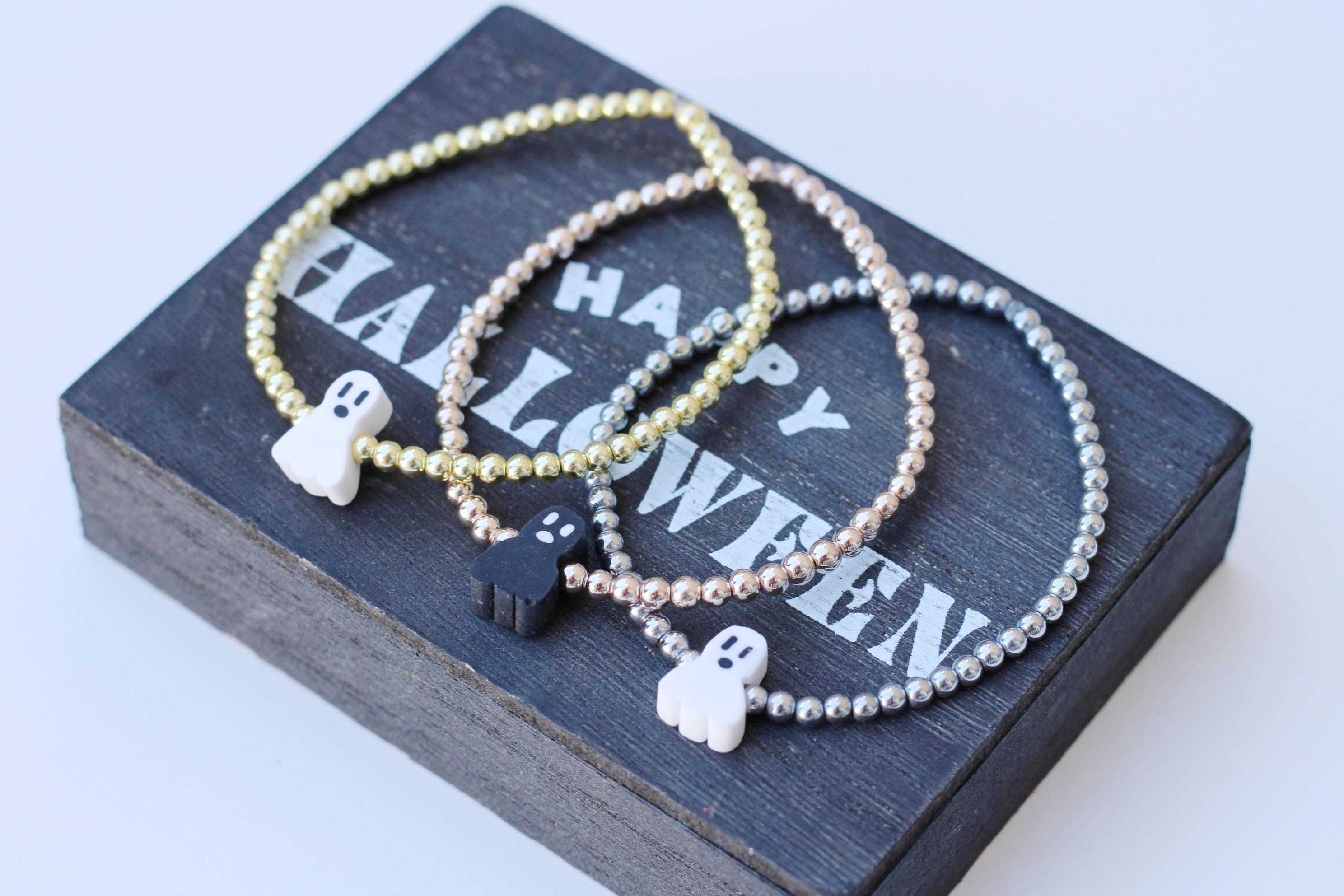 A cool, lightweight stretch bracelet. Uniquely crafted with 18k 3mm gold, silver or rose gold plated hematite beads and accented with a polymer Halloween themed bead in black or white.
