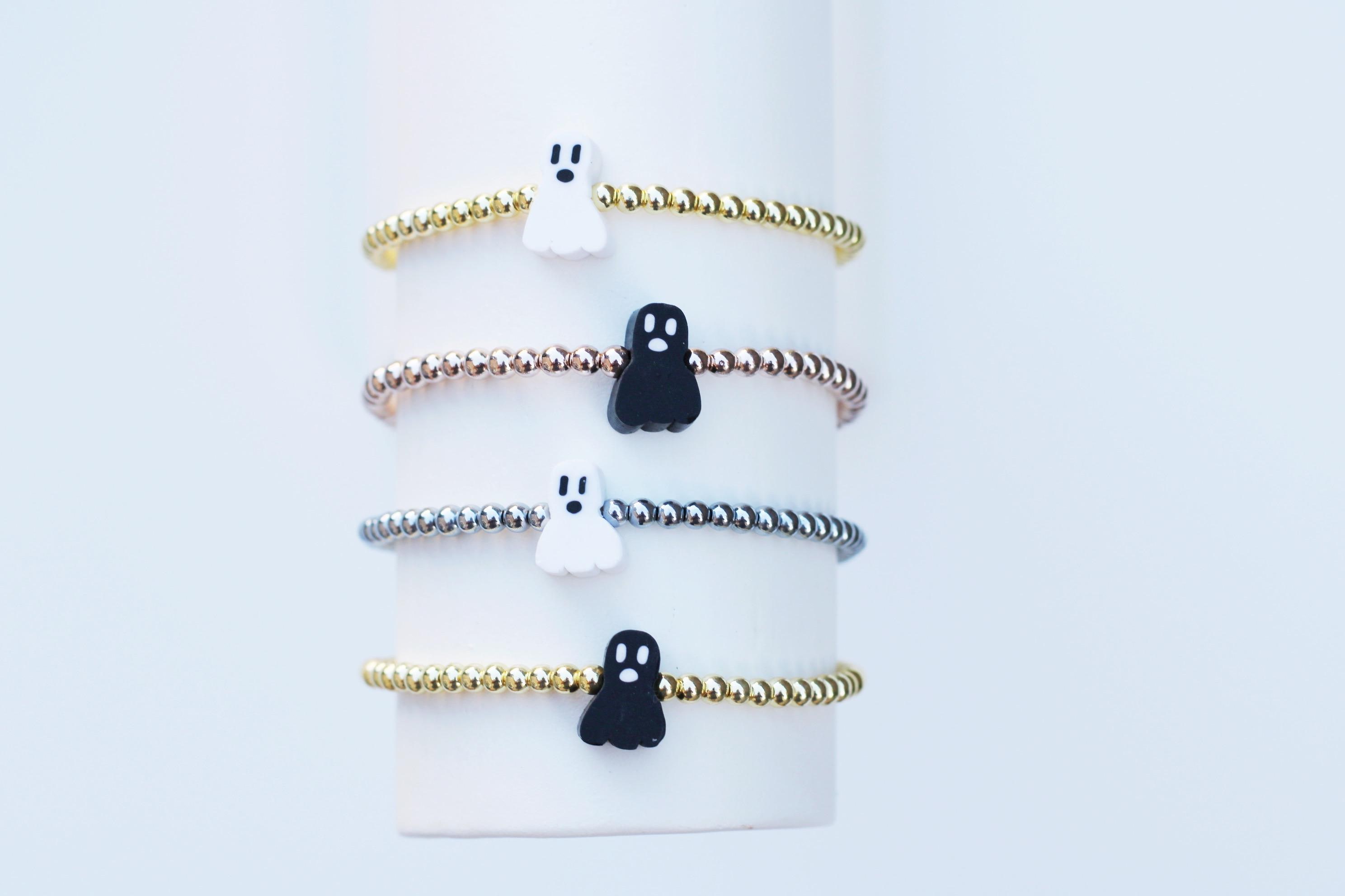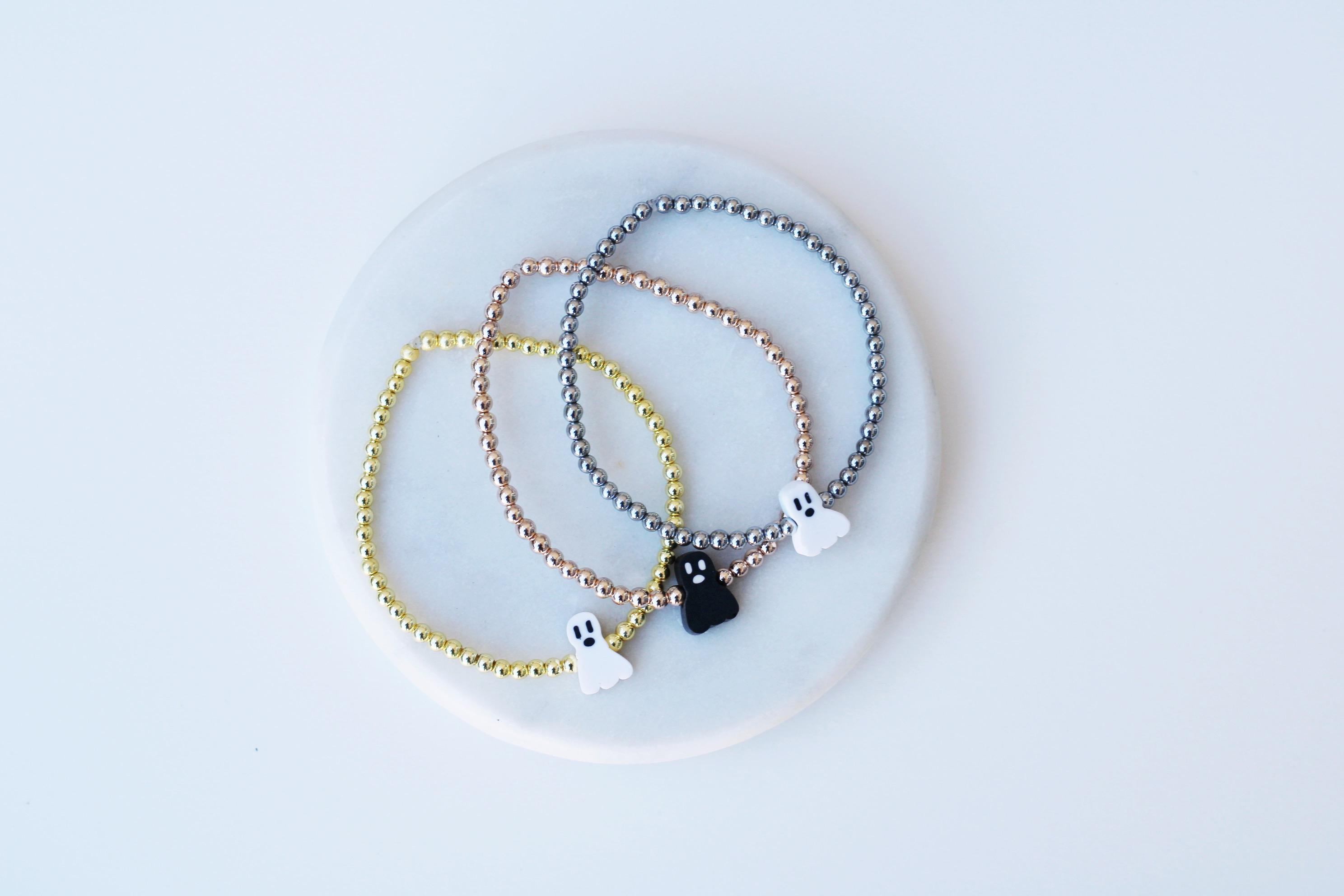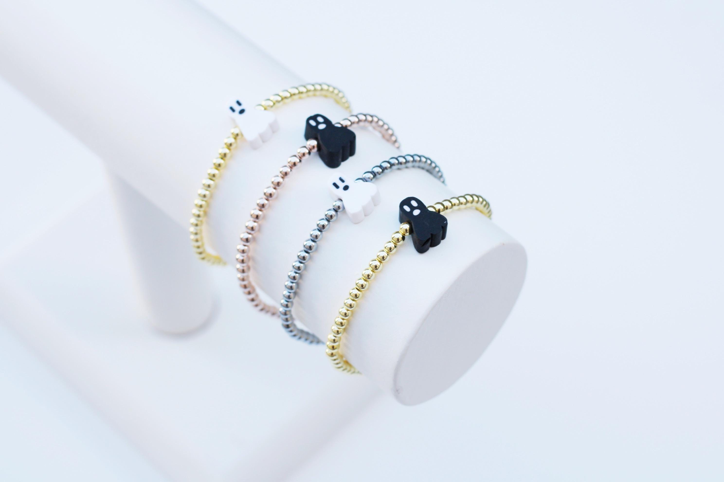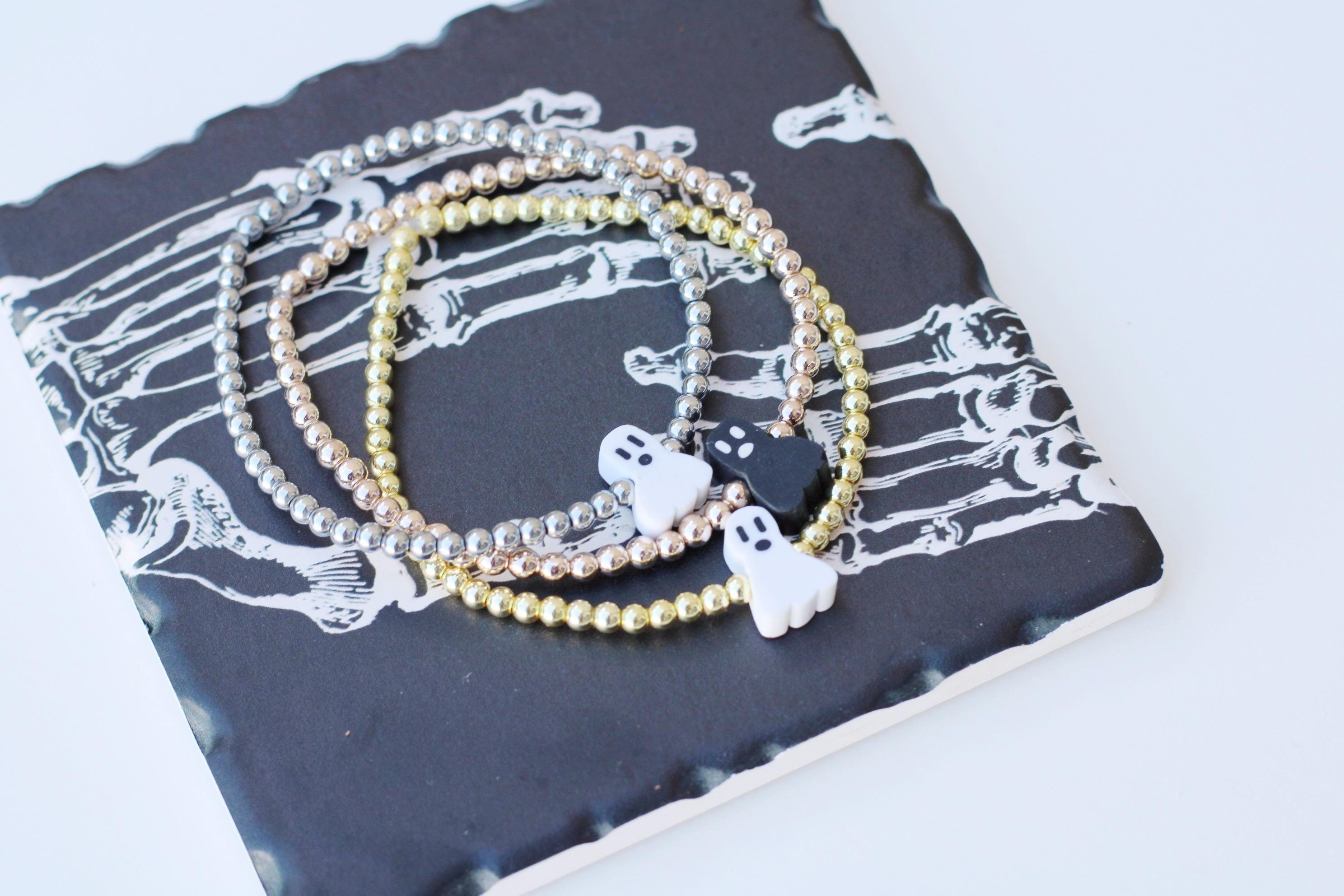 A cool, lightweight stretch bracelet. Uniquely crafted with 18k 3mm gold, silver or rose gold plated hematite beads and accented with a polymer Halloween themed bead in black or white.