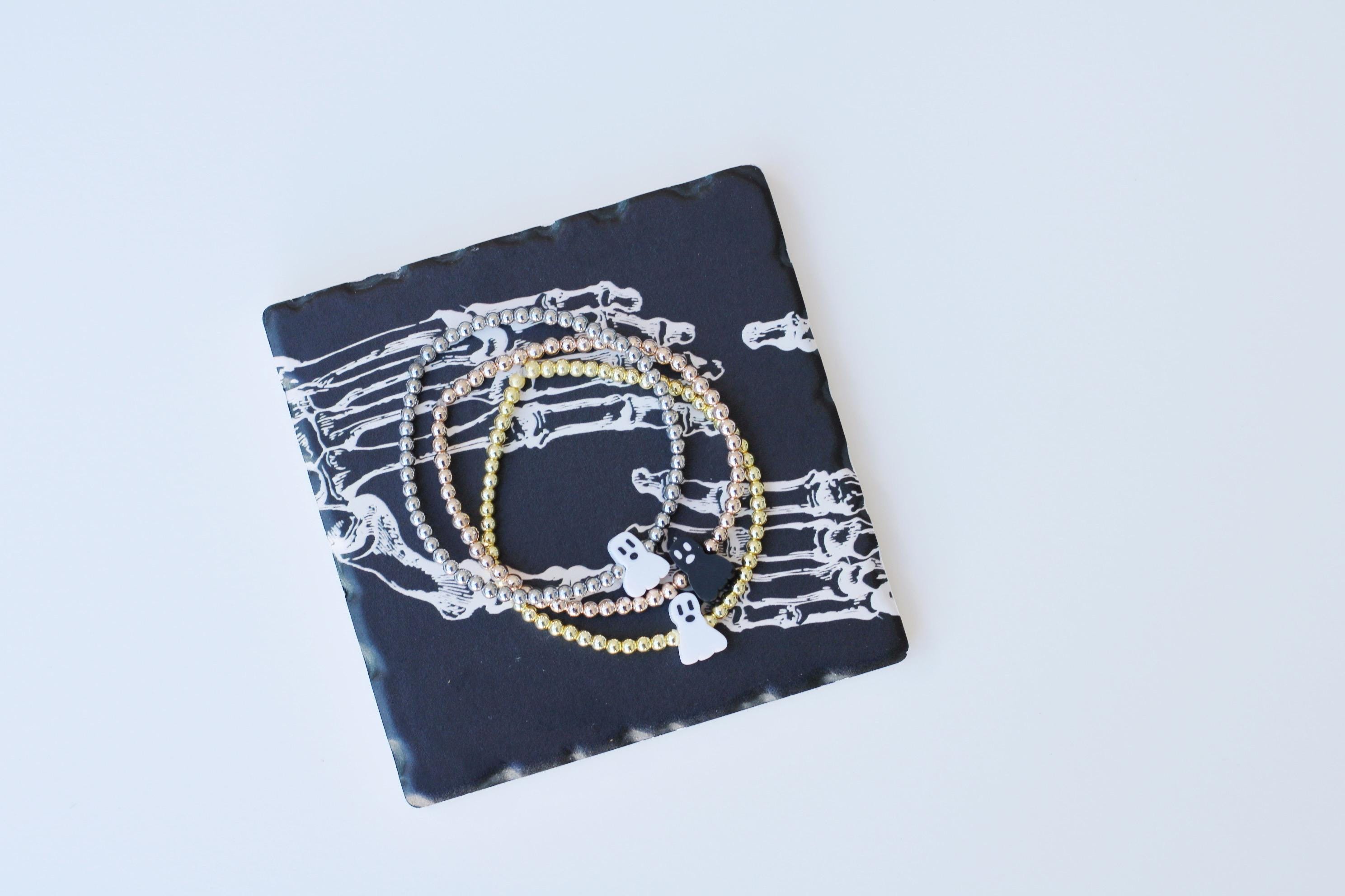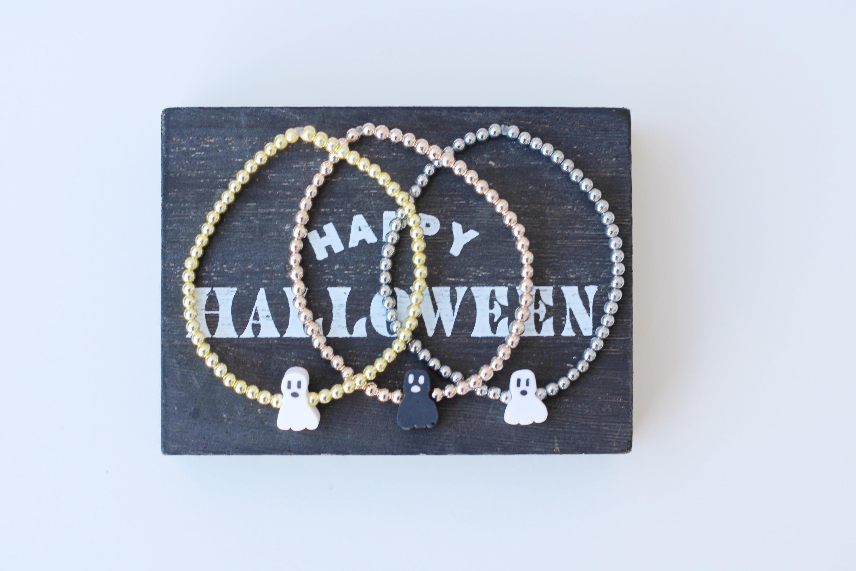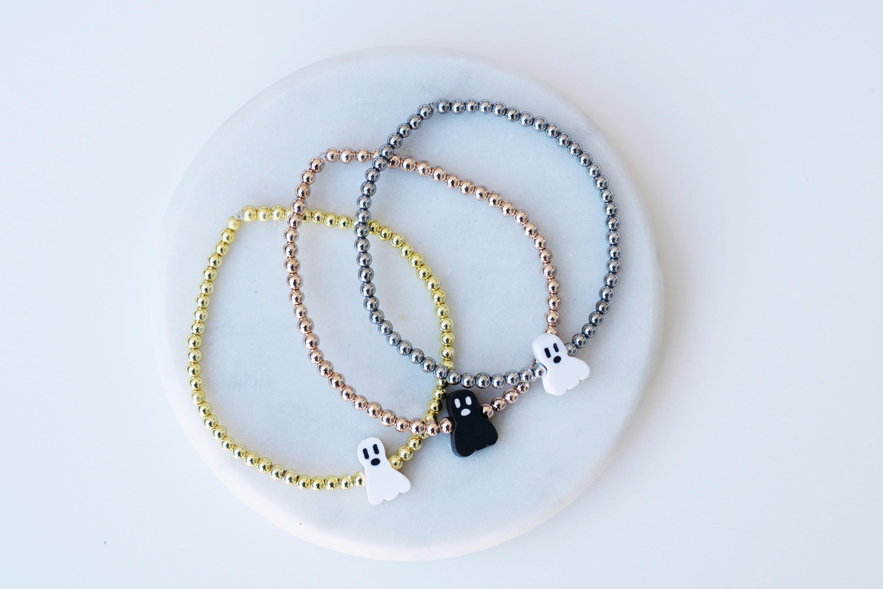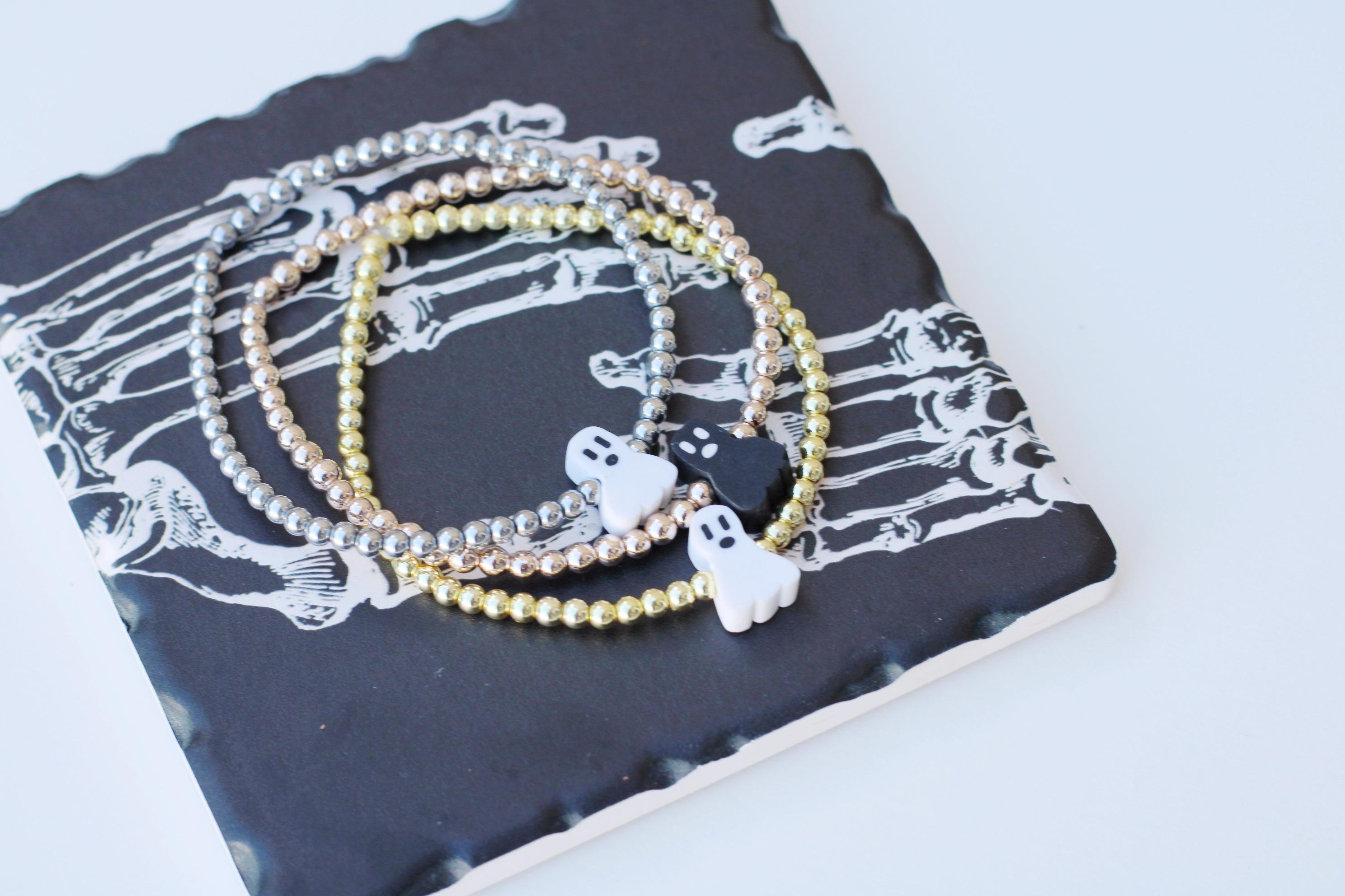 A cool, lightweight stretch bracelet. Uniquely crafted with 18k 3mm gold, silver or rose gold plated hematite beads and accented with a polymer Halloween themed bead in black or white.