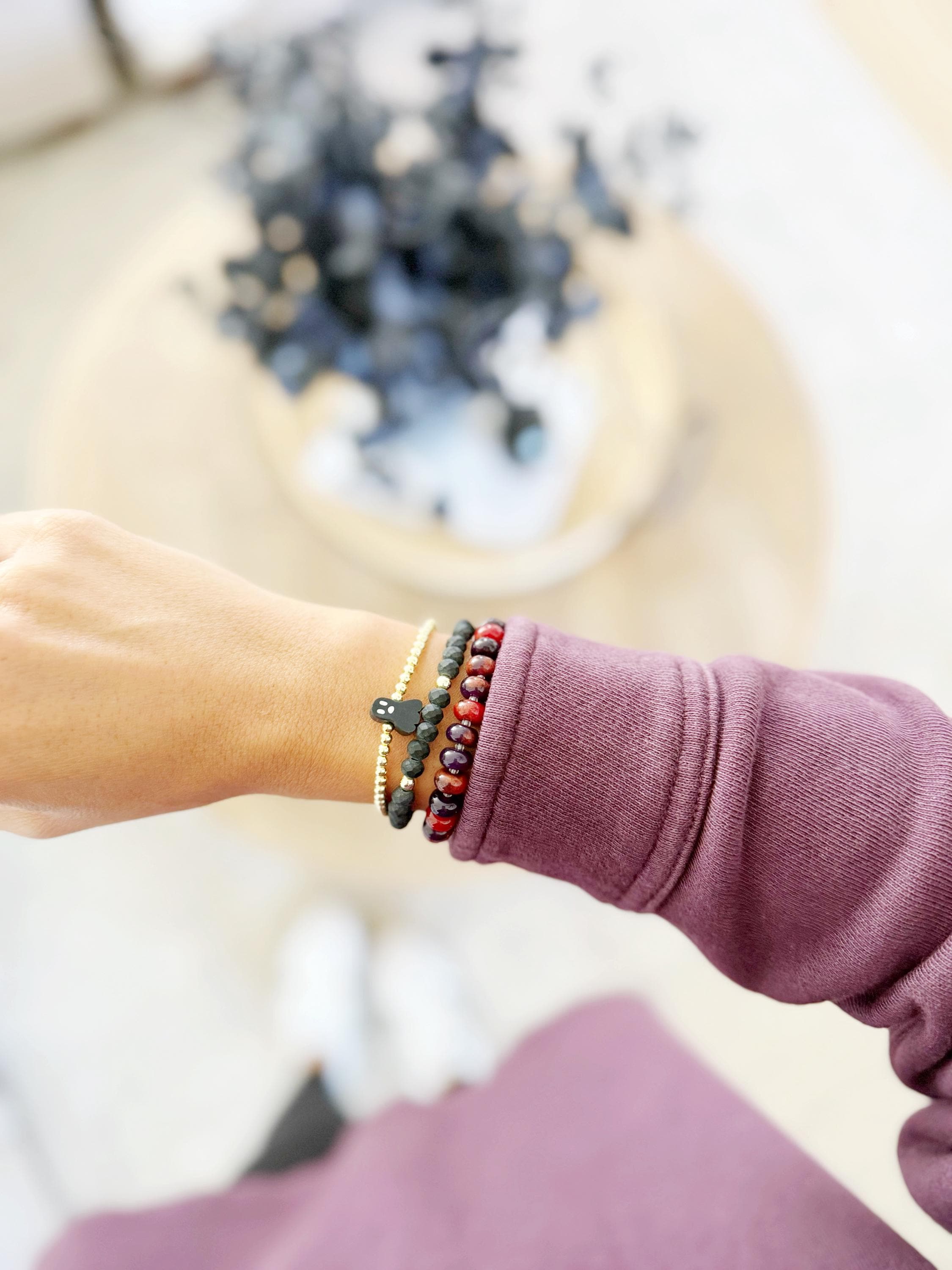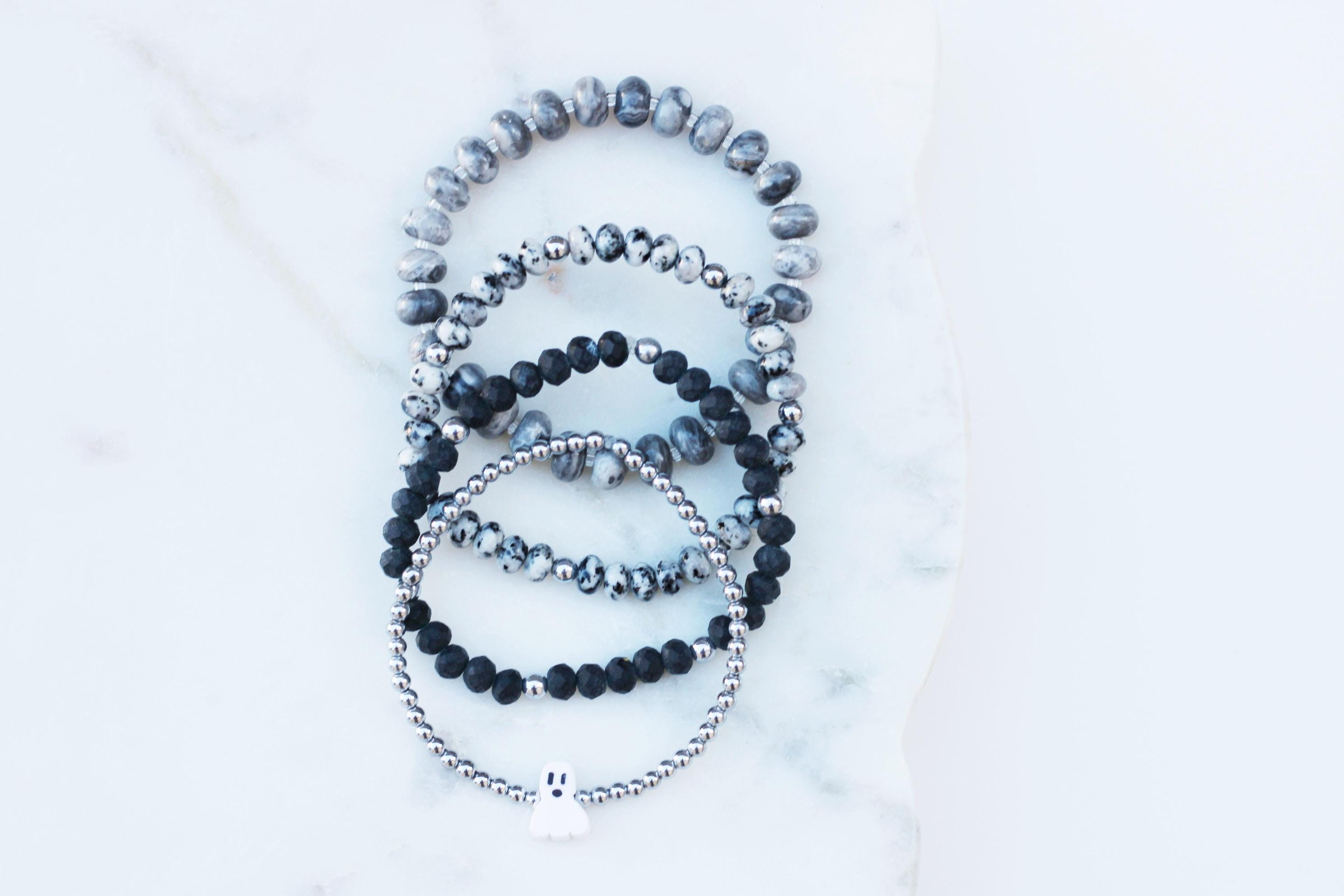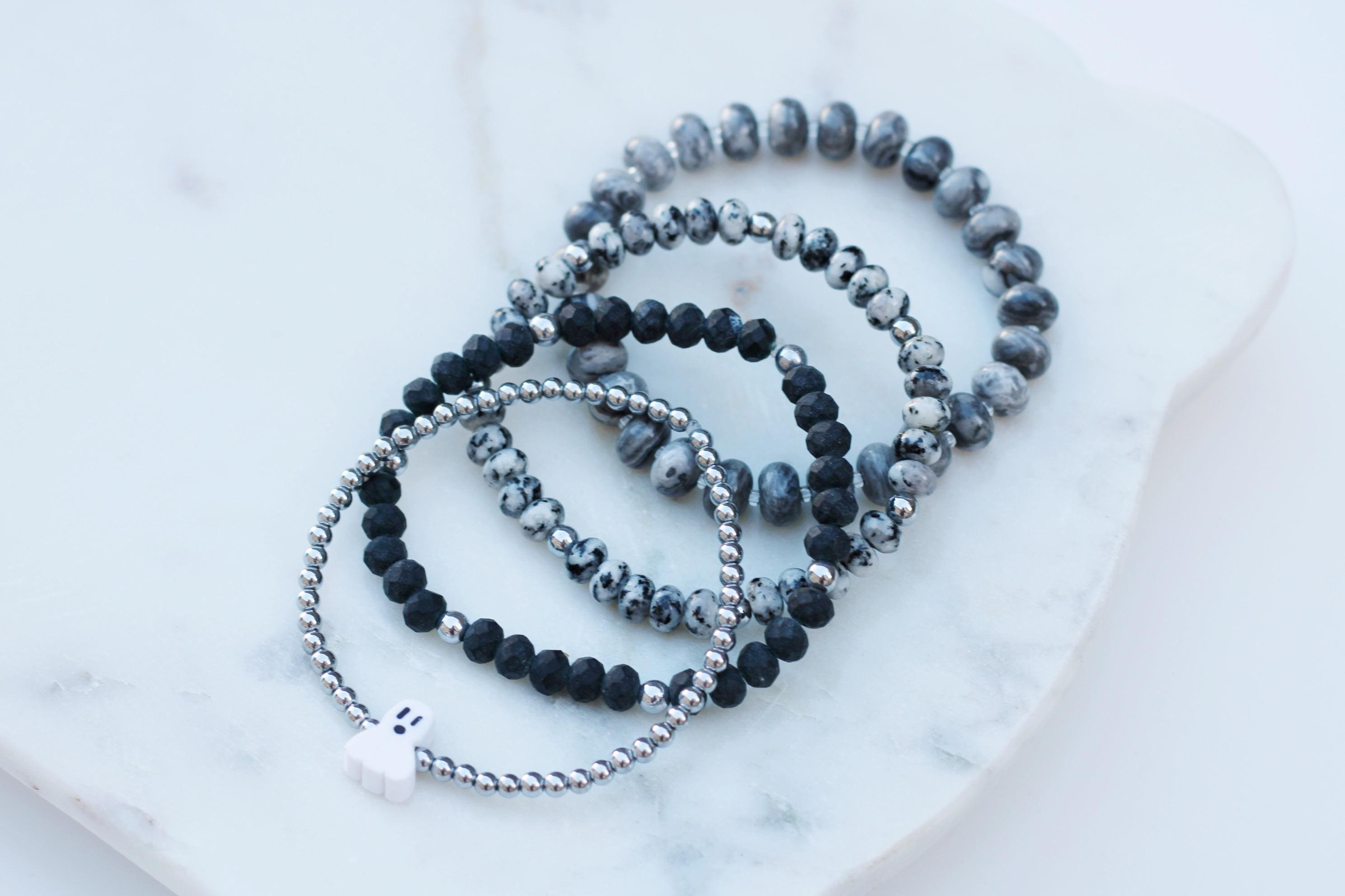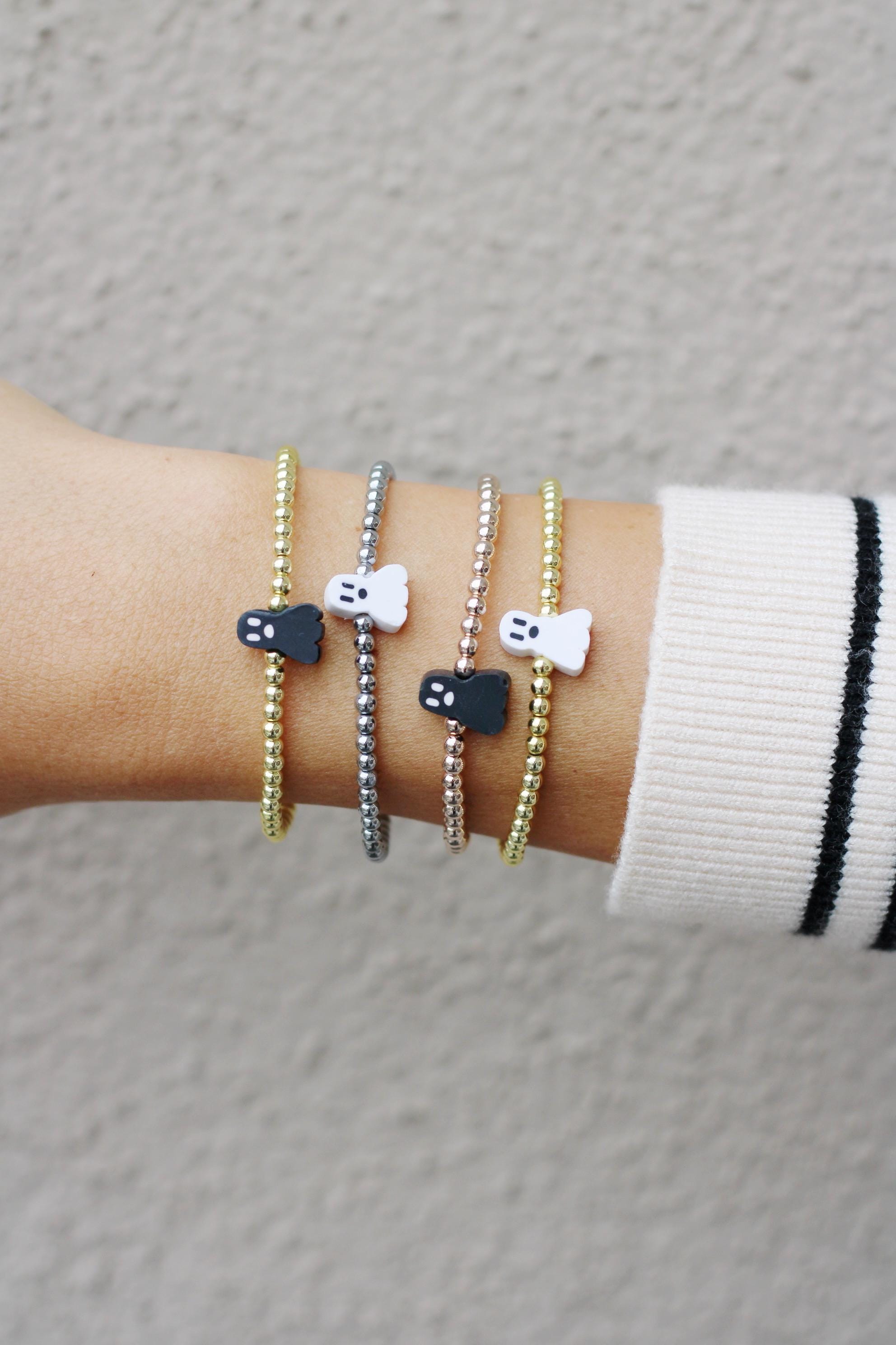 A cool, lightweight stretch bracelet. Uniquely crafted with 18k 3mm gold, silver or rose gold plated hematite beads and accented with a polymer Halloween themed bead in black or white.