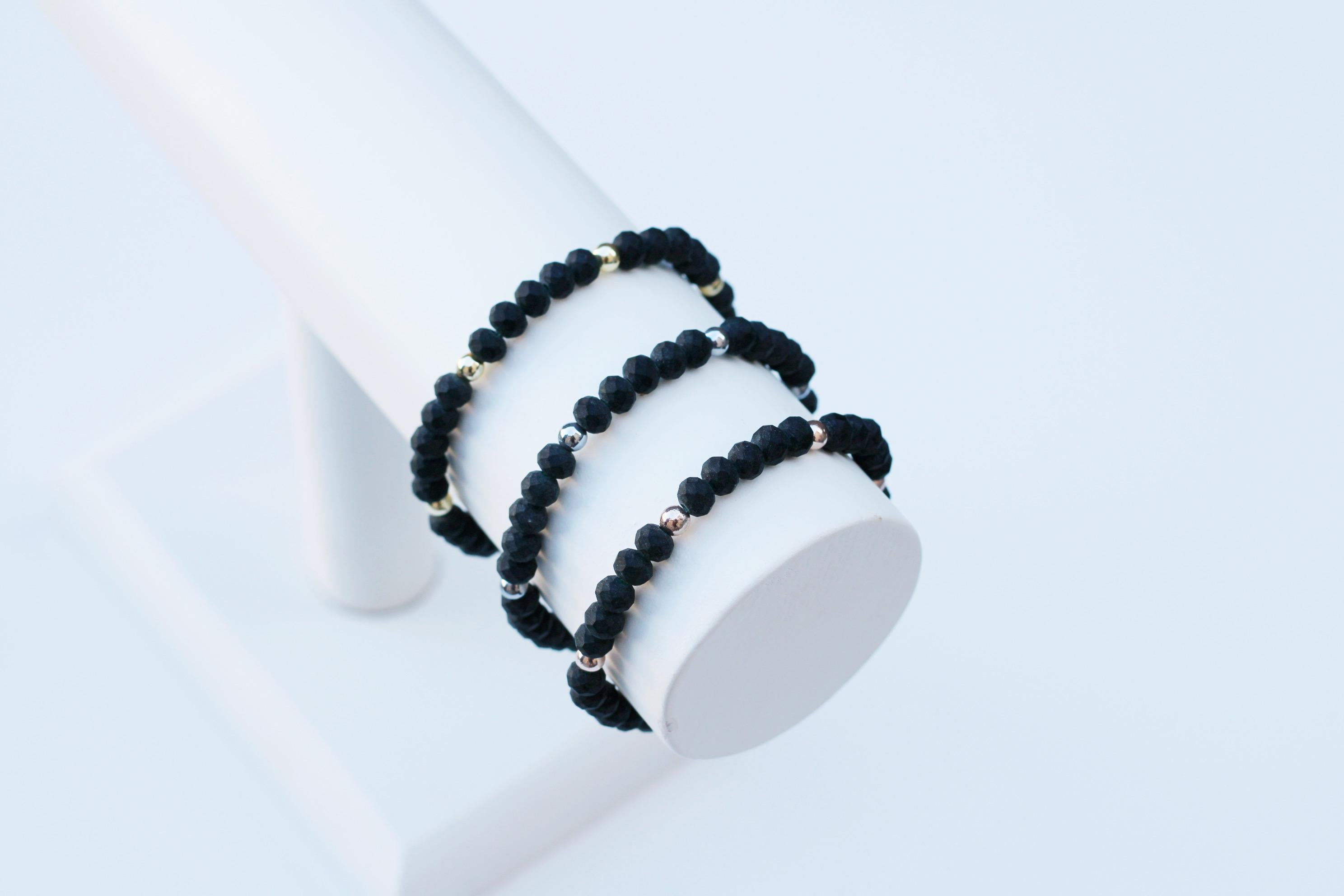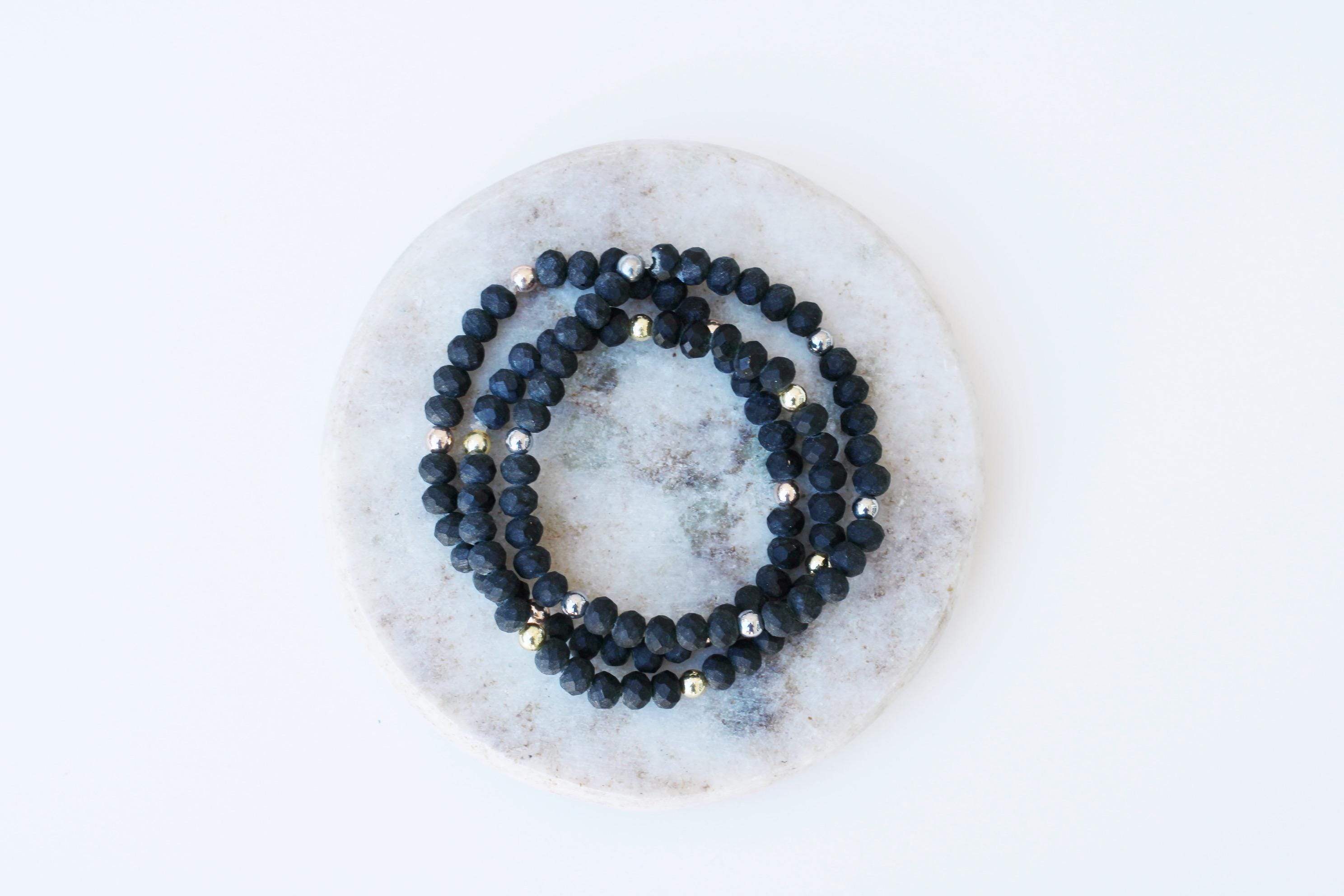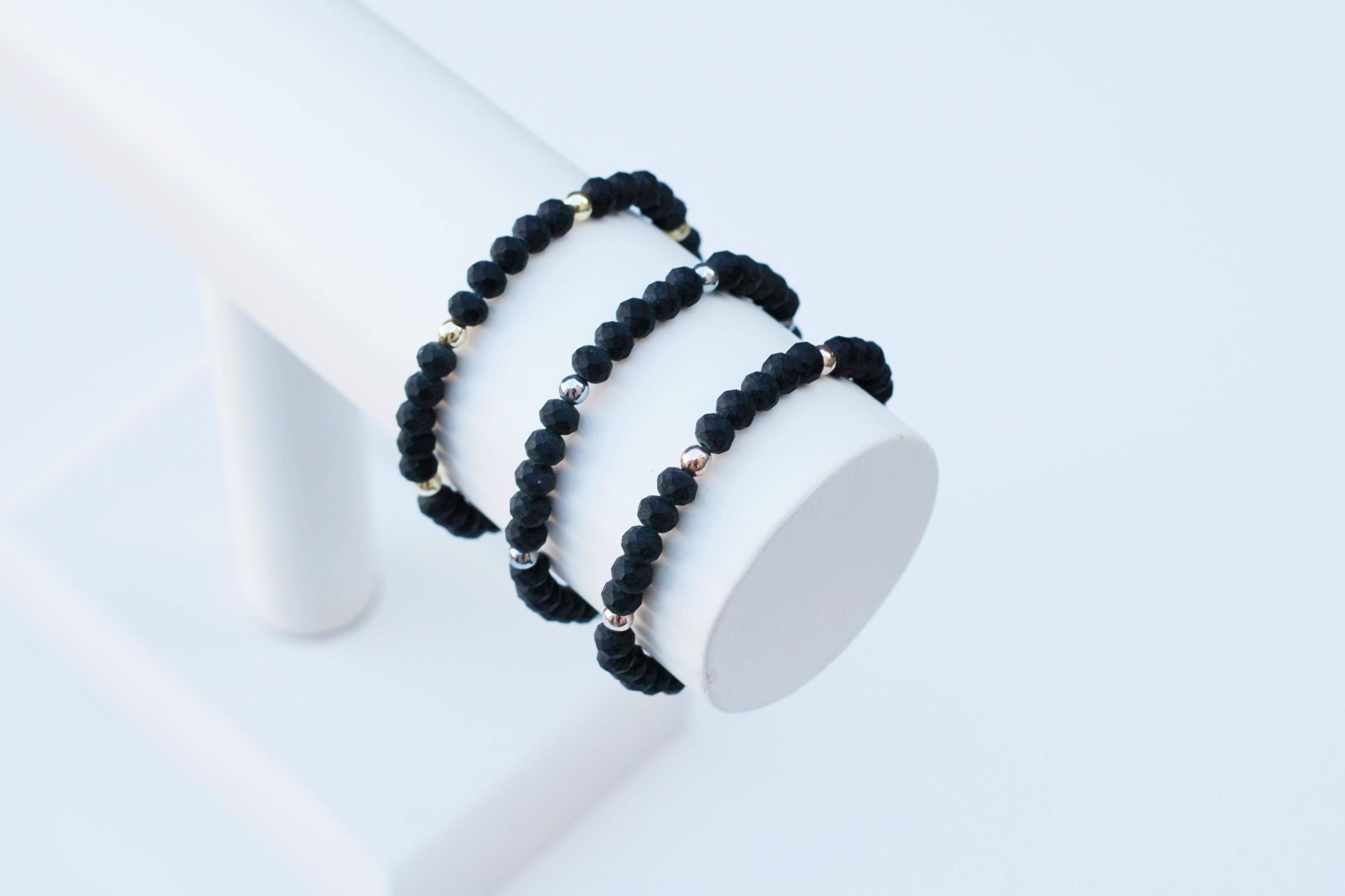A cool, lightweight stretch bracelet. Uniquely crafted with 6x4mm matte black faceted angelic crystal beads and accented with 18k 4mm gold/rose gold/silver plated hematite beads.