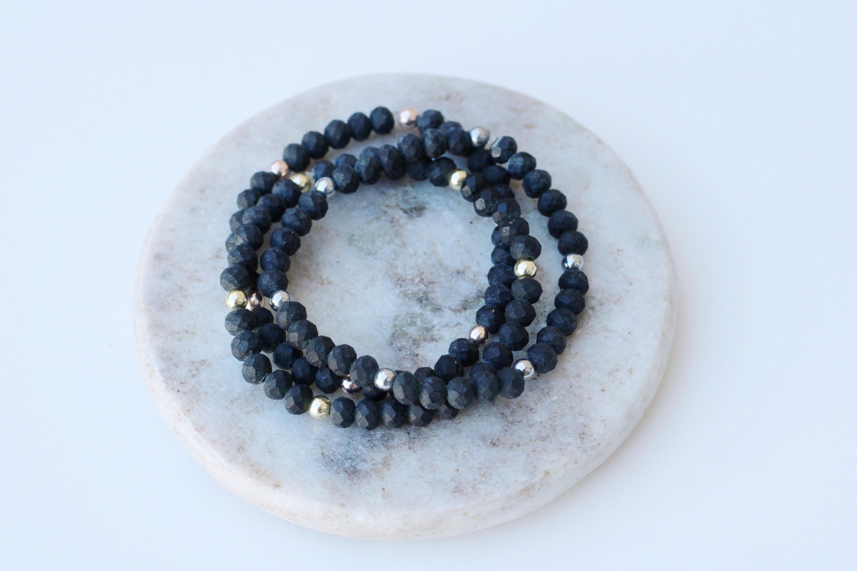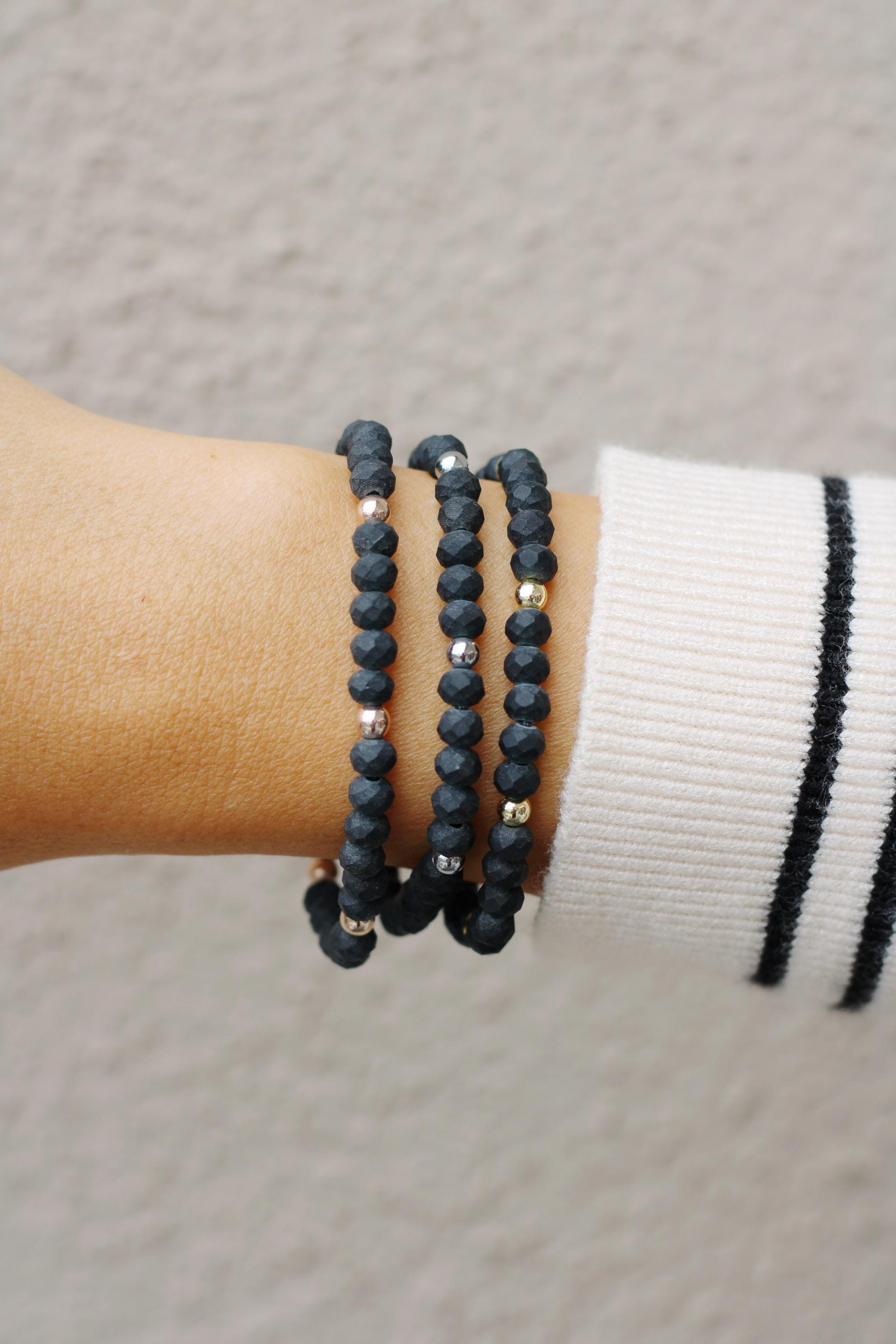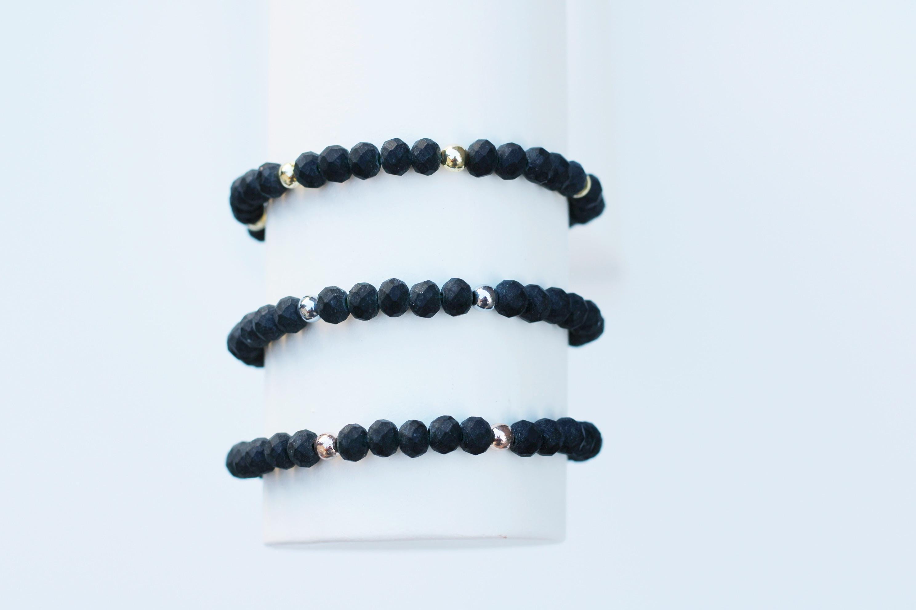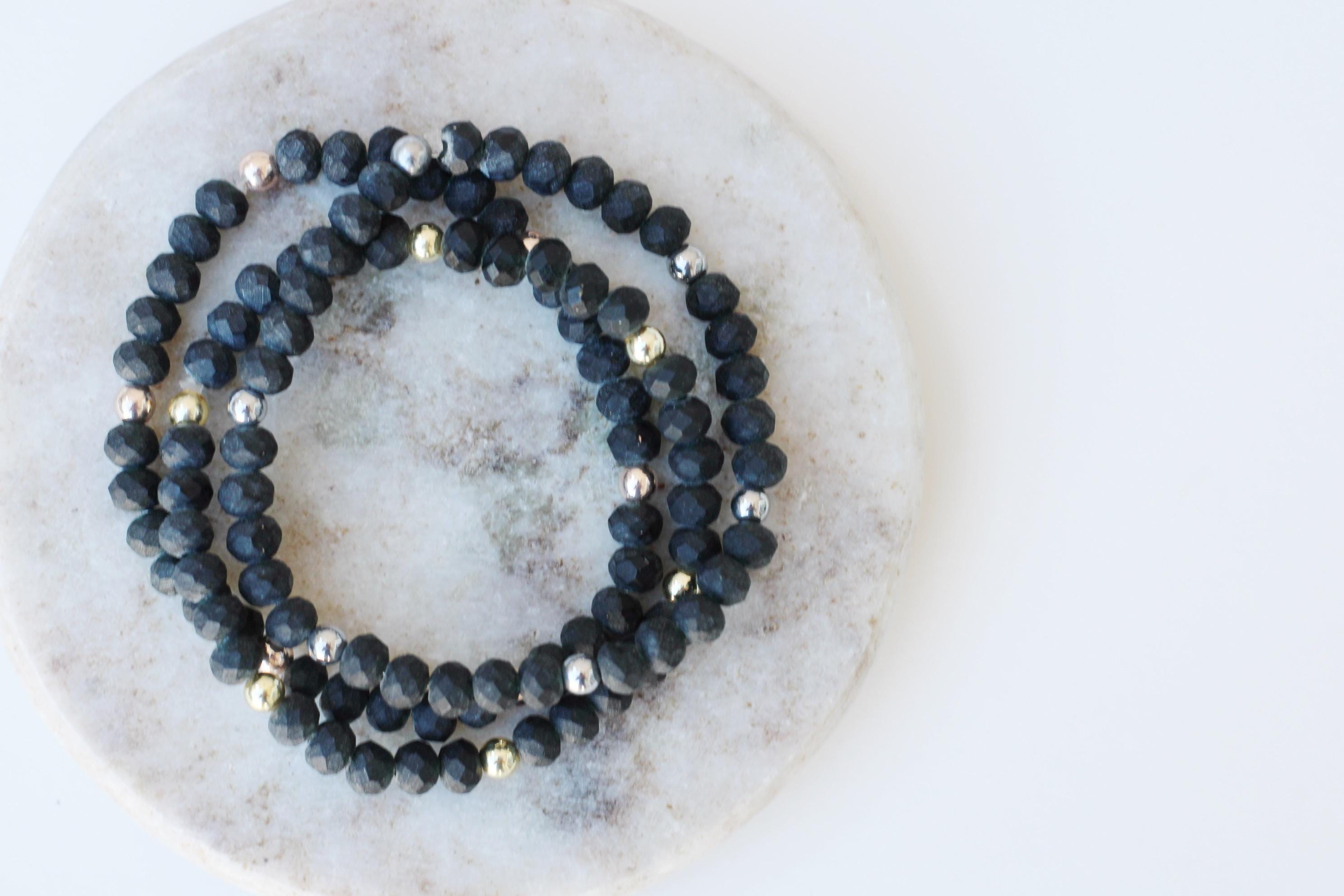 A cool, lightweight stretch bracelet. Uniquely crafted with 6x4mm matte black faceted angelic crystal beads and accented with 18k 4mm gold/rose gold/silver plated hematite beads.
