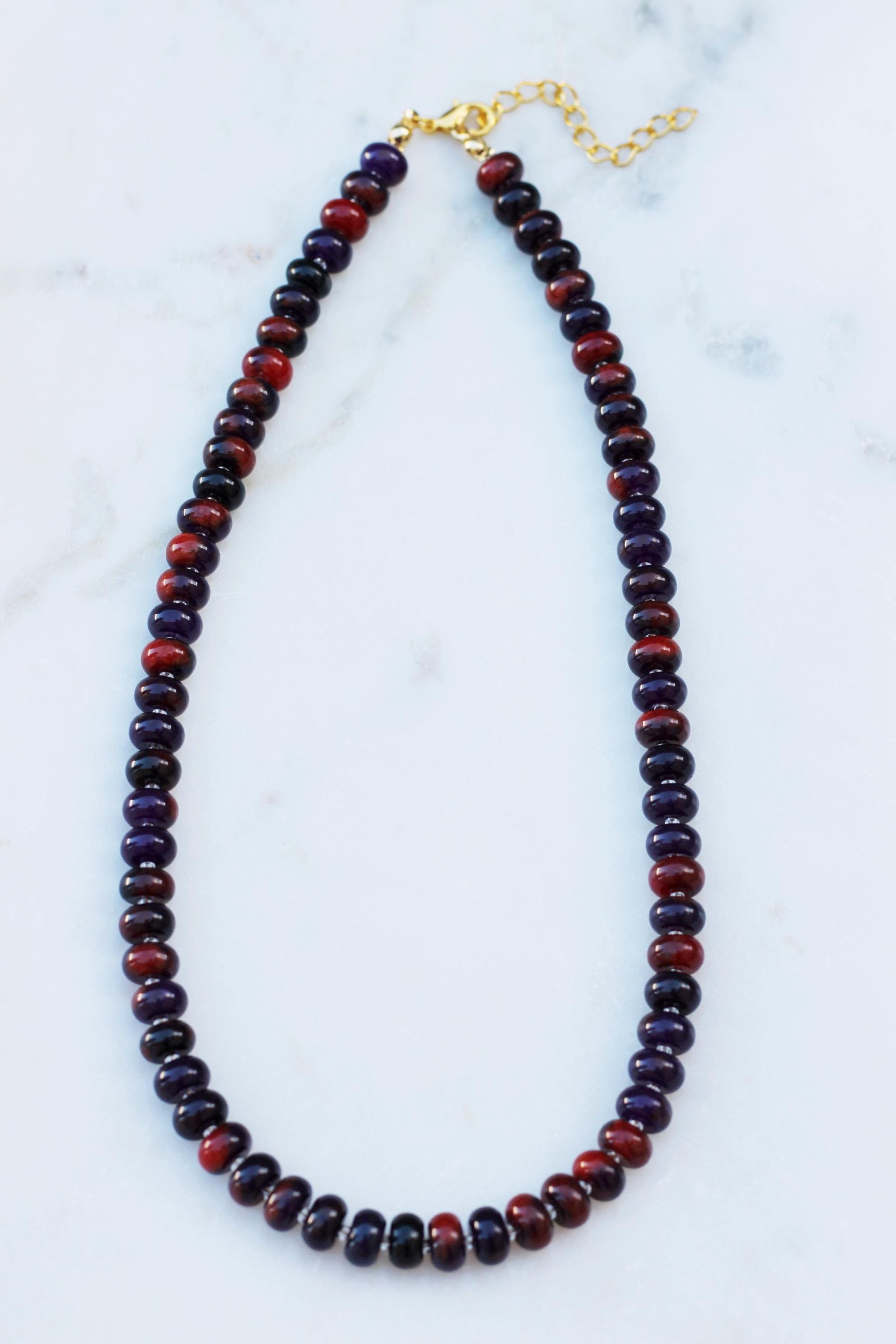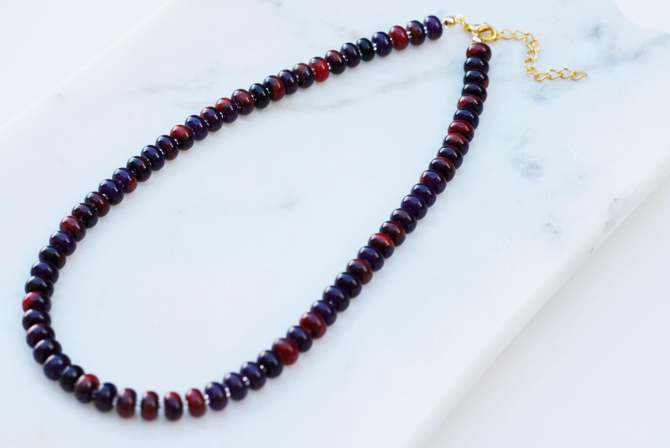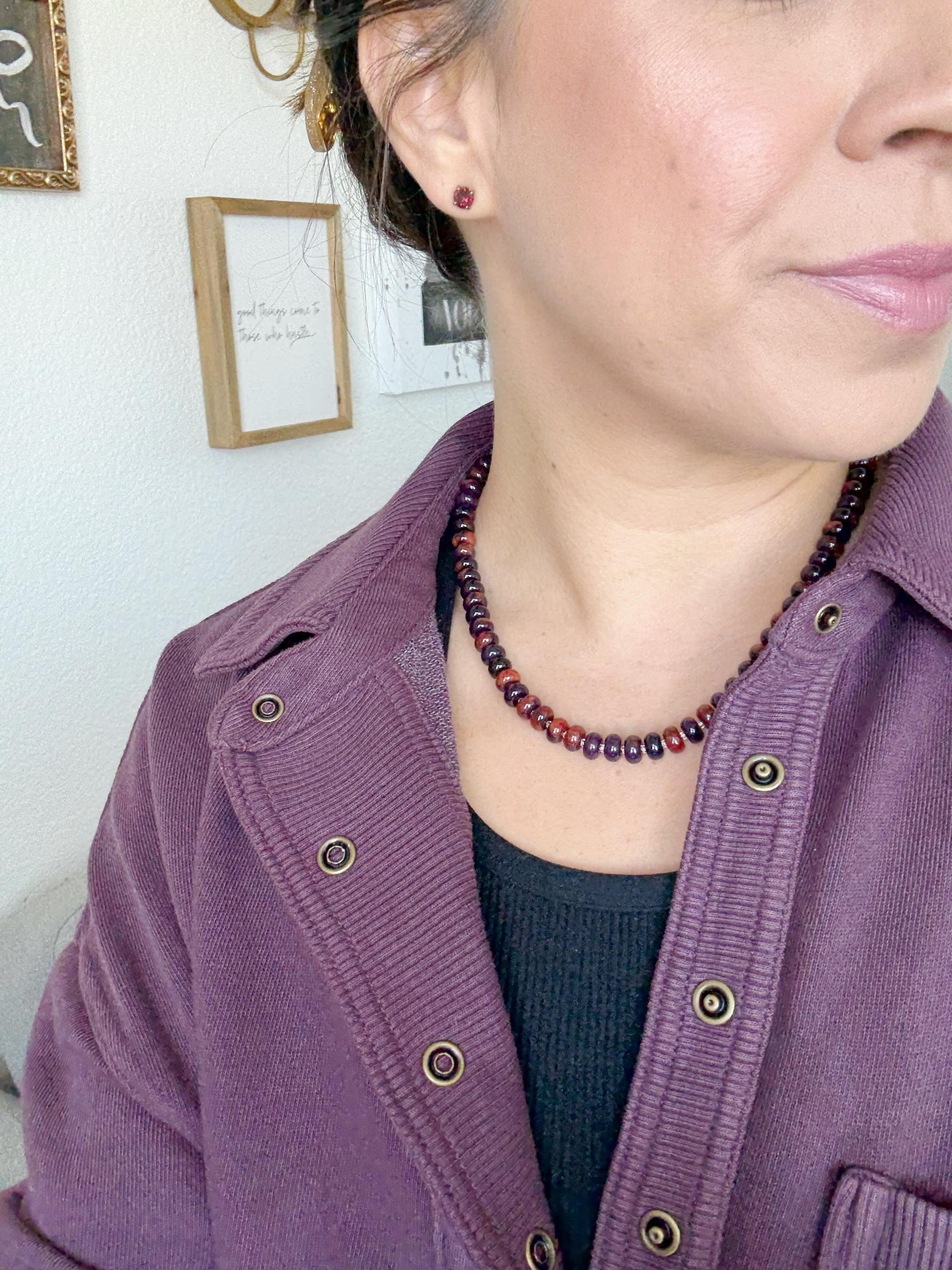 A gemstone bead necklace. Uniquely crafted with jade rondelle beads and your choice of plated hardware color and spacer bead (see photo for options).