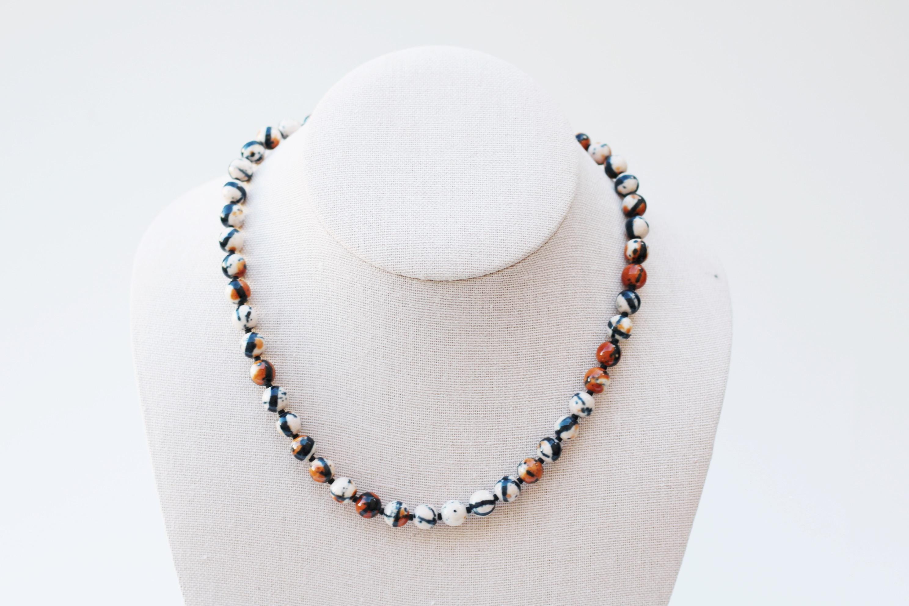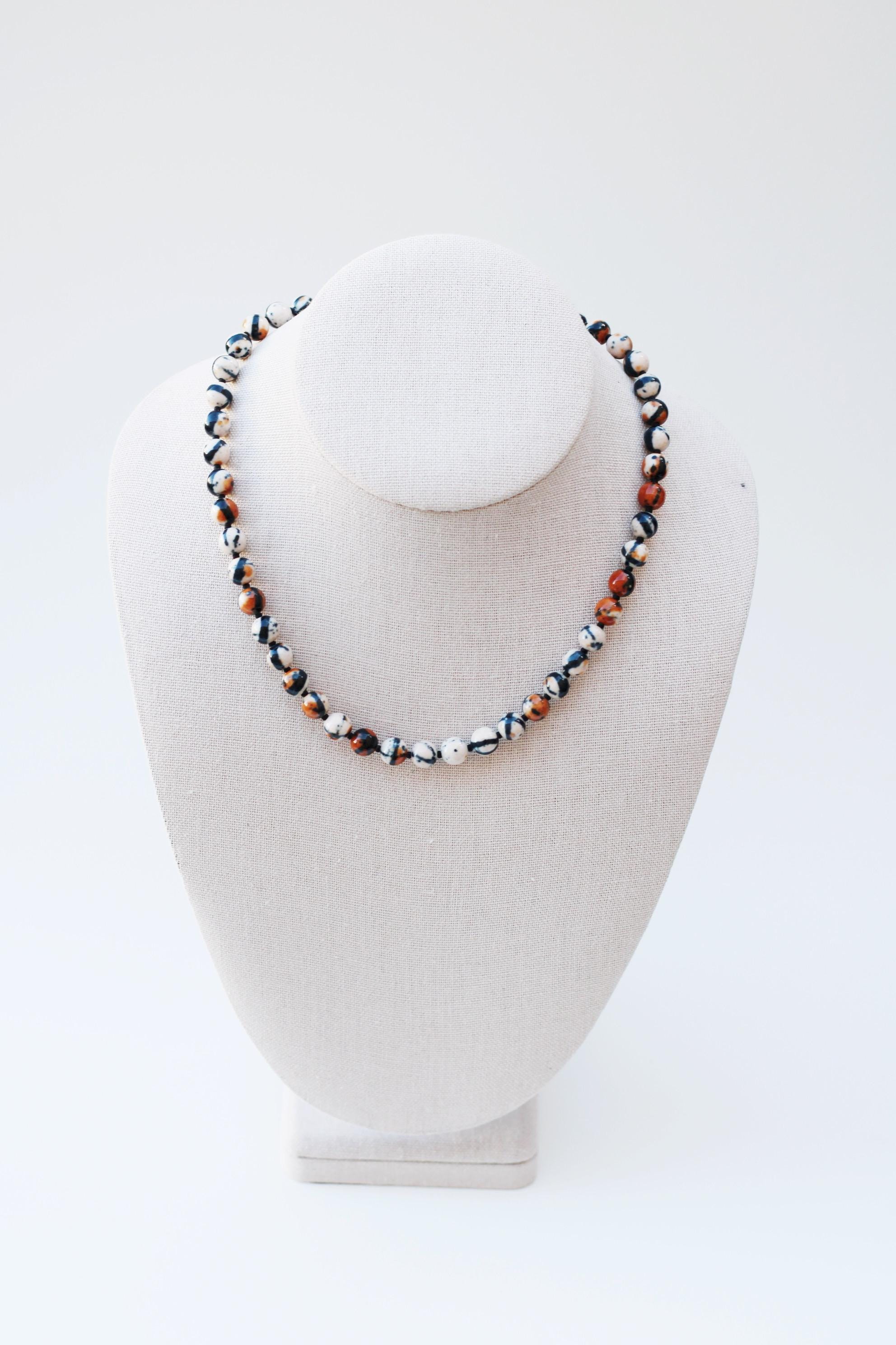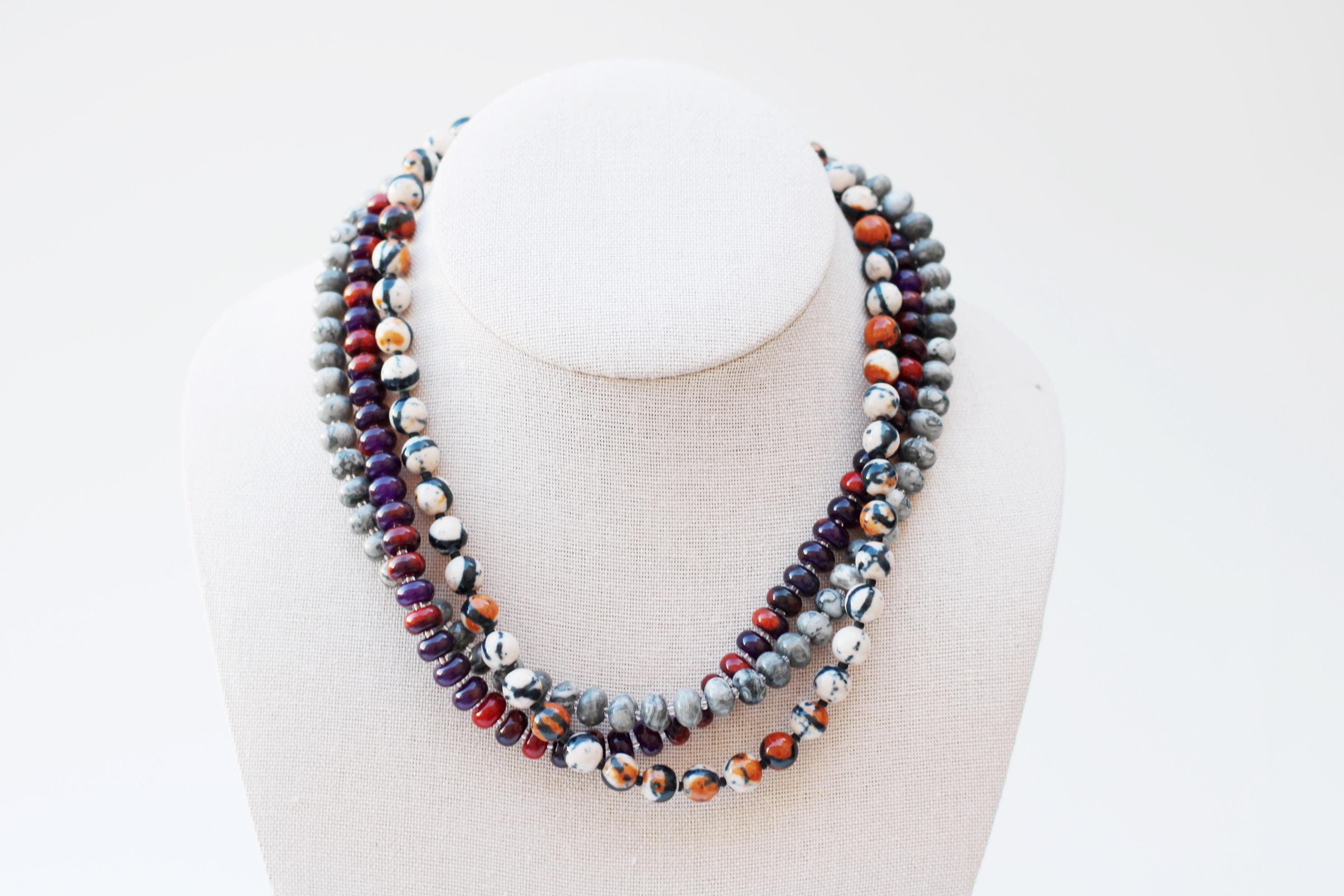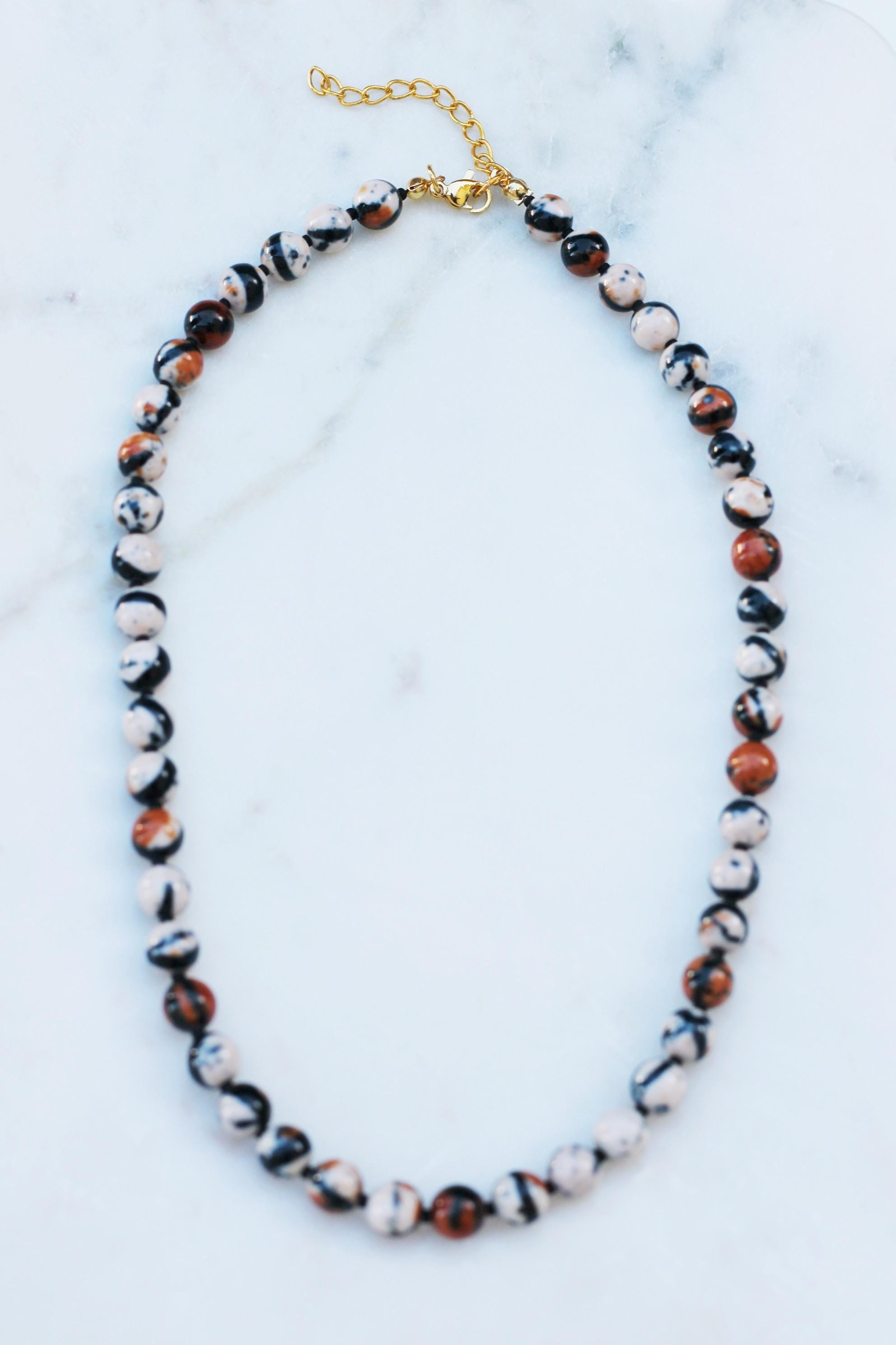 A gemstone bead necklace. Uniquely crafted with 8mm ocean jade beads and your choice of plated hardware color and spacer bead (see photo for options).