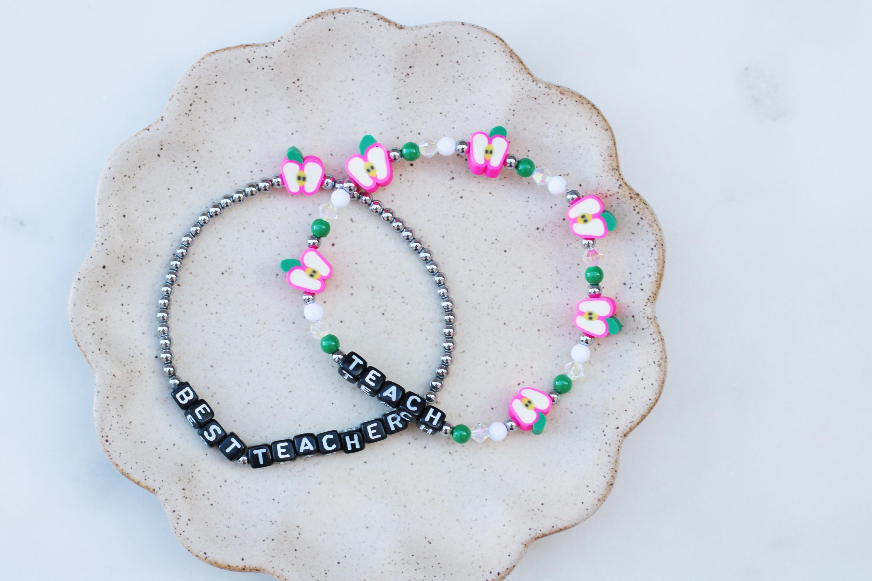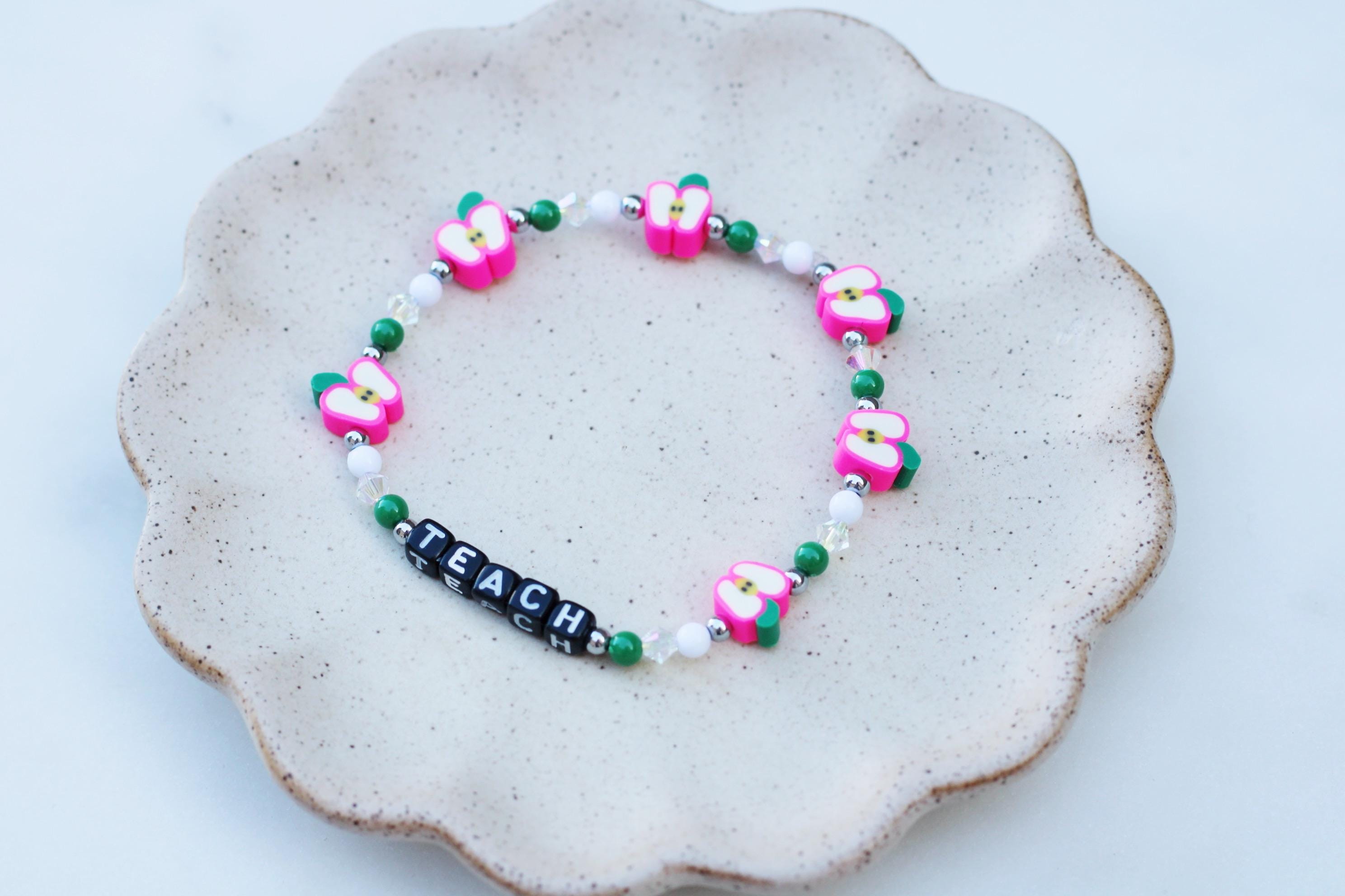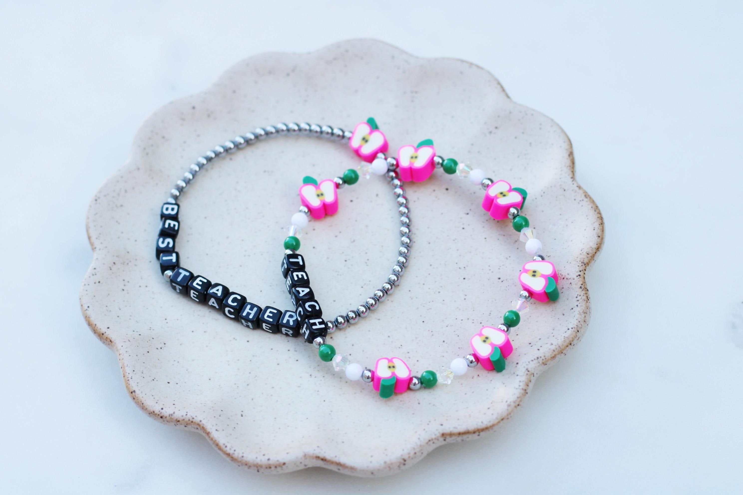 Listing is for one (1) bracelet containing 3mm hematite beads, clear crystal beads, 3mm round colorful beads, pink polymer apple beads and accented with your choice of block letter beads.