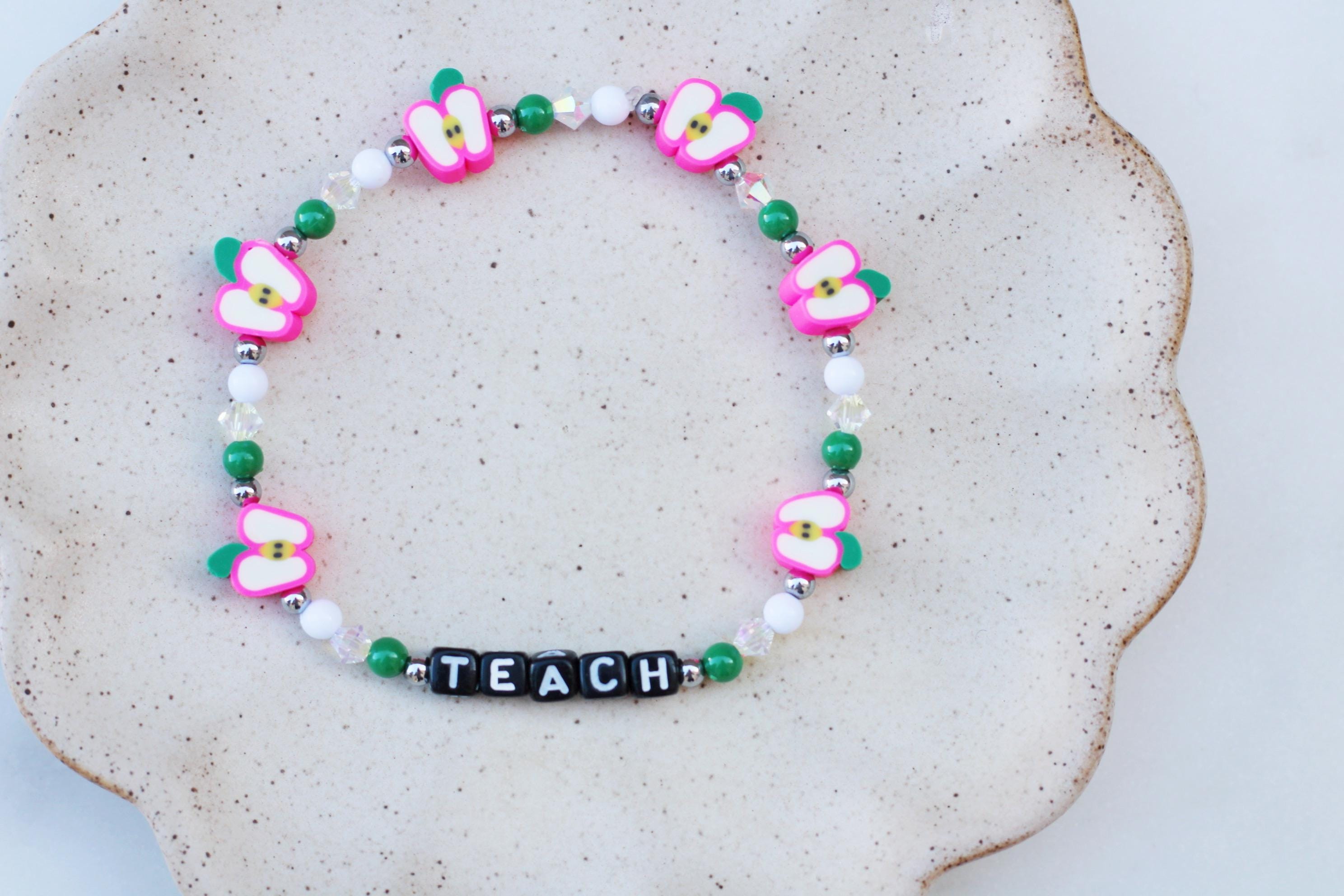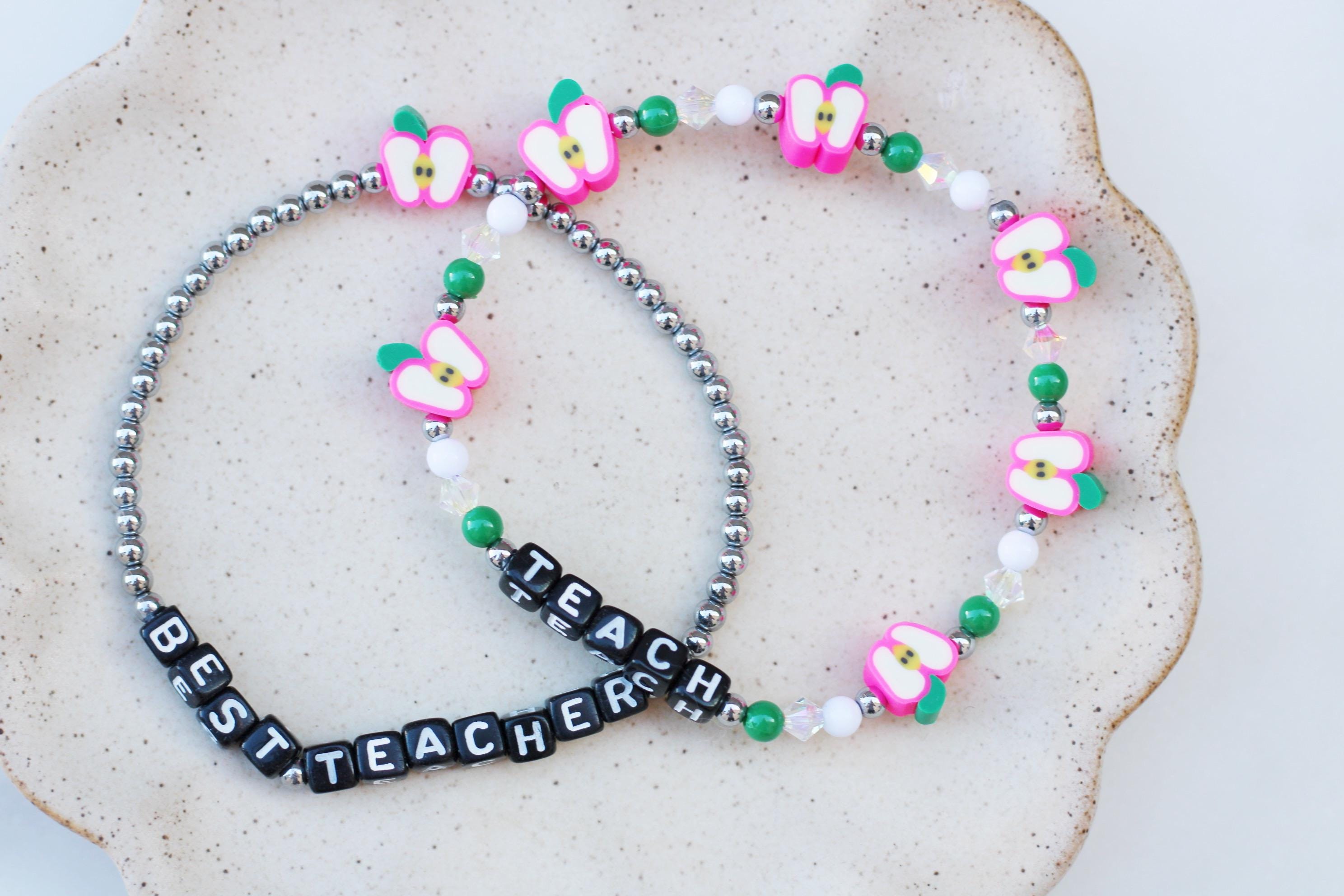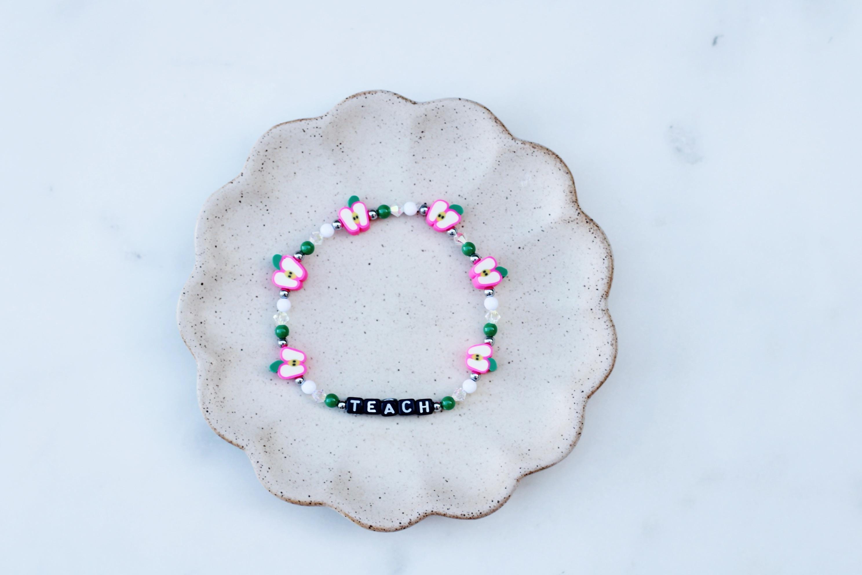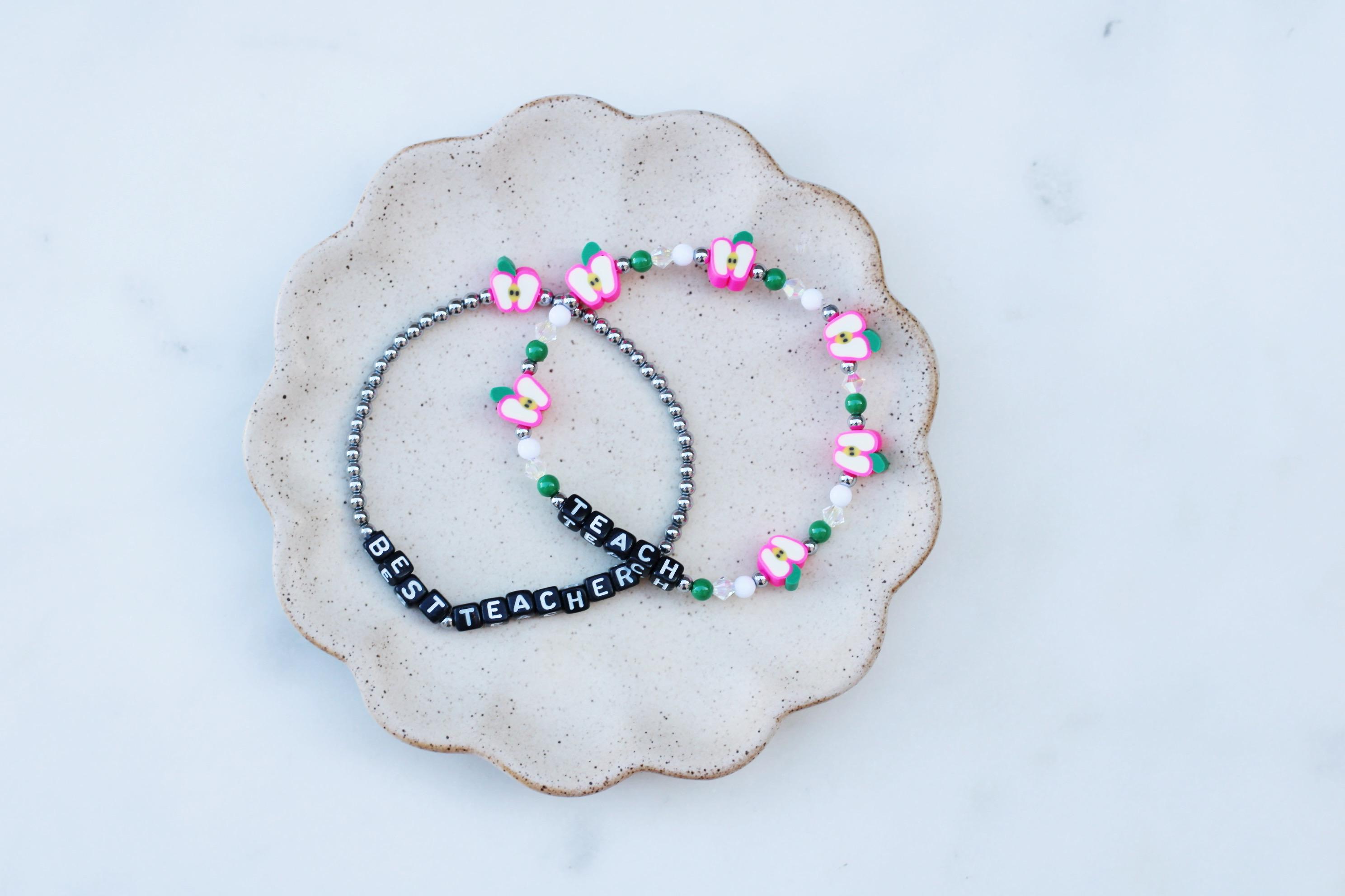 Listing is for one (1) bracelet containing 3mm hematite beads, clear crystal beads, 3mm round colorful beads, pink polymer apple beads and accented with your choice of block letter beads.