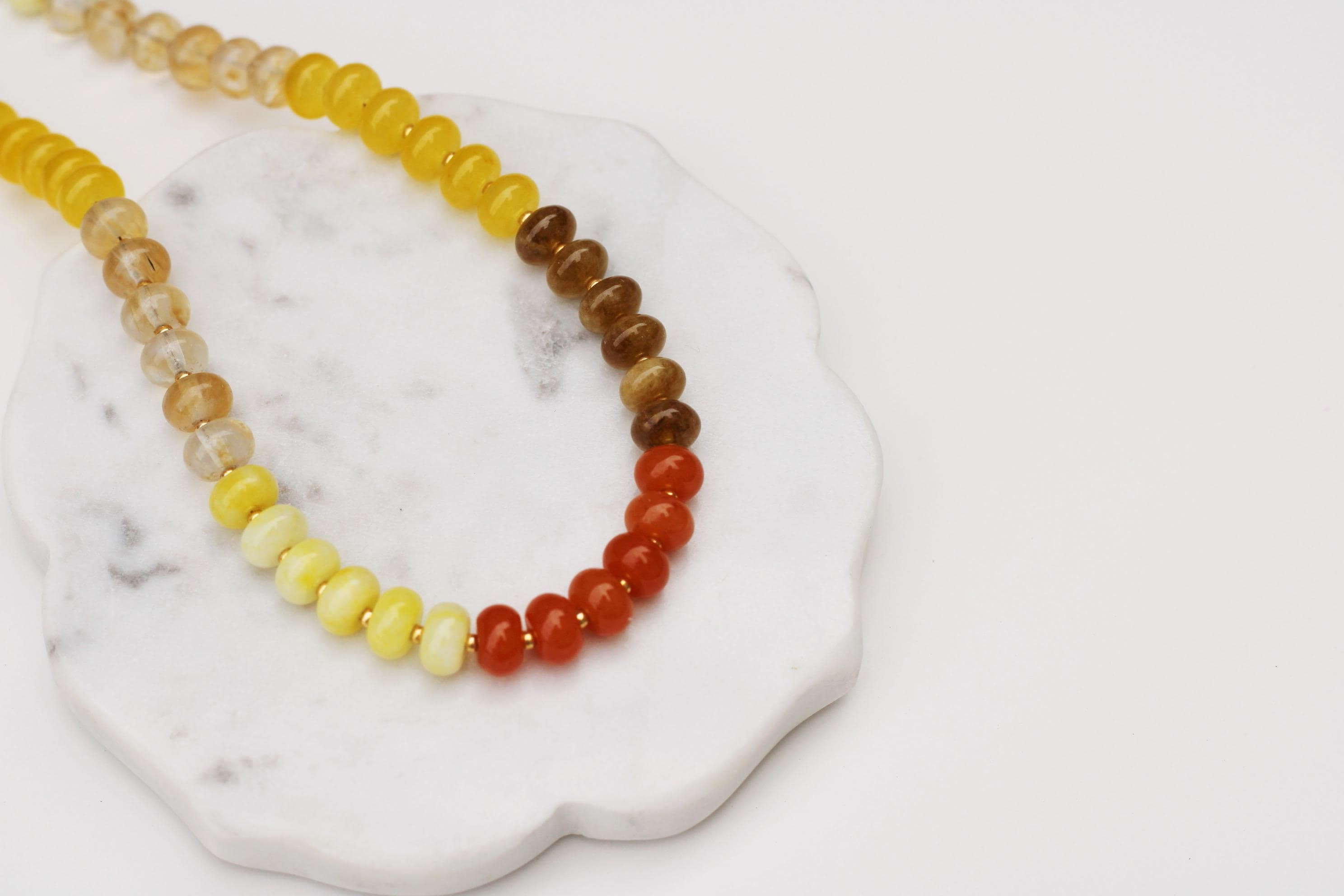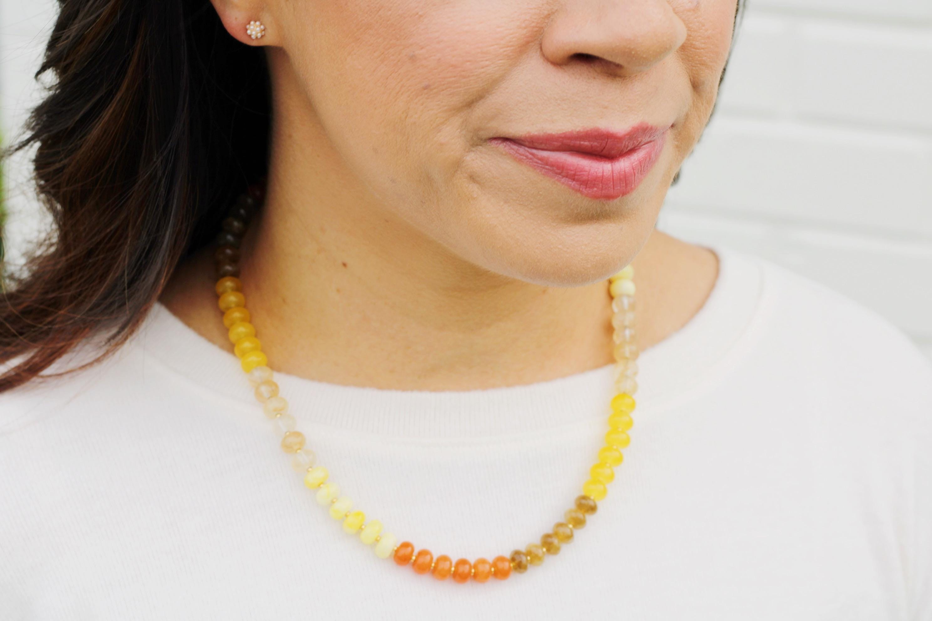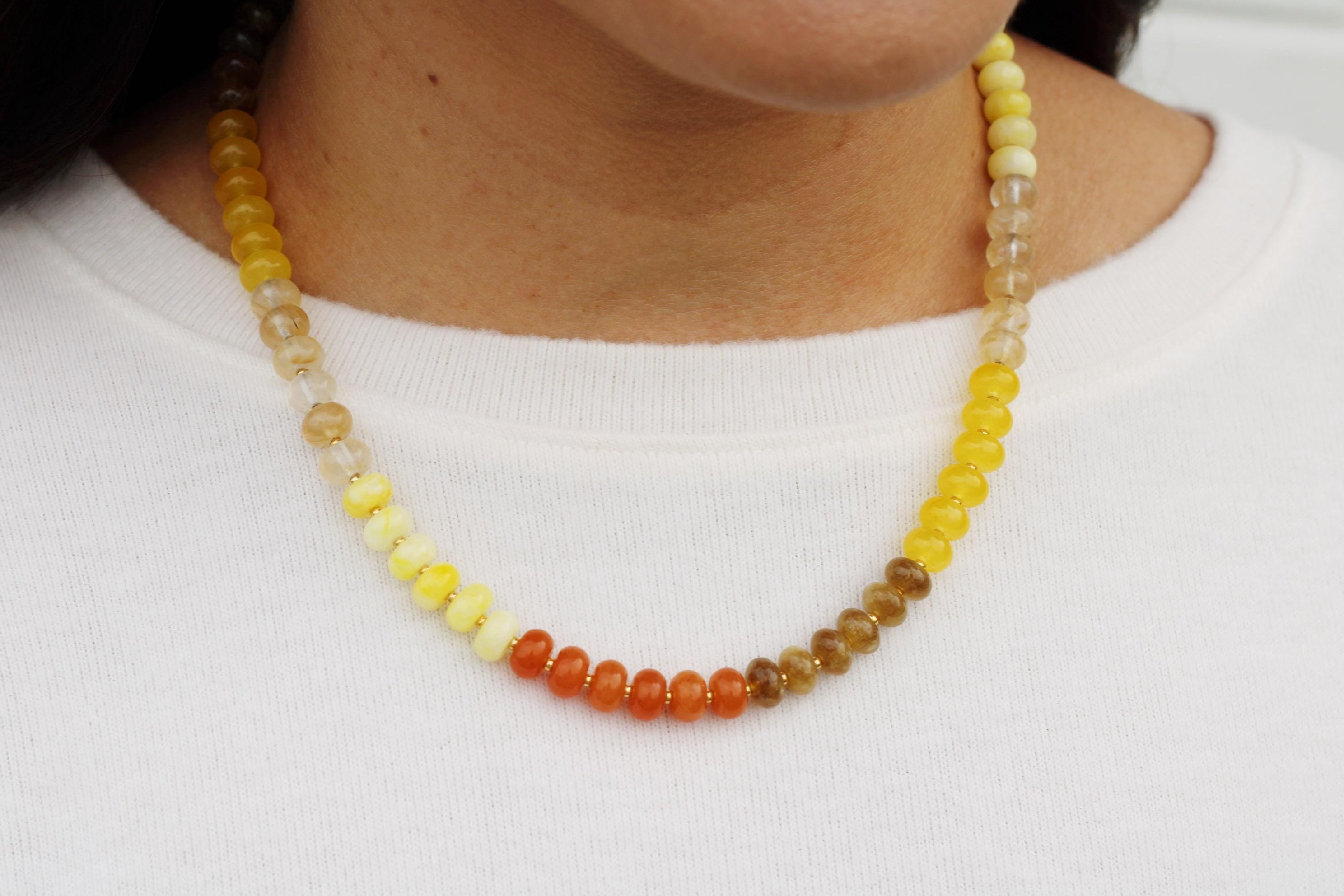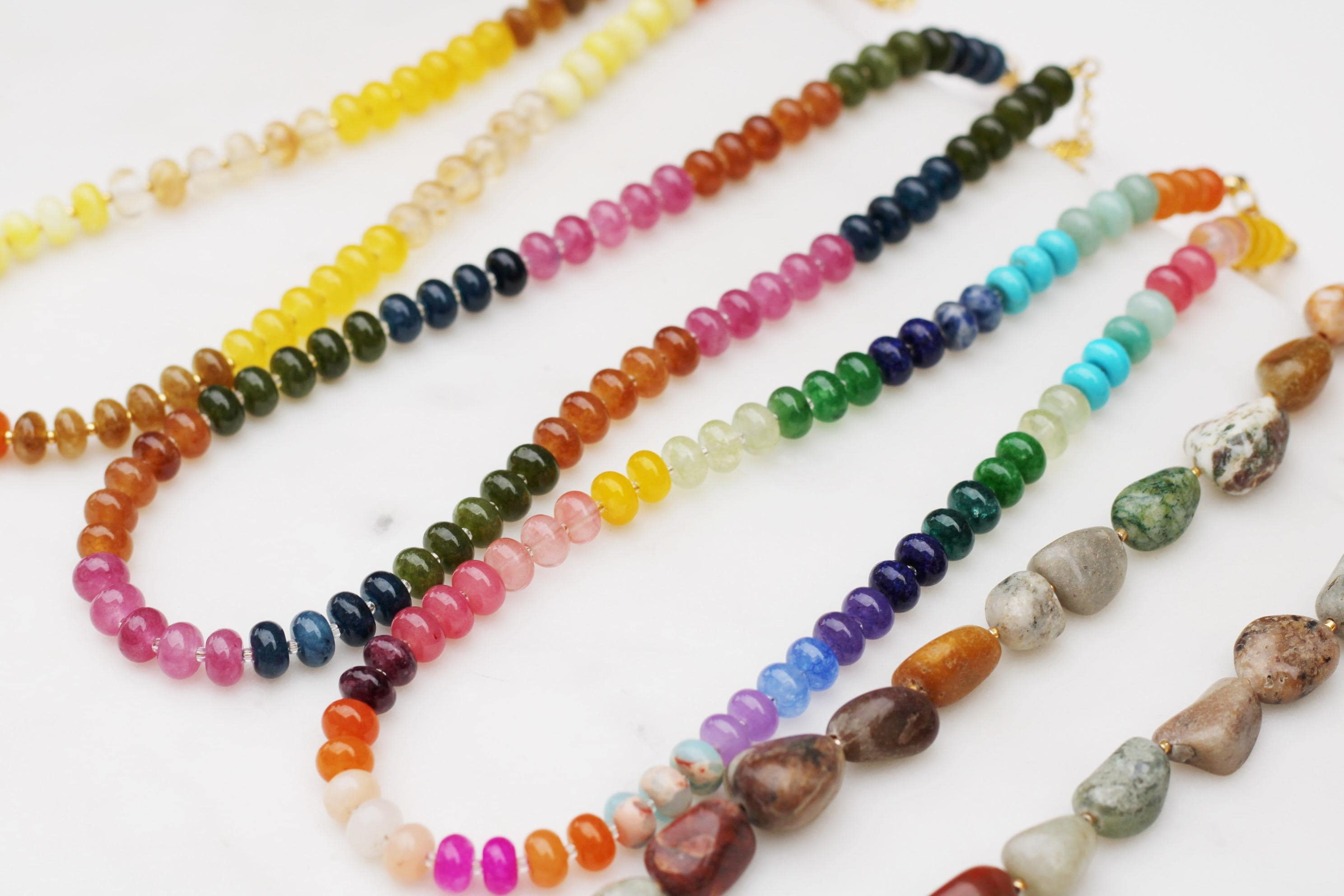A gemstone bead necklace. Uniquely crafted with colored jade rondelle beads and your choice of plated hardware color and spacer bead (see photo for options).