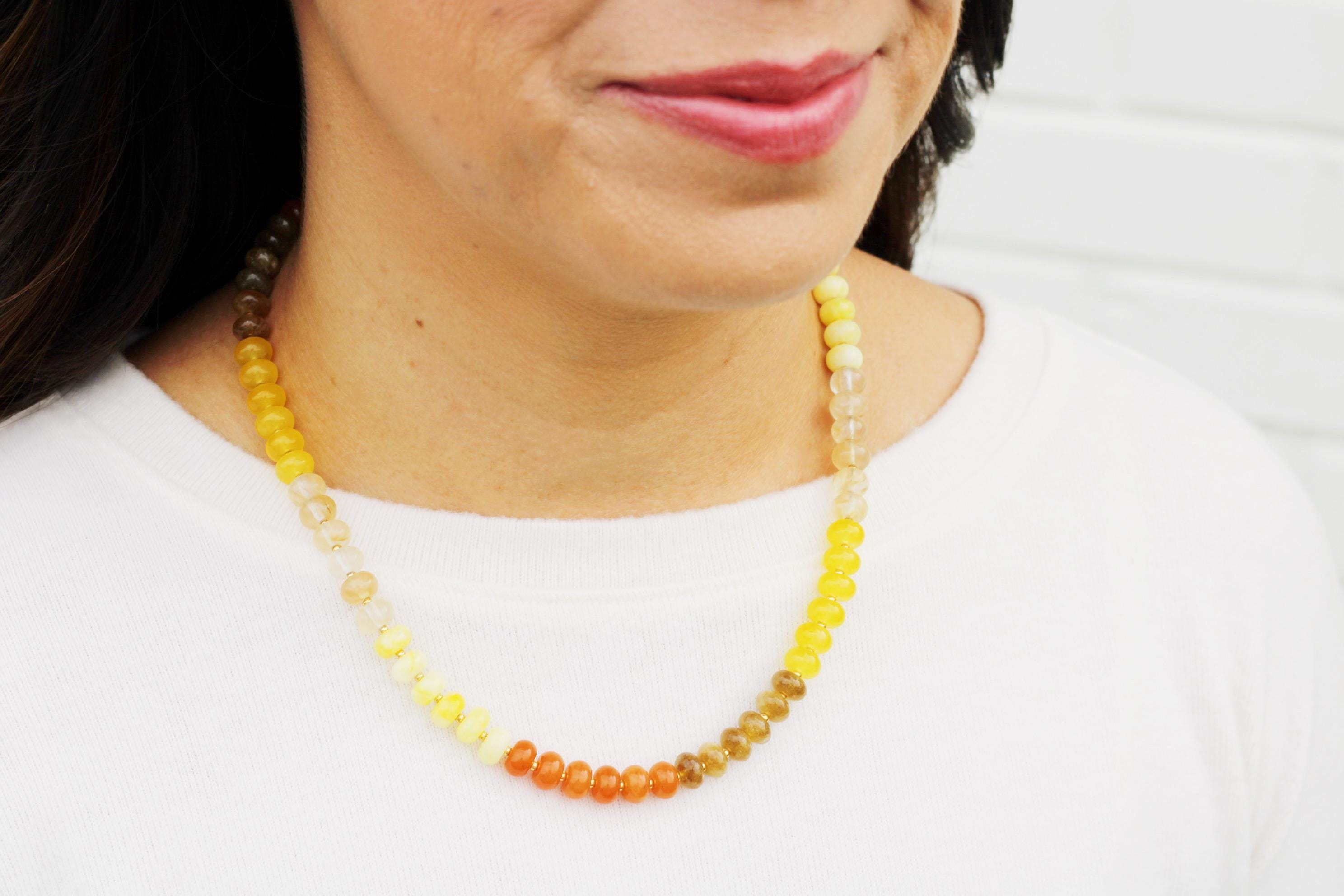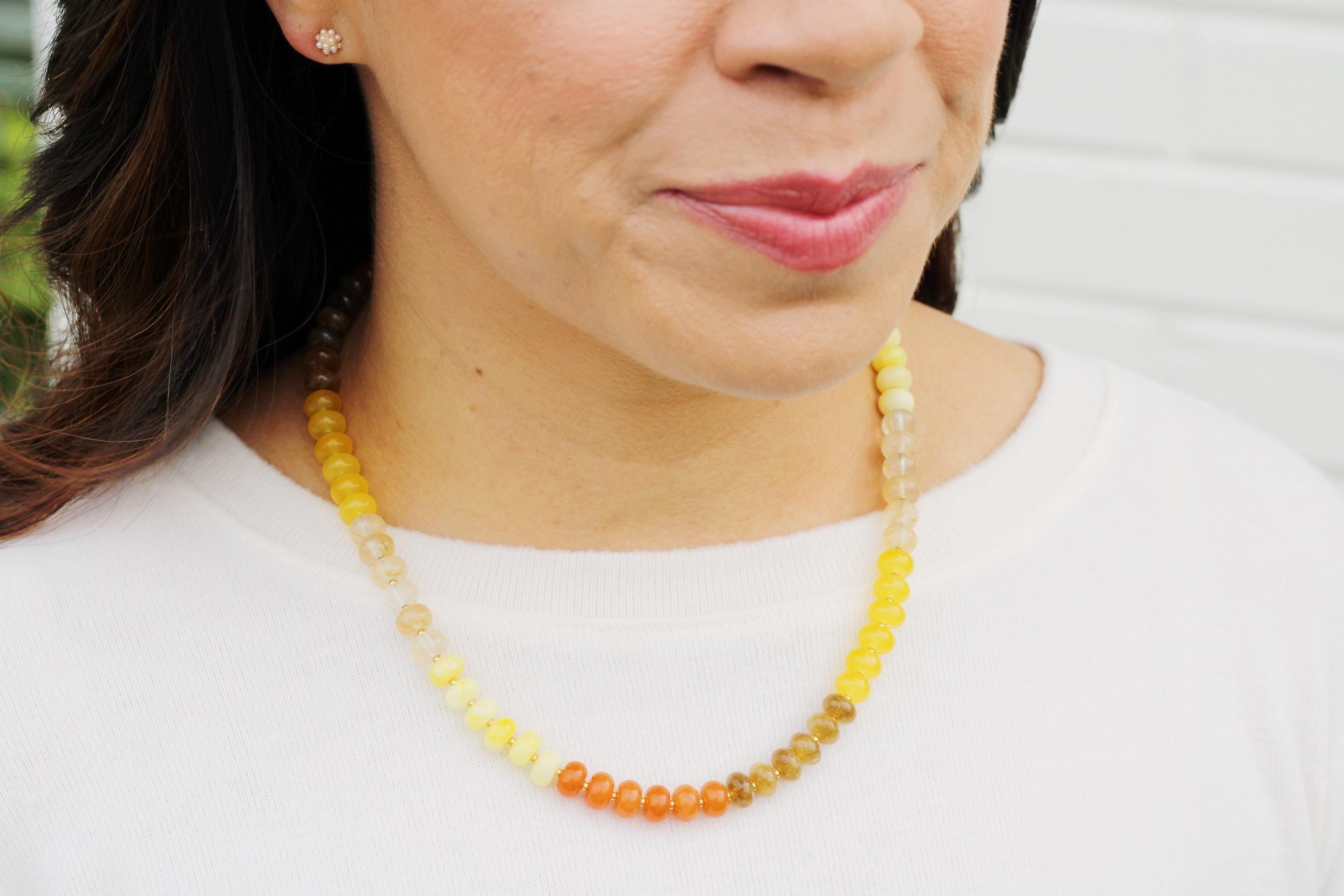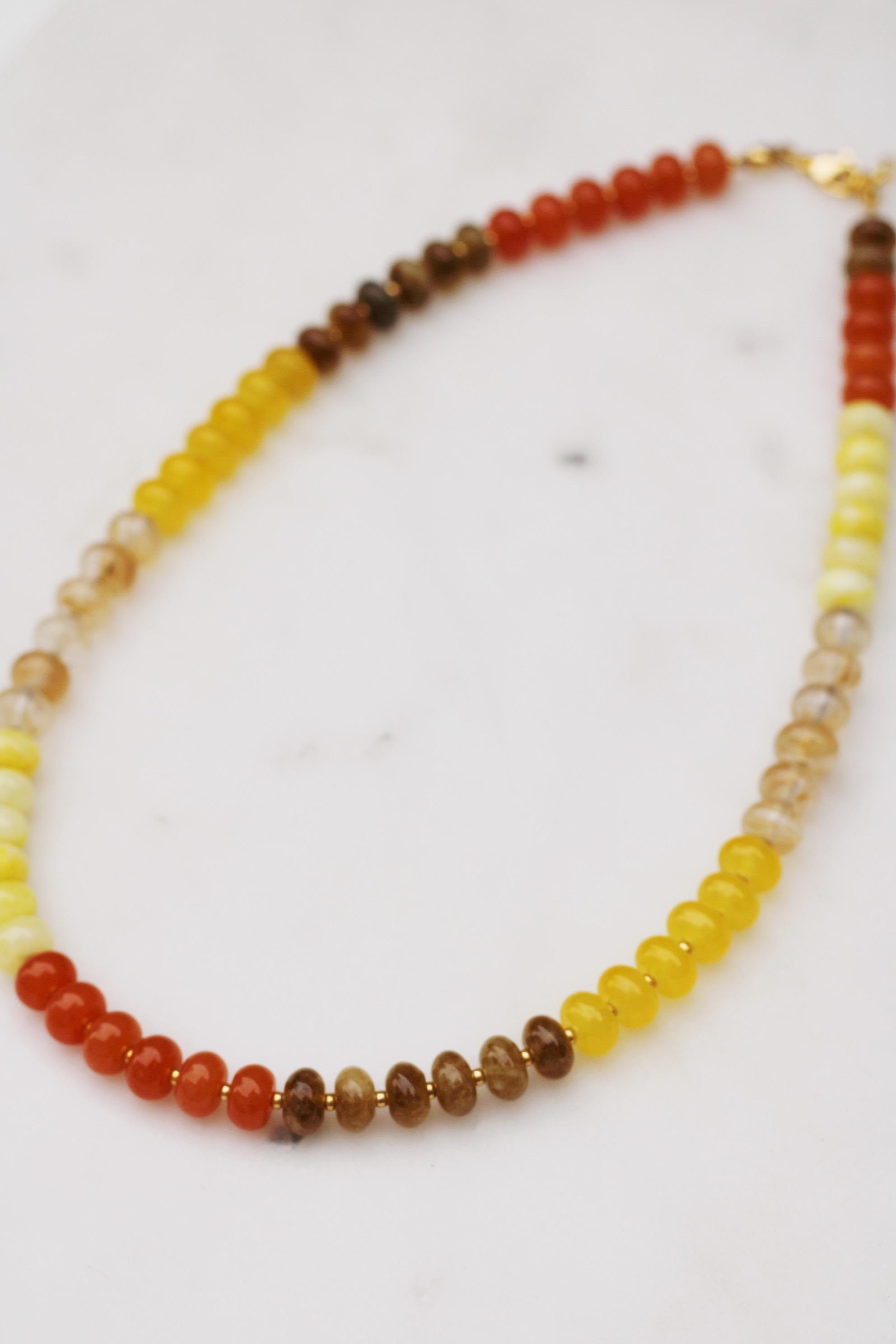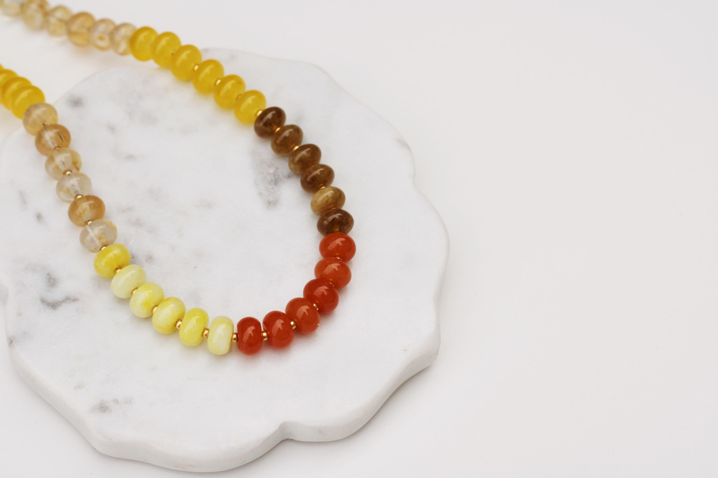 A gemstone bead necklace. Uniquely crafted with colored jade rondelle beads and your choice of plated hardware color and spacer bead (see photo for options).