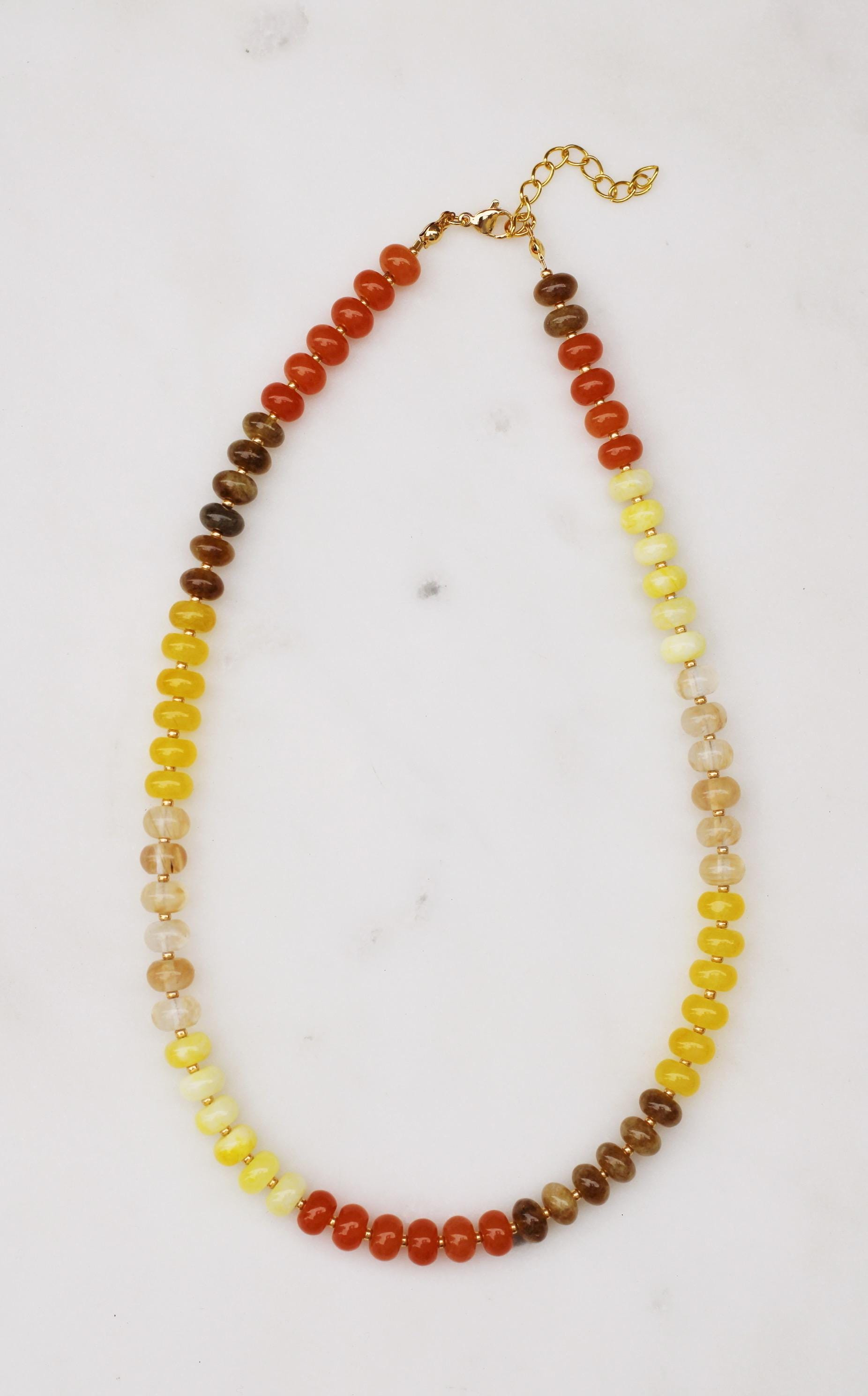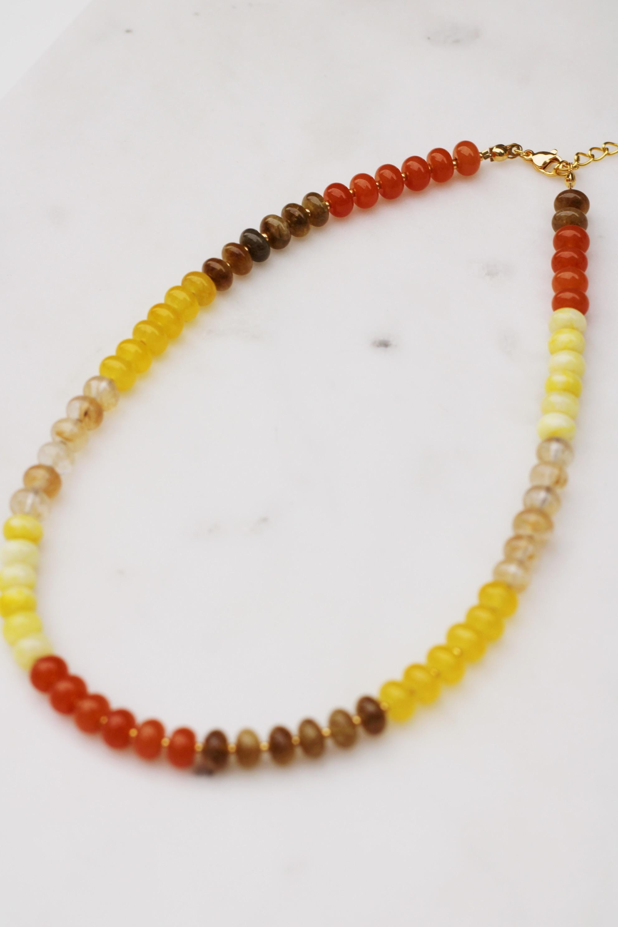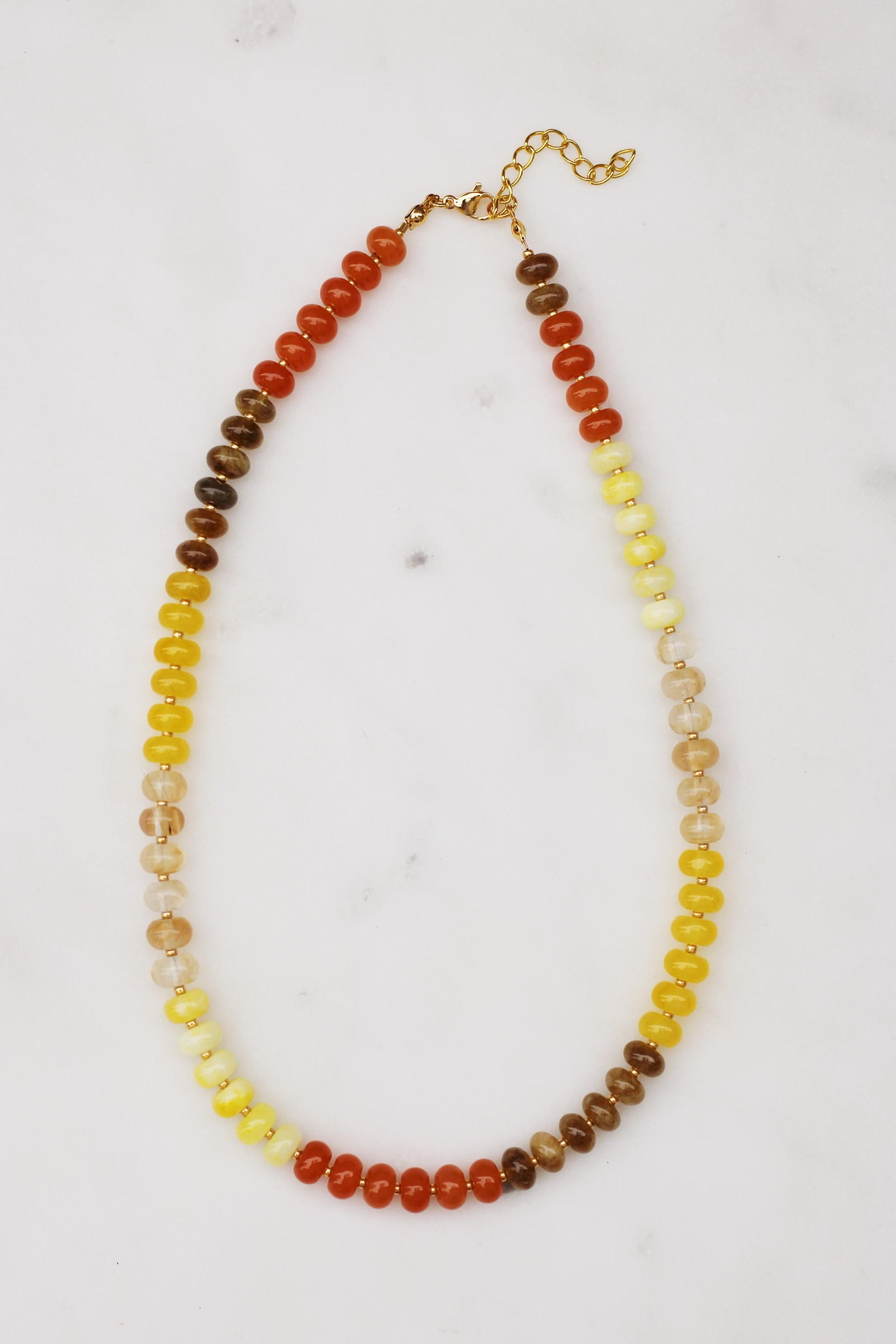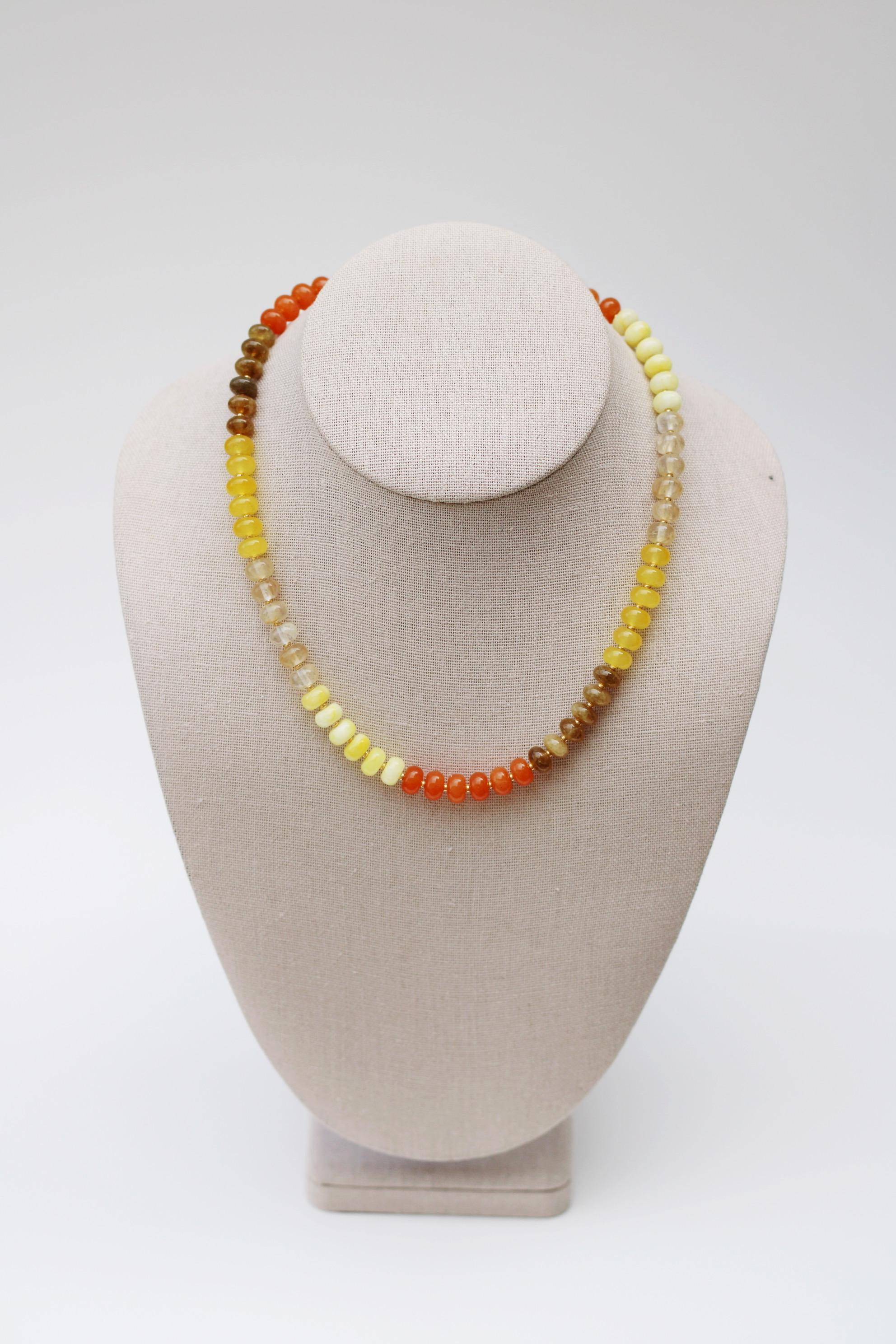 A gemstone bead necklace. Uniquely crafted with colored jade rondelle beads and your choice of plated hardware color and spacer bead (see photo for options).