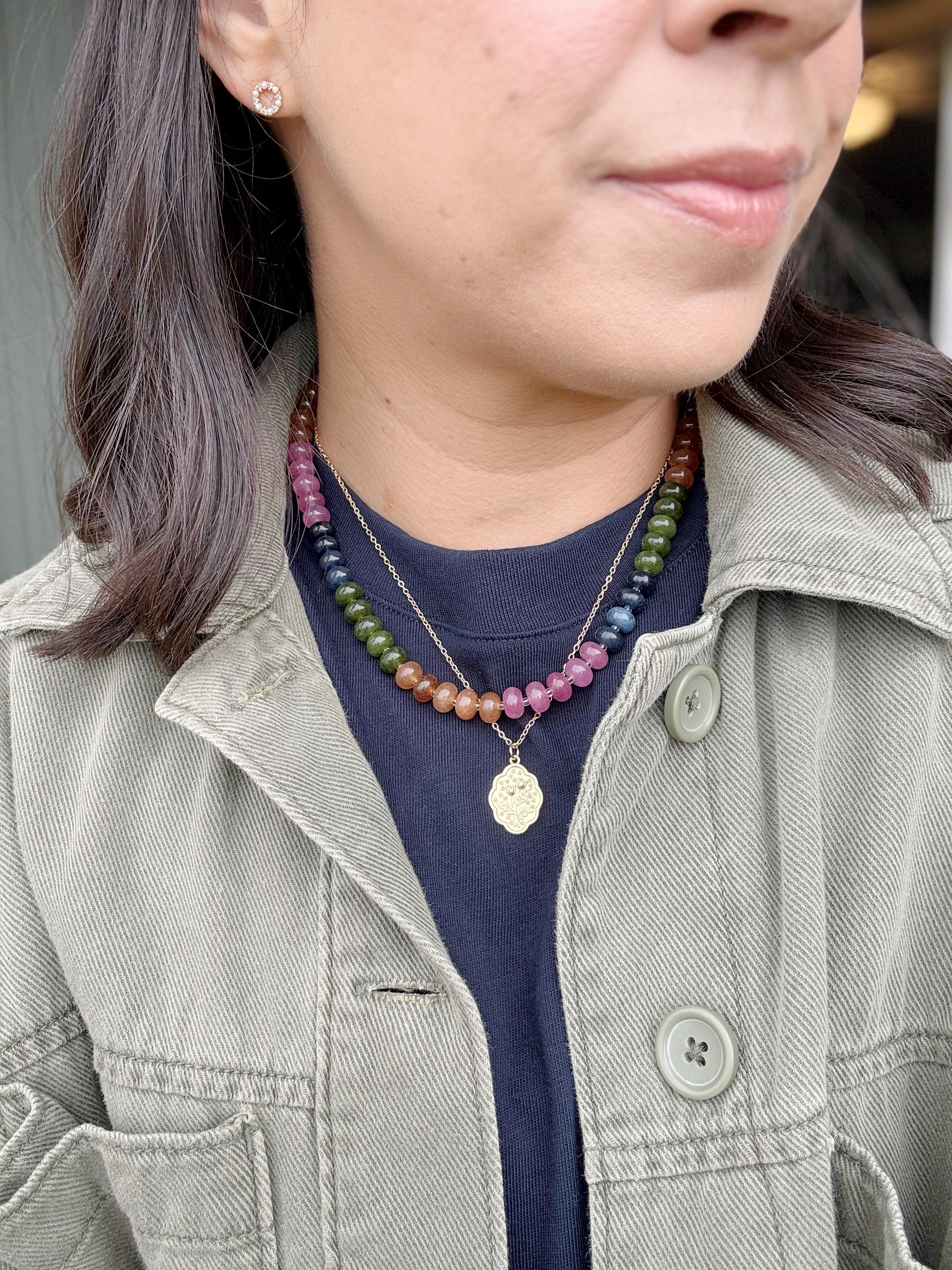 A gemstone bead necklace. Uniquely crafted with colored jade rondelle beads and your choice of hardware color and spacer bead (see photo for options).