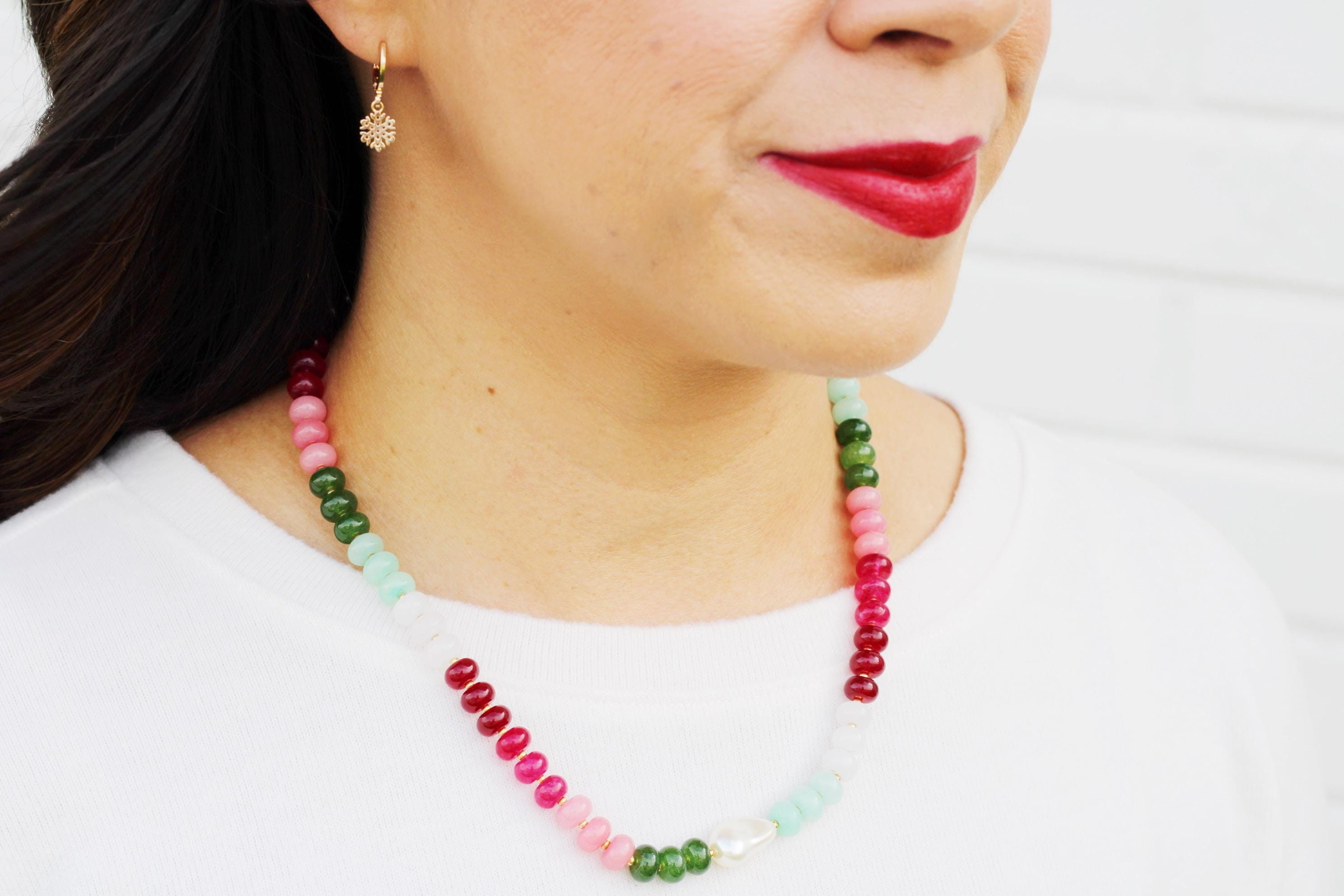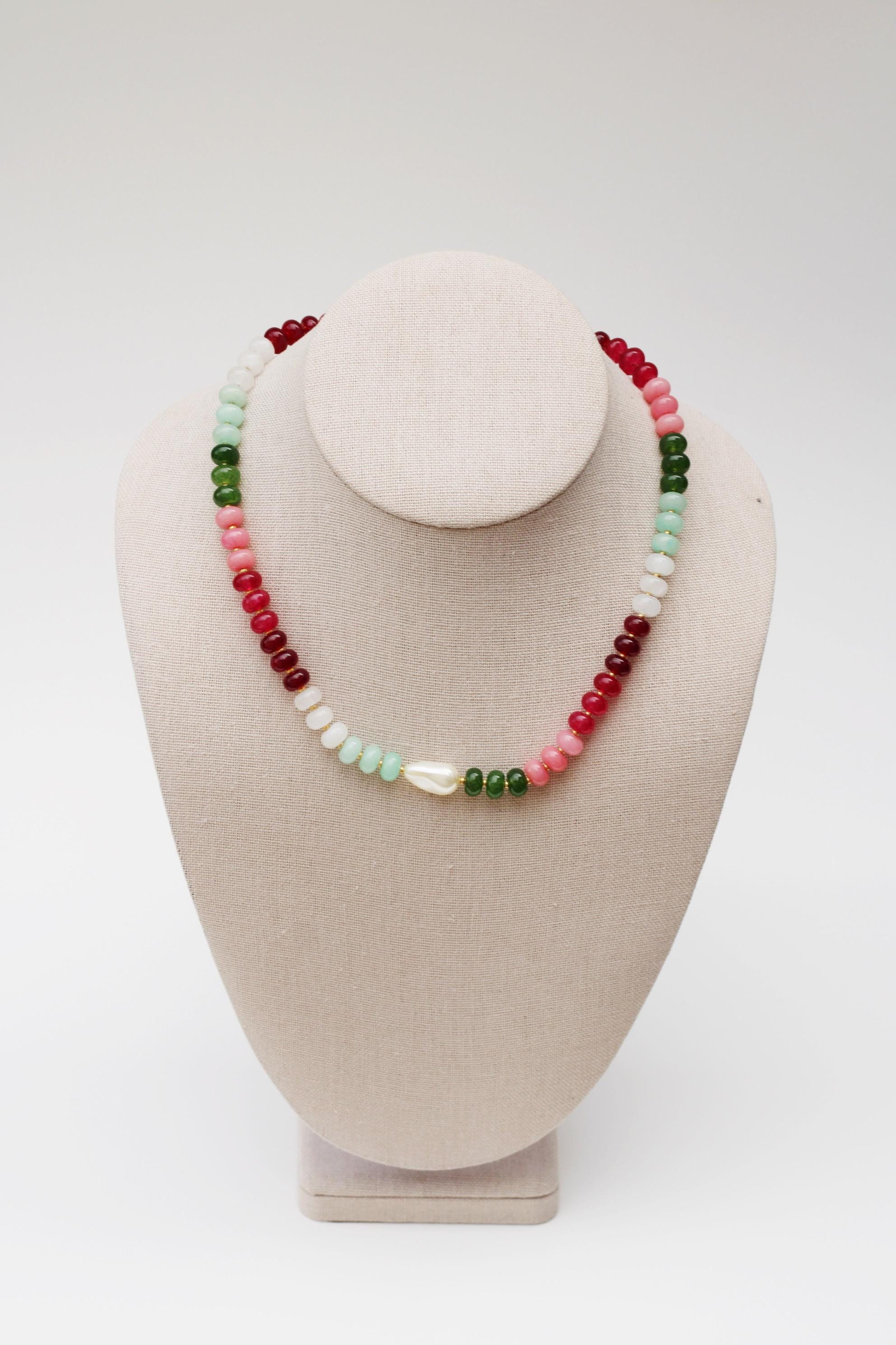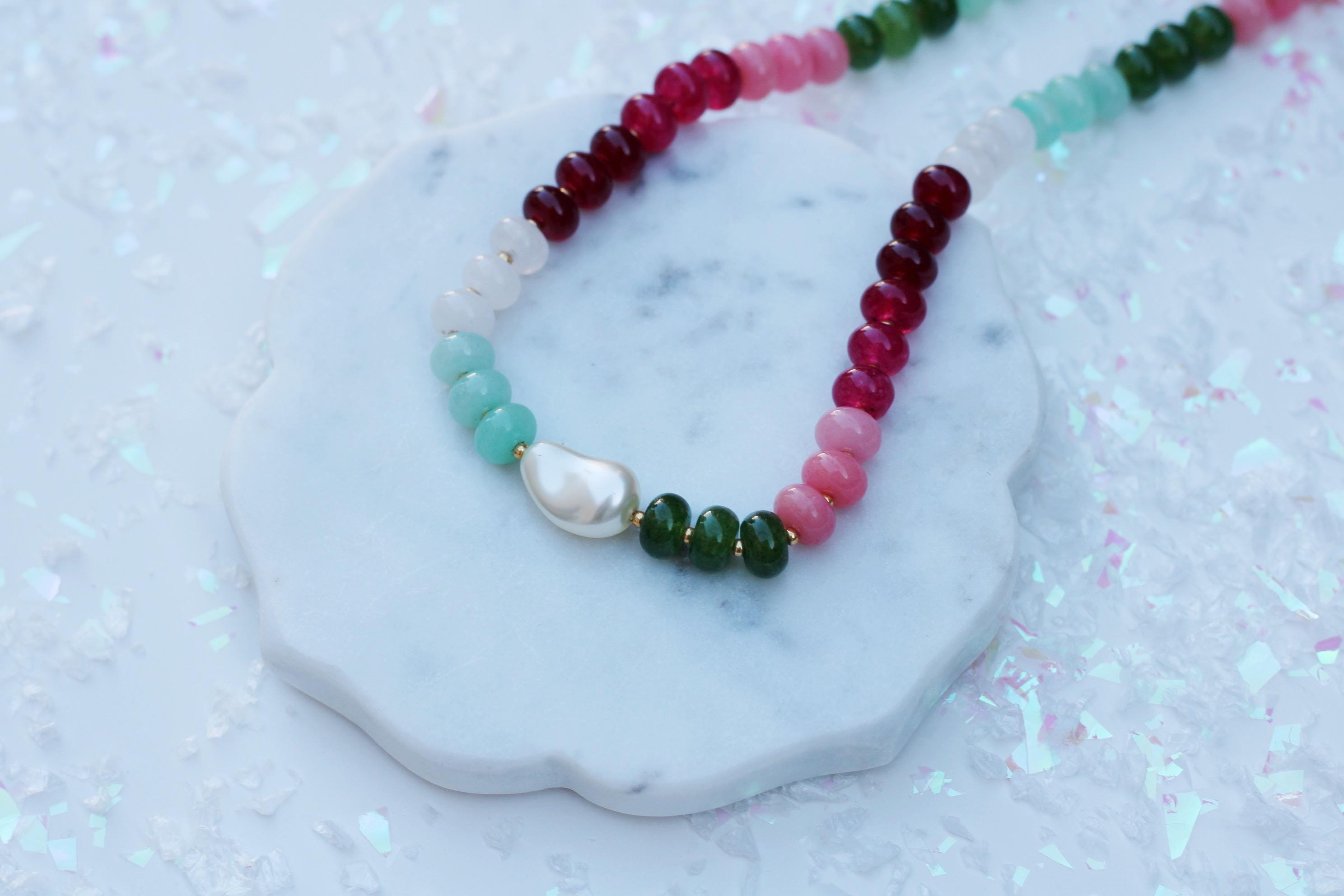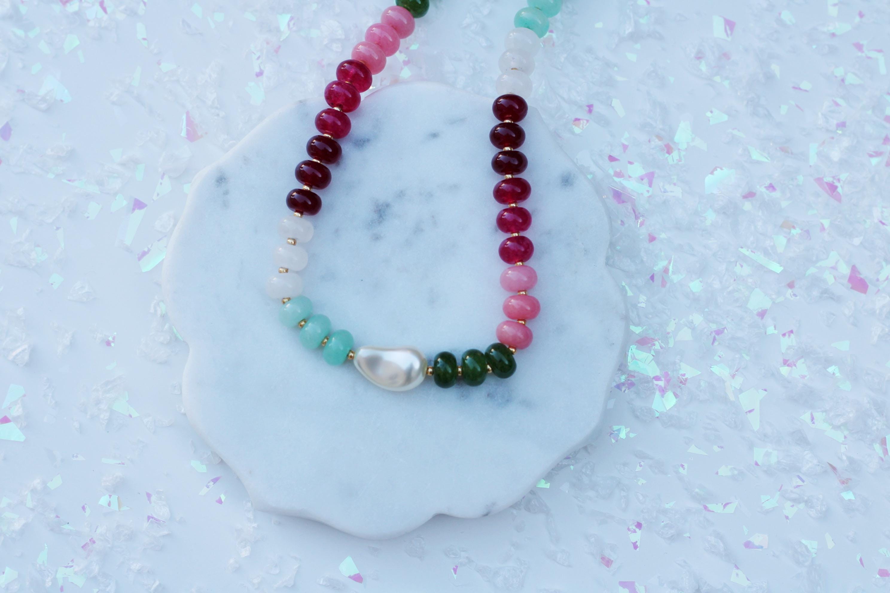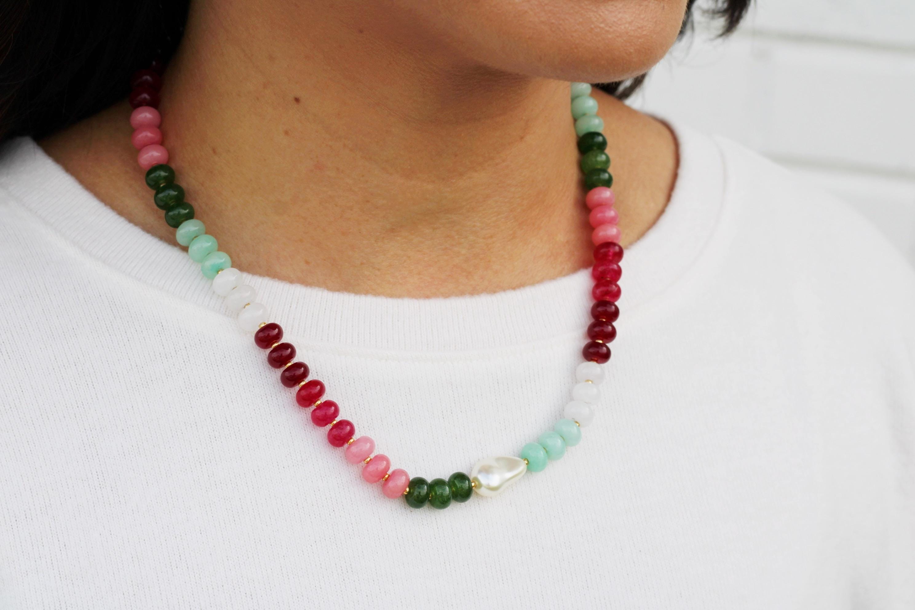 A gemstone bead necklace. Uniquely crafted with colored jade rondelle beads and your choice of plated hardware color and spacer bead (see photo for options) and accented with a baroque pearl.