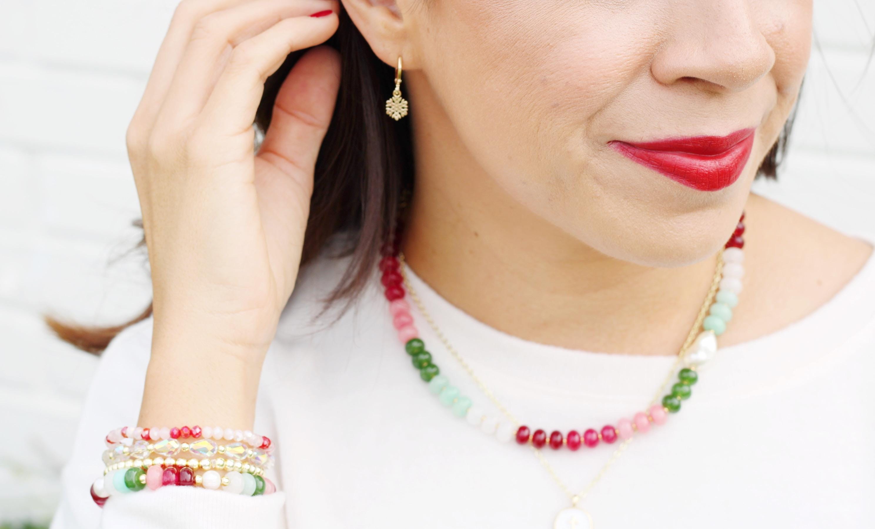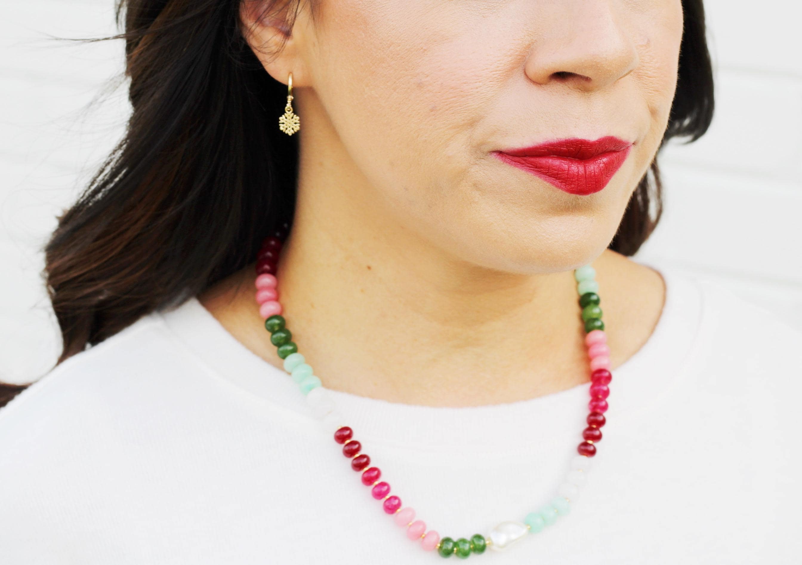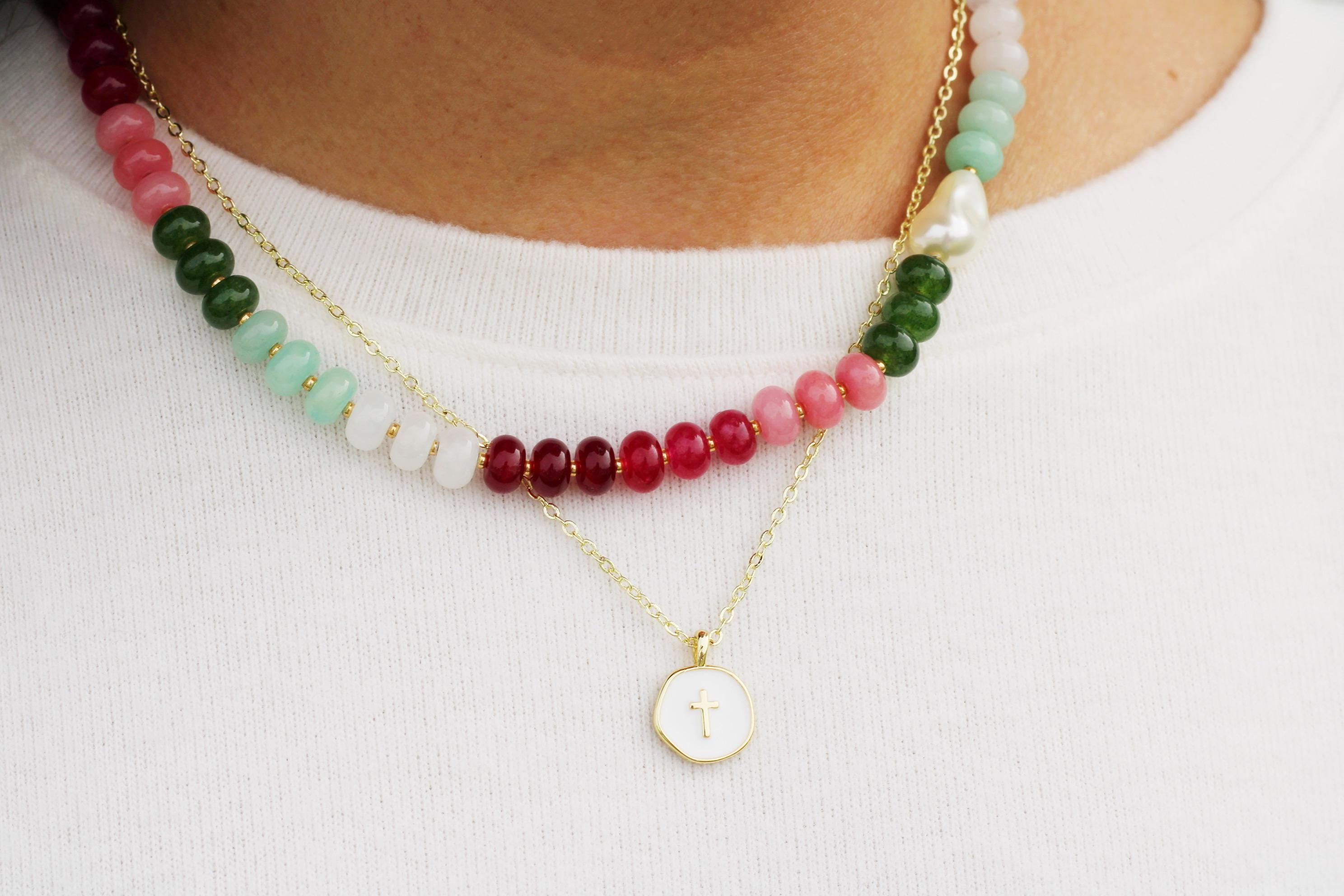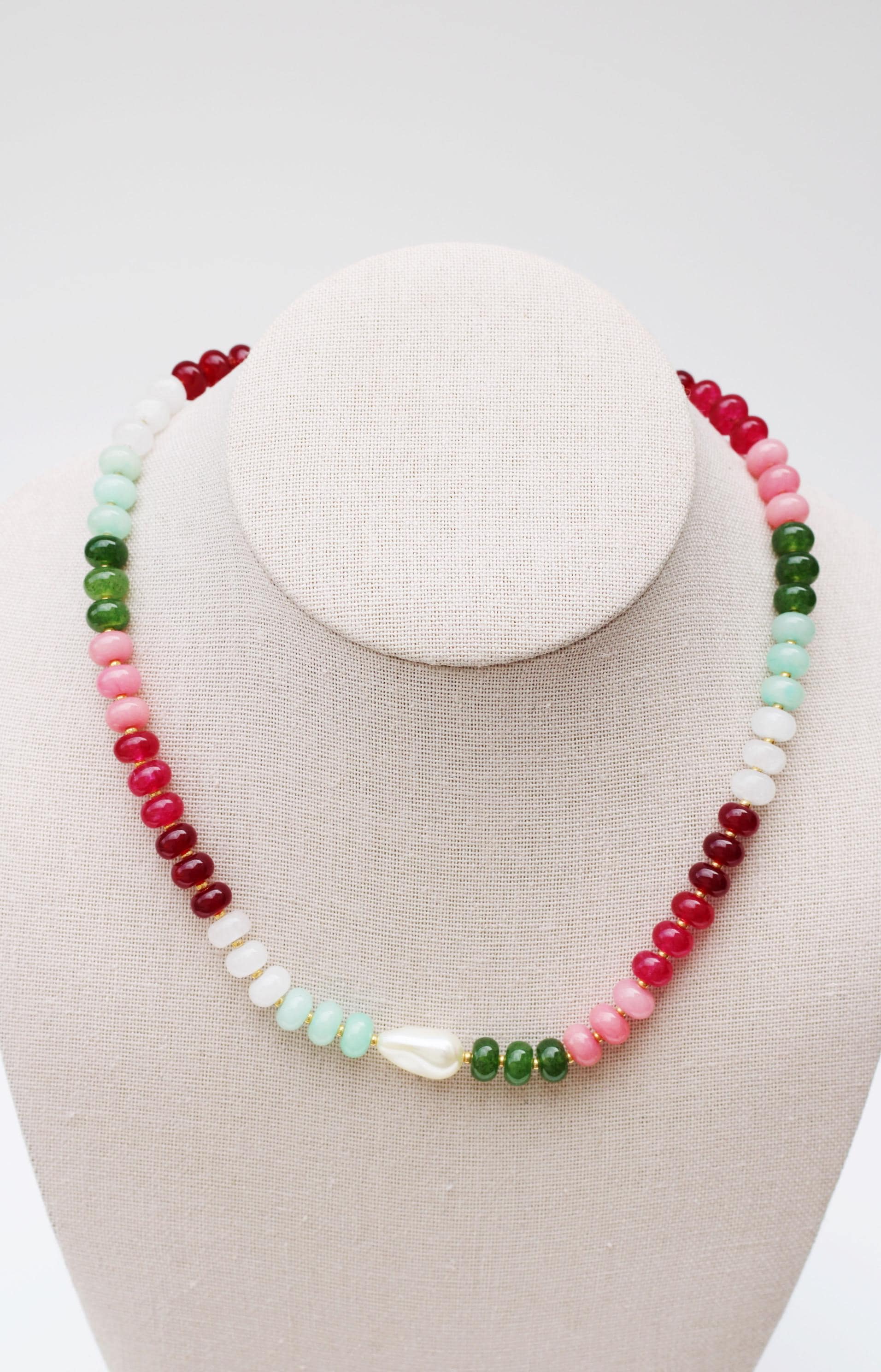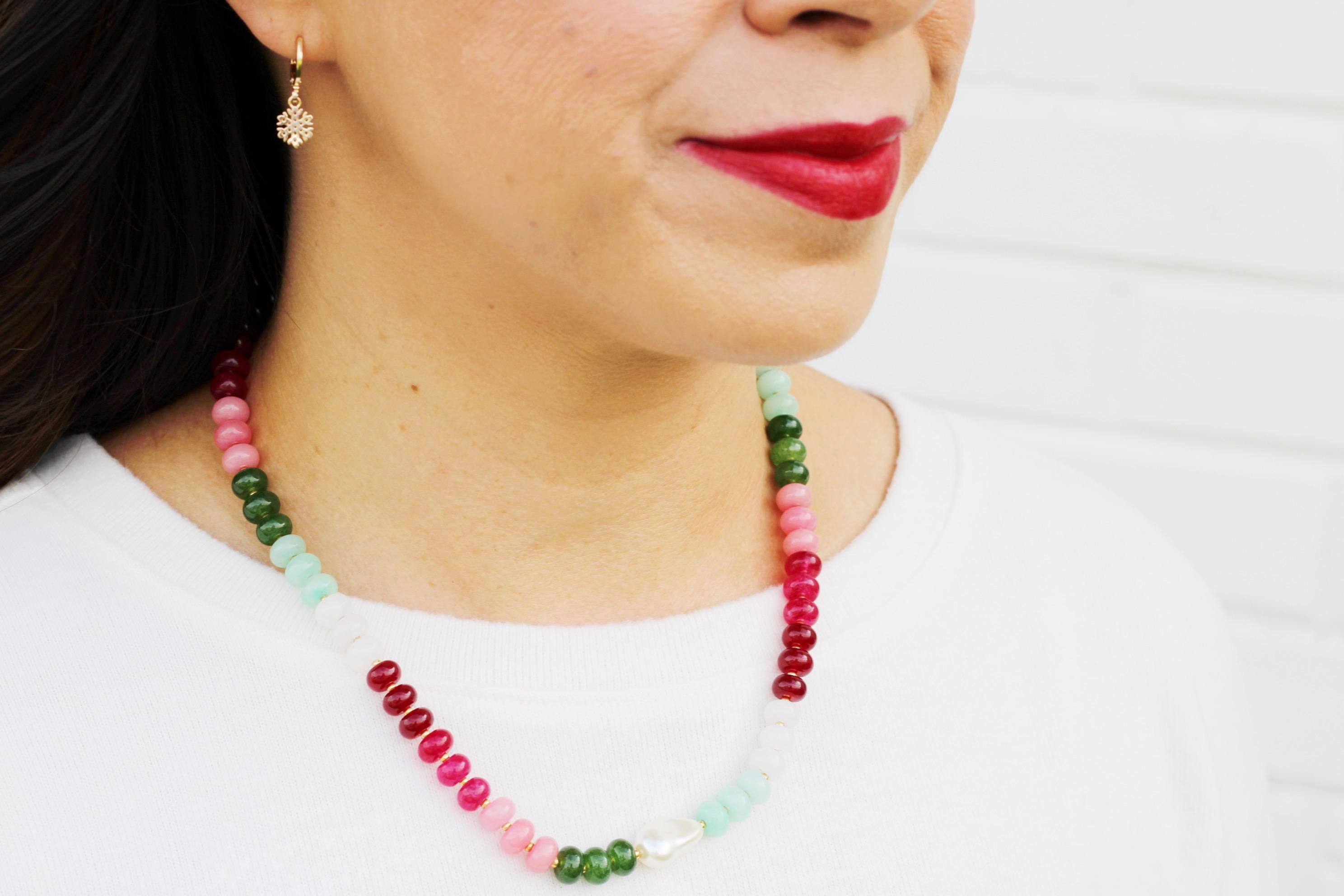 A gemstone bead necklace. Uniquely crafted with colored jade rondelle beads and your choice of plated hardware color and spacer bead (see photo for options) and accented with a baroque pearl.