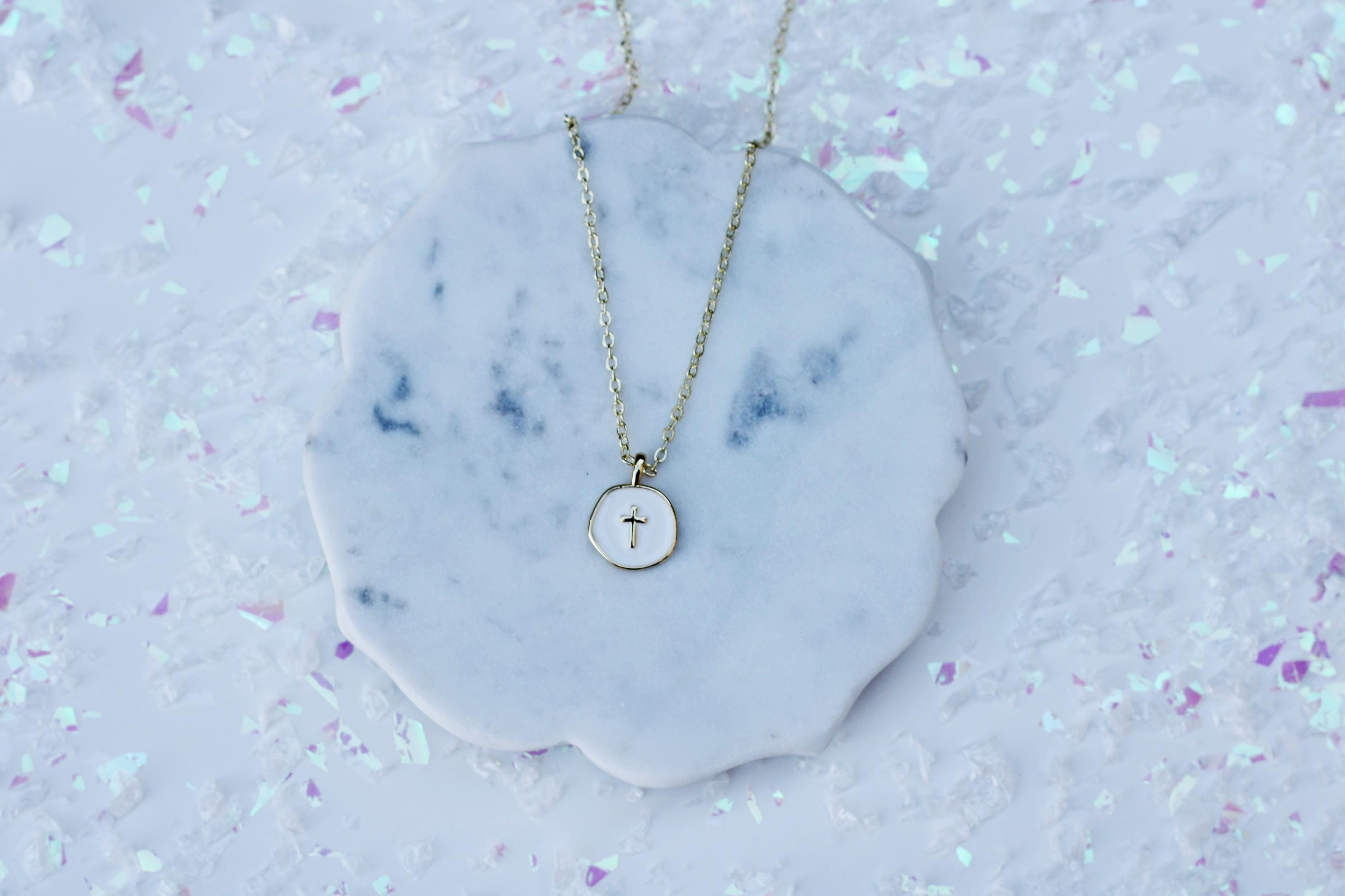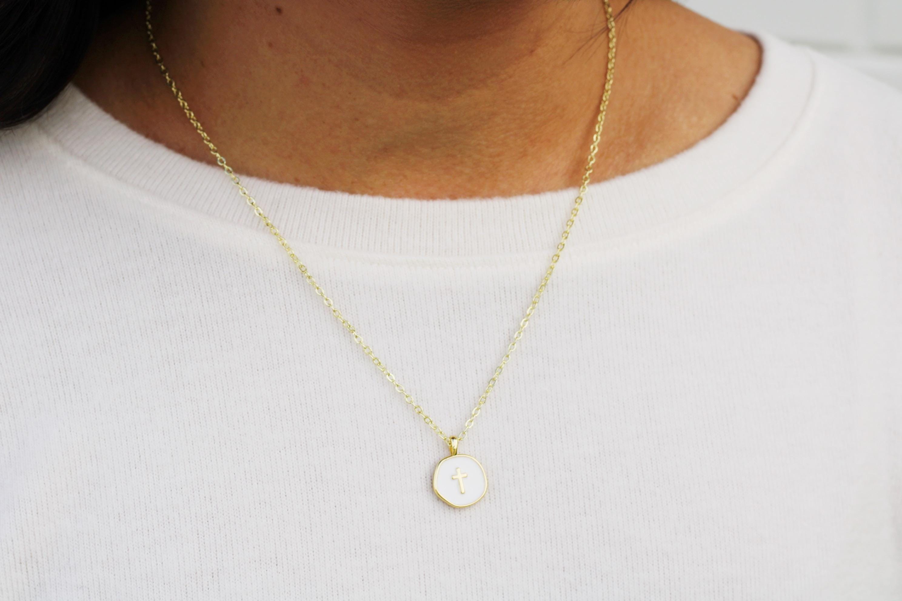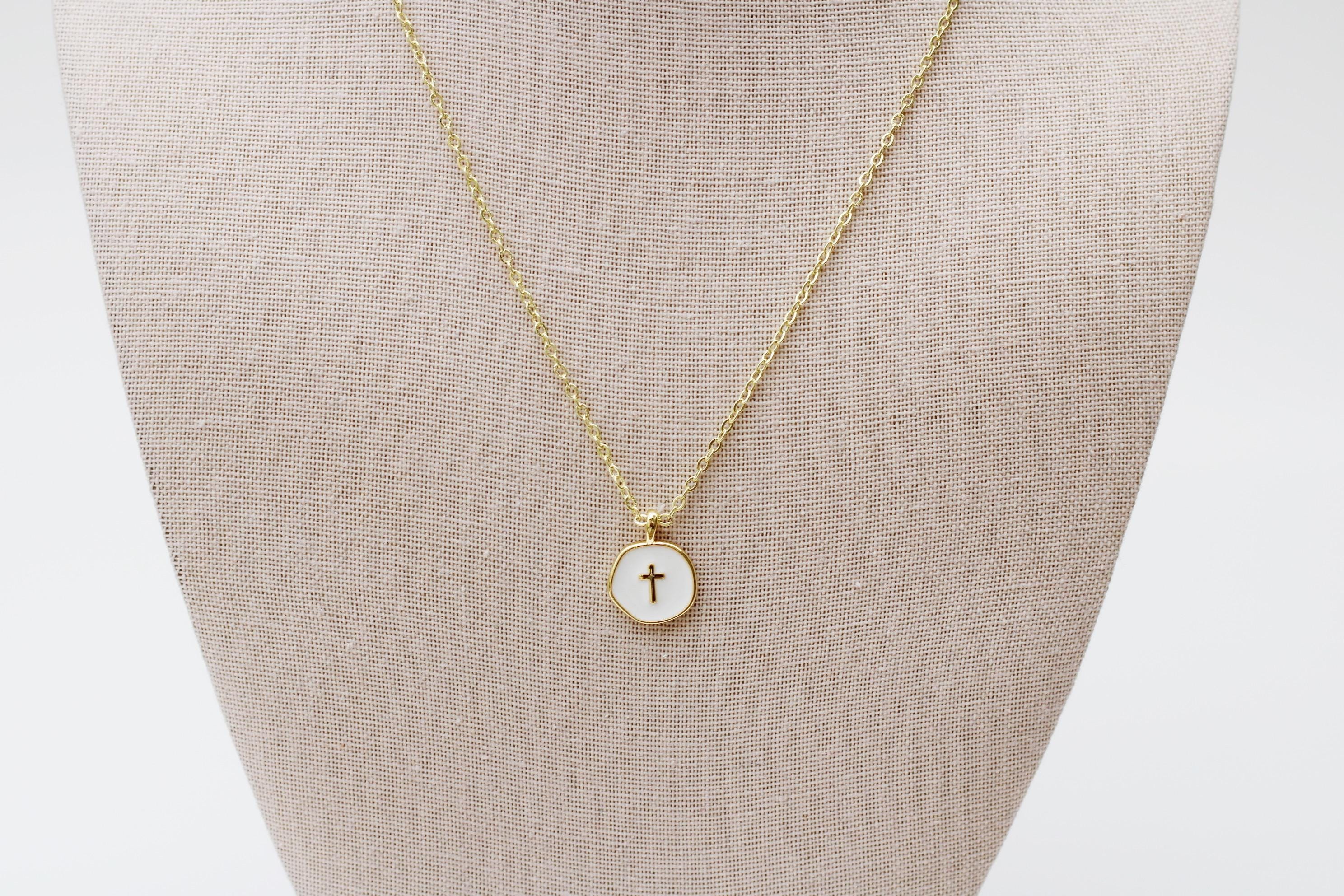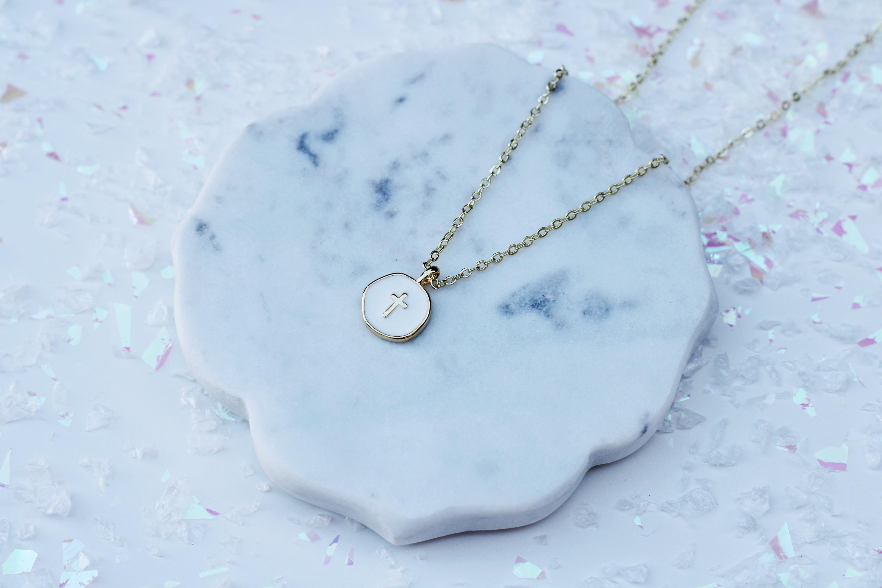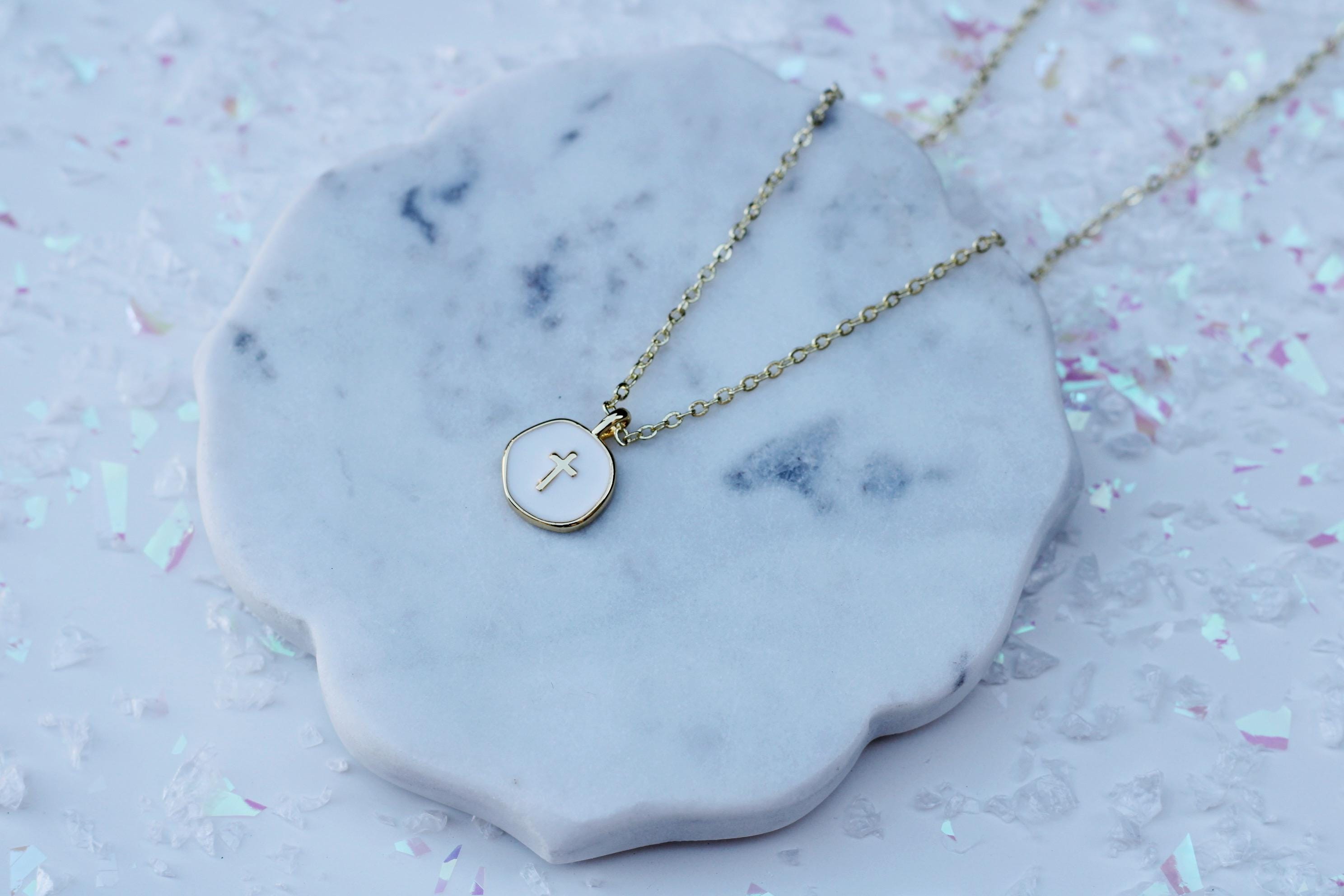 A pretty, dainty charm necklace. An 18" sparkly 14k gold plated necklace chain adorned with a 18k gold plated white enamel cross charm.