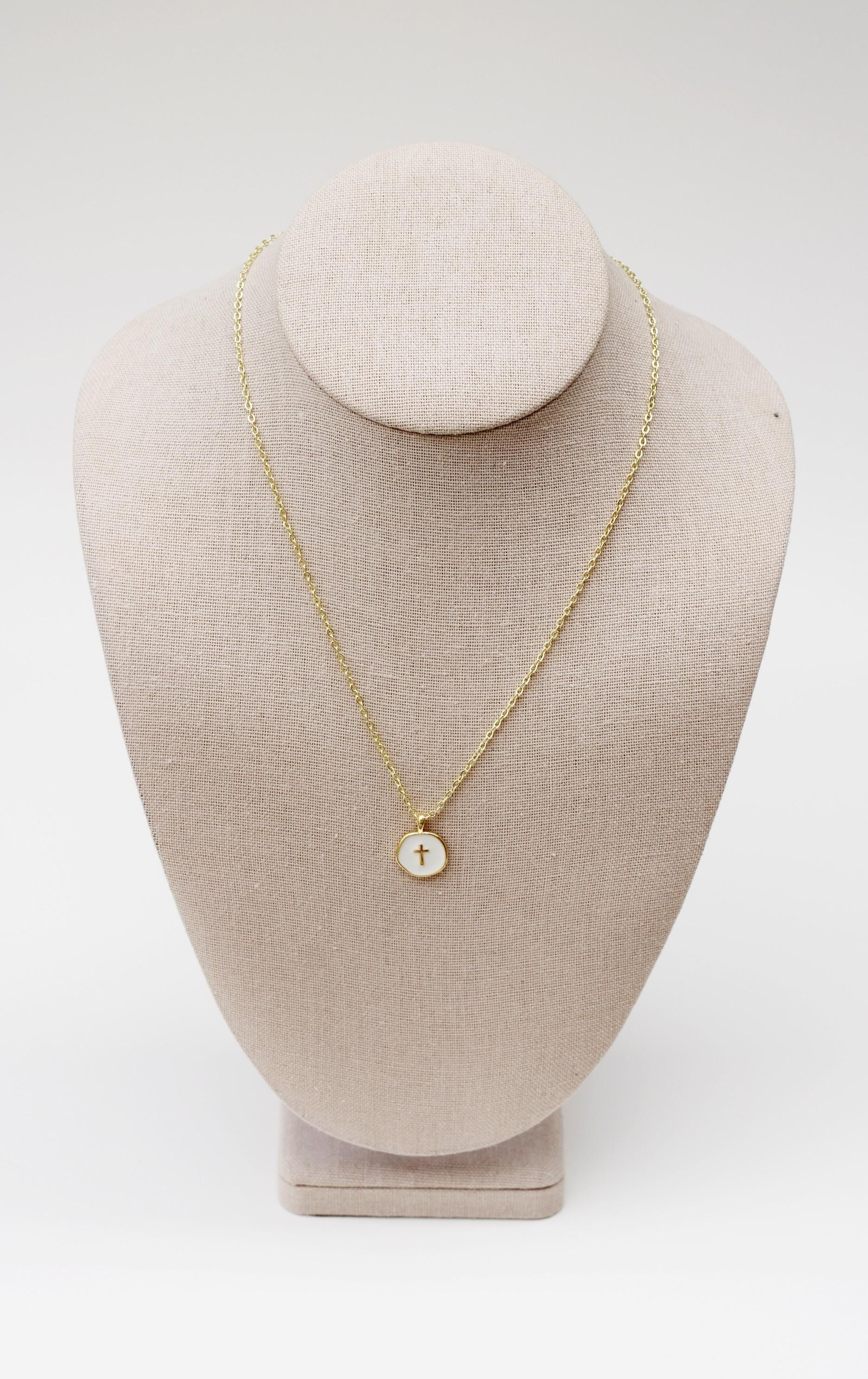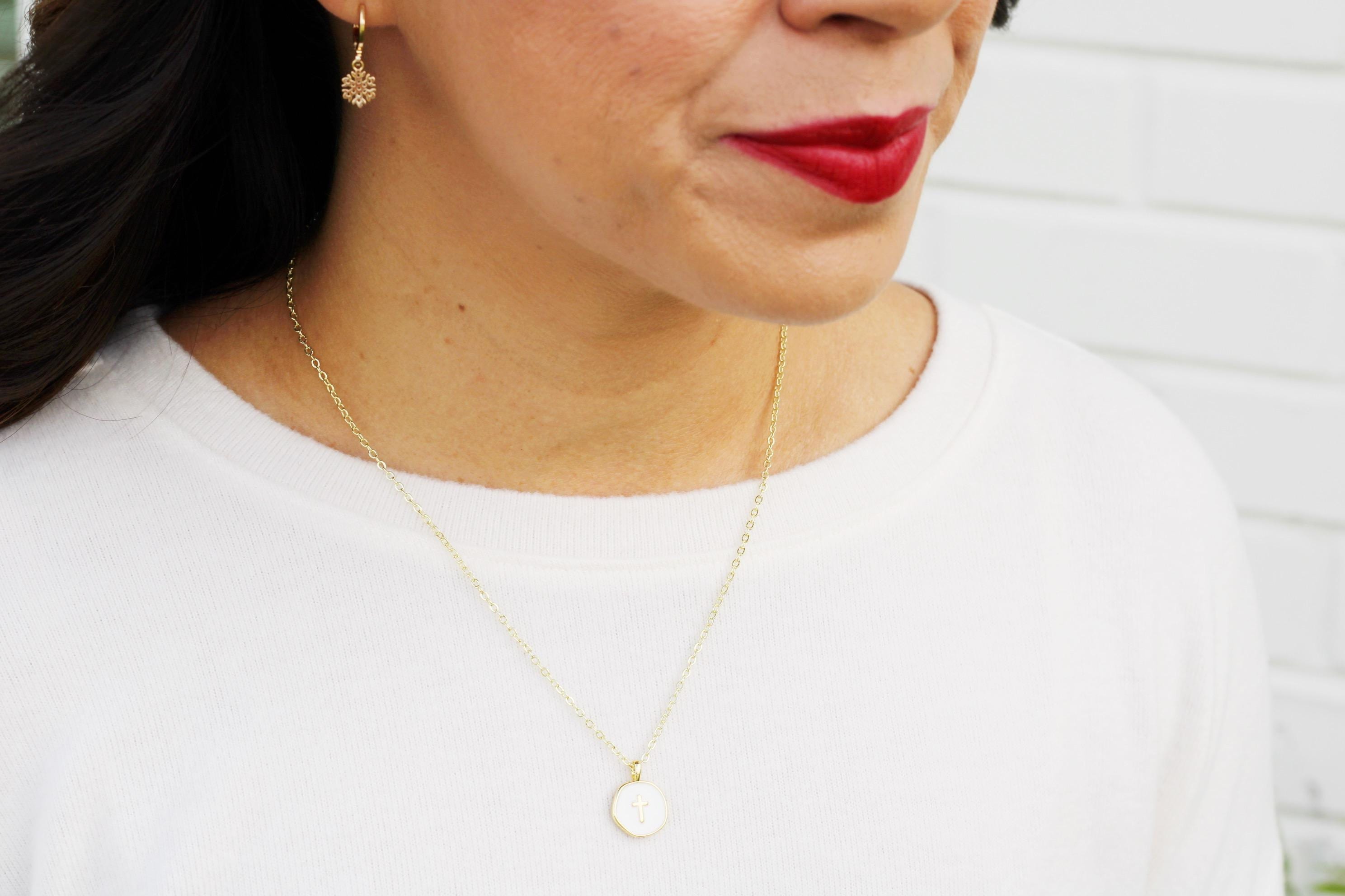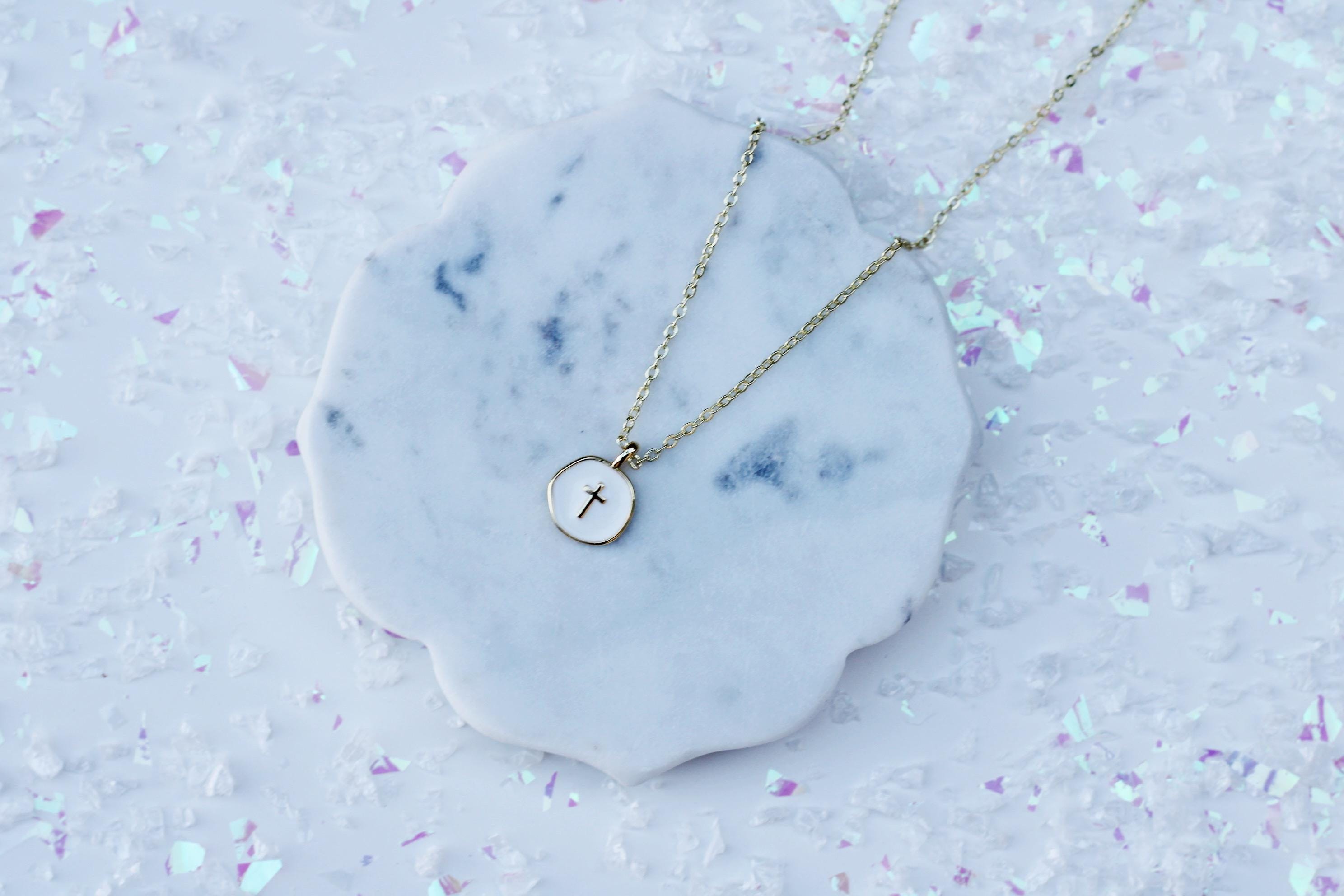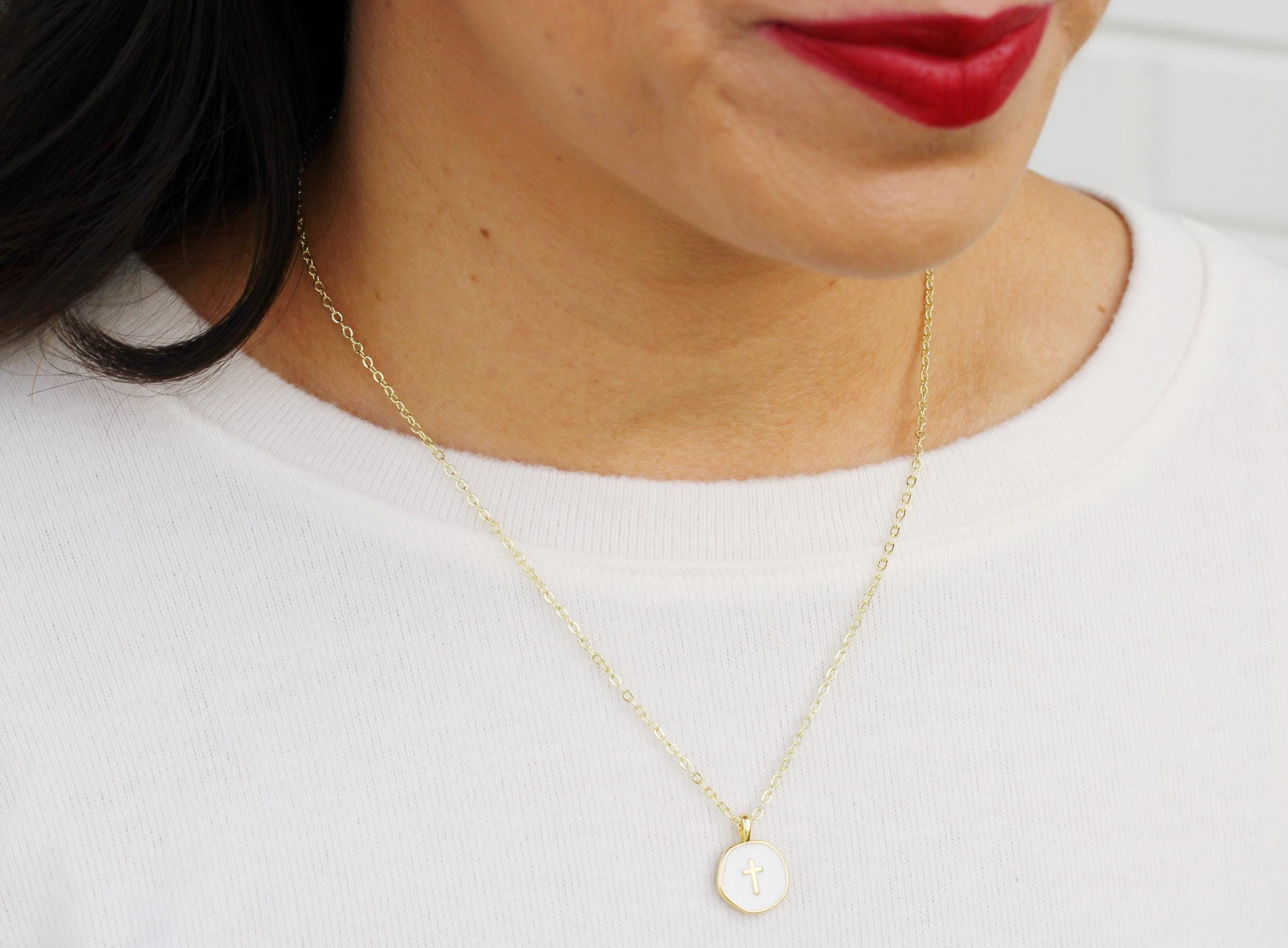 A pretty, dainty charm necklace. An 18" sparkly 14k gold plated necklace chain adorned with a 18k gold plated white enamel cross charm.