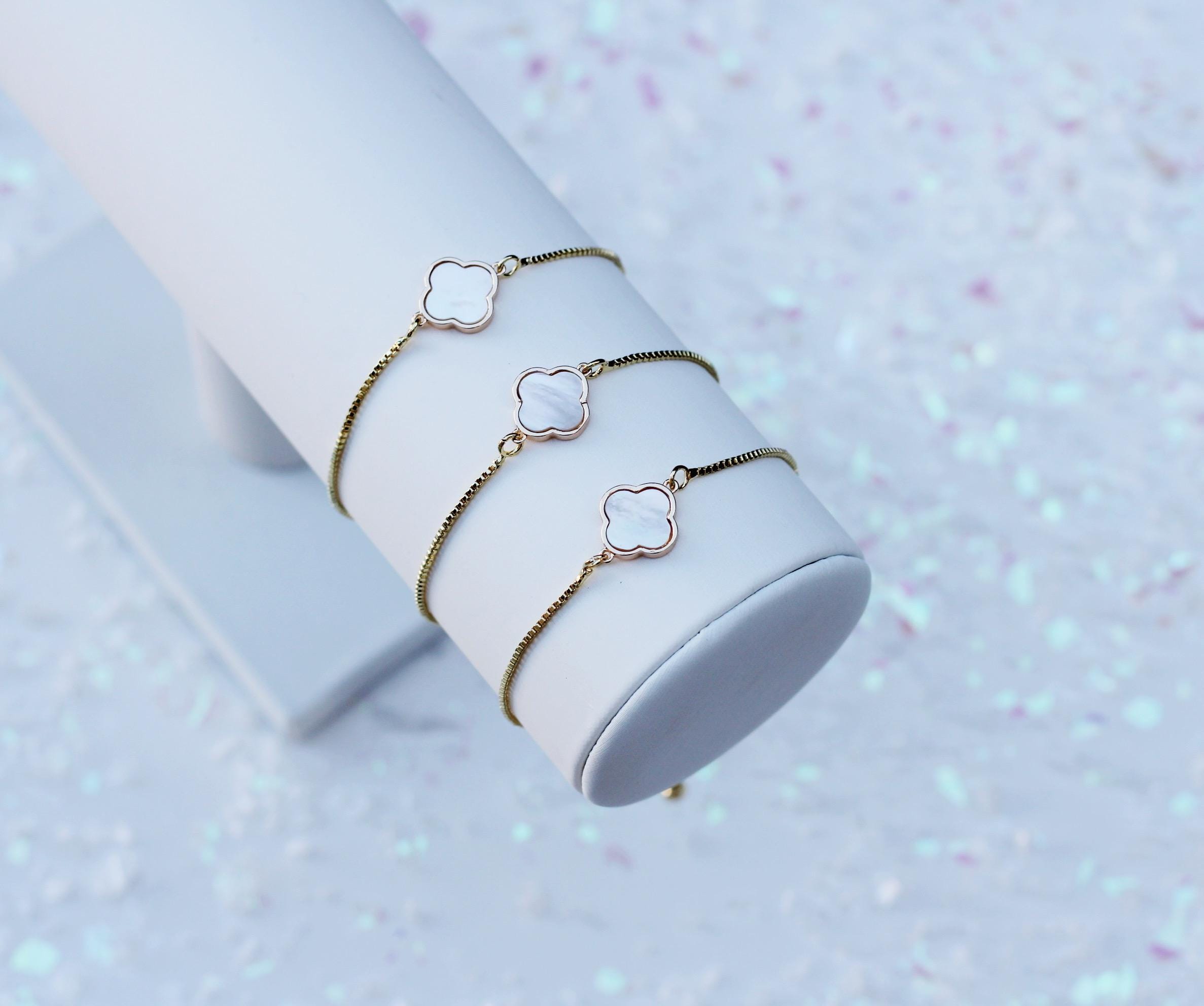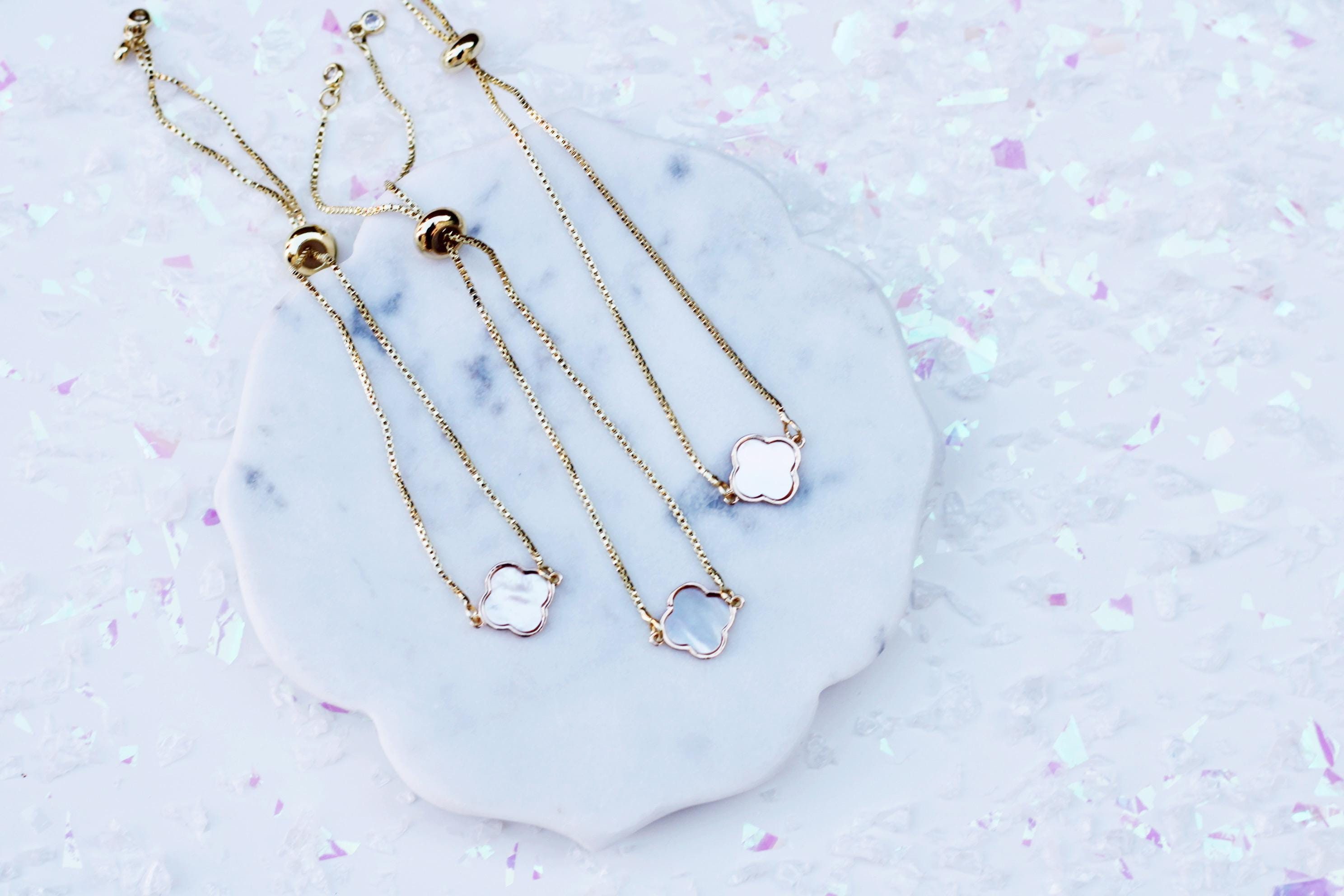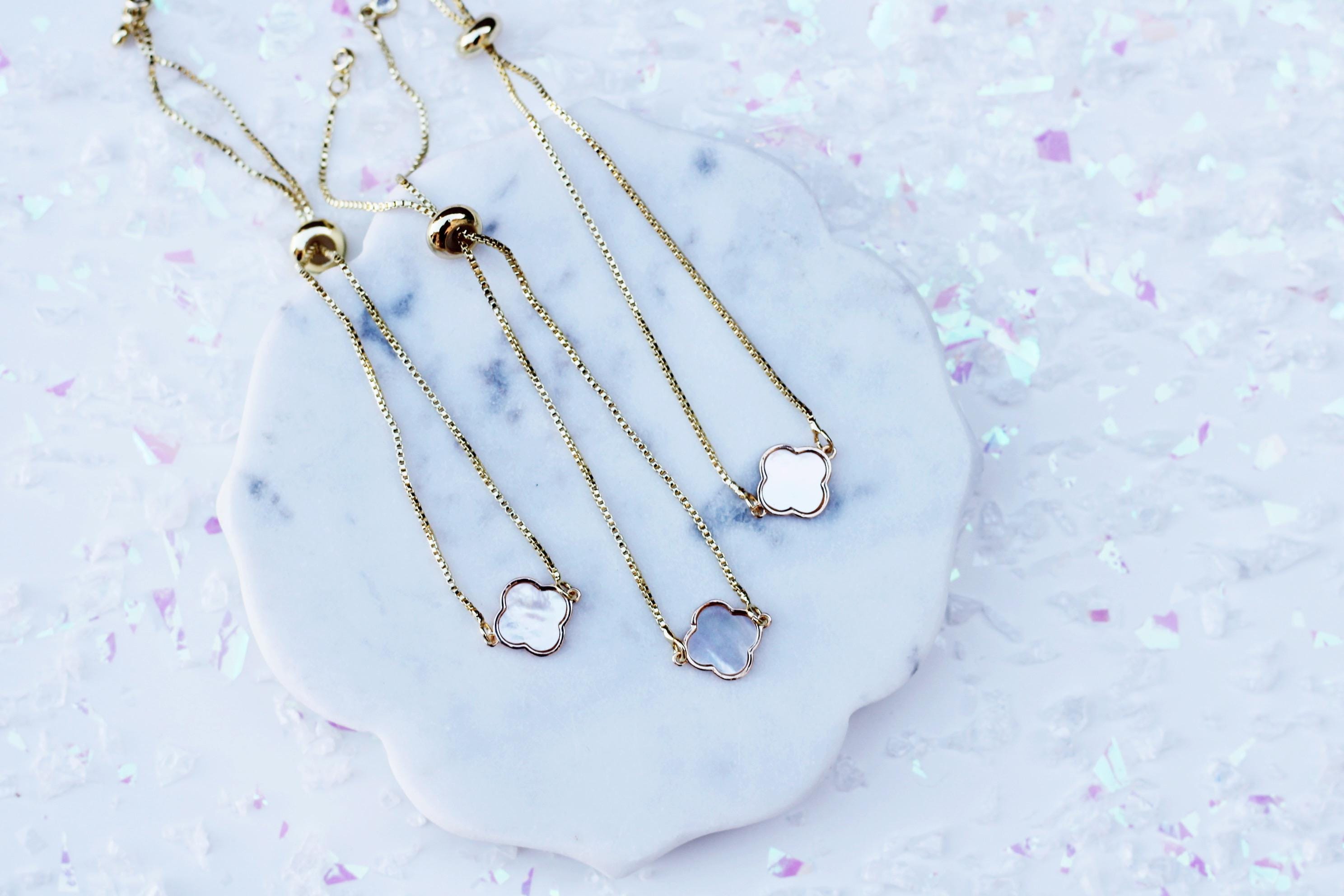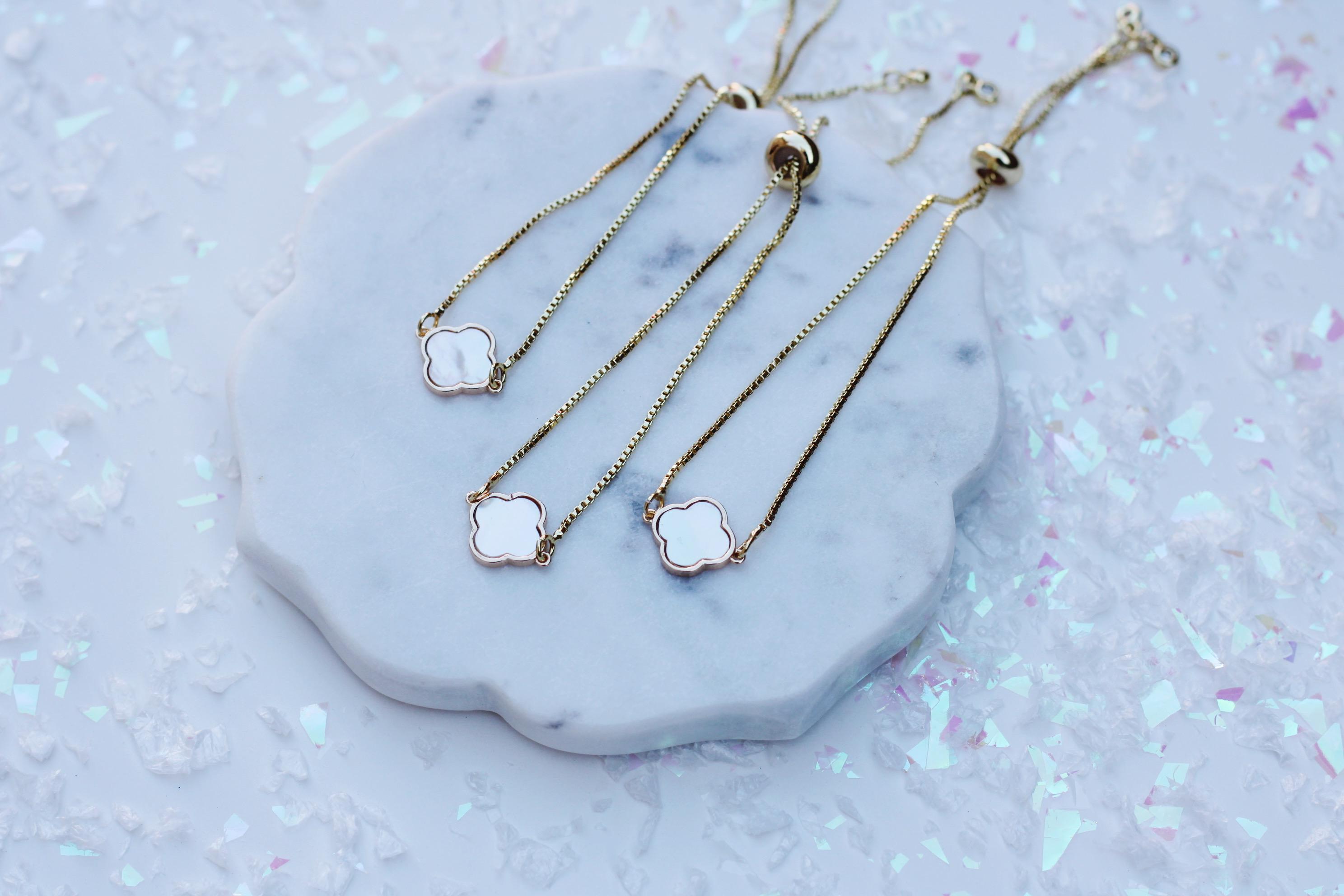 This listing is for ONE adjustable bolo bracelet with a 18k gold filled mother of pearl clover bead.