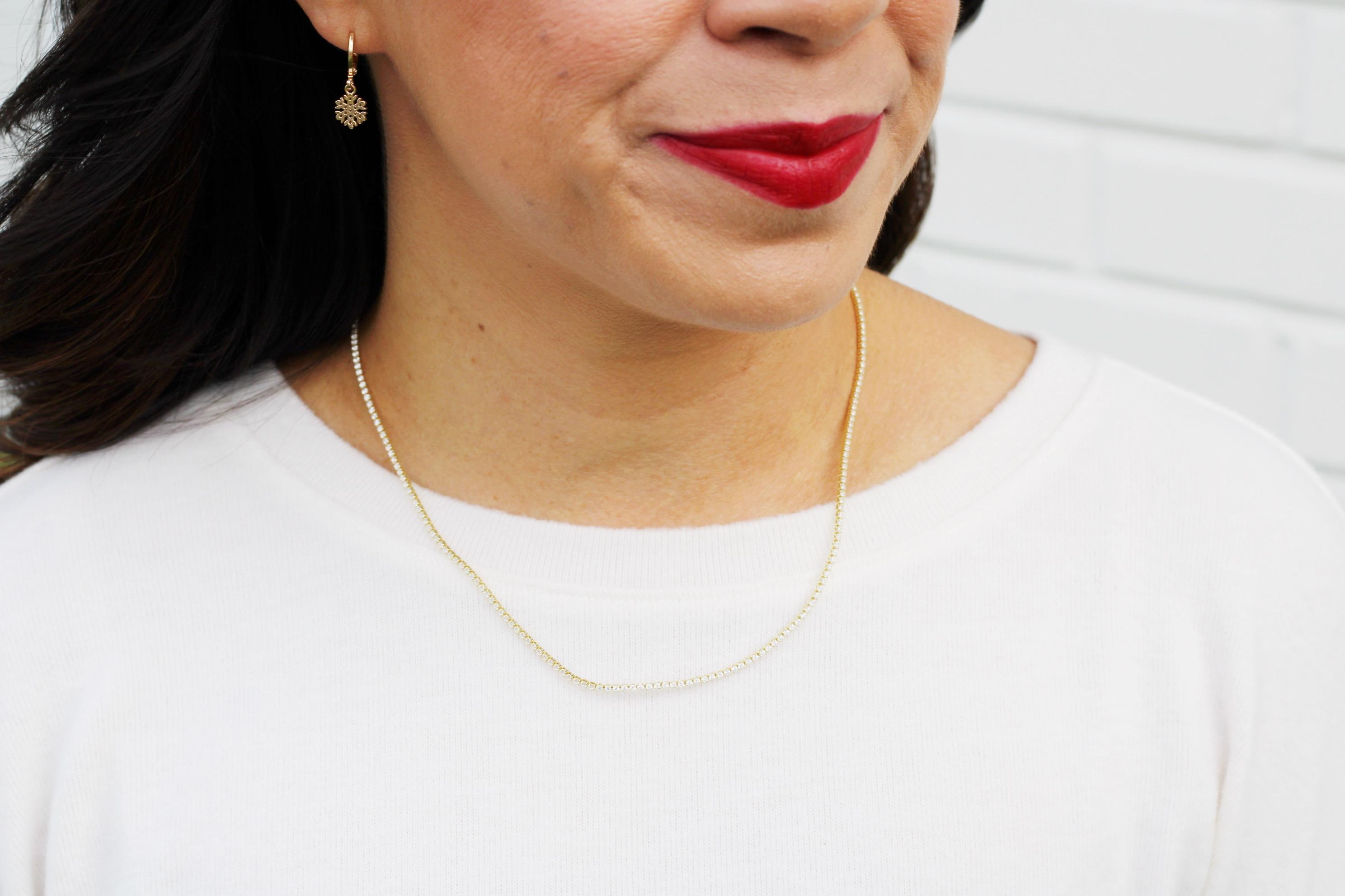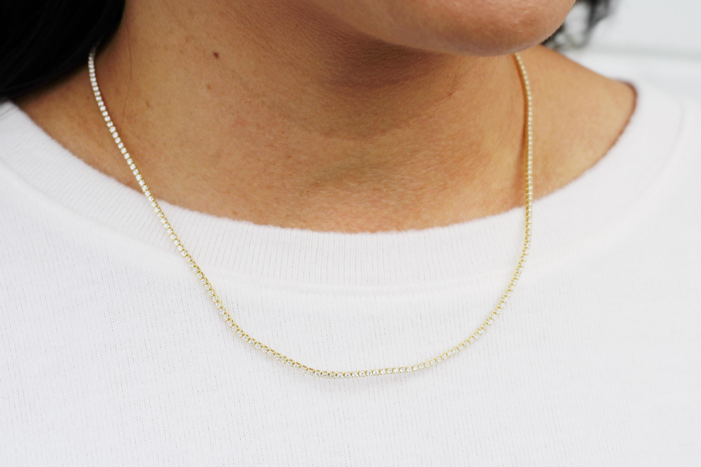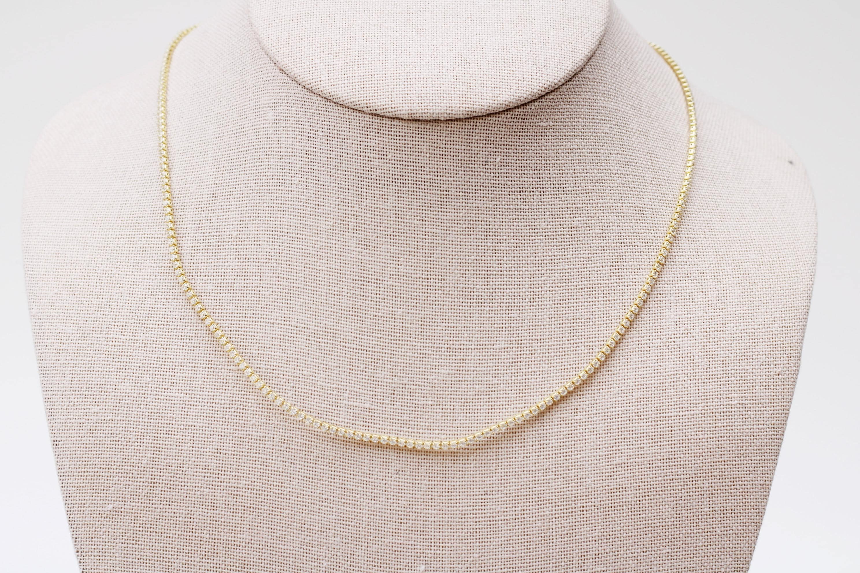 A pretty, dainty tennis necklace. An 18" sparkly 24k gold filled necklace chain with cubic zirconia crystals.