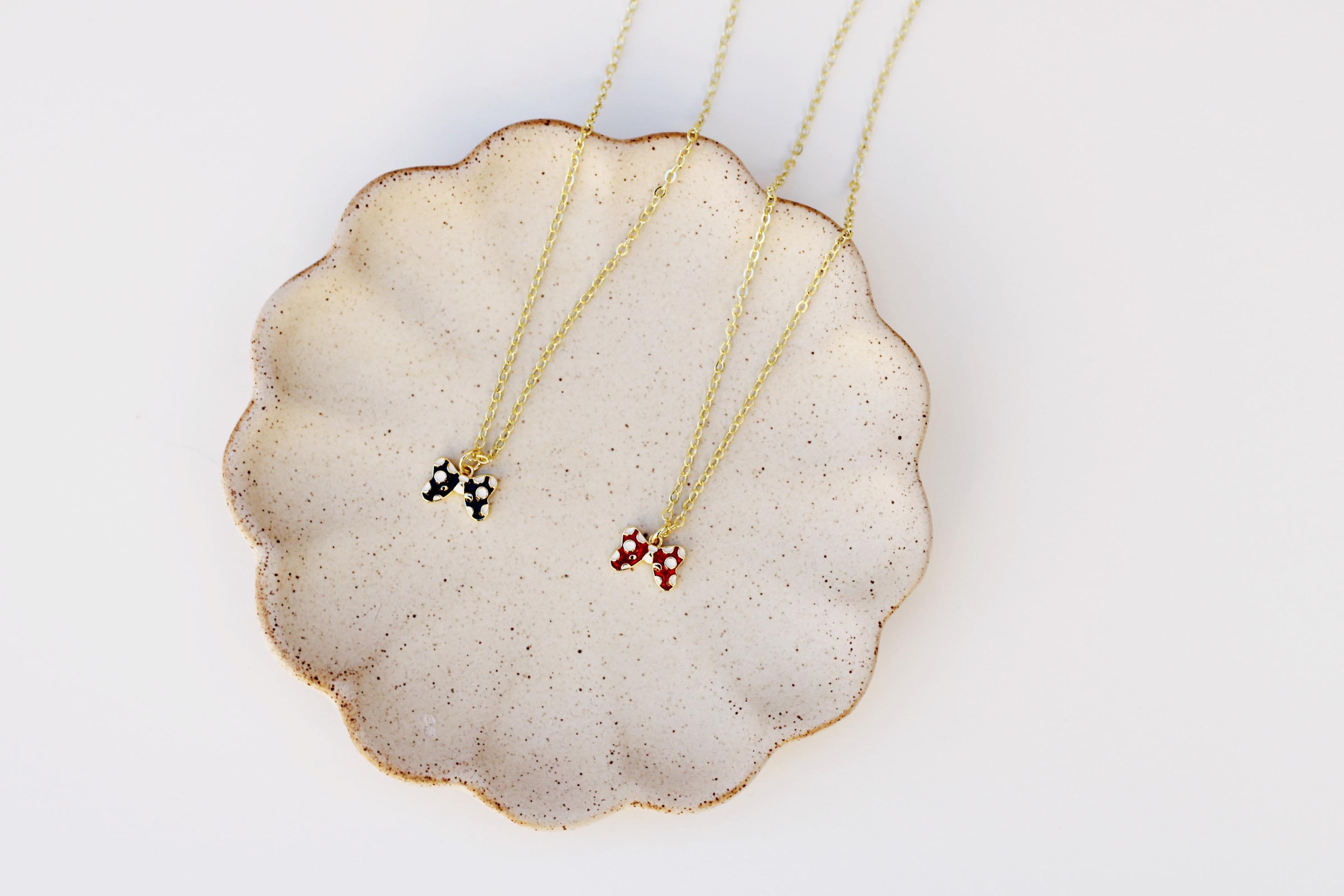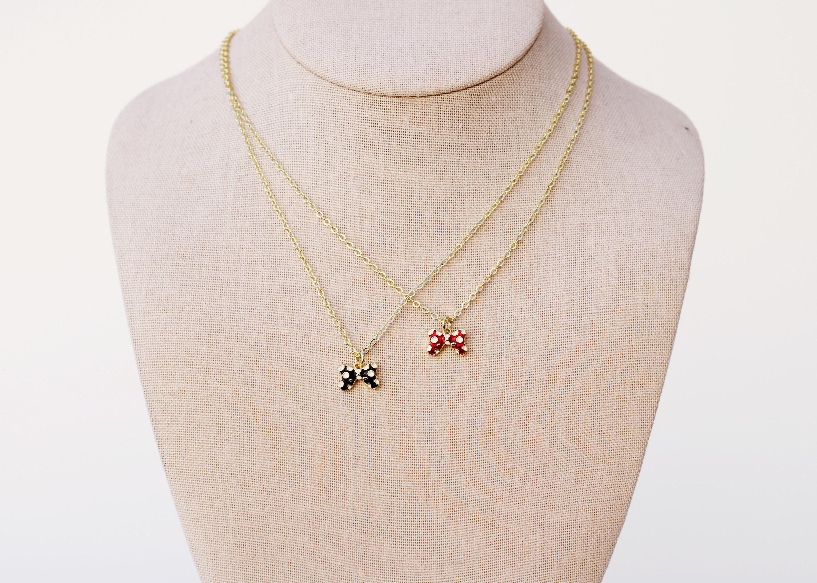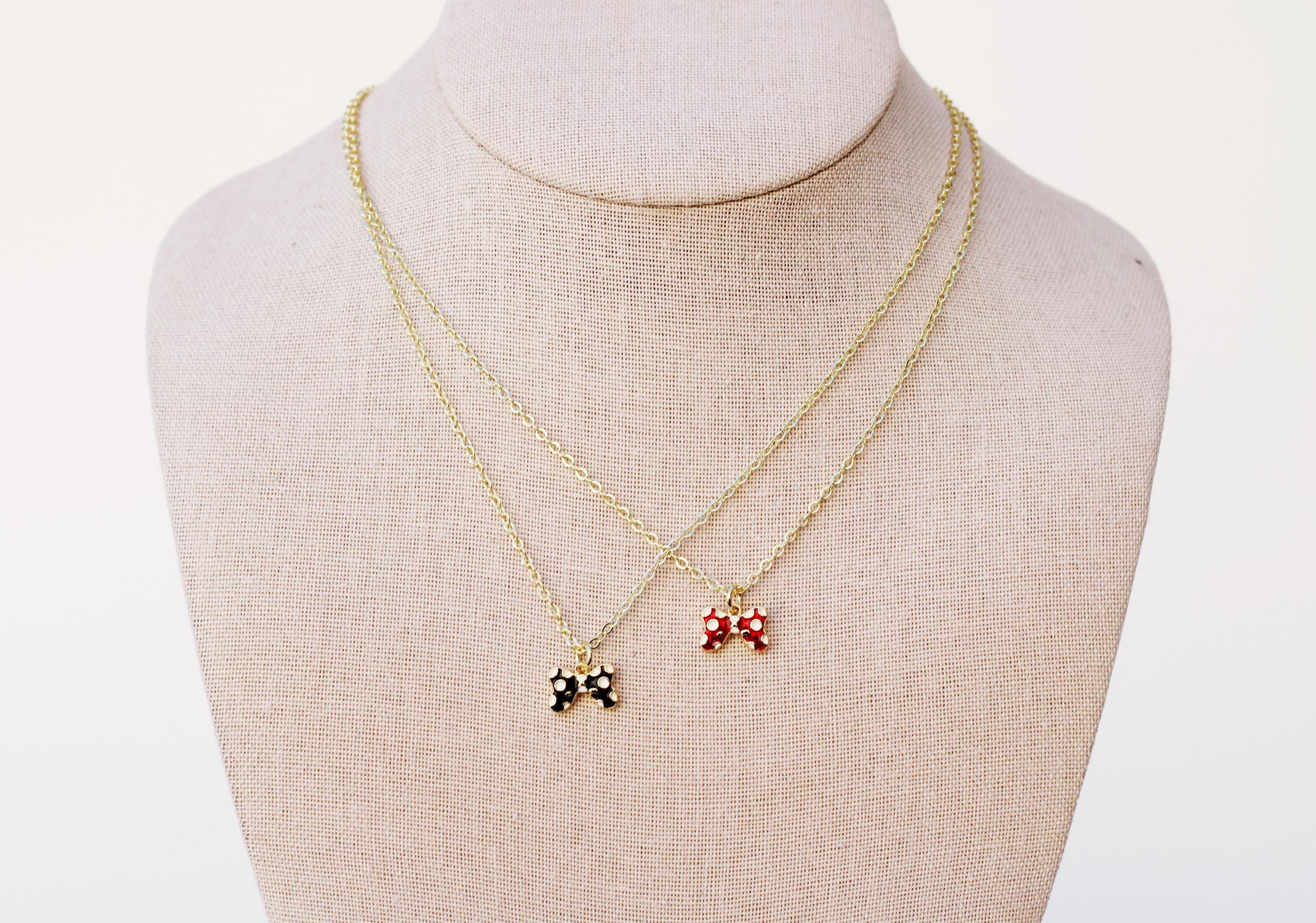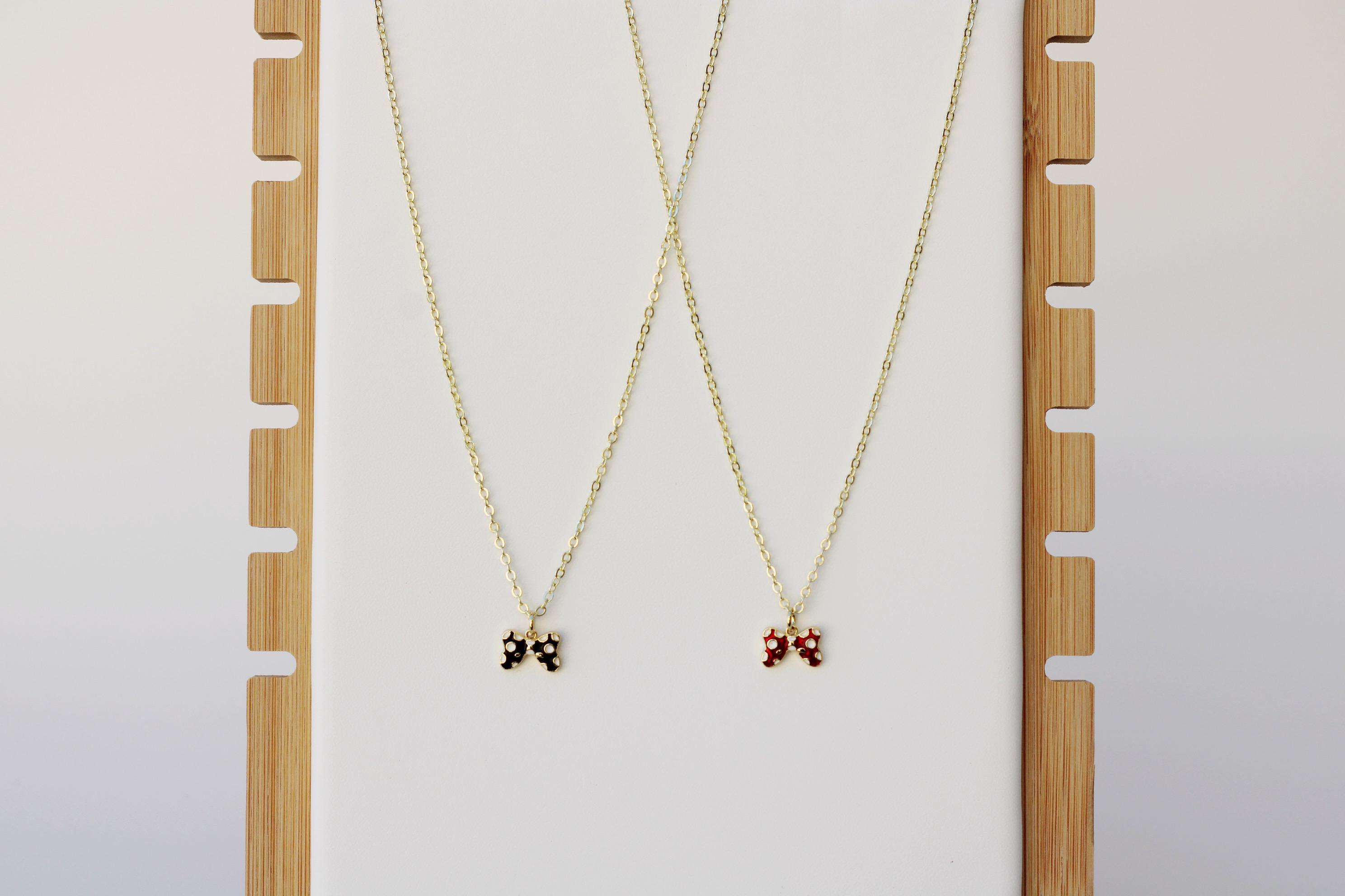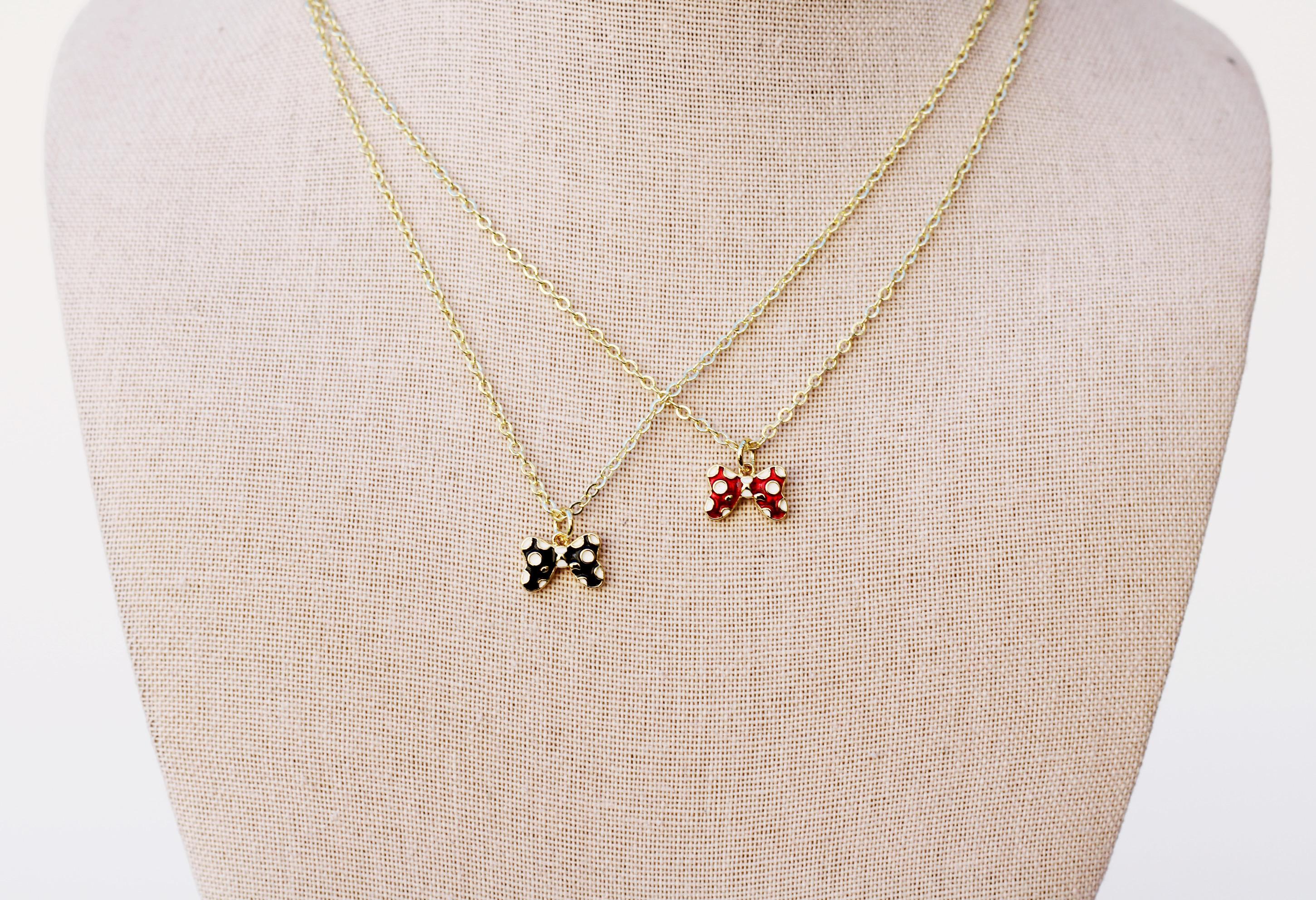 A pretty, dainty charm necklace. A sparkly 14k gold plated necklace chain adorned with a 18k gold plated black or red bow charm. Perfect to add to your jewelry collection or to gift to someone else!