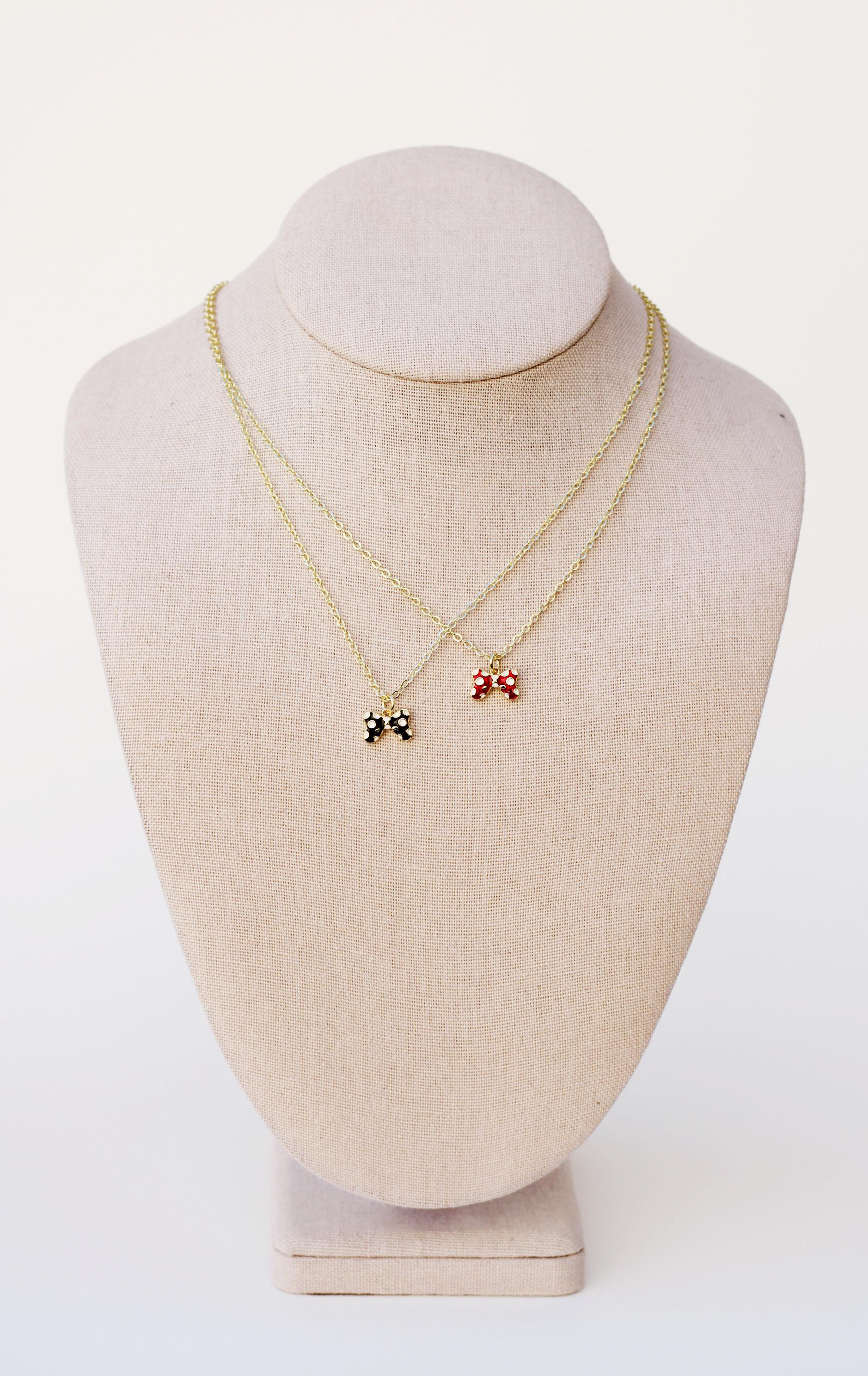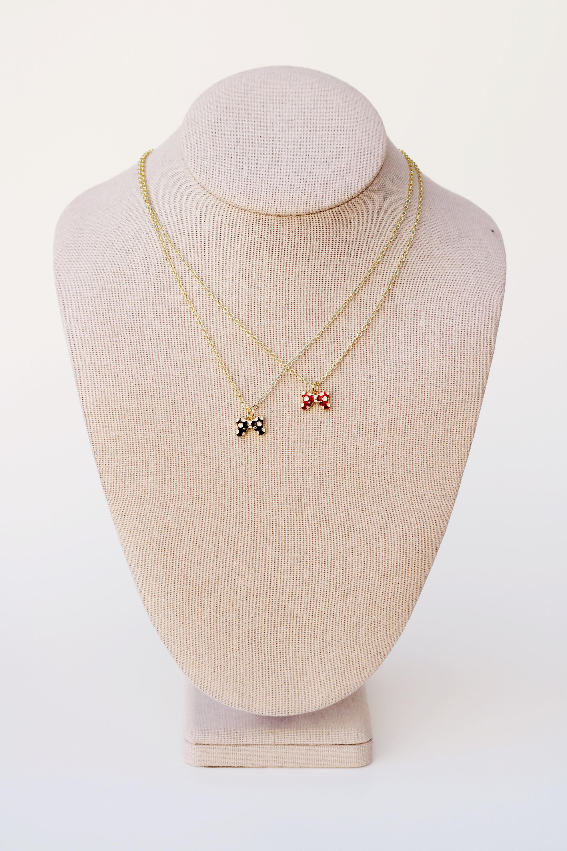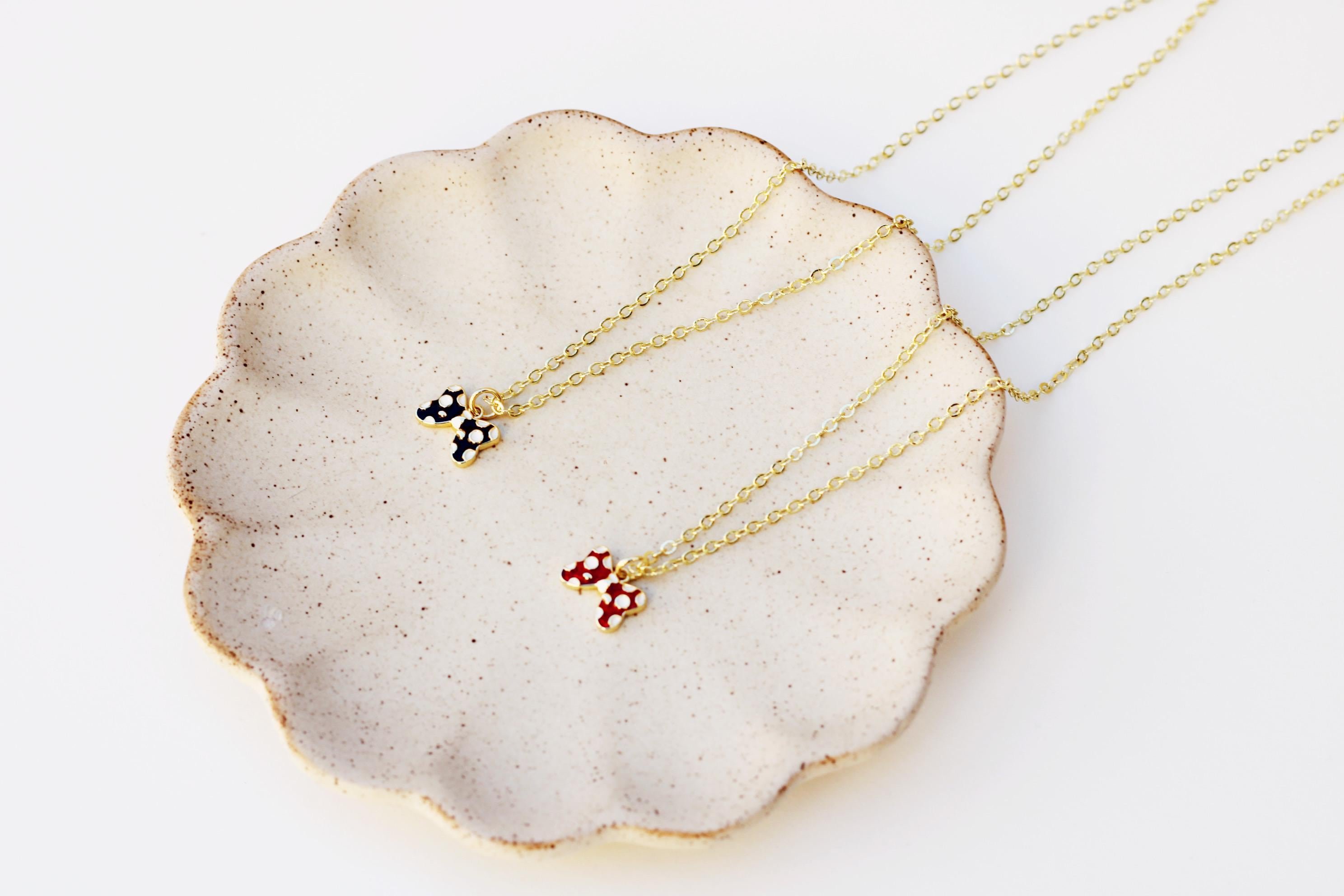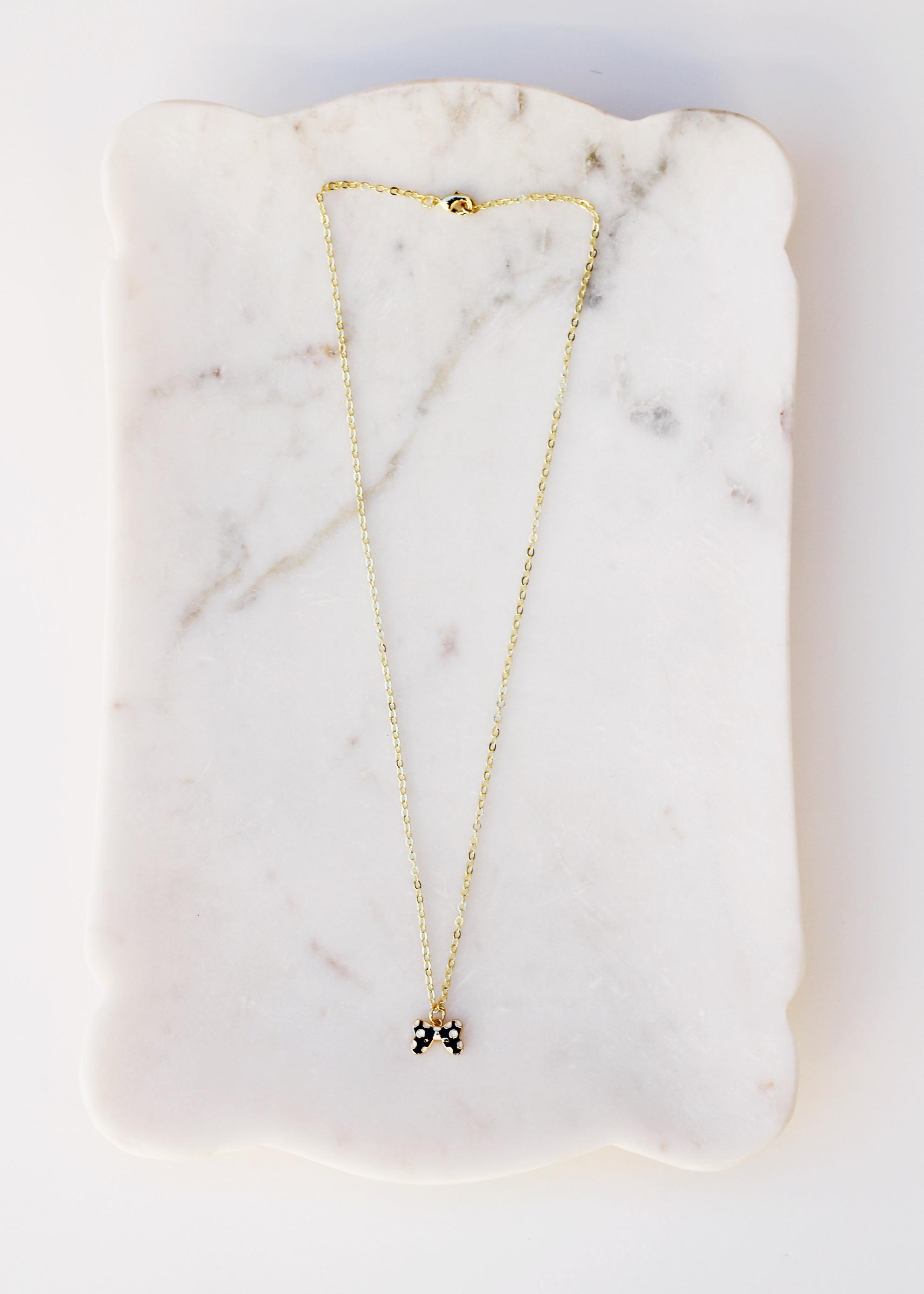 A pretty, dainty charm necklace. A sparkly 14k gold plated necklace chain adorned with a 18k gold plated black or red bow charm. Perfect to add to your jewelry collection or to gift to someone else!
