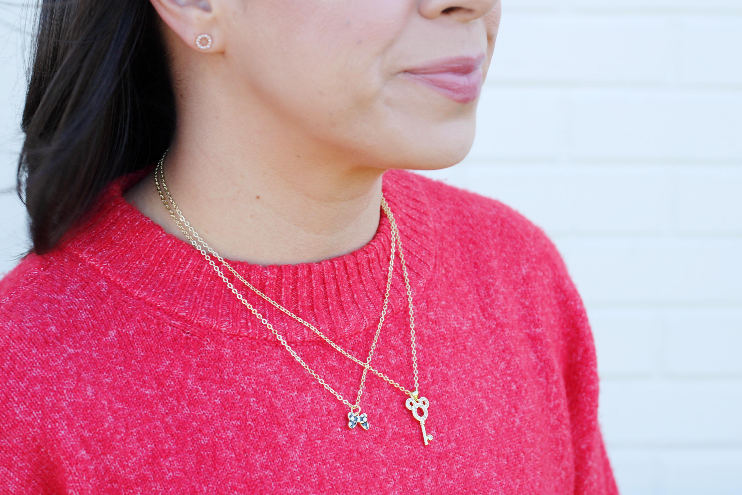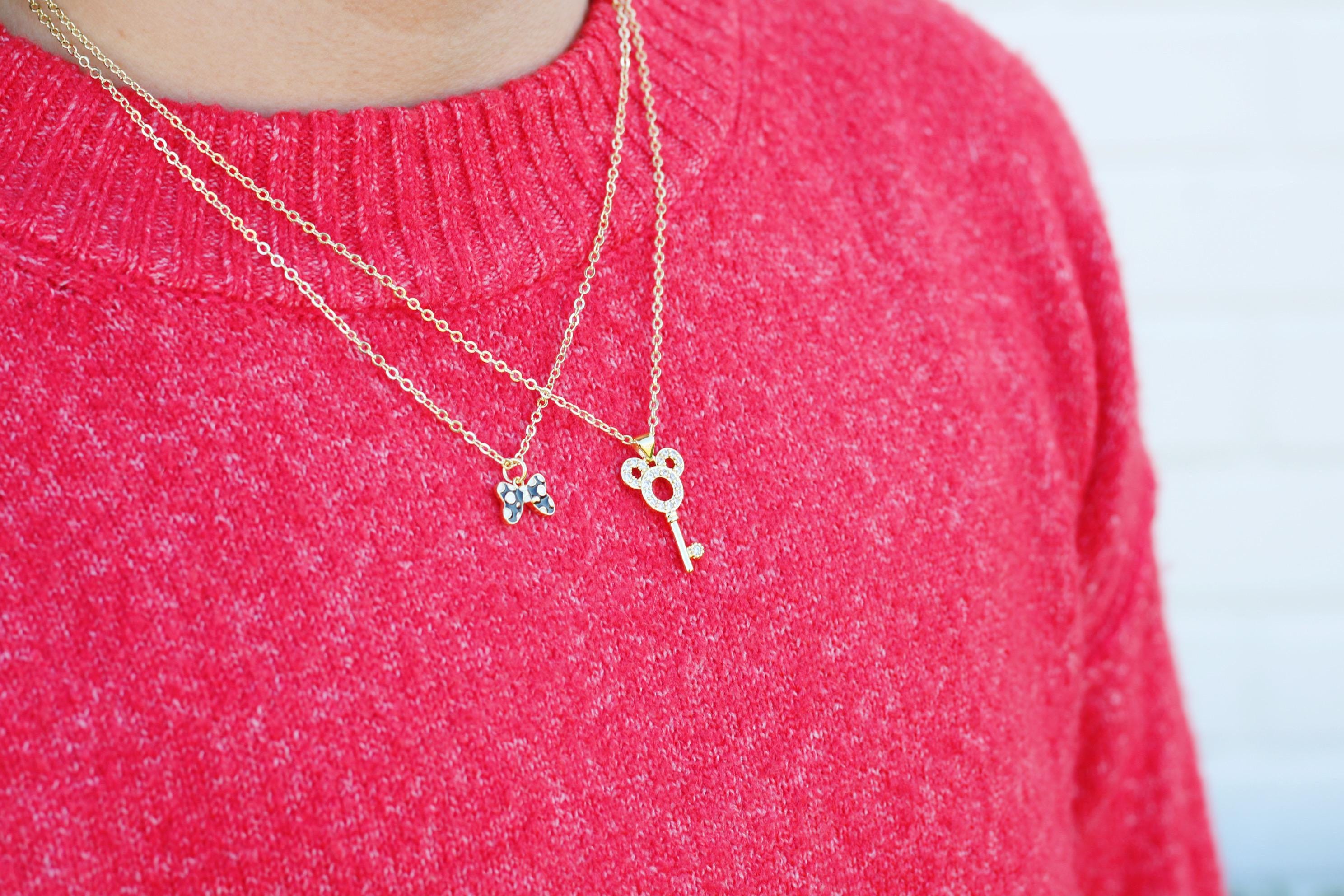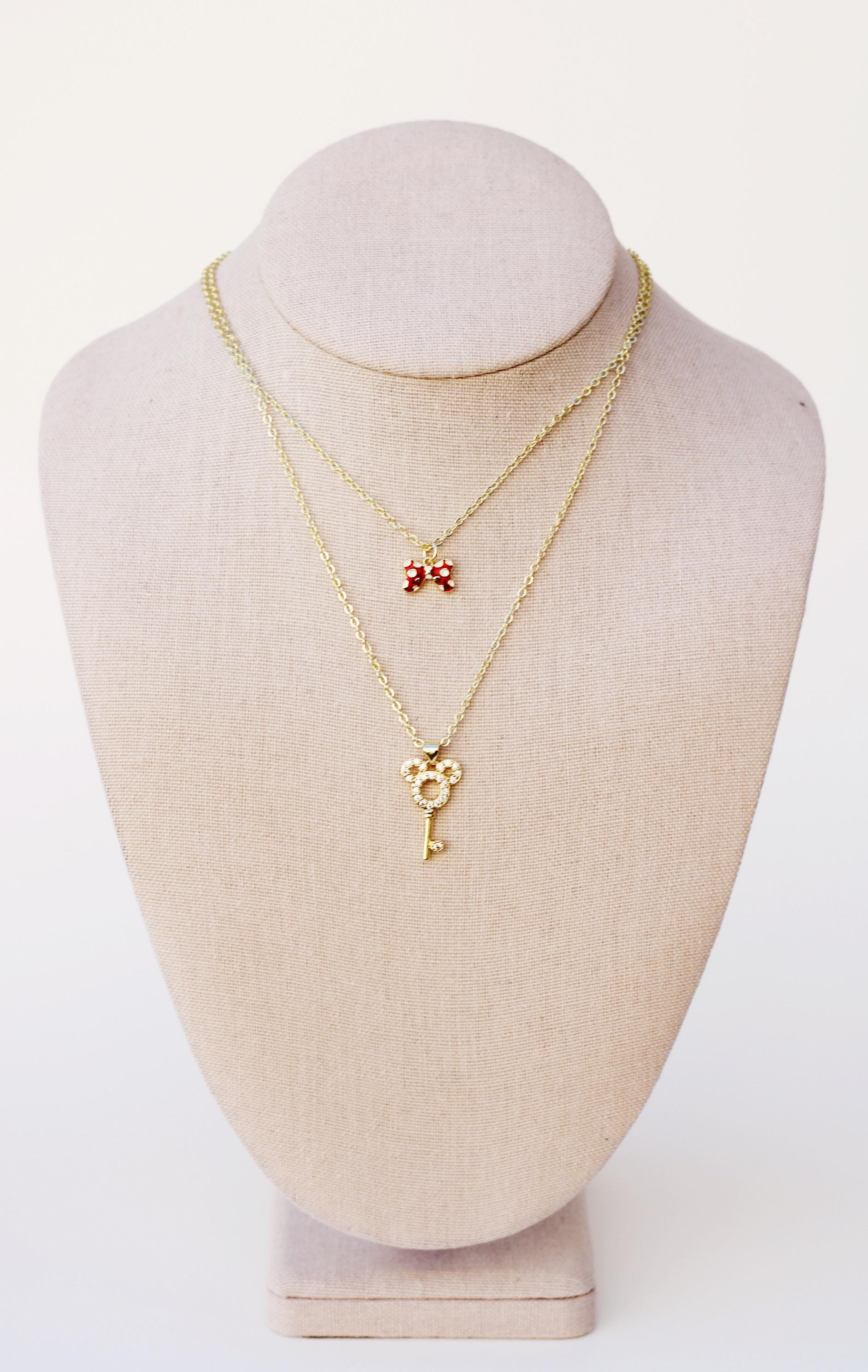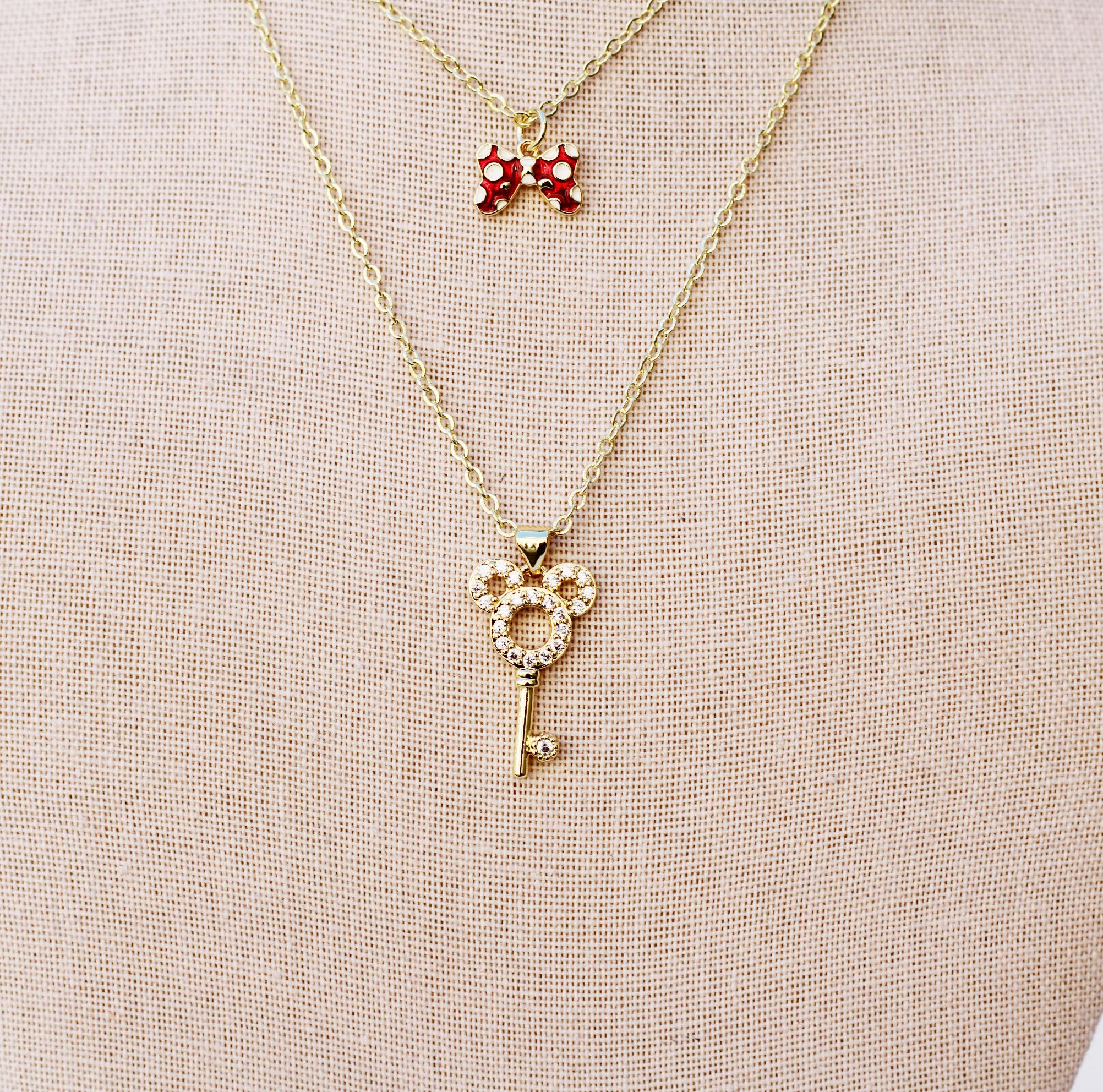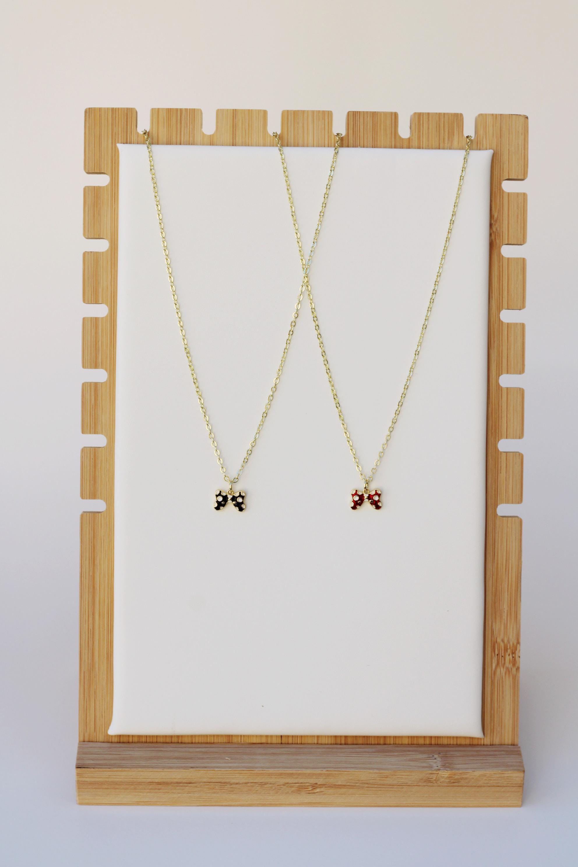 A pretty, dainty charm necklace. A sparkly 14k gold plated necklace chain adorned with a 18k gold plated black or red bow charm. Perfect to add to your jewelry collection or to gift to someone else!
