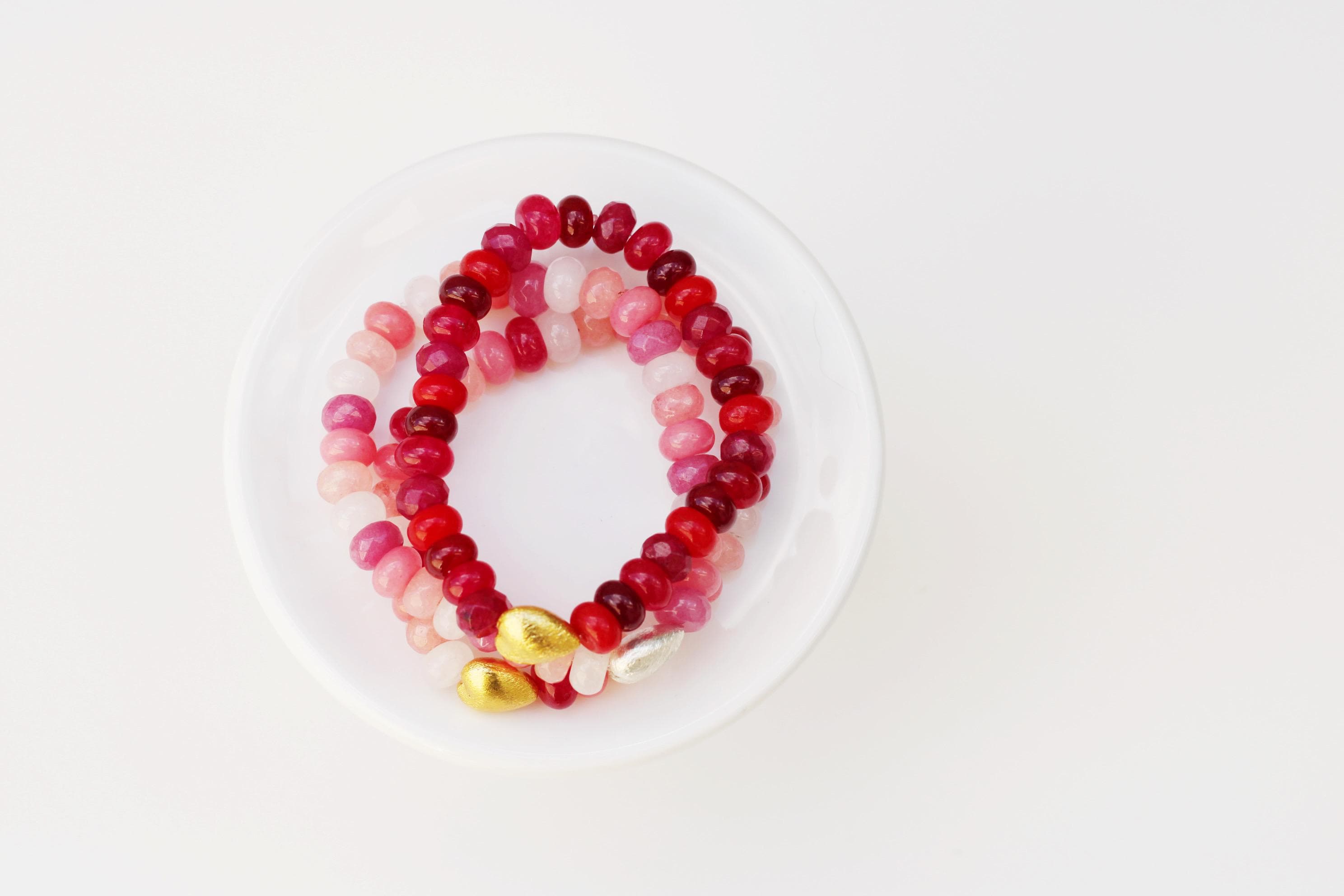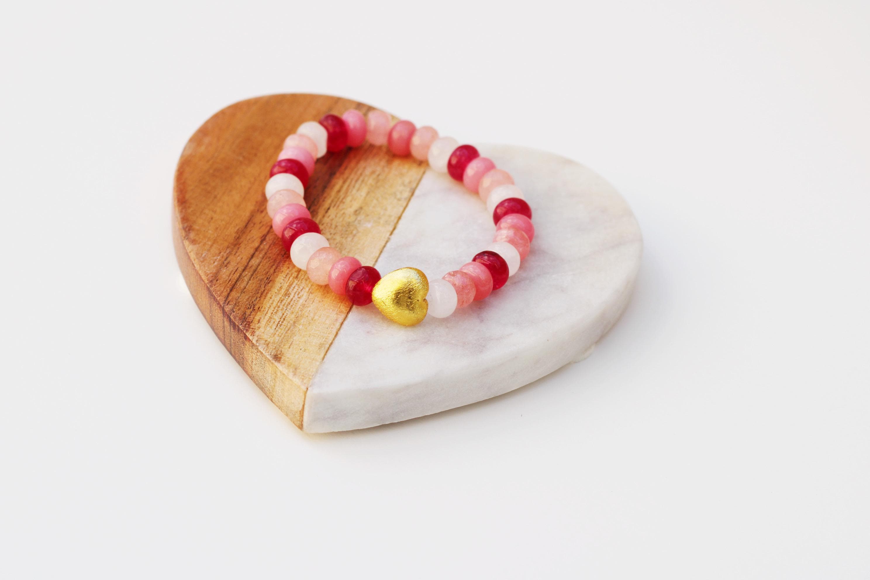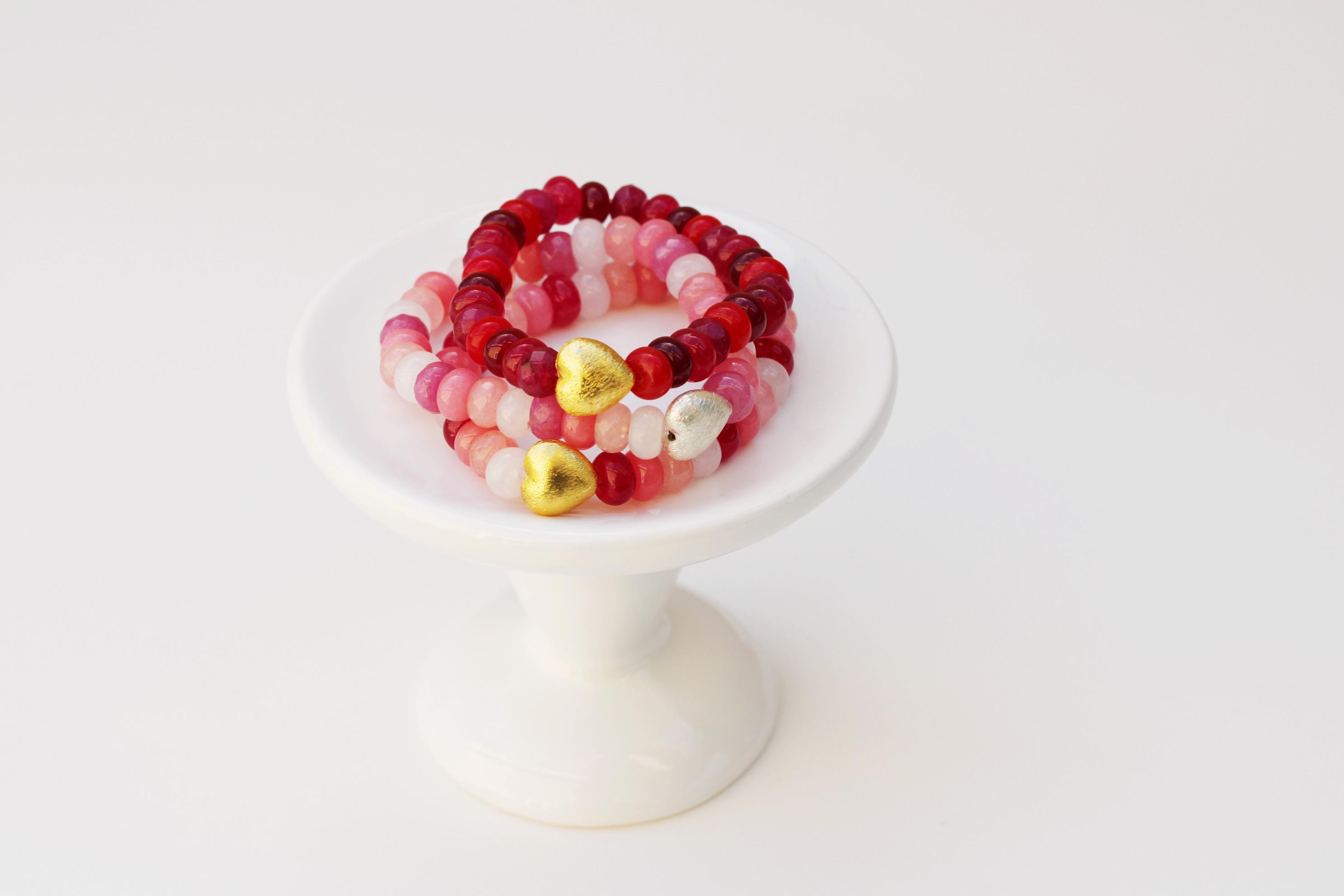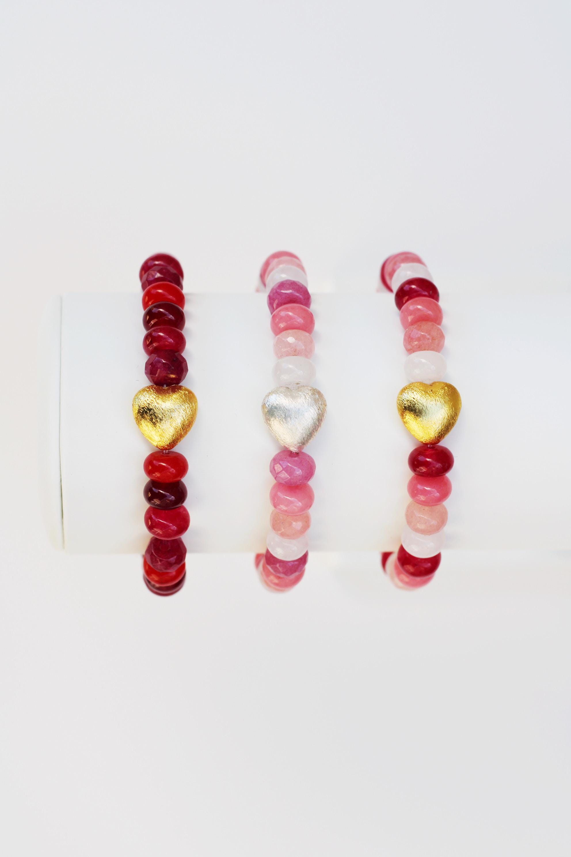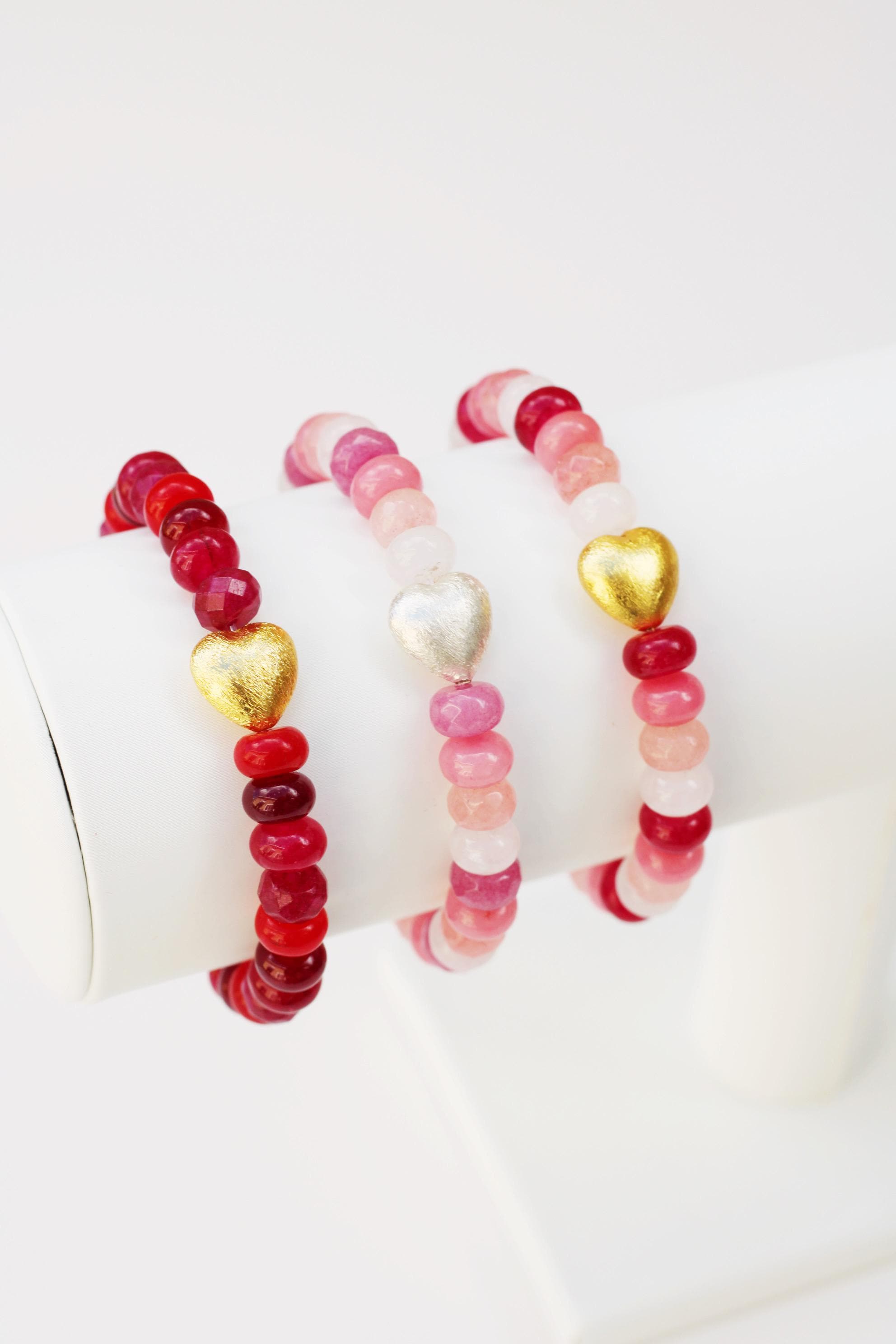 A pretty, lightweight stretch bracelet. Uniquely crafted with colored jade rondelle beads and accented with a brushed gold or silver heart.