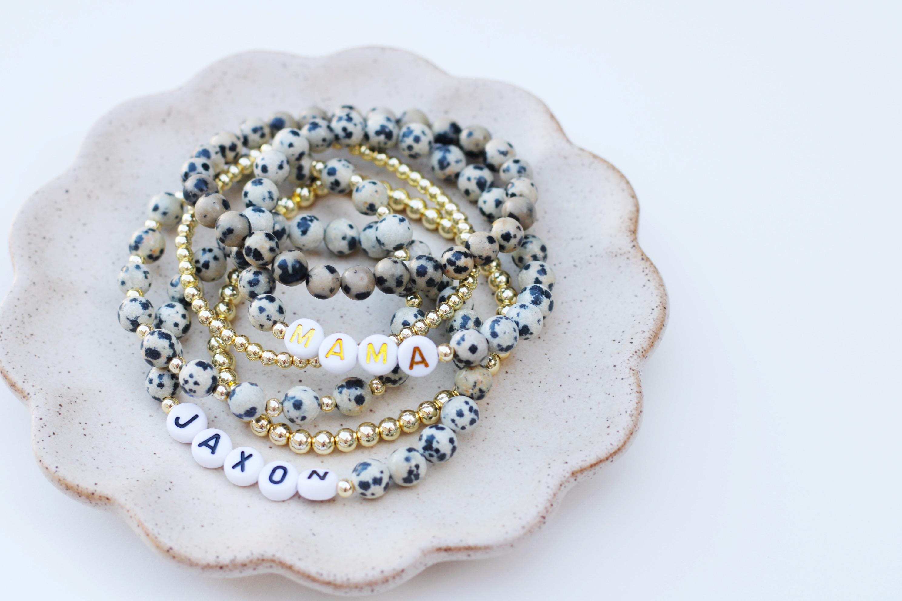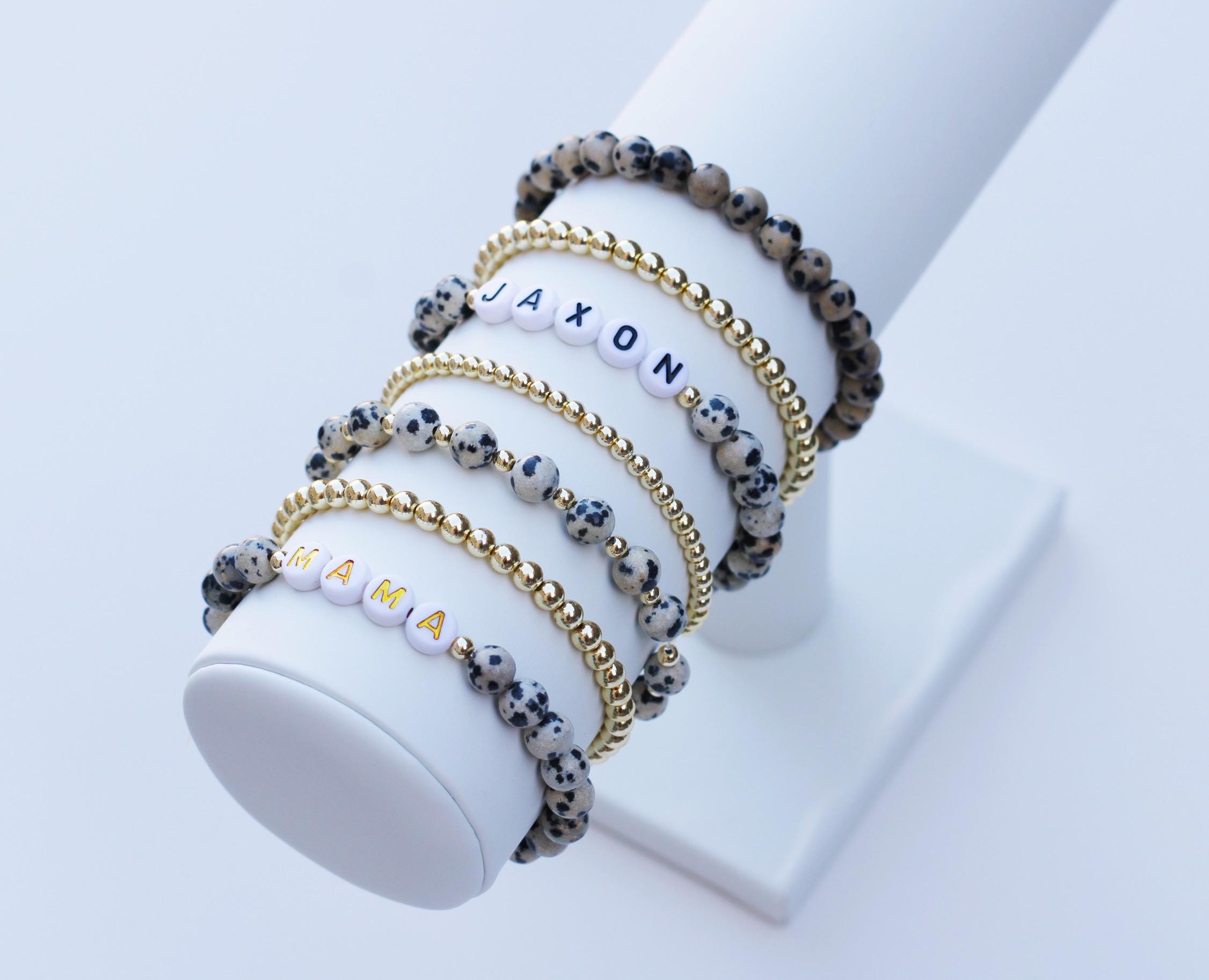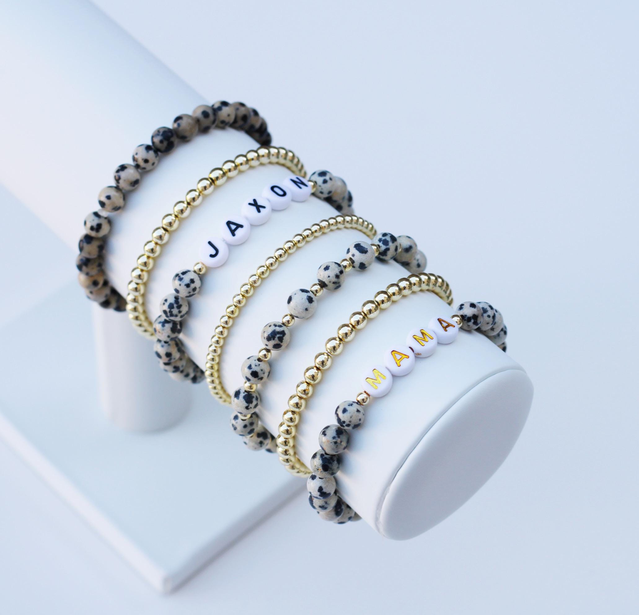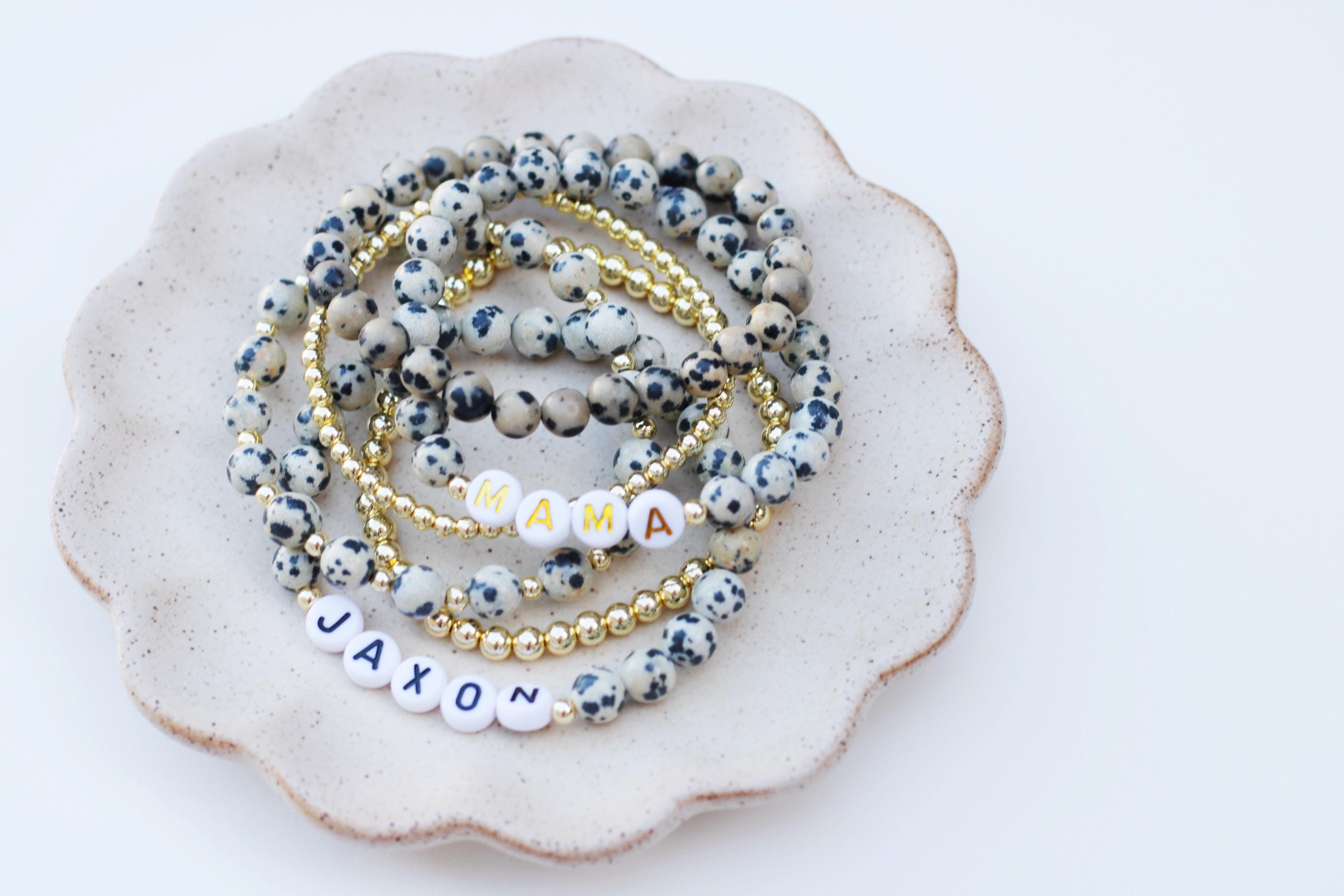 This listing is for ONE bracelet in the style of your choice - there are 6 to choose from. The bracelets are made from 6mm dalmatian jasper beads, and 3/4mm gold beads and strung on durable stretch cord.