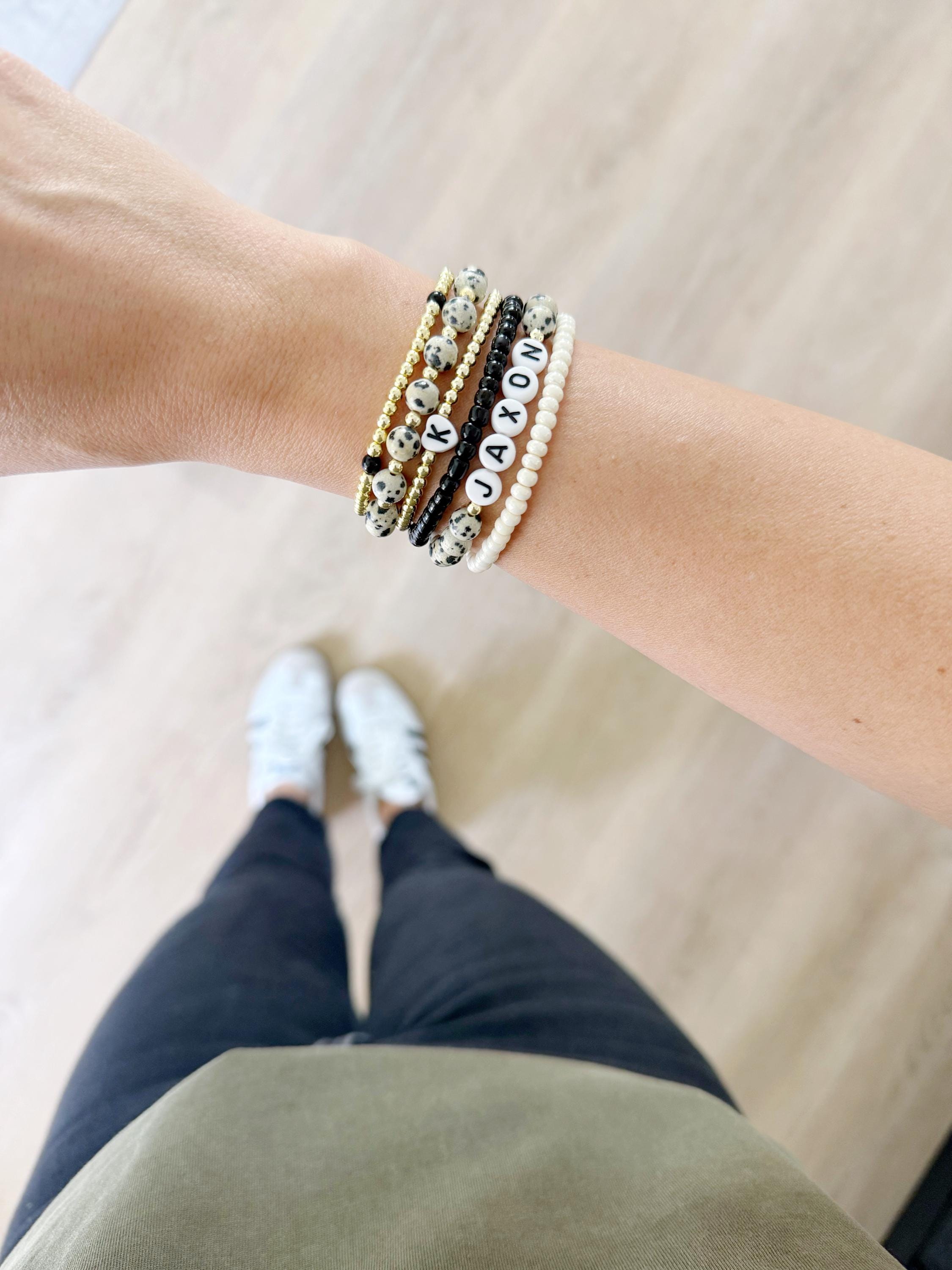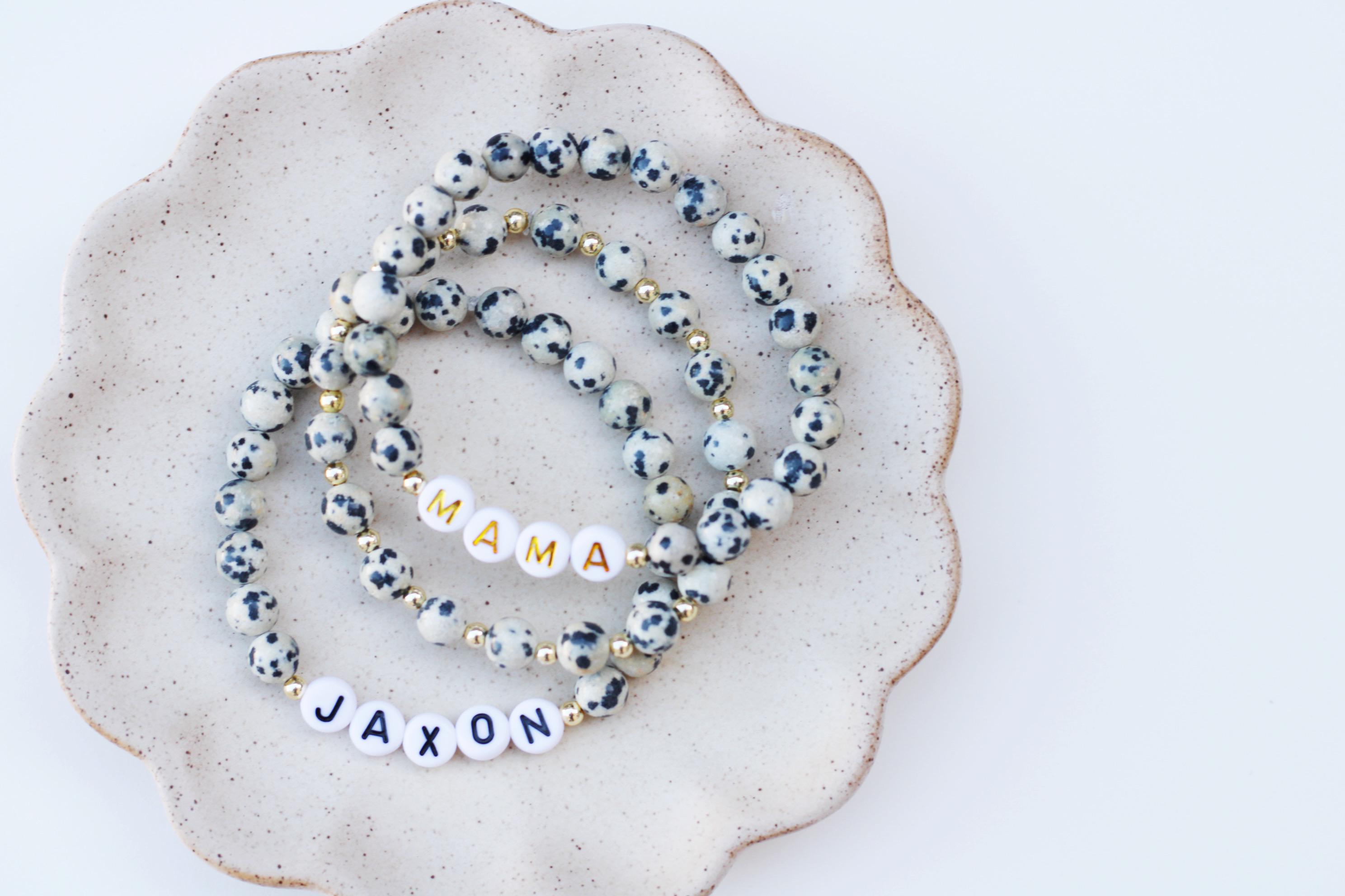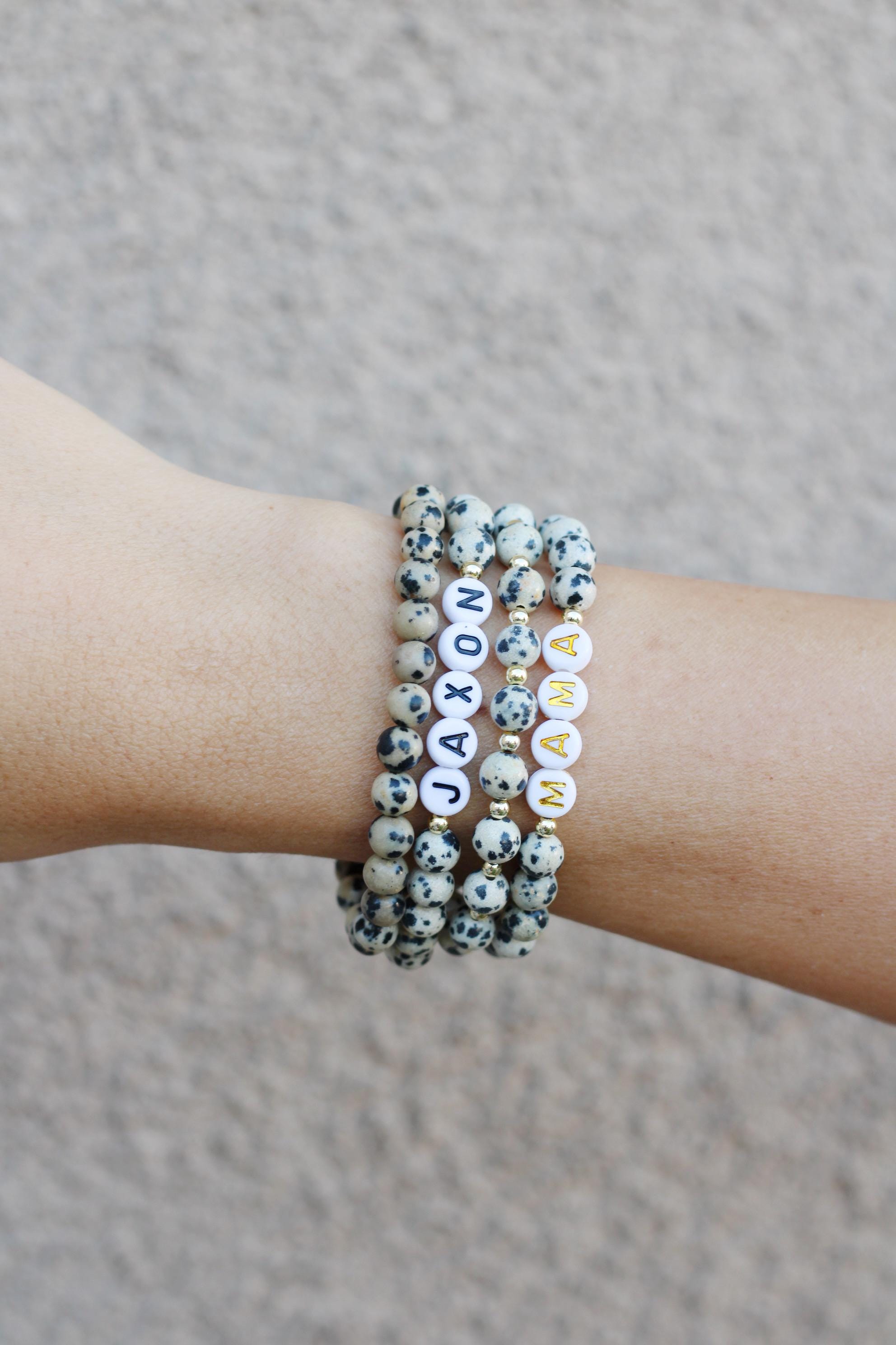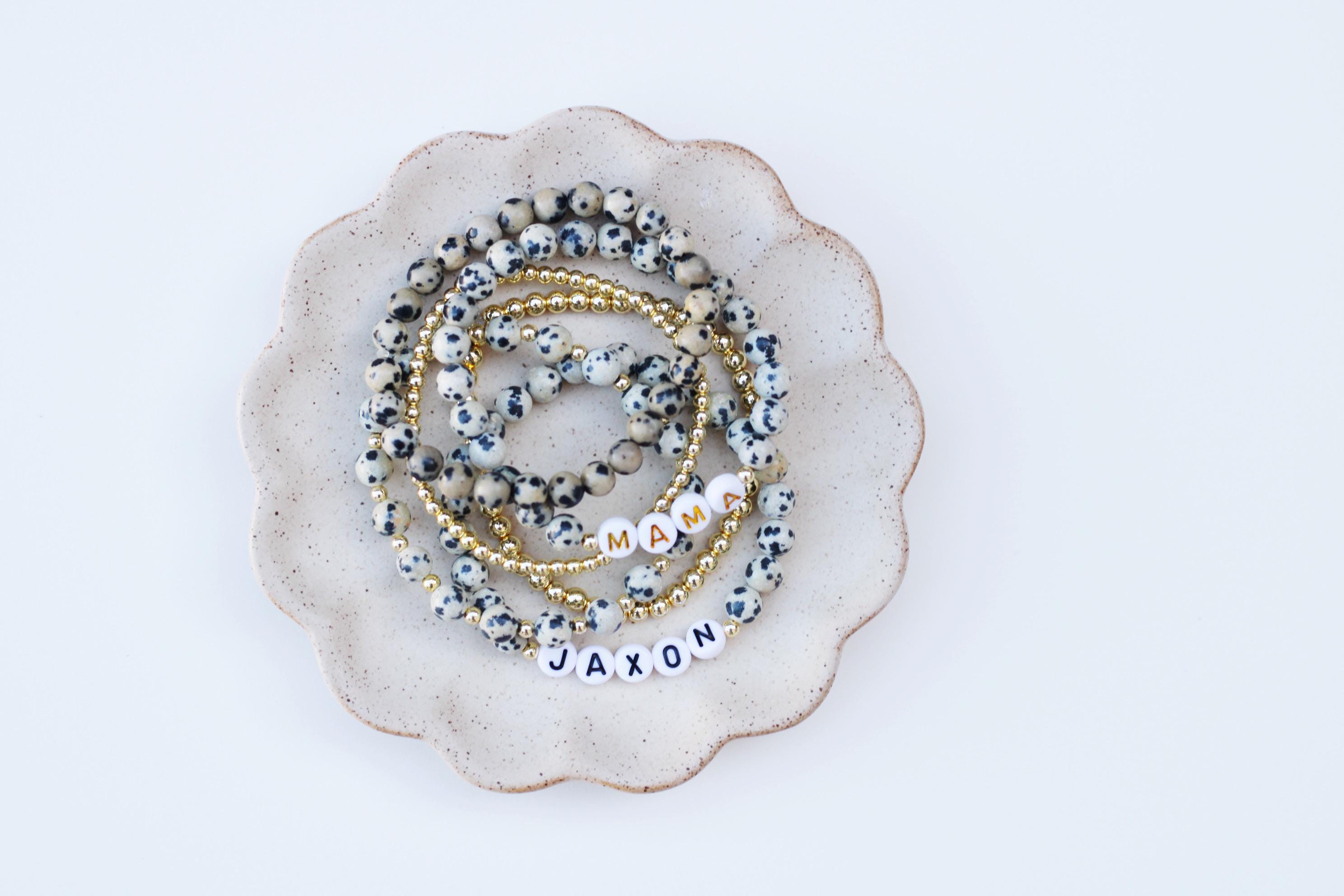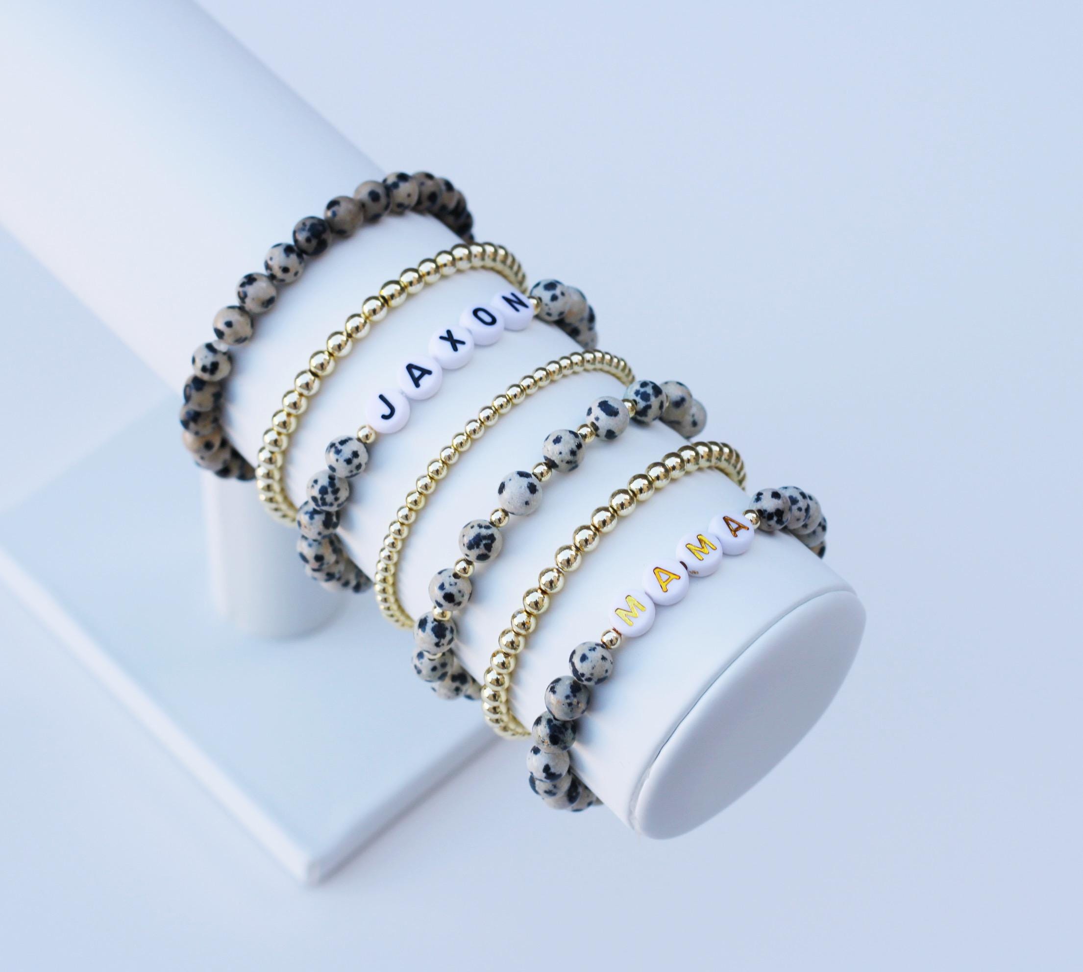 This listing is for ONE bracelet in the style of your choice - there are 6 to choose from. The bracelets are made from 6mm dalmatian jasper beads, and 3/4mm gold beads and strung on durable stretch cord.