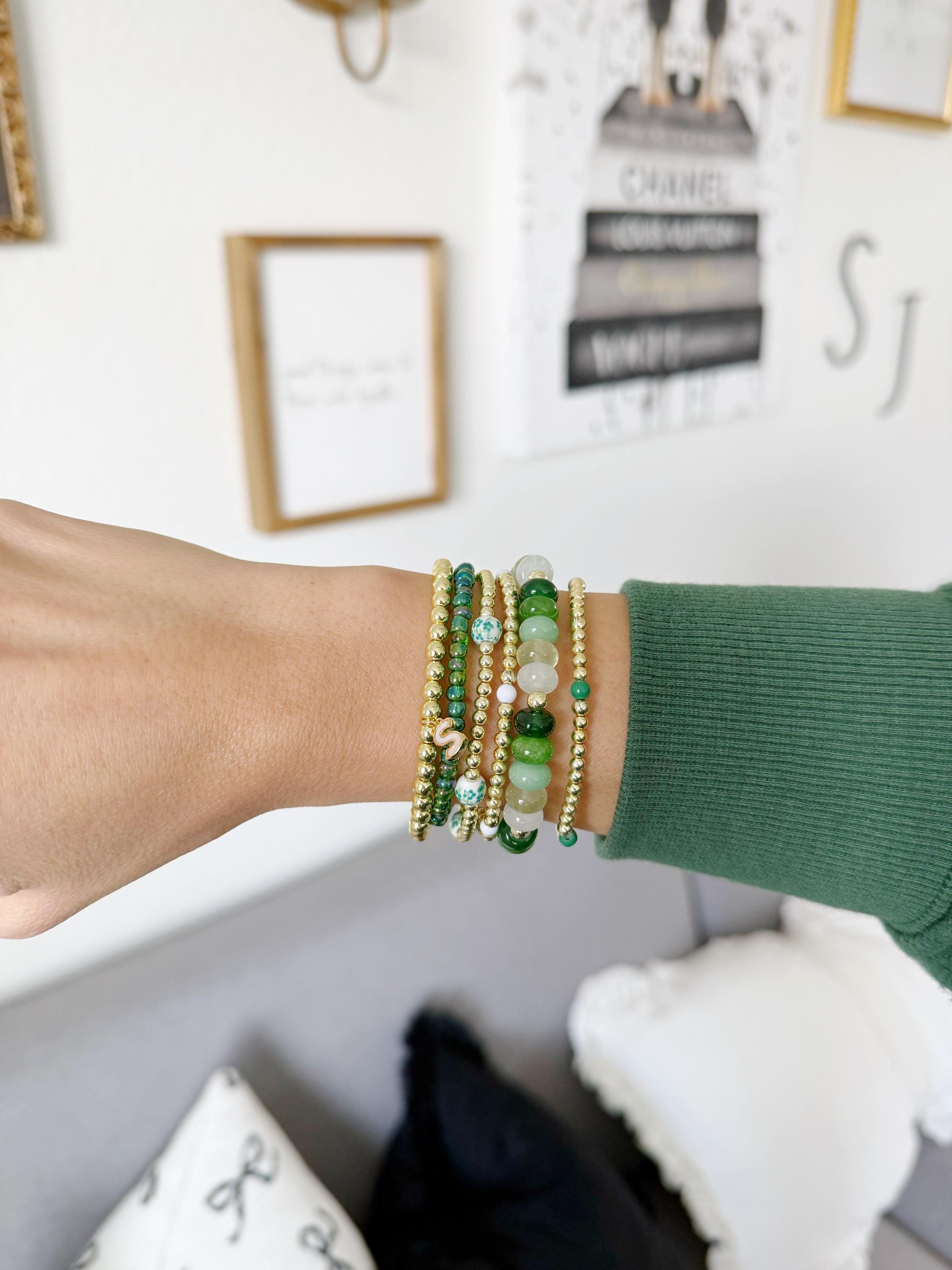 A cool, lightweight stretch bracelet. Uniquely crafted with 4mm gold, silver or rose gold beads and accented with colored jade rondelle beads.
