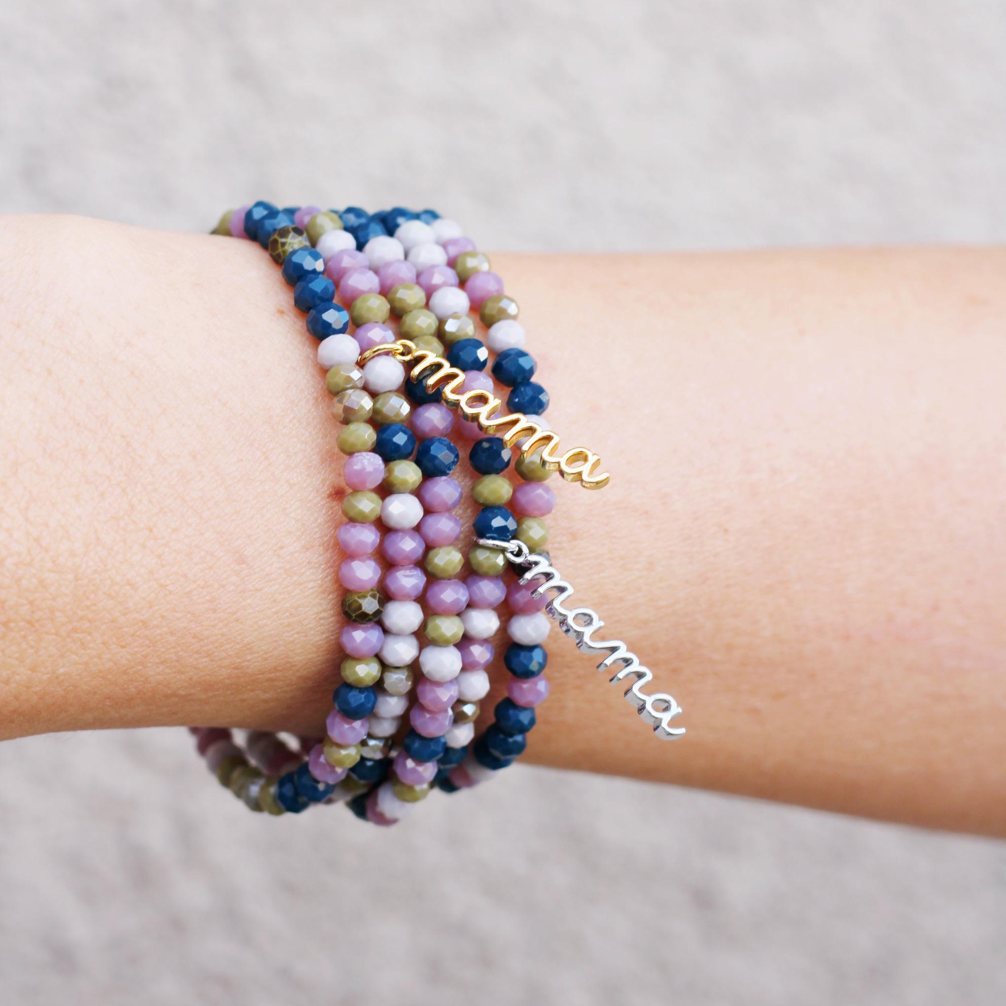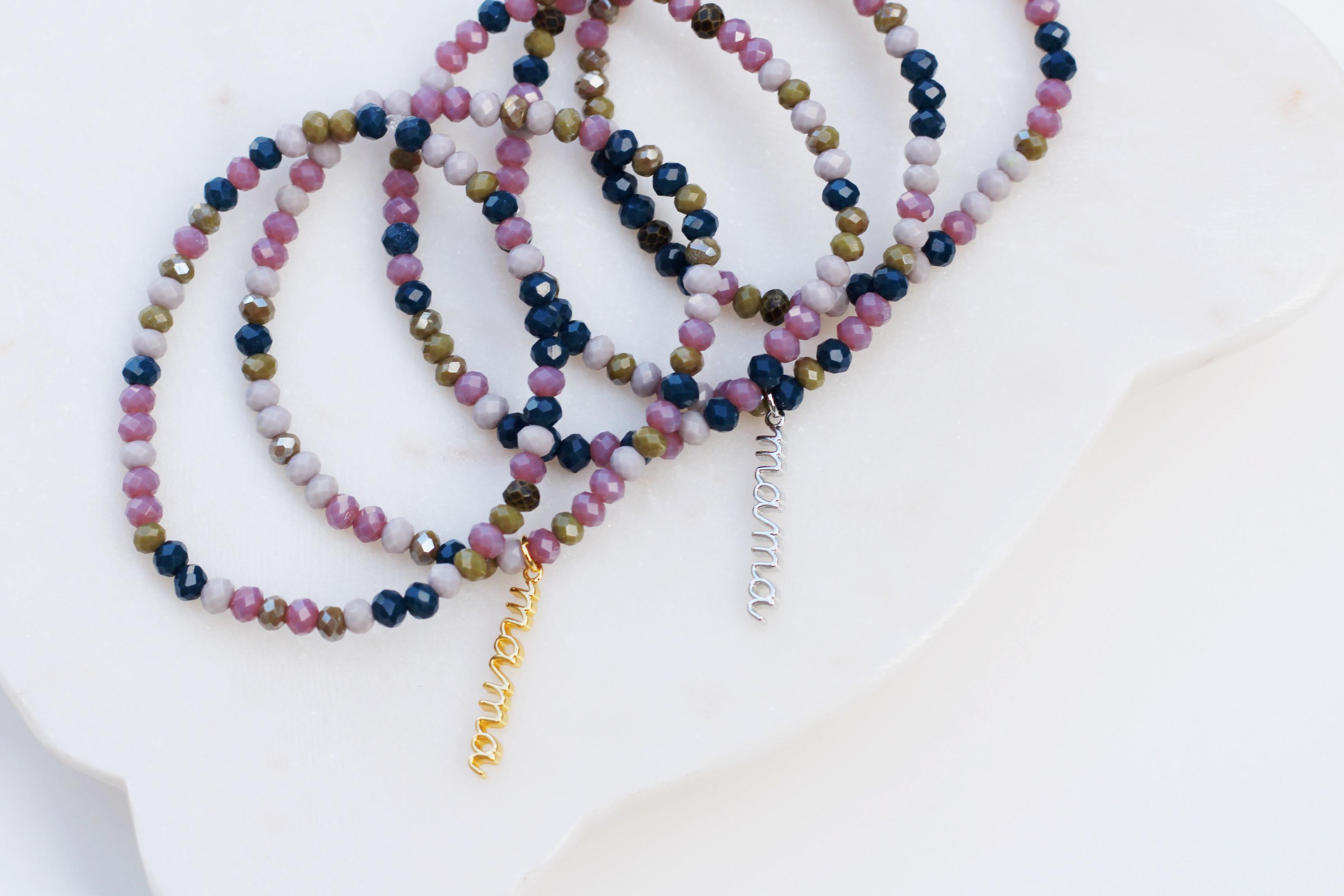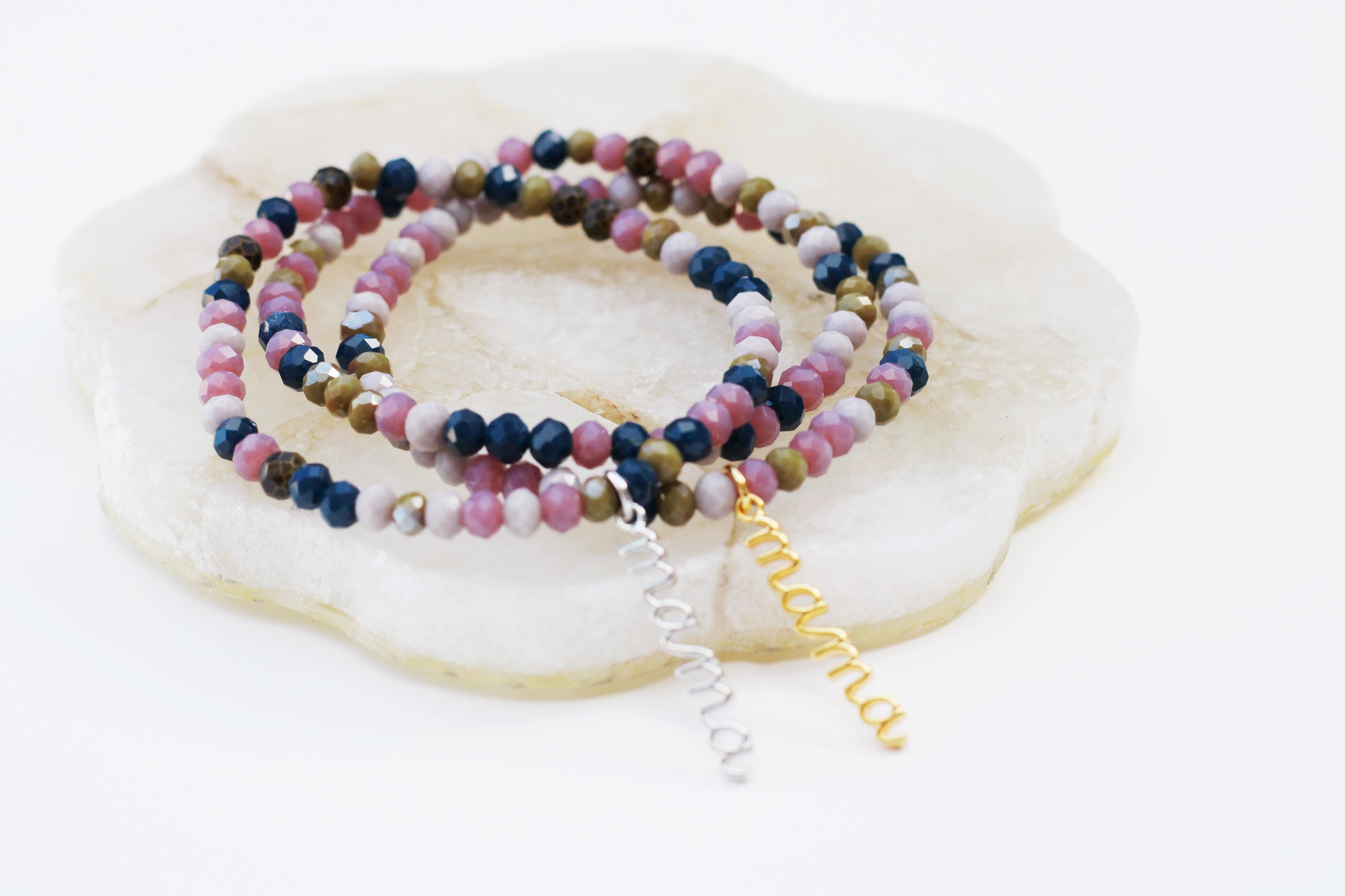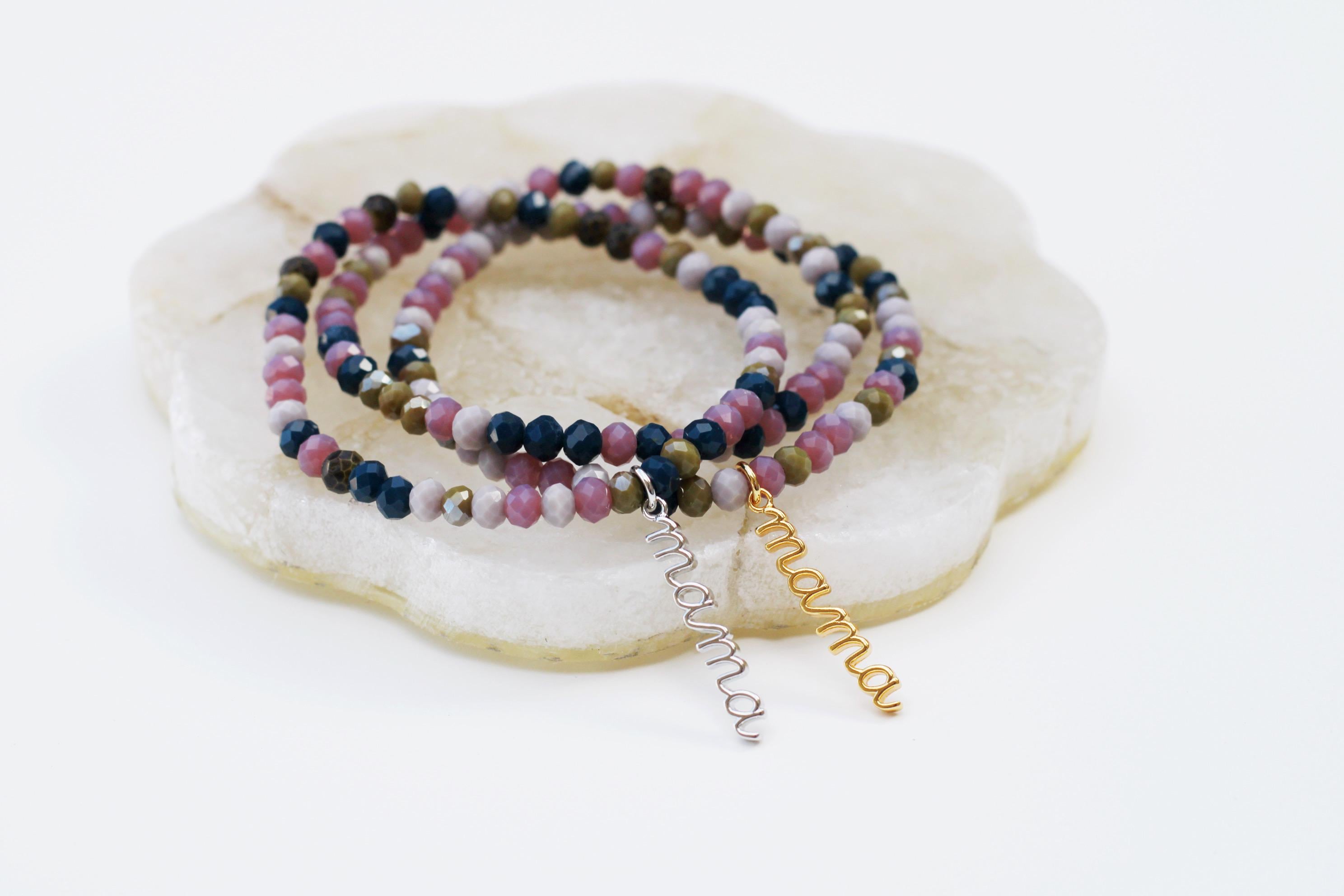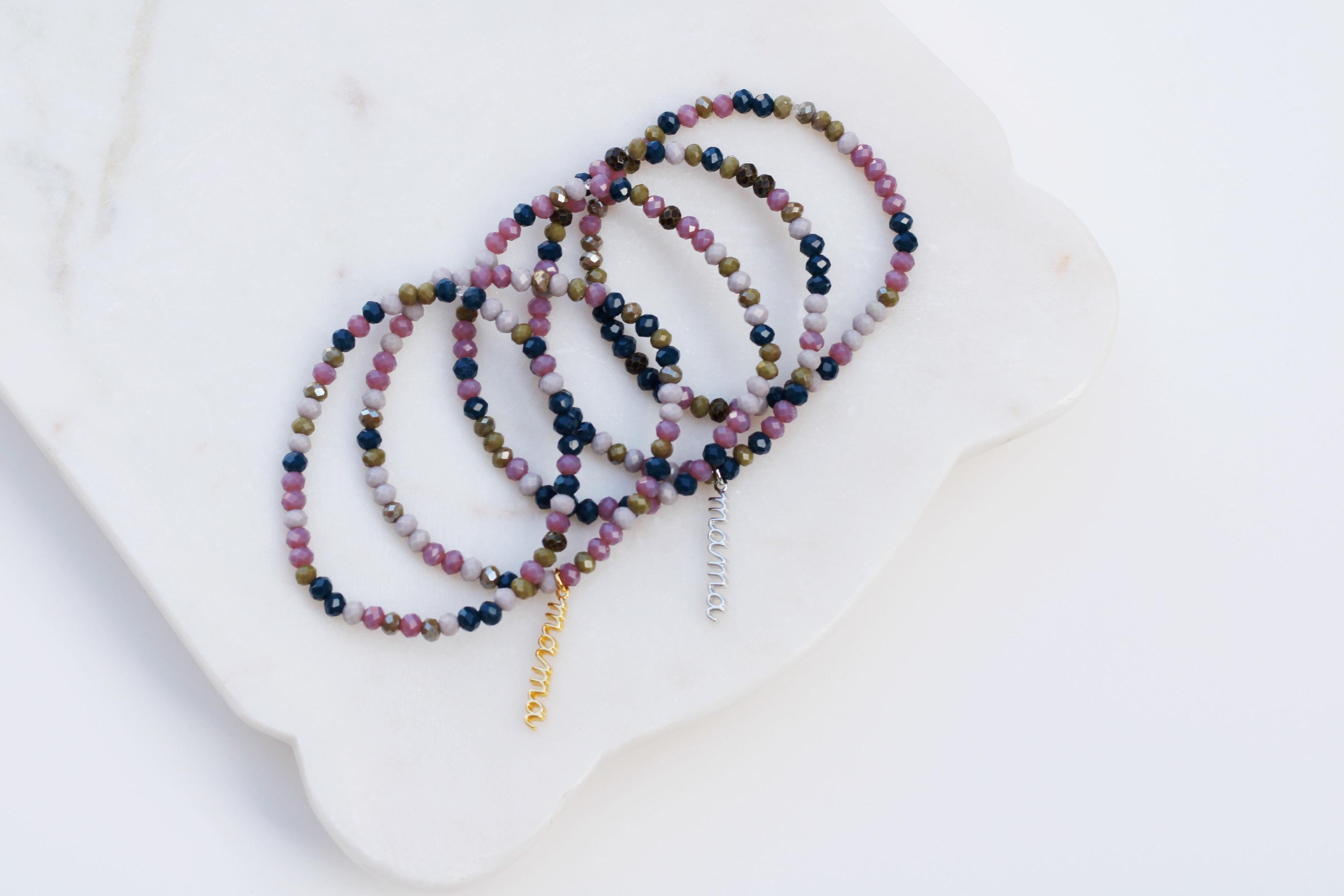 A pretty, lightweight stretch bracelet. Uniquely crafted with Crystal rondelle beads and accented with an 14k gold or rhodium plated mama charm. Also available plain!