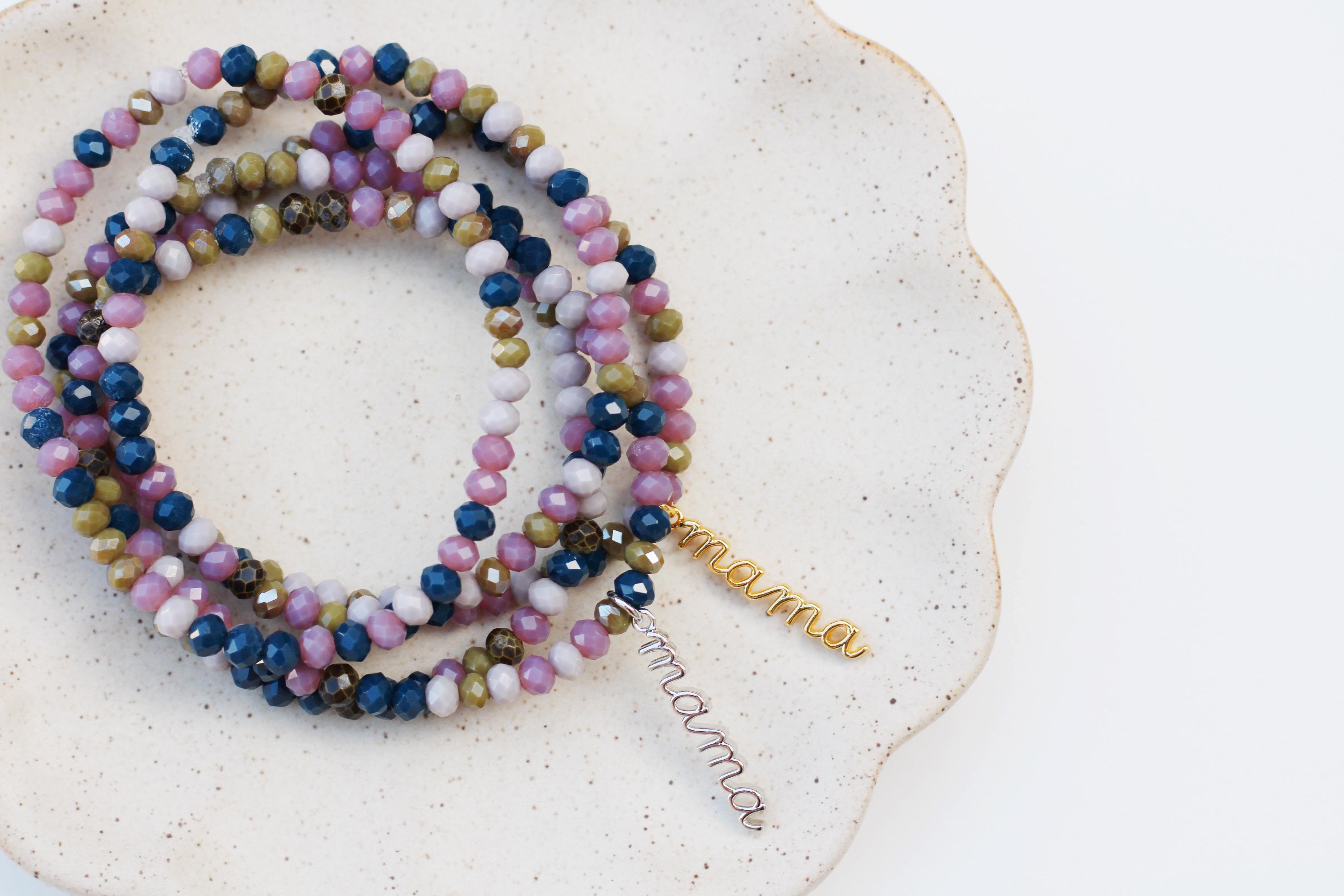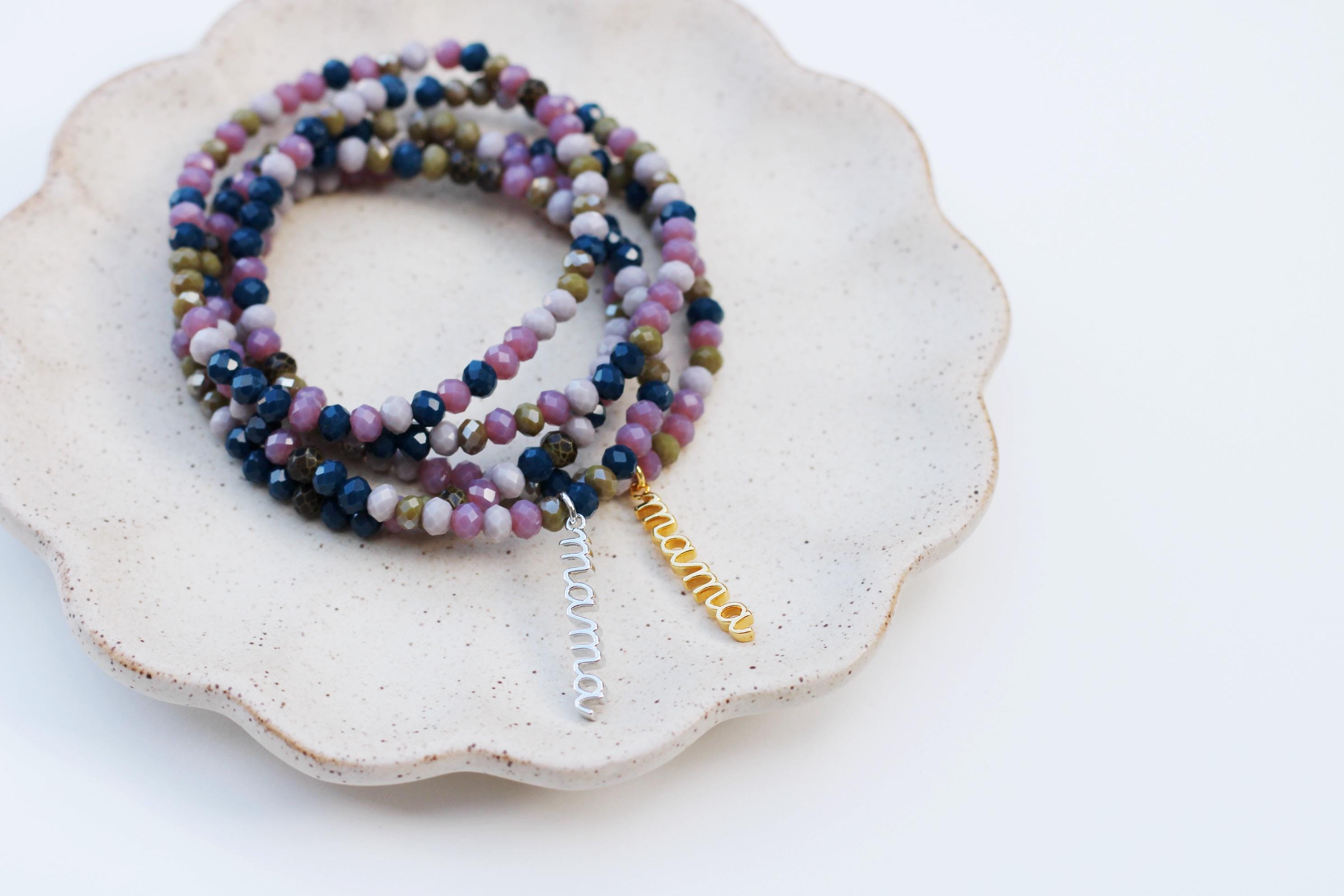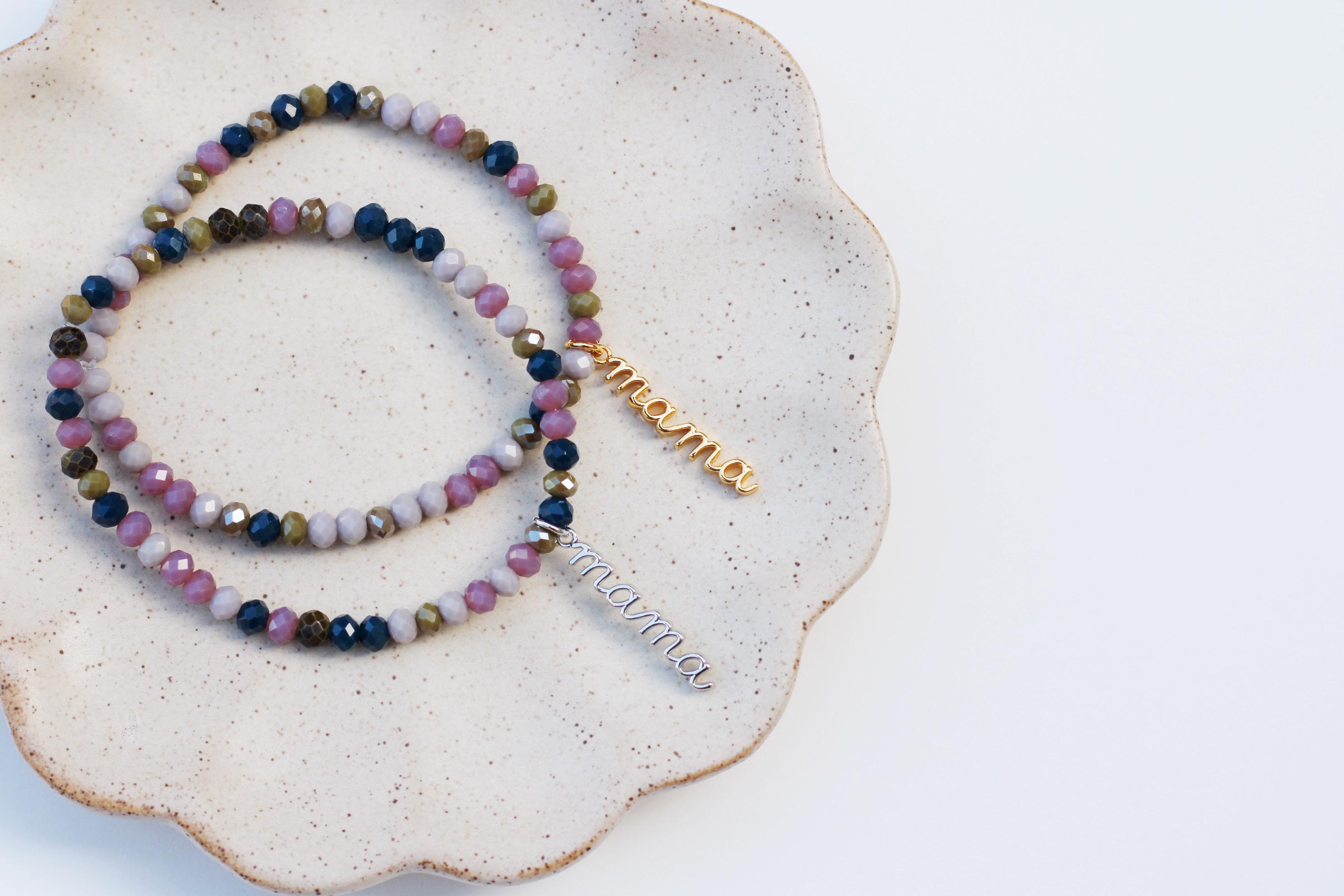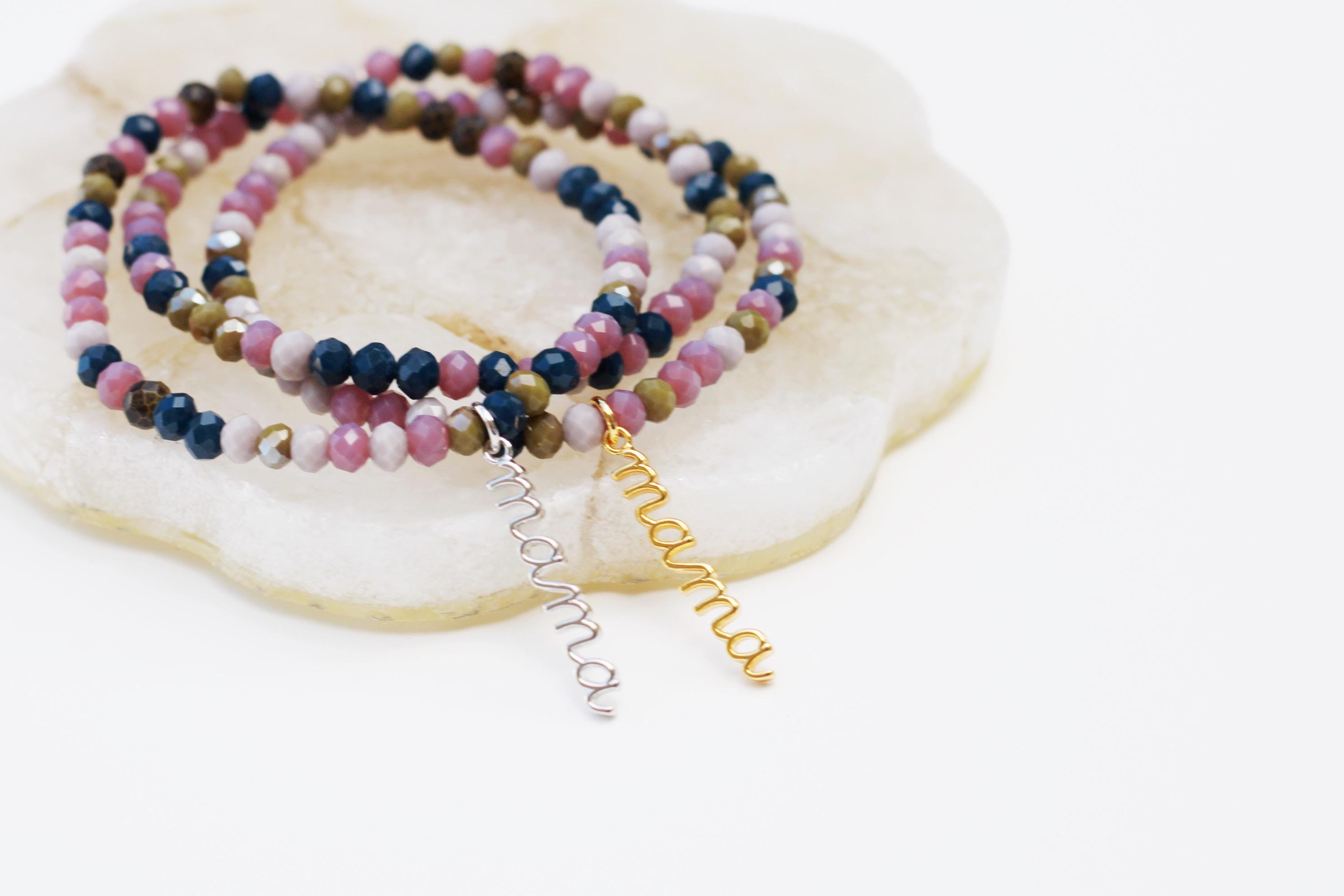 A pretty, lightweight stretch bracelet. Uniquely crafted with Crystal rondelle beads and accented with an 14k gold or rhodium plated mama charm. Also available plain!