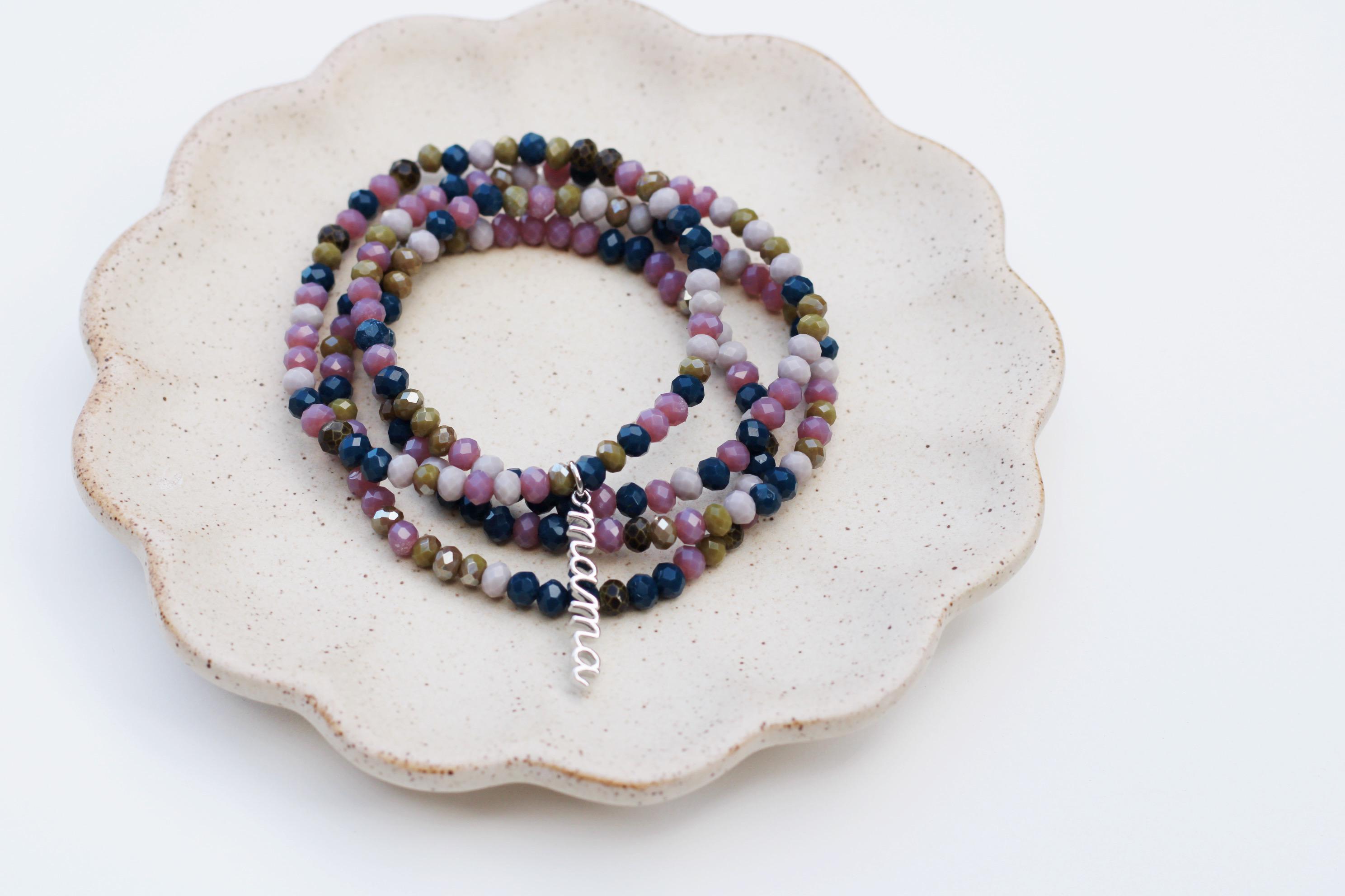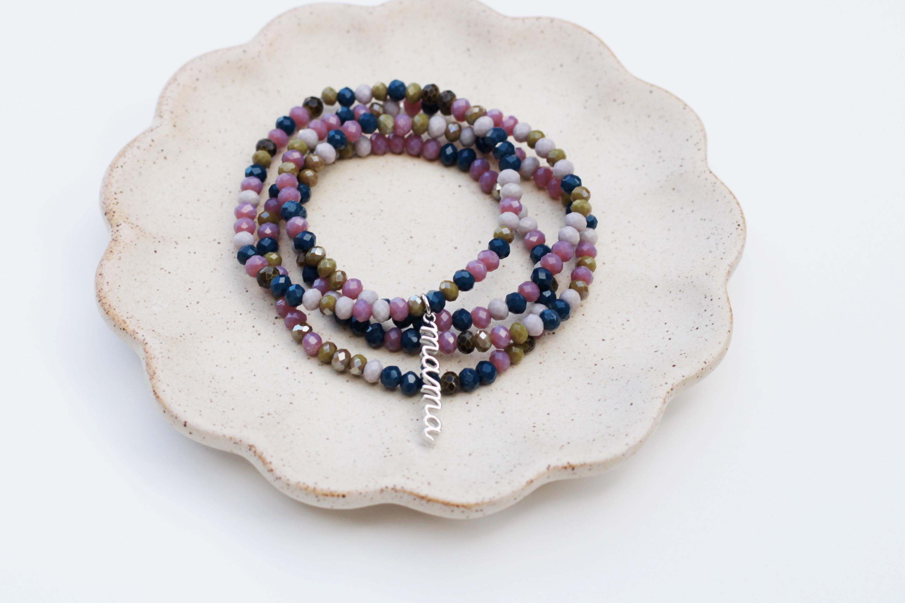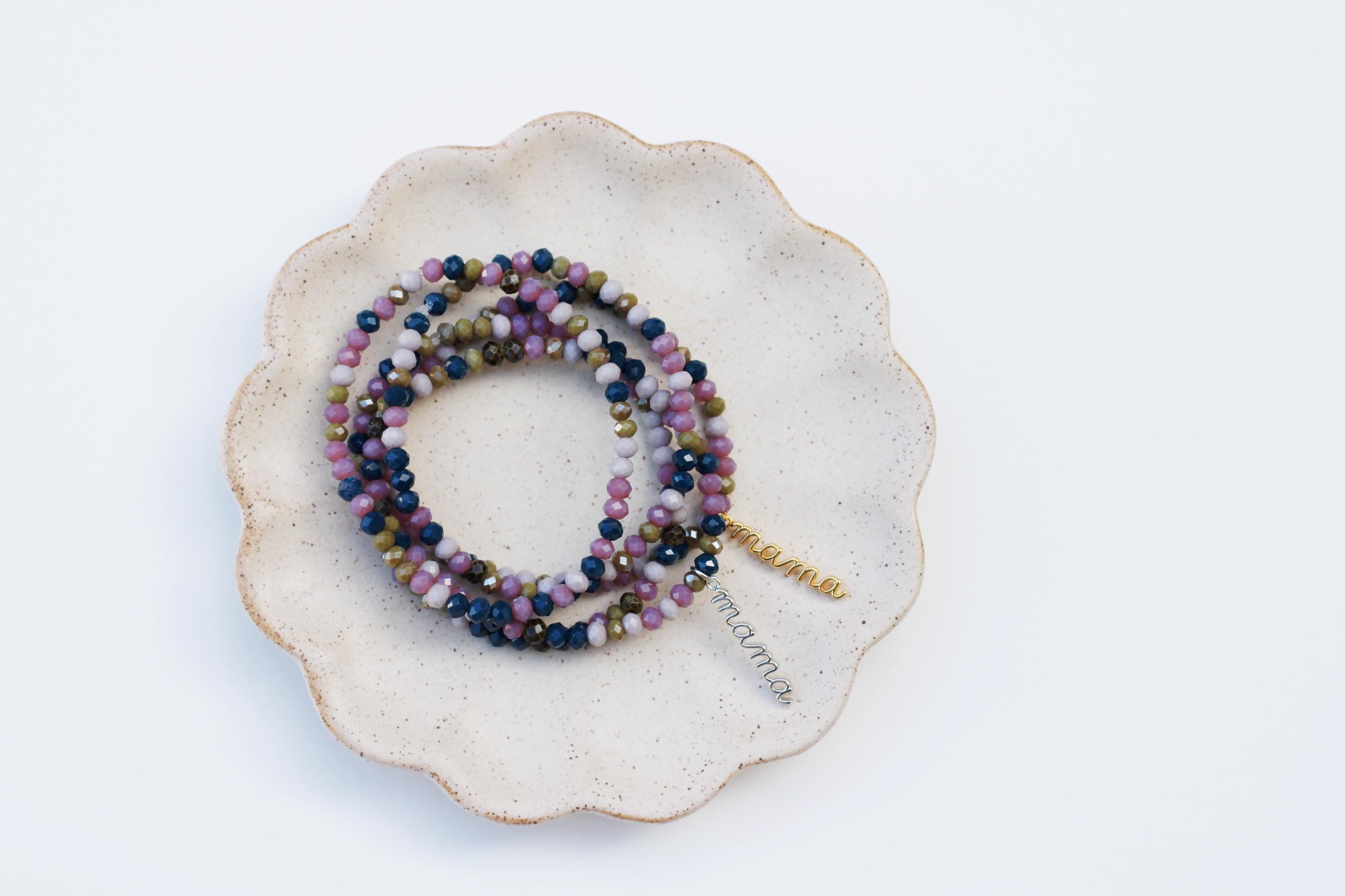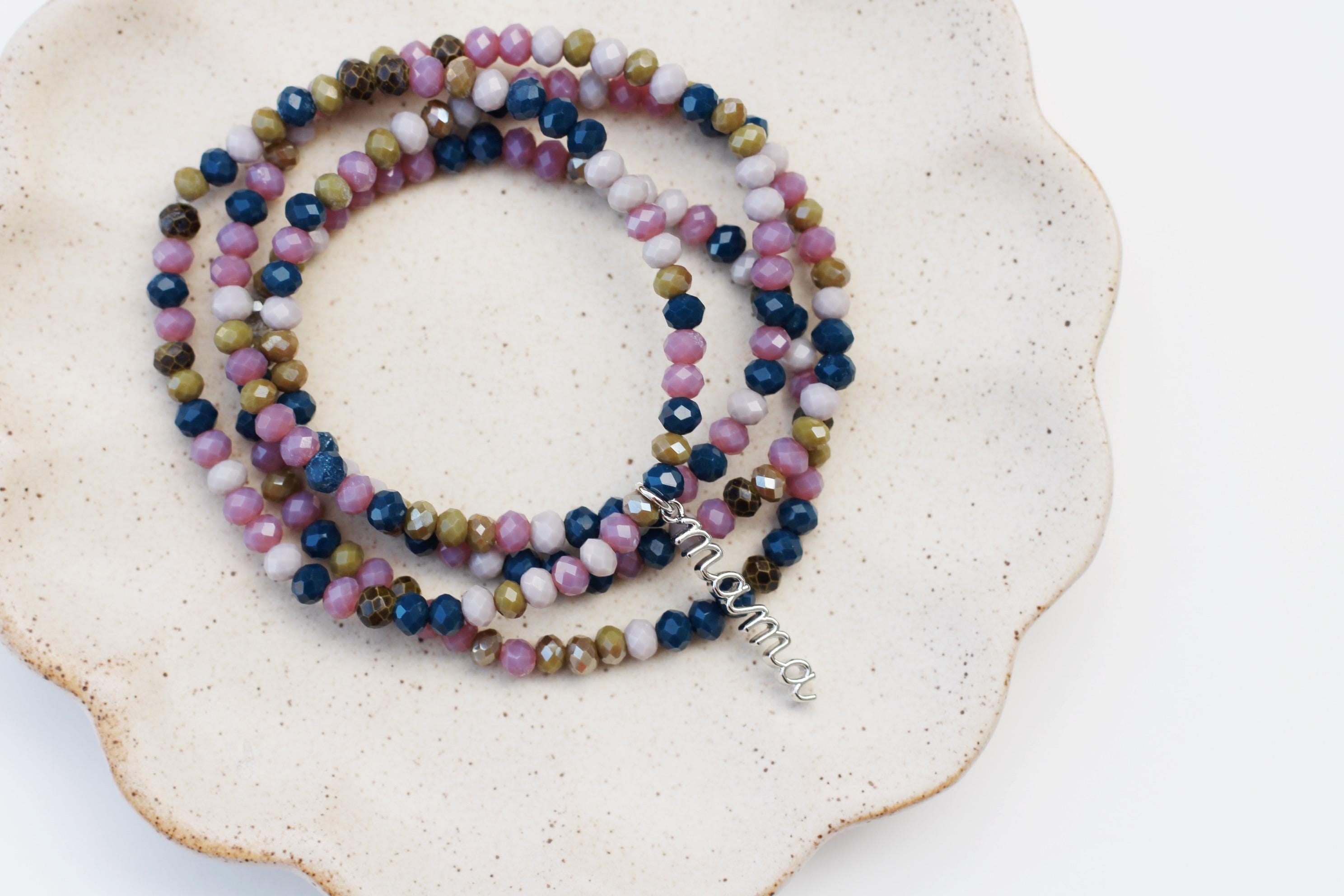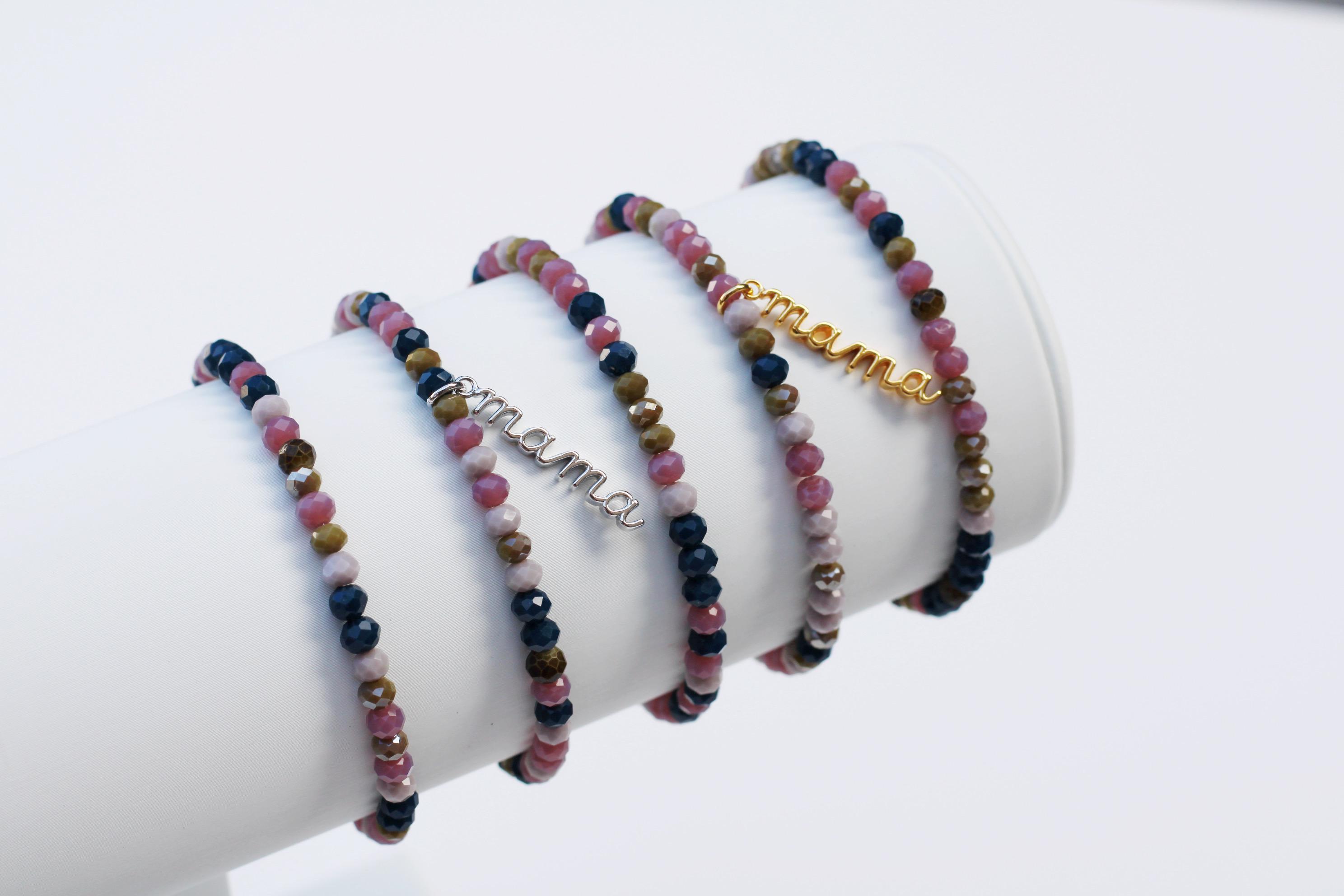A pretty, lightweight stretch bracelet. Uniquely crafted with Crystal rondelle beads and accented with an 14k gold or rhodium plated mama charm. Also available plain!