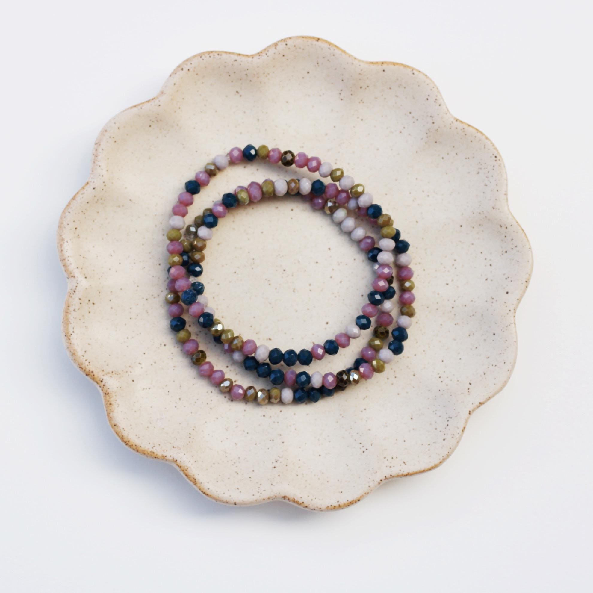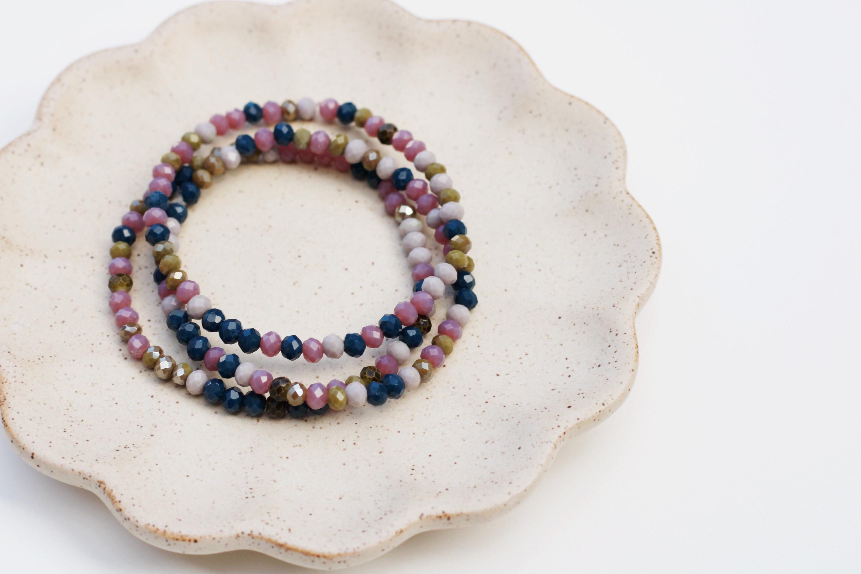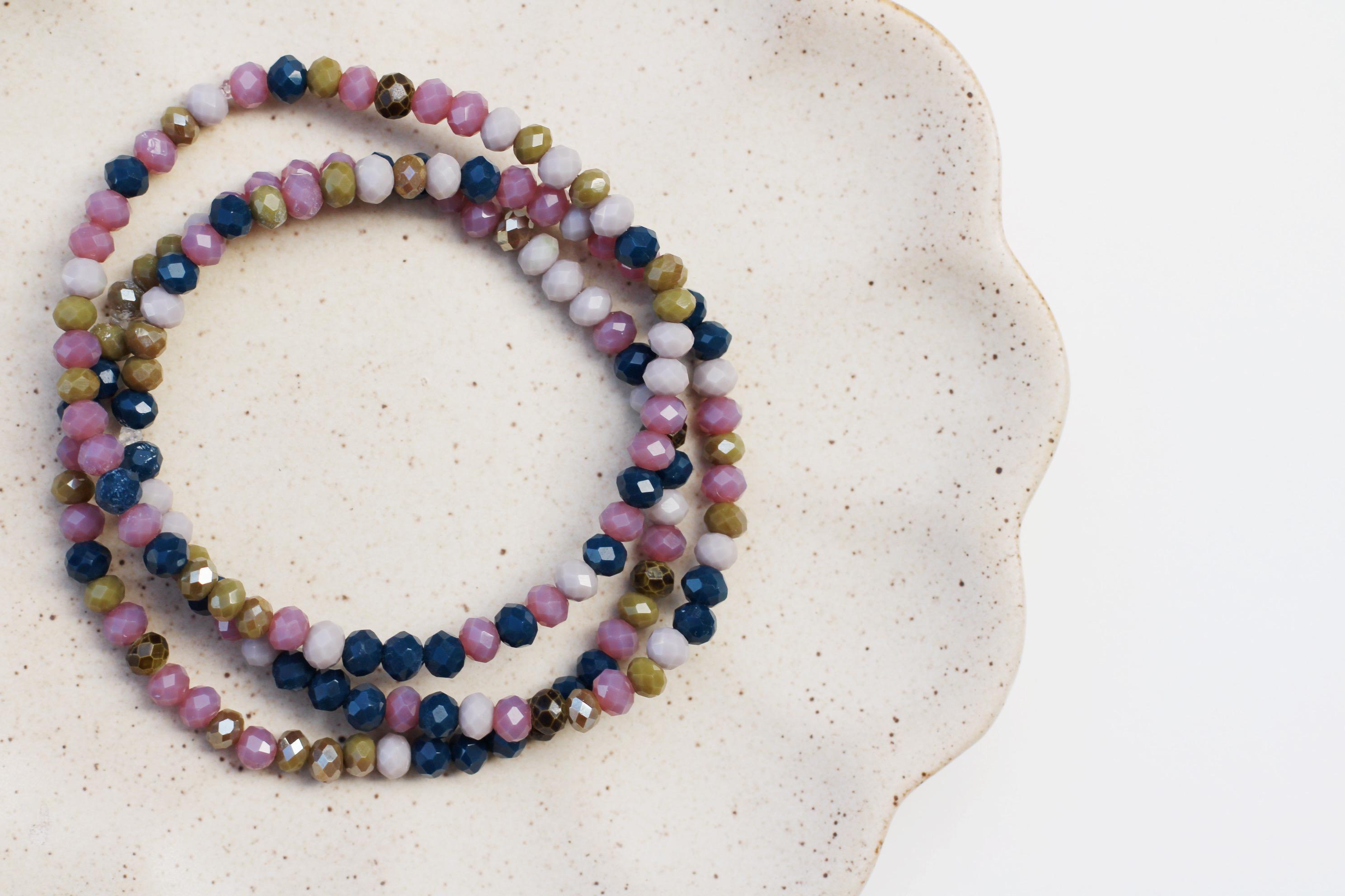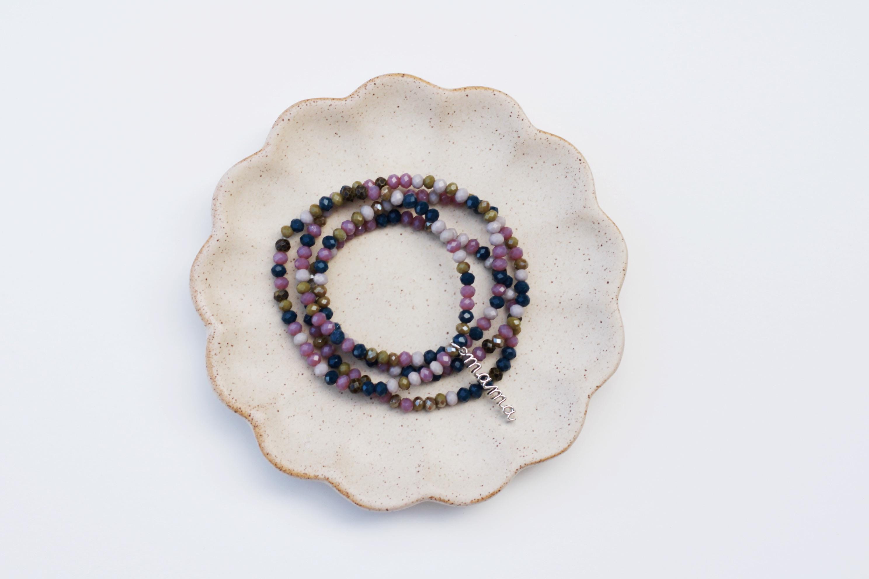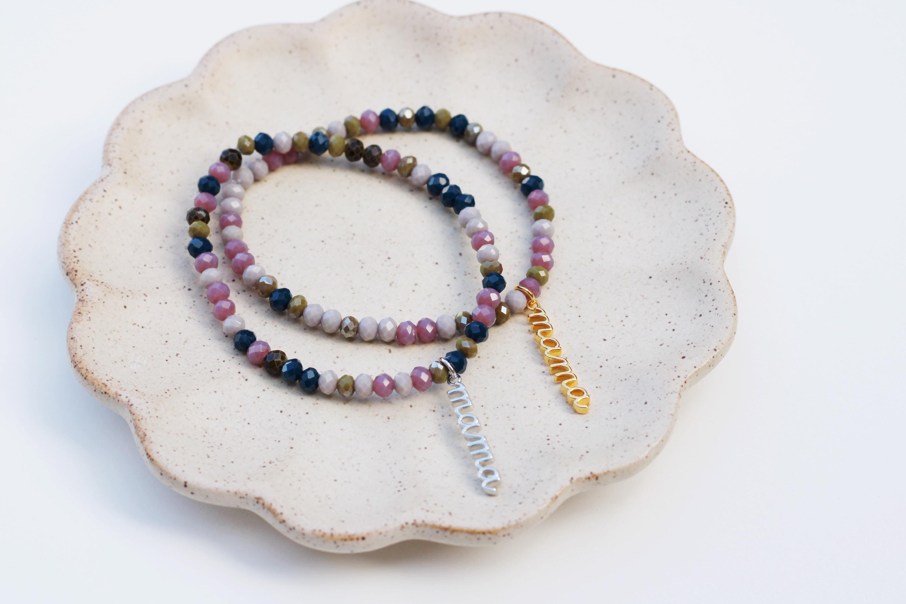 A pretty, lightweight stretch bracelet. Uniquely crafted with Crystal rondelle beads and accented with an 14k gold or rhodium plated mama charm. Also available plain!