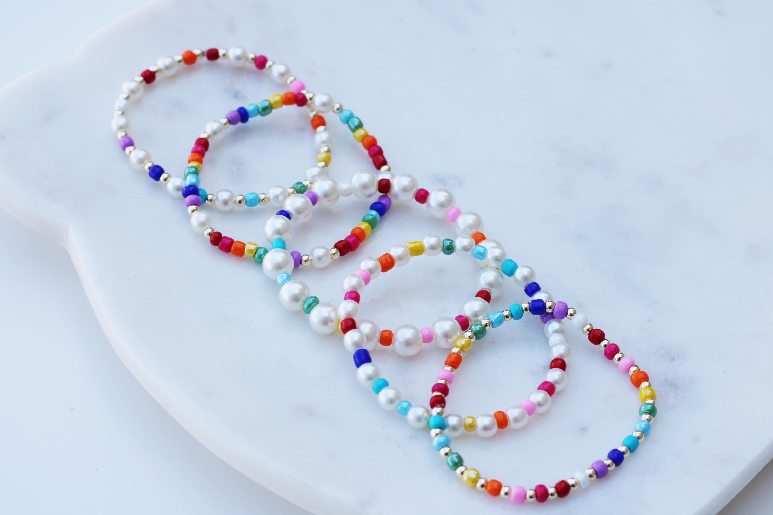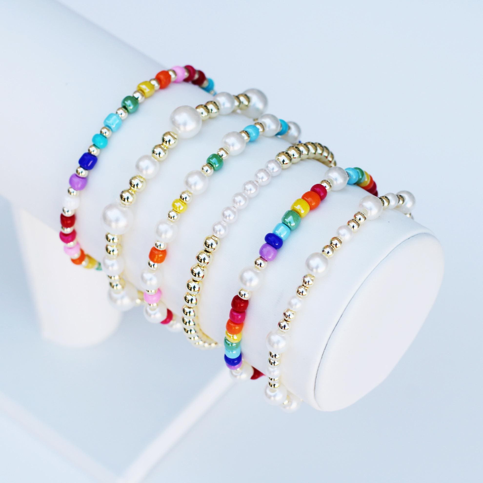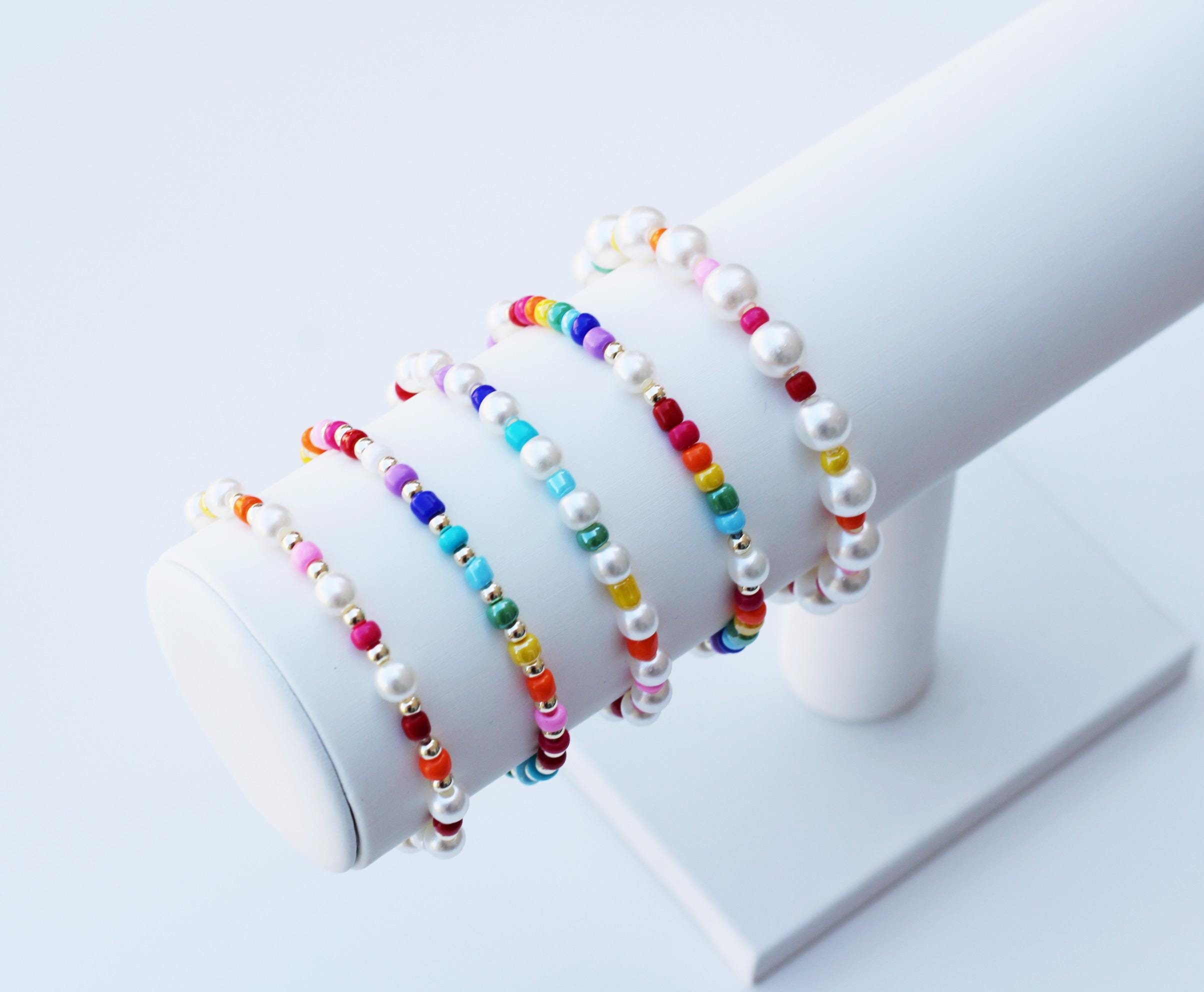 A pretty, lightweight stretch bracelet. Uniquely crafted with a combination of 3mm gold, rose gold or silver beads and accented with multiple sized pearl beads. Not real freshwater pearls!