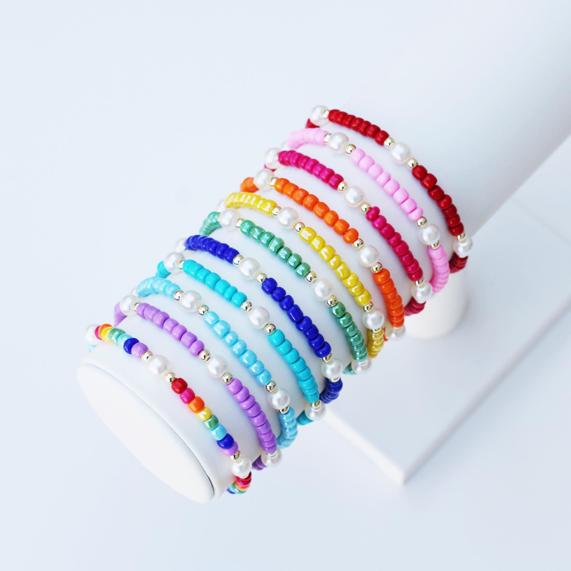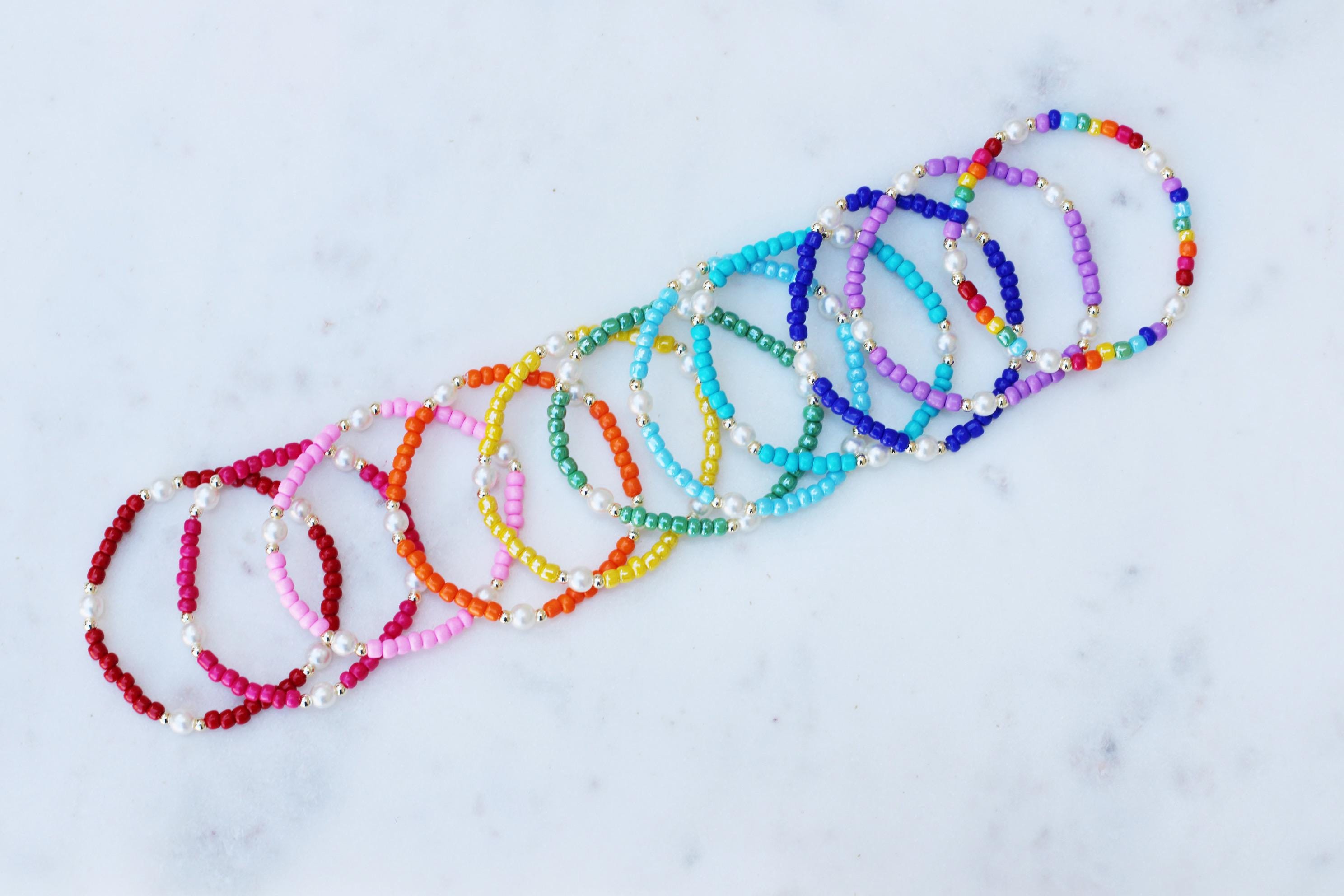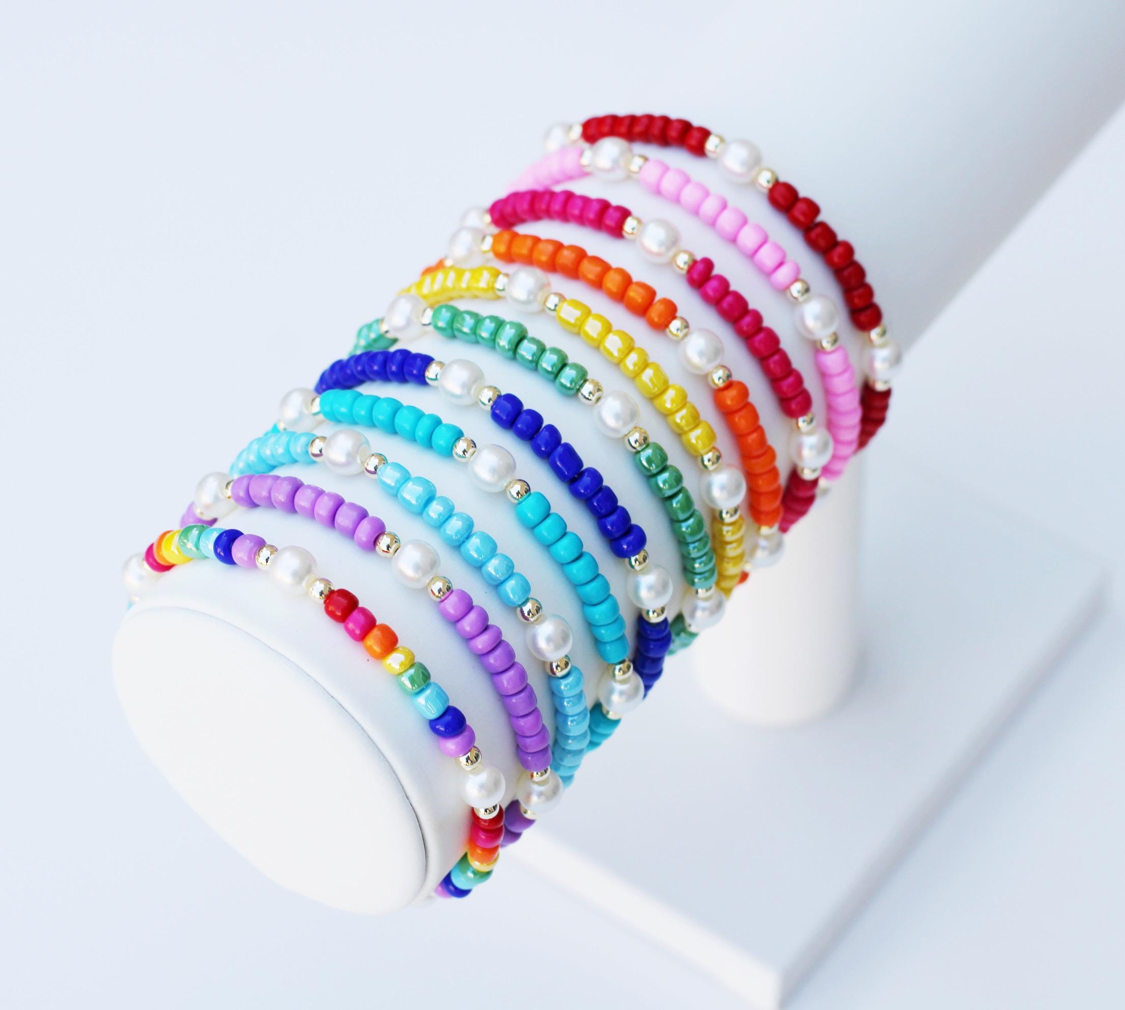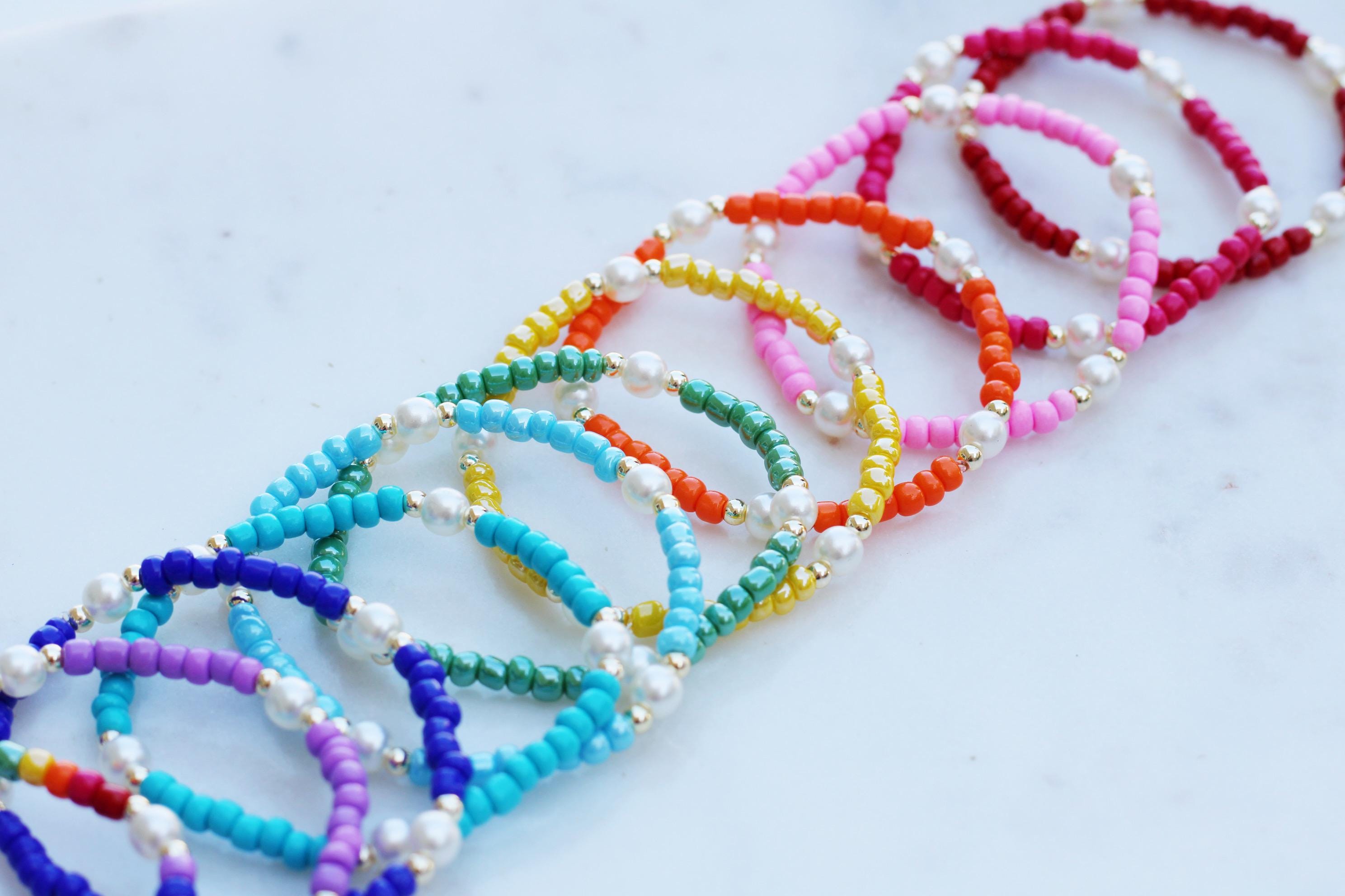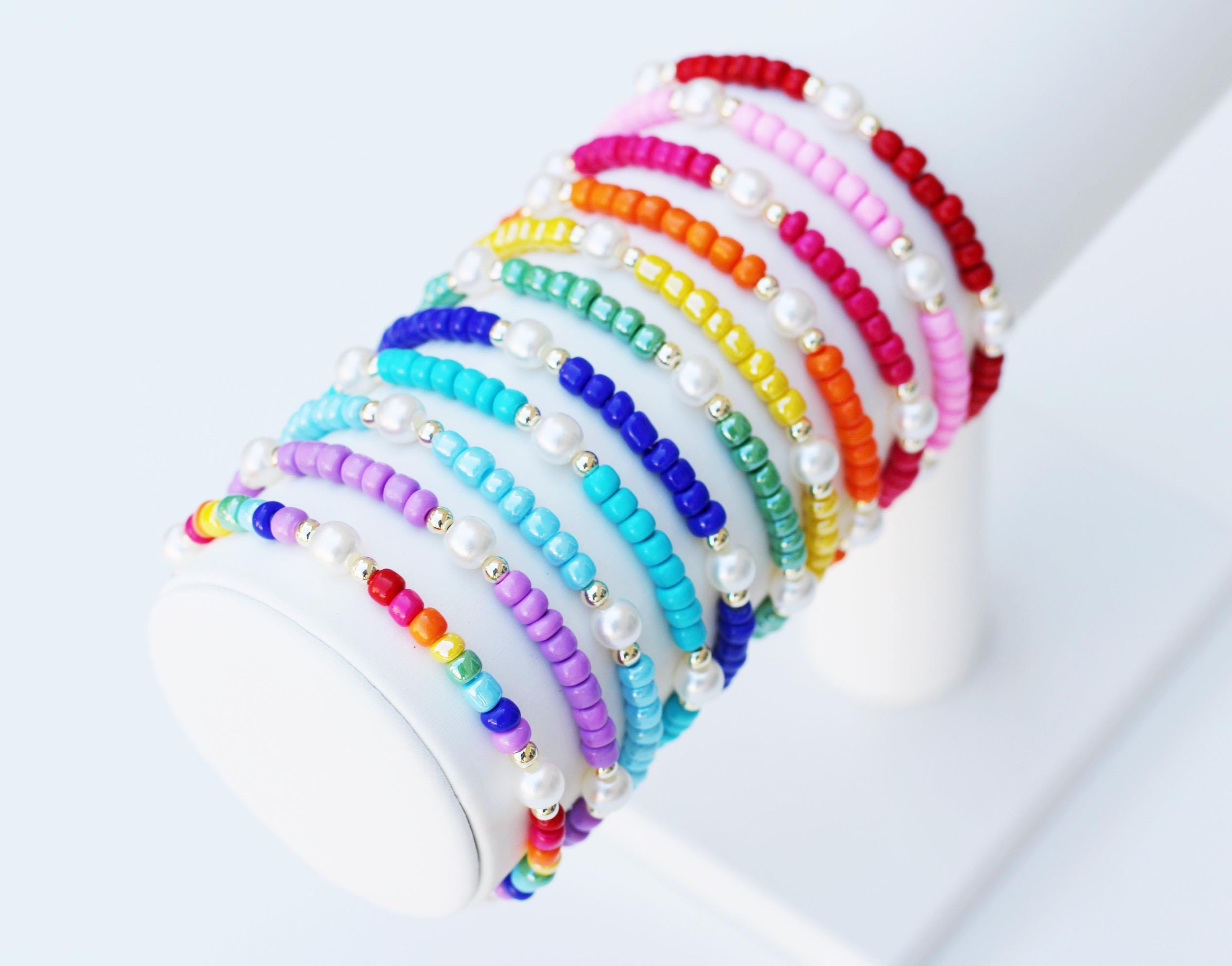 A pretty, lightweight stretch bracelet. Uniquely crafted with 3mm gold, silver or rose gold metal beads and accented with various colored seed beads and pearls (not freshwater pearls).