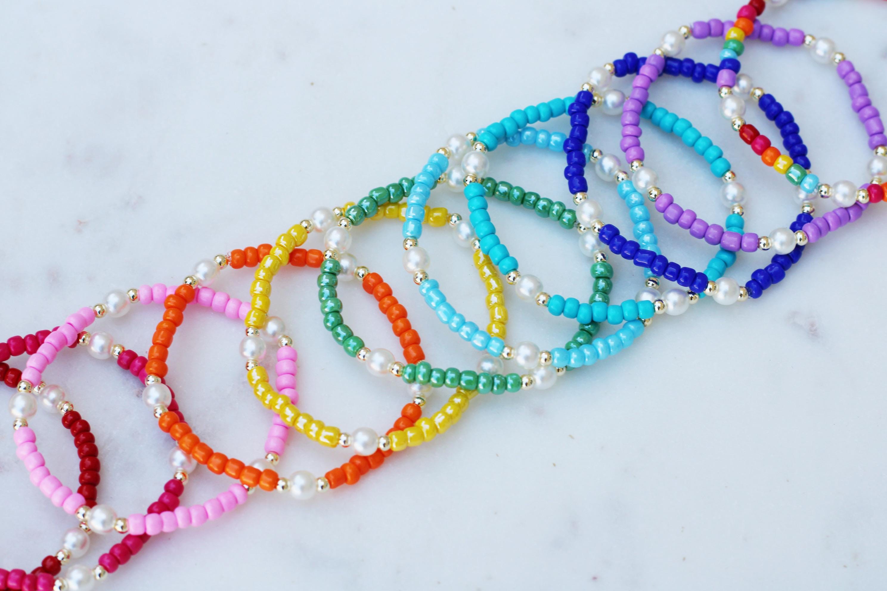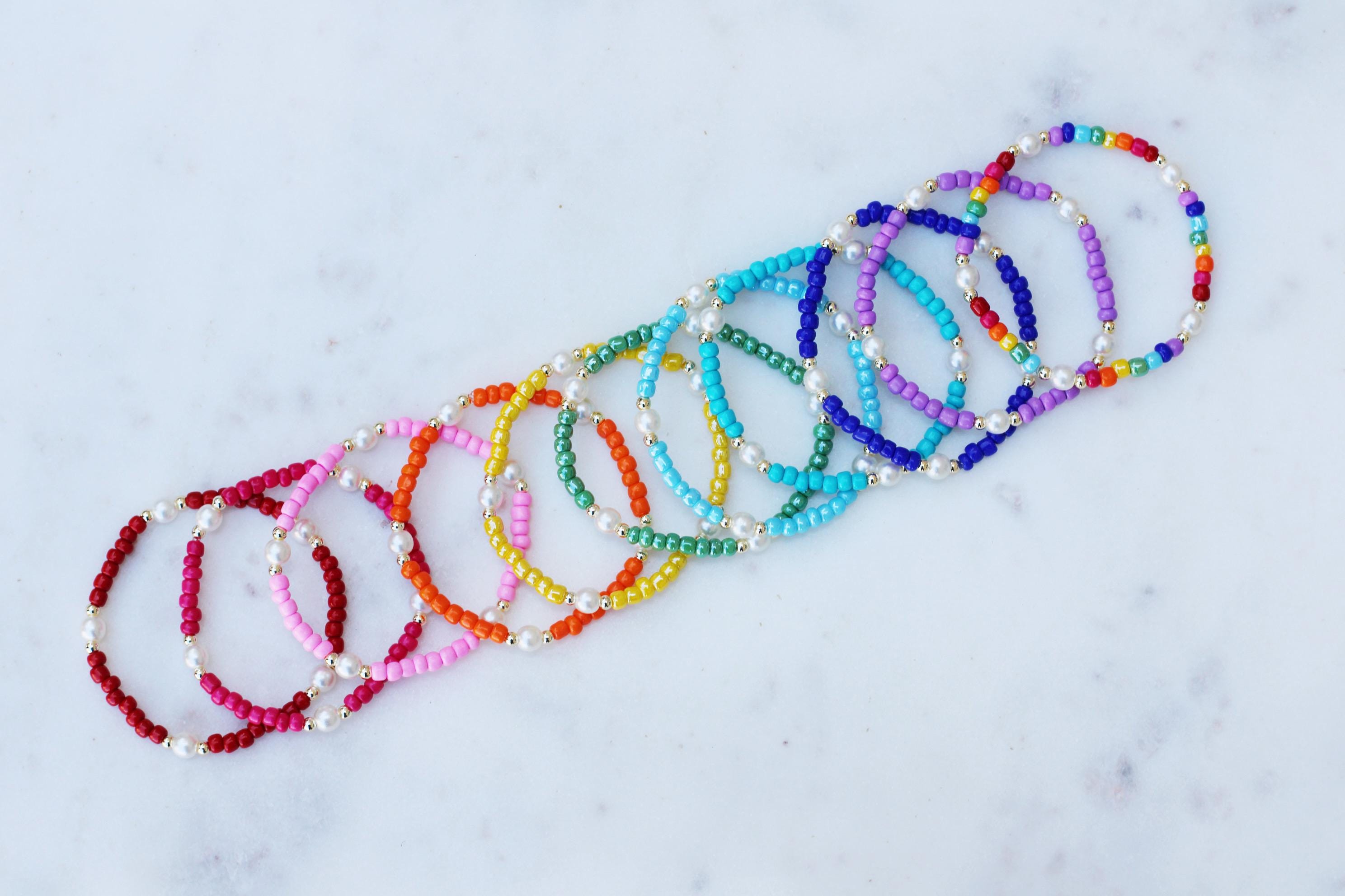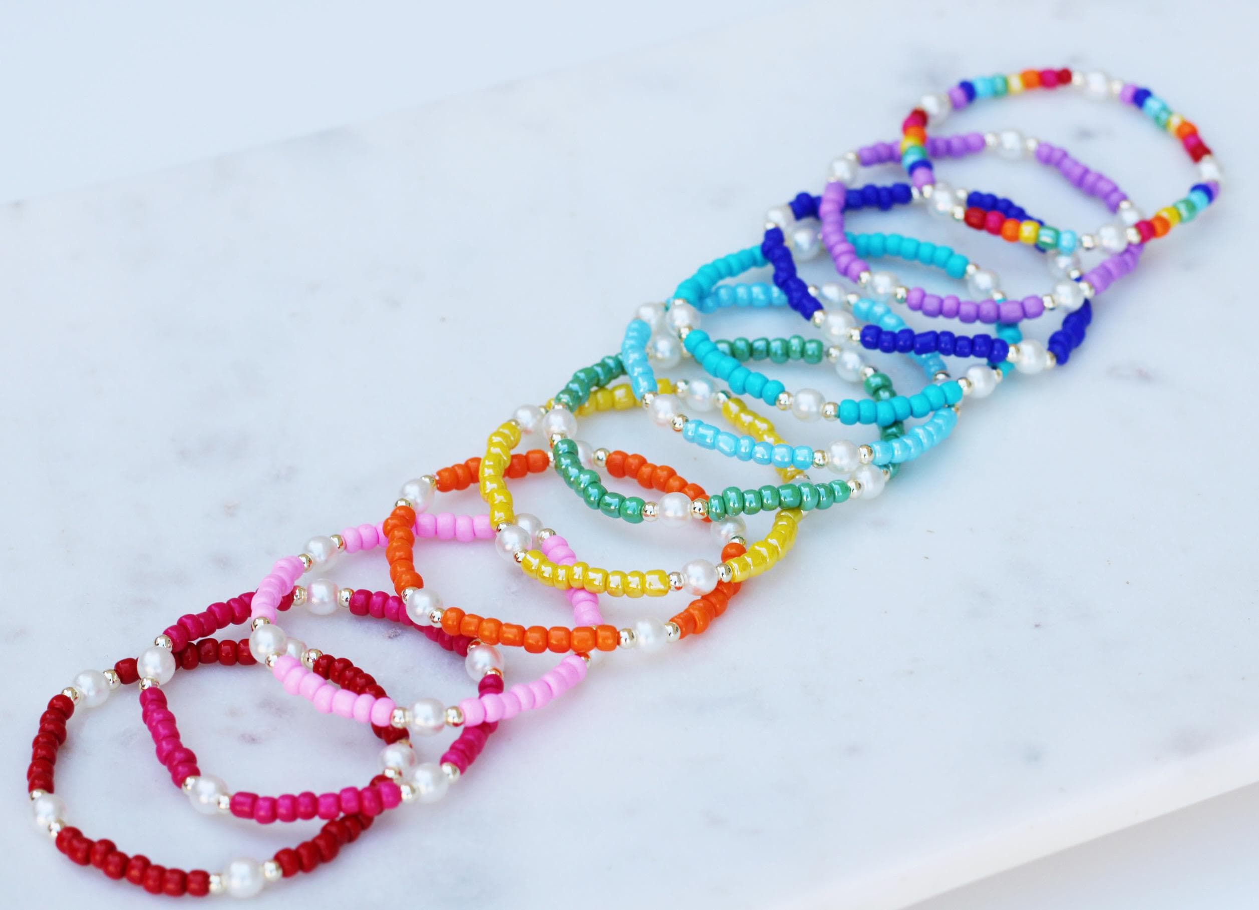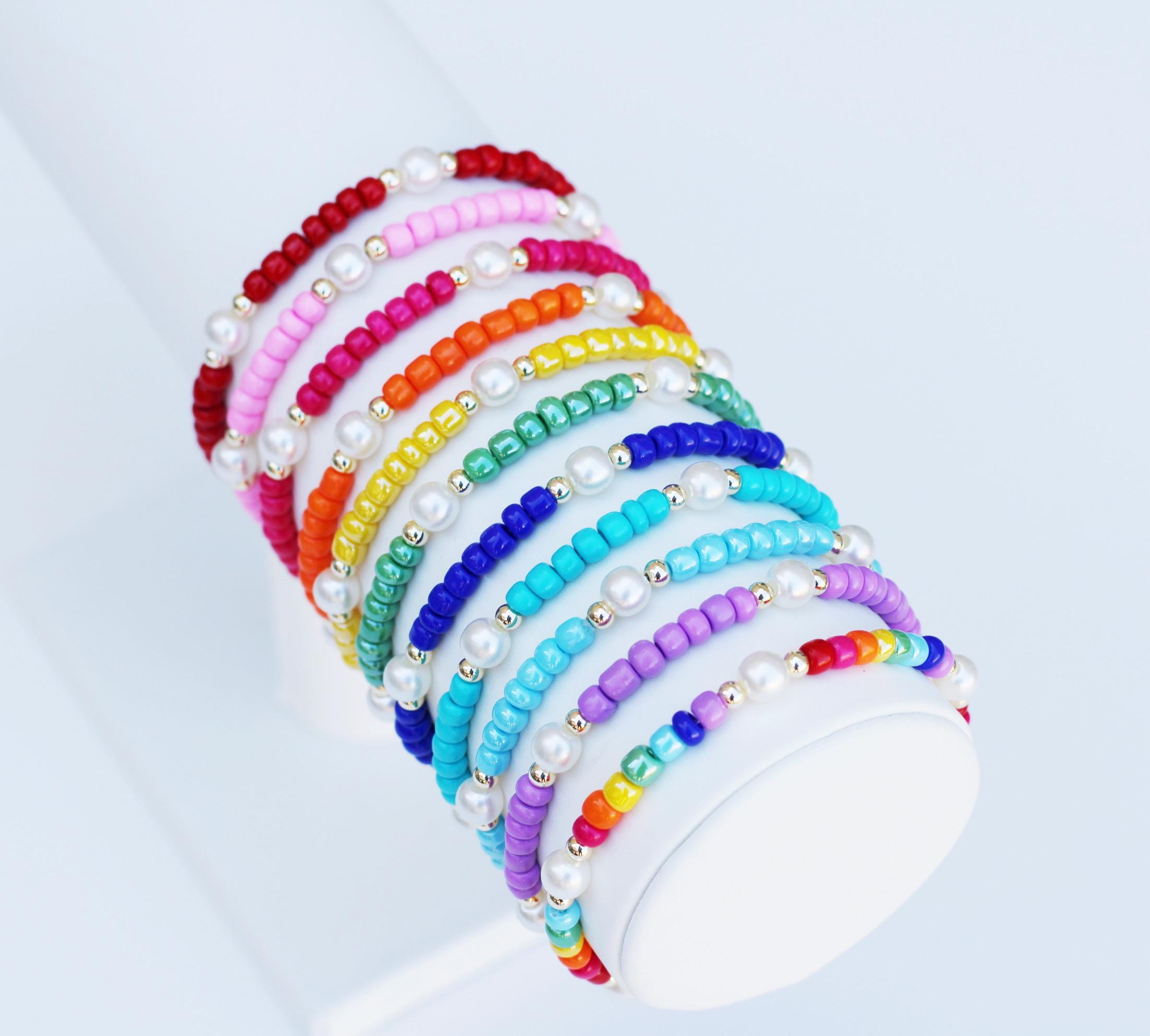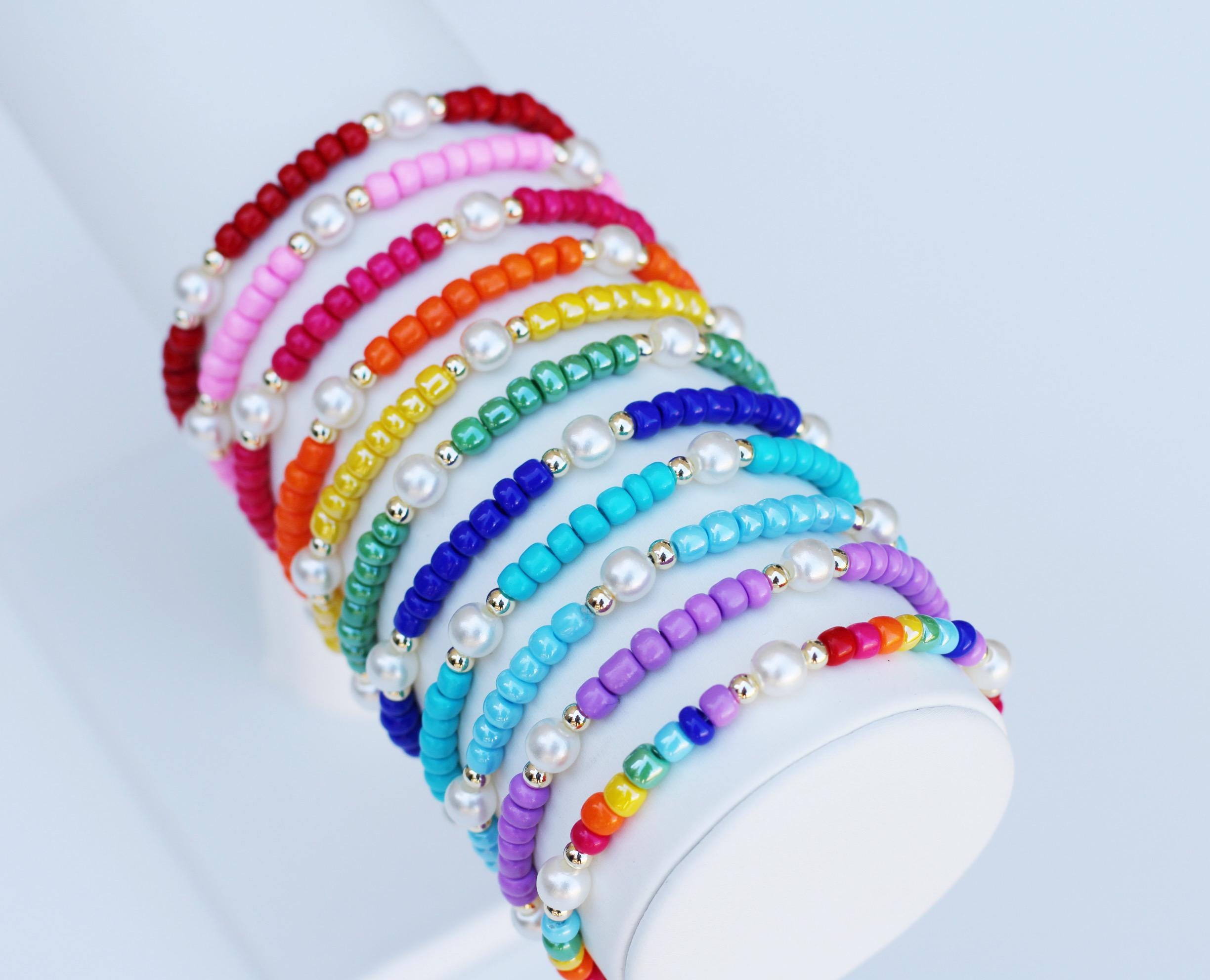 A pretty, lightweight stretch bracelet. Uniquely crafted with 3mm gold, silver or rose gold metal beads and accented with various colored seed beads and pearls (not freshwater pearls).